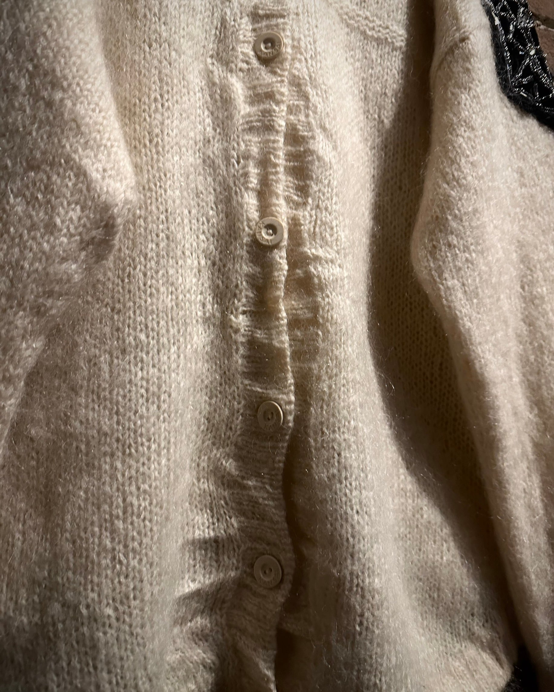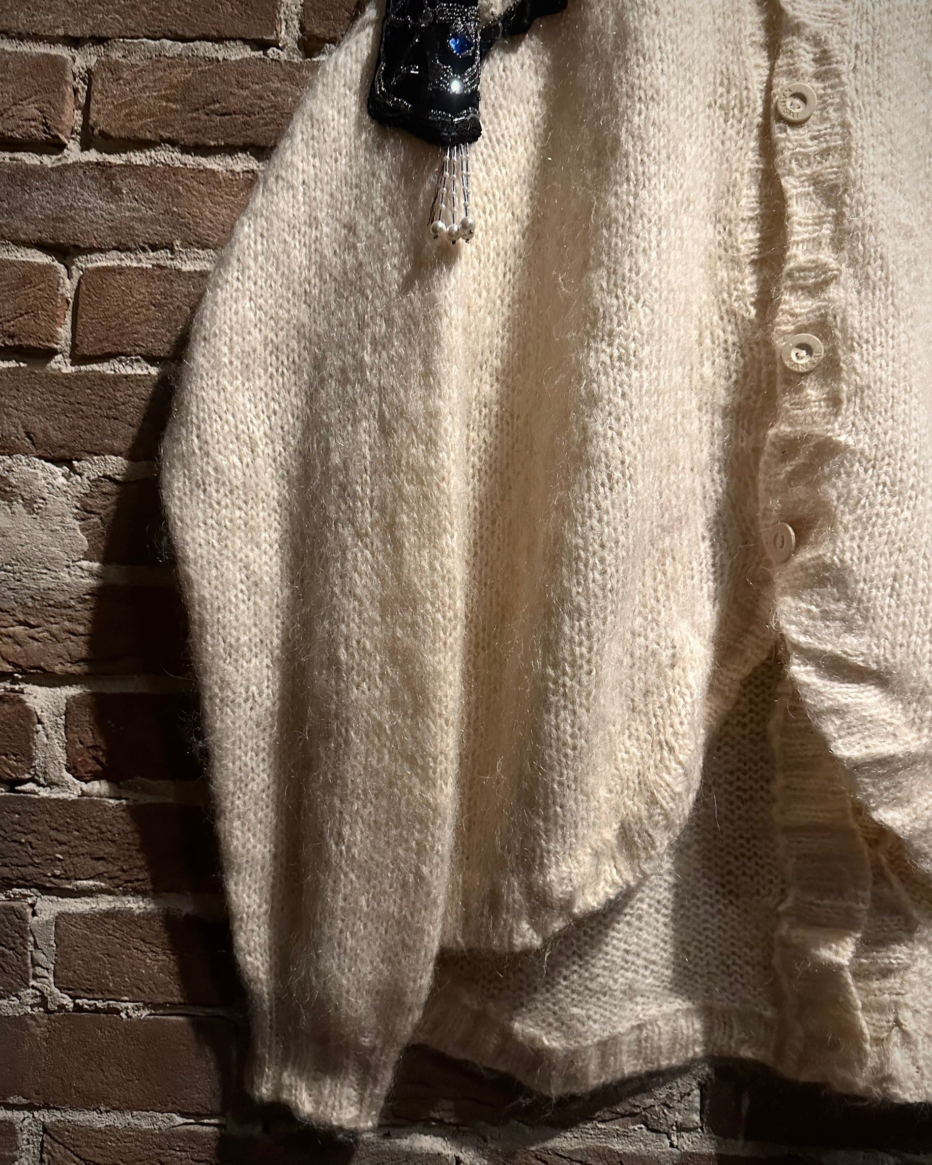 ボディはウール×ナイロン混紡のニット素材を使用。ふんわりとした起毛感と、ざっくり編まれた編地が生み出す柔らかな表情が印象的で、生成り寄りのナチュラルな色味が全体に奥行きを与えています。