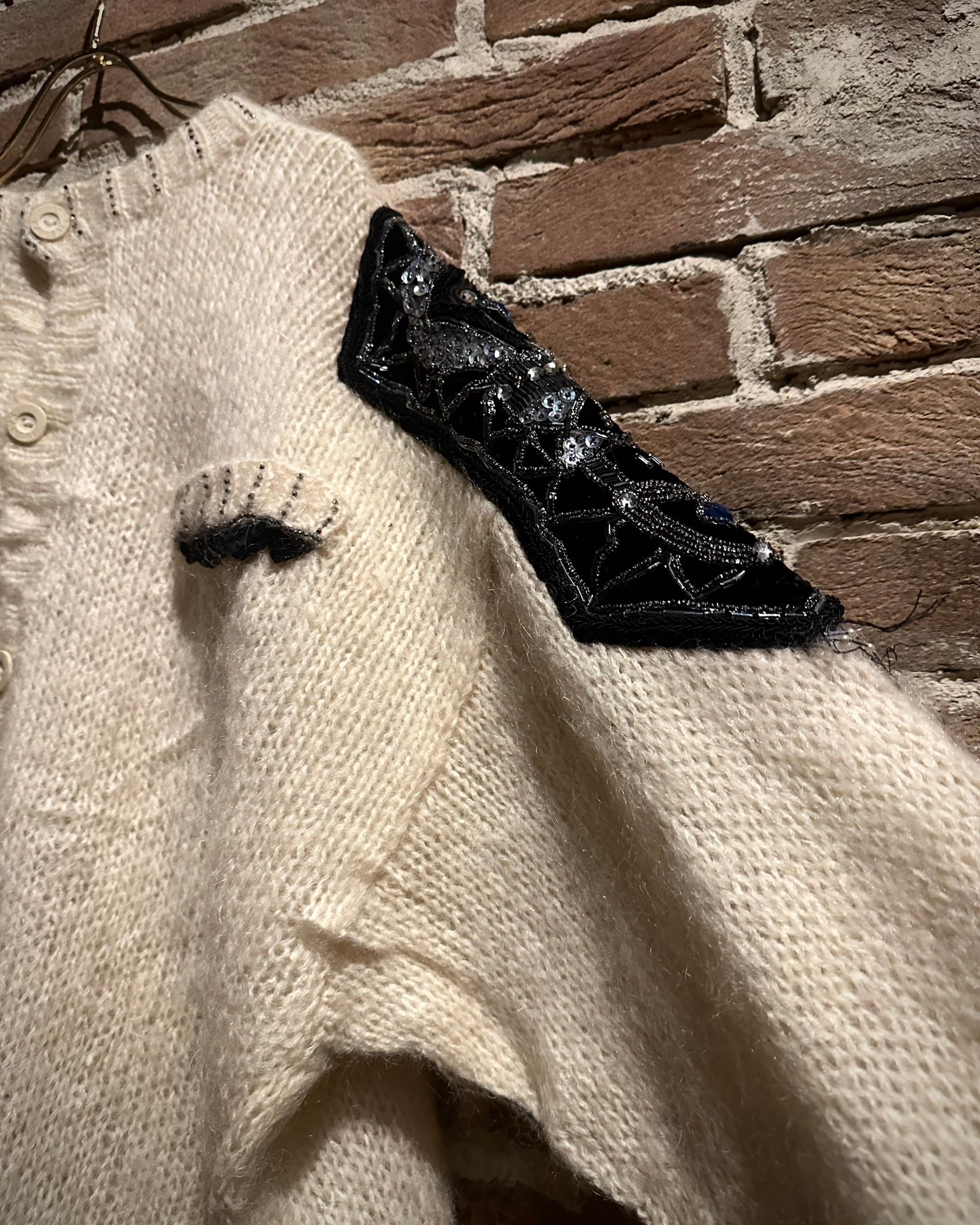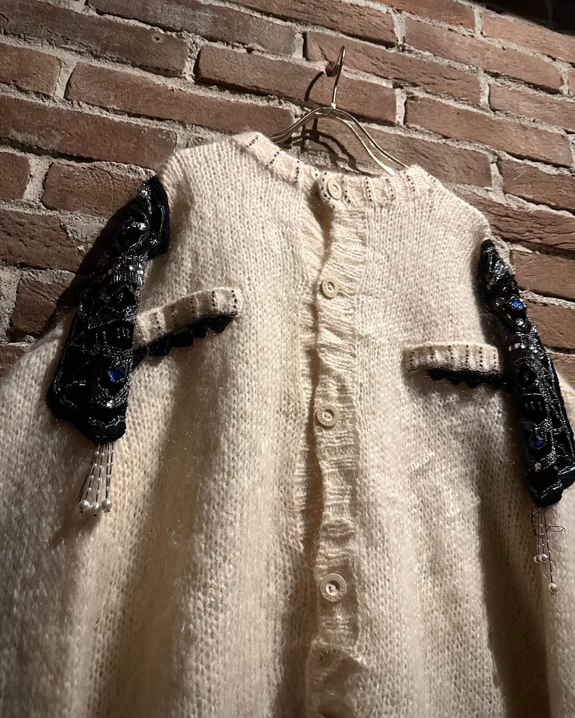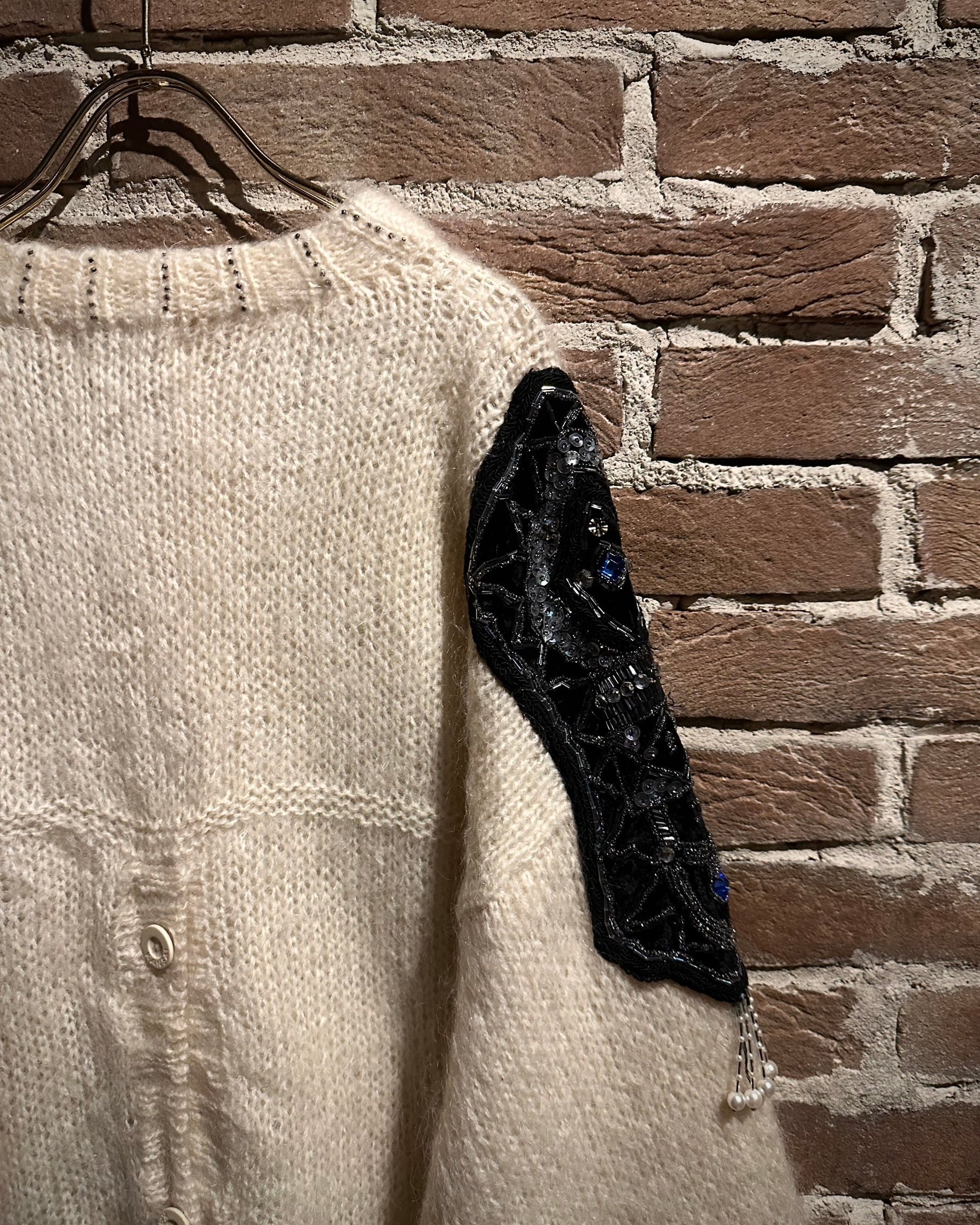 最大の特徴は、ショルダーから袖にかけて大胆に施された装飾。スパンコール、ビーズ、ビジューを組み合わせた立体的なデコレーションが配され、ニットの柔らかな素材感の中に強いコントラストと華やかさをプラス。