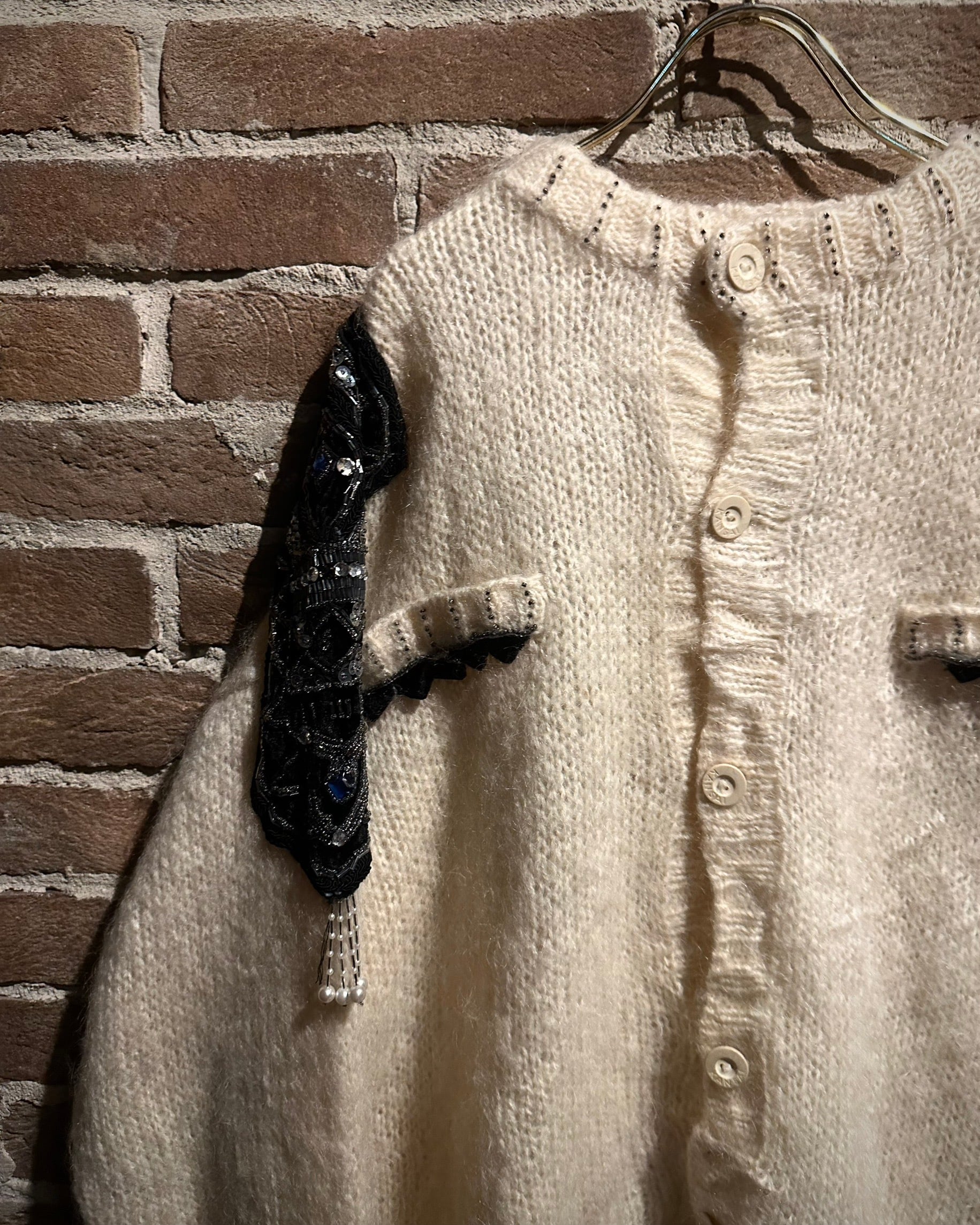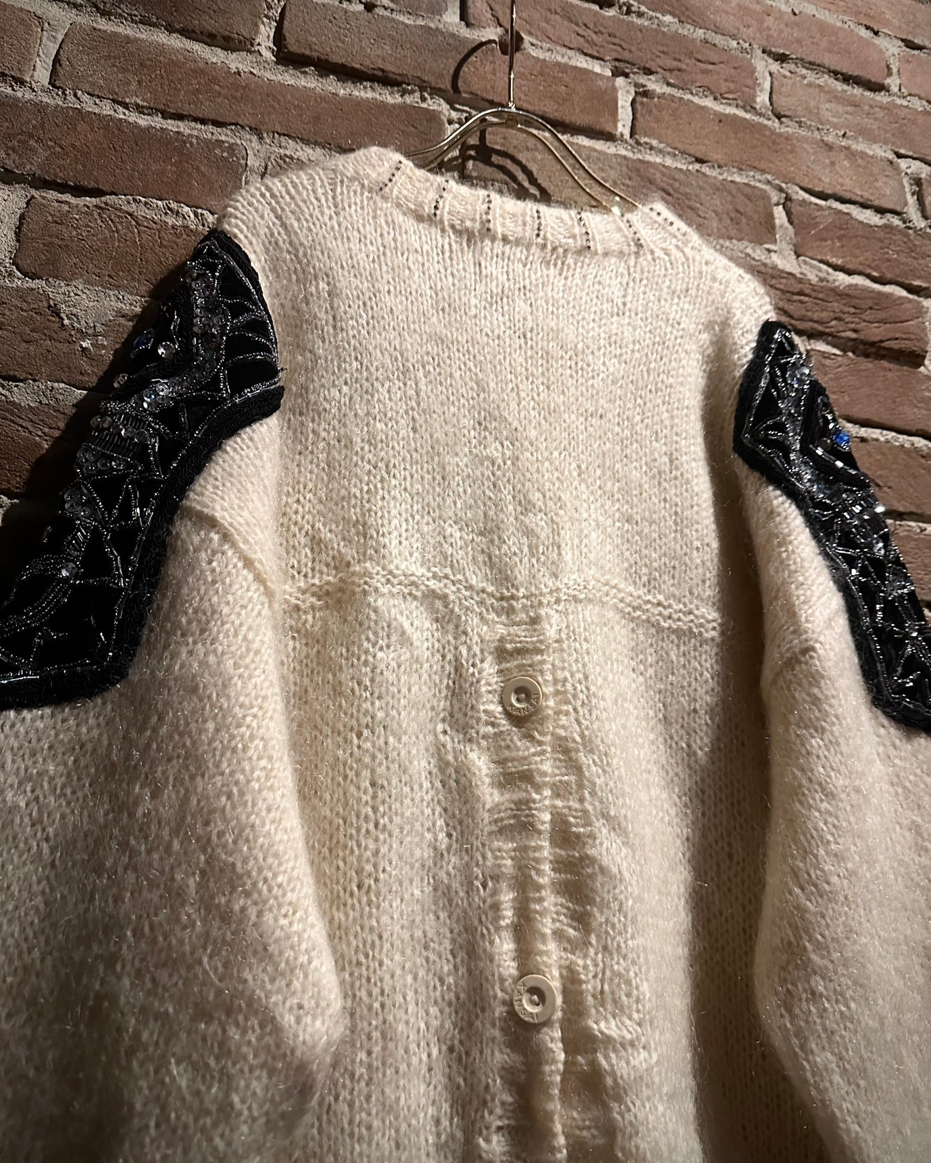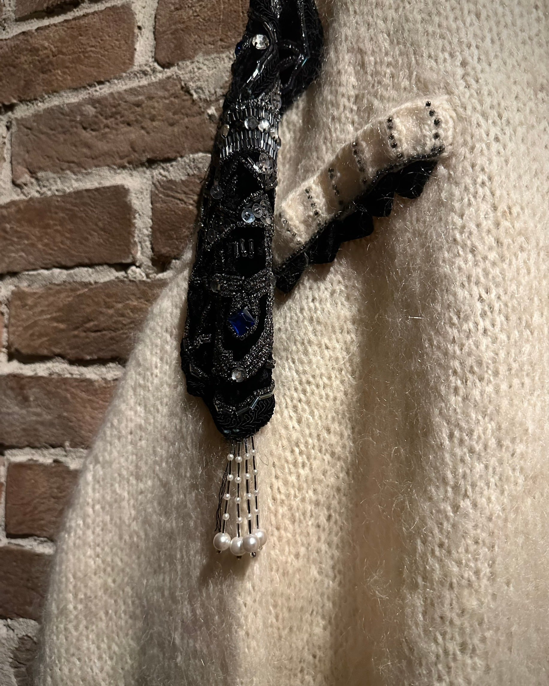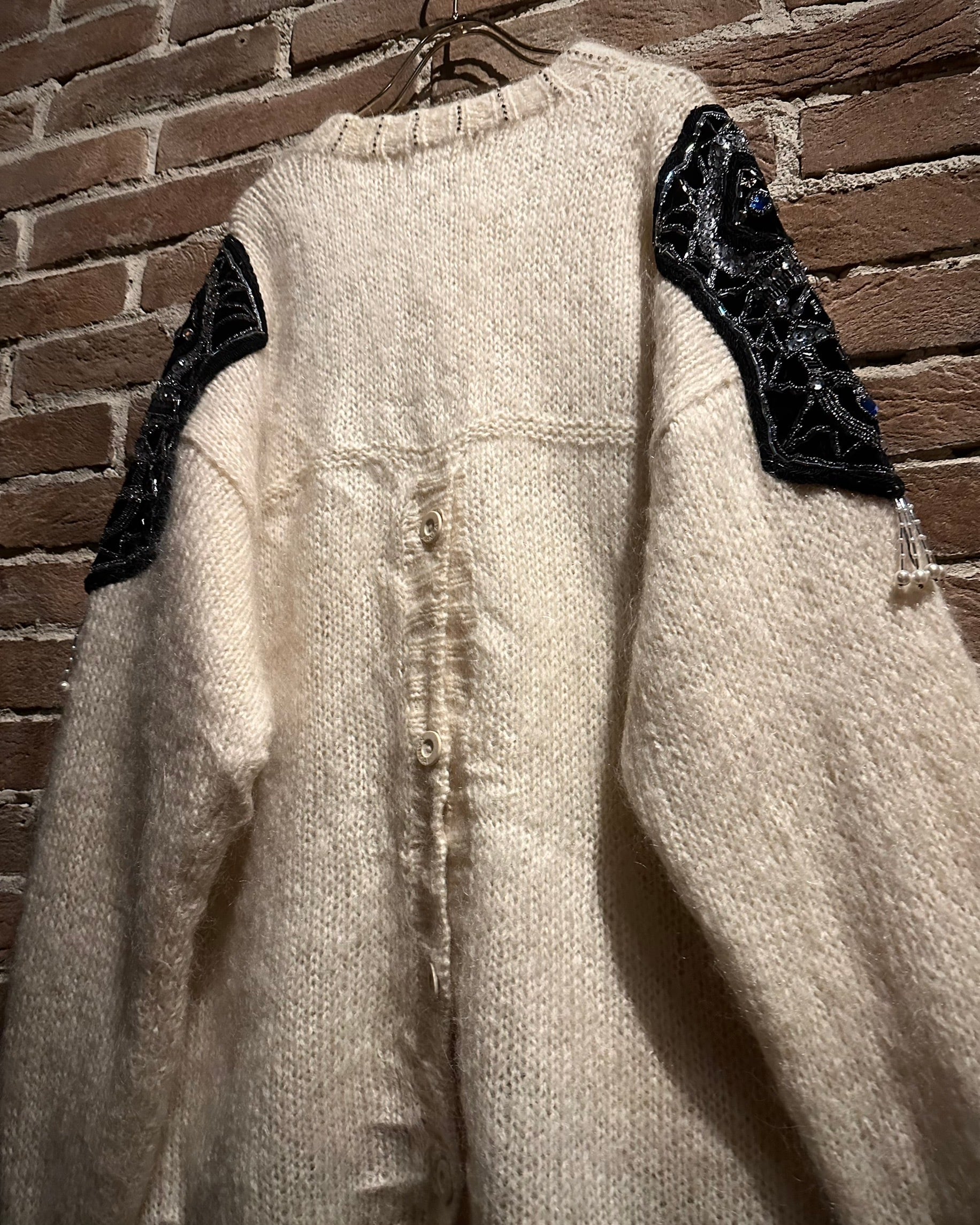 最大の特徴は、ショルダーから袖にかけて大胆に施された装飾。スパンコール、ビーズ、ビジューを組み合わせた立体的なデコレーションが配され、ニットの柔らかな素材感の中に強いコントラストと華やかさをプラス。