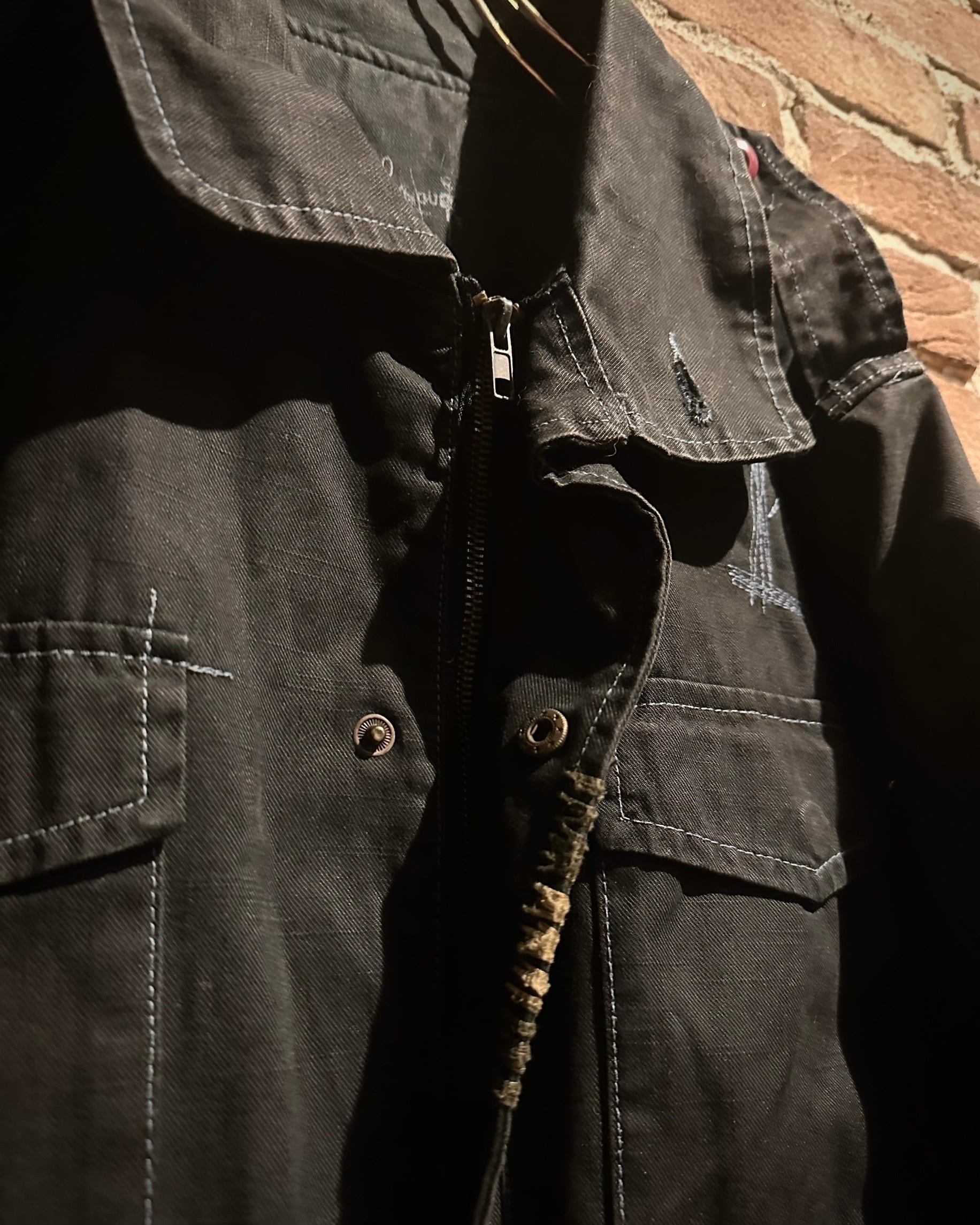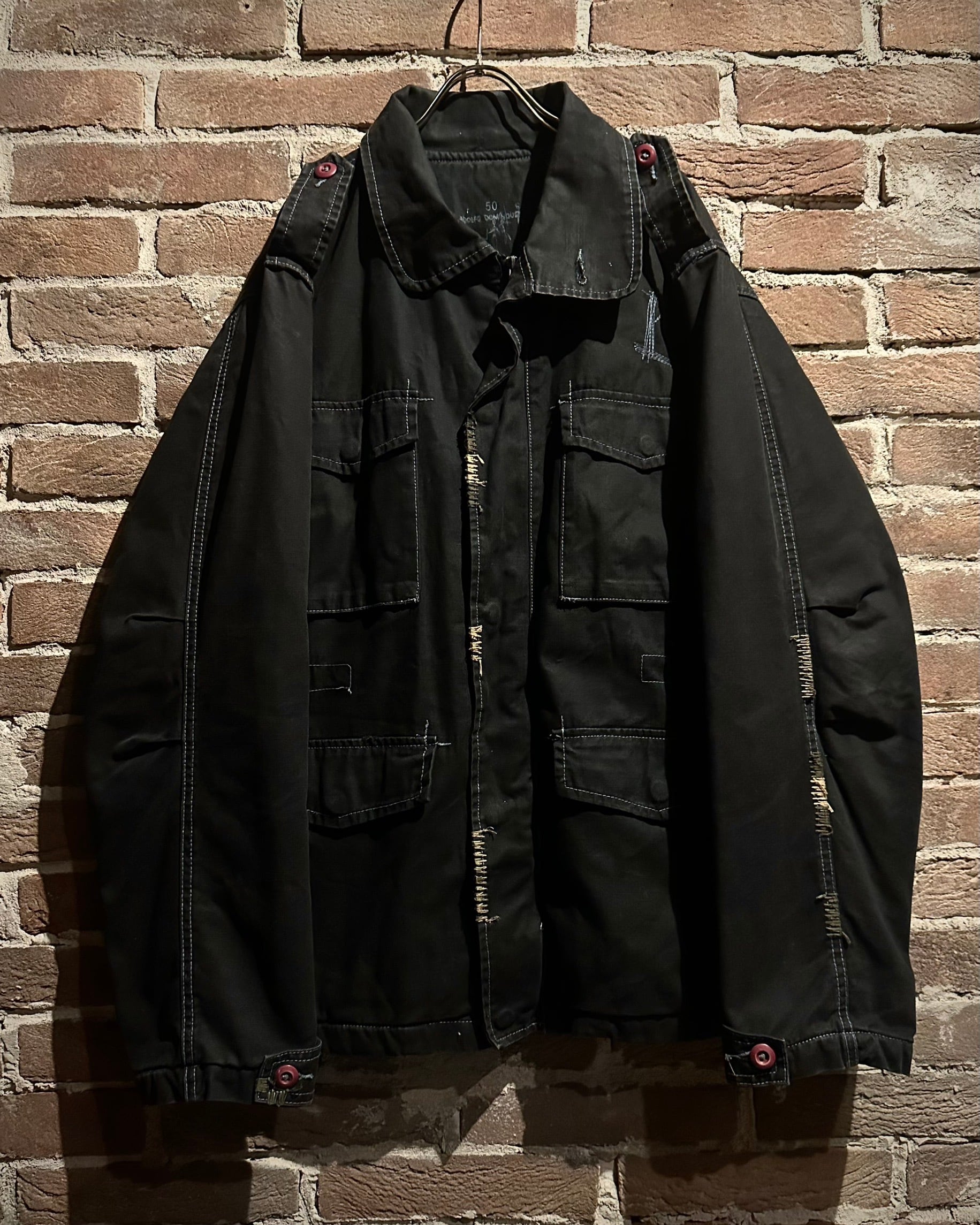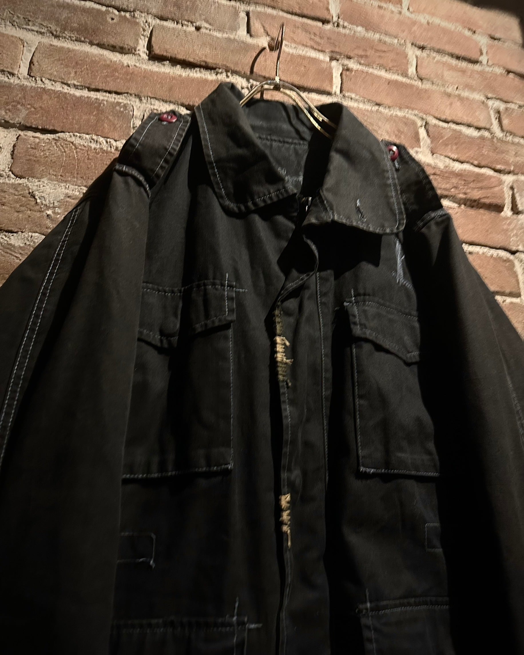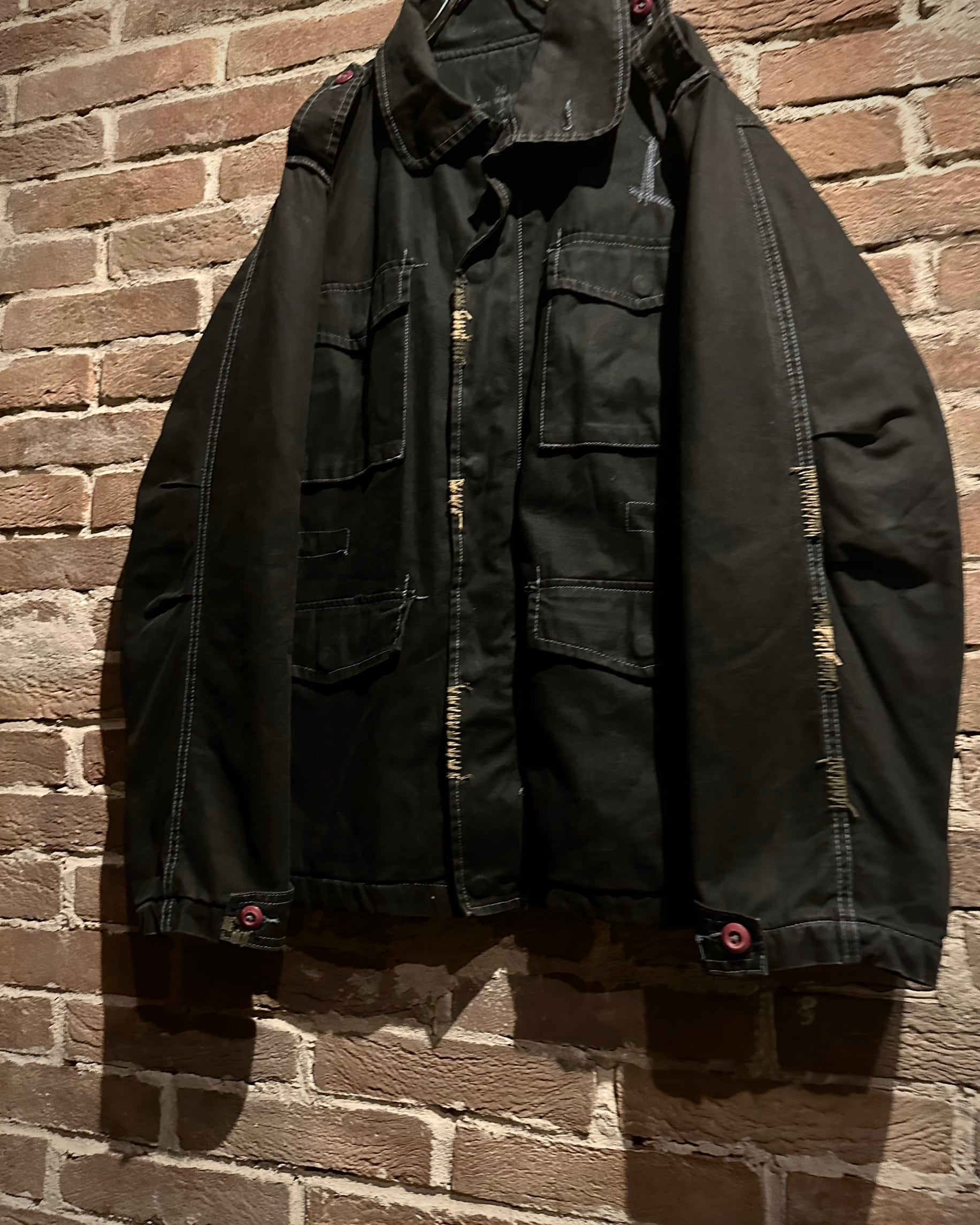 フロントに配されたフラップポケットやスタンドカラーになる襟、エポレットなど、M-65由来のディテールをしっかり踏襲。加えて、随所に見られる粗めのステッチが退廃的なムードを生み、モードな一着へと昇華されています。