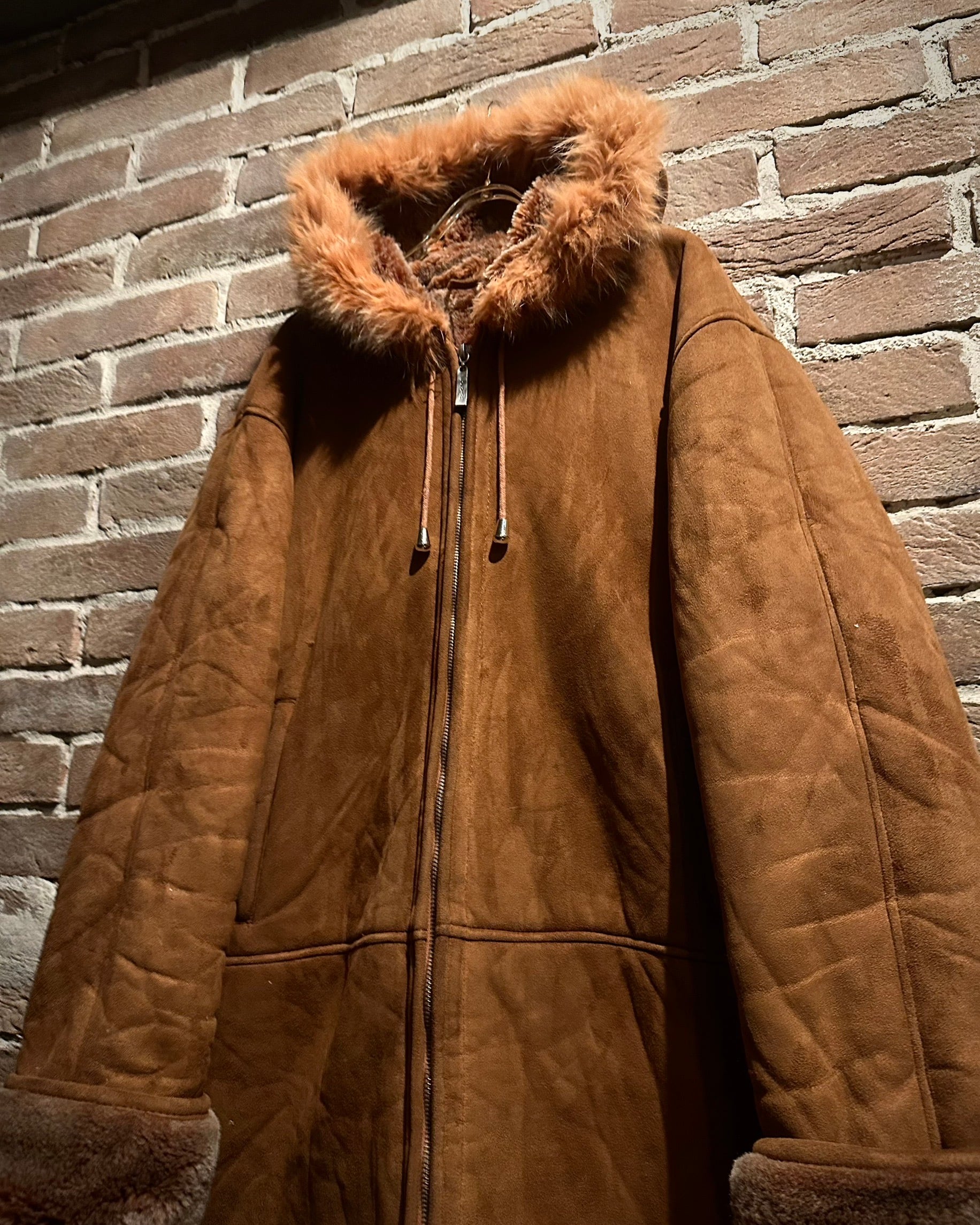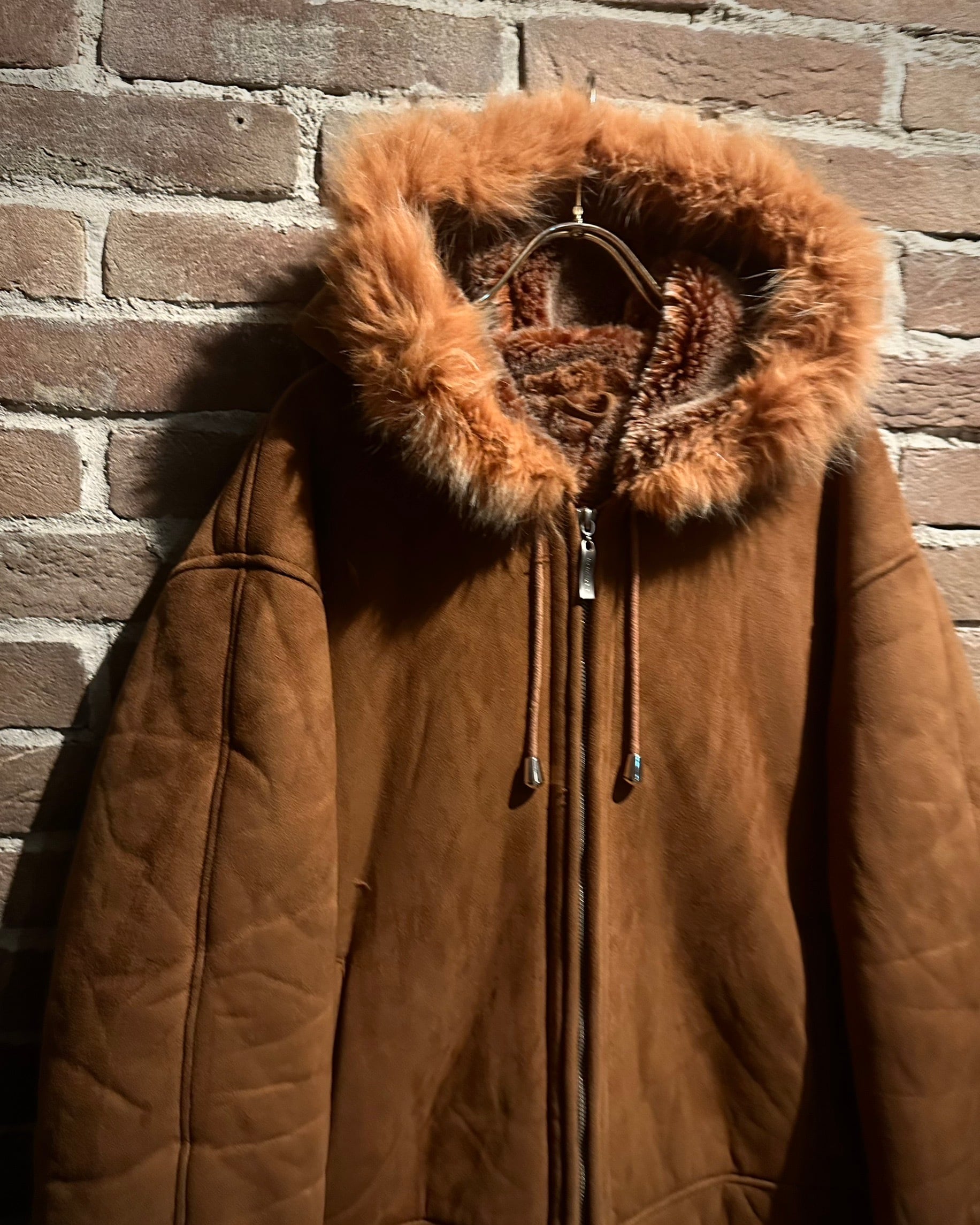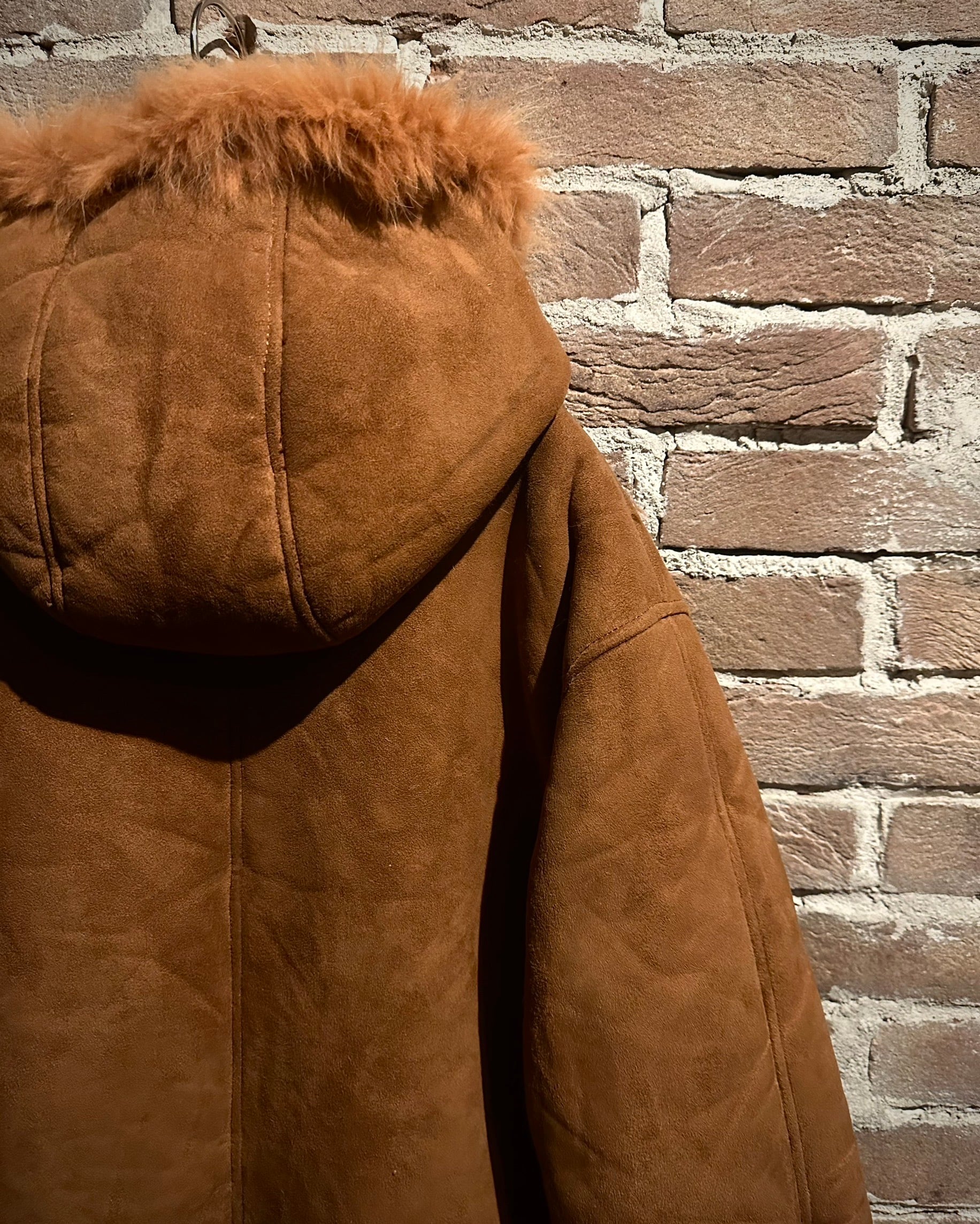 肉厚なフェイクムートンを用いた、ジップアップ仕様のフーデッドジャケット。