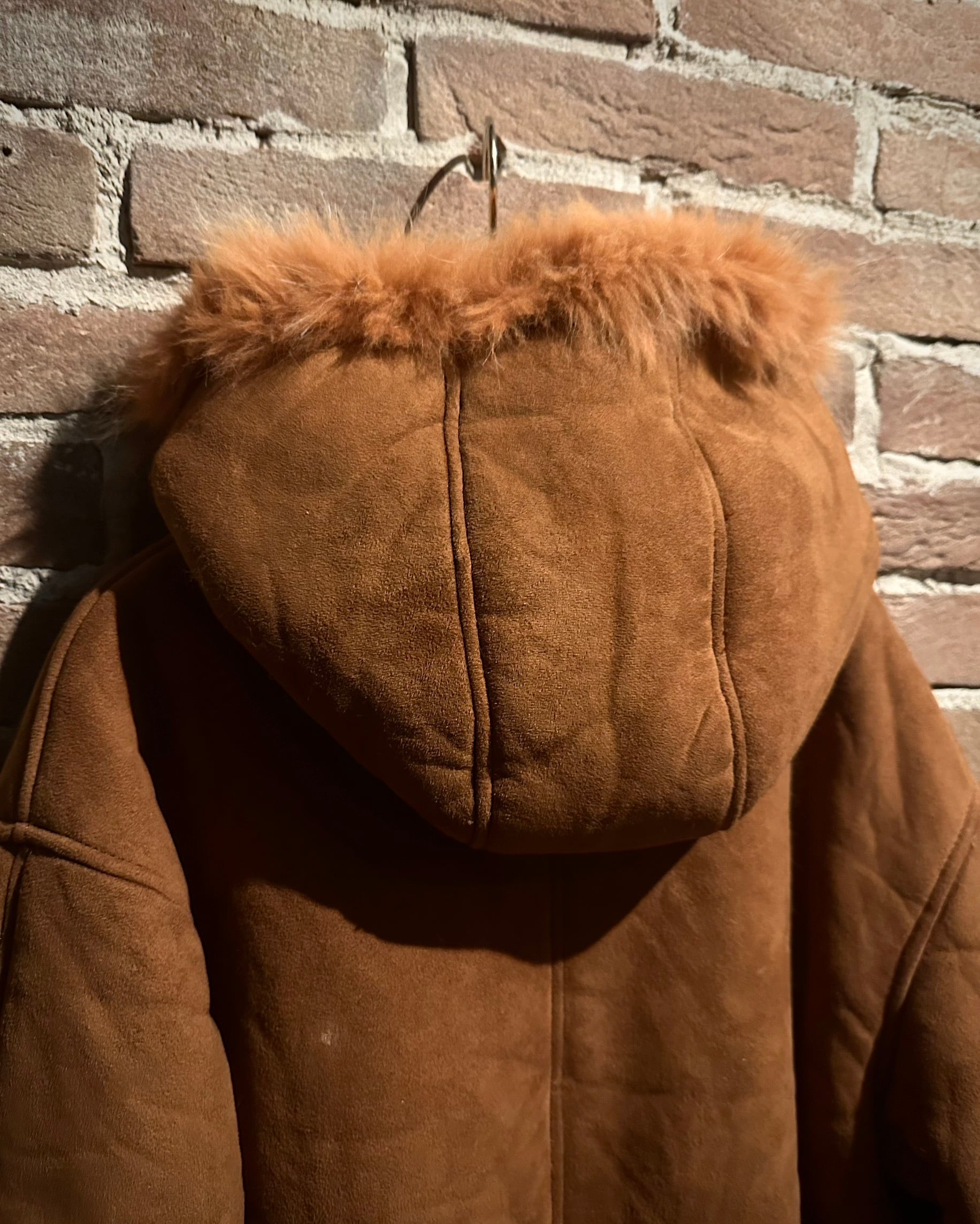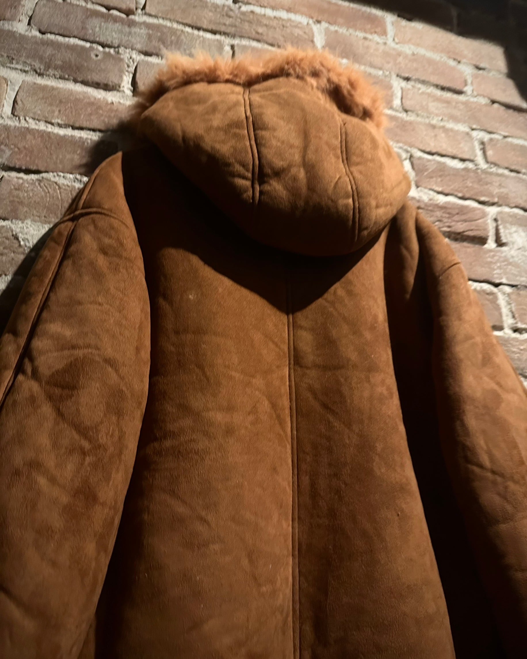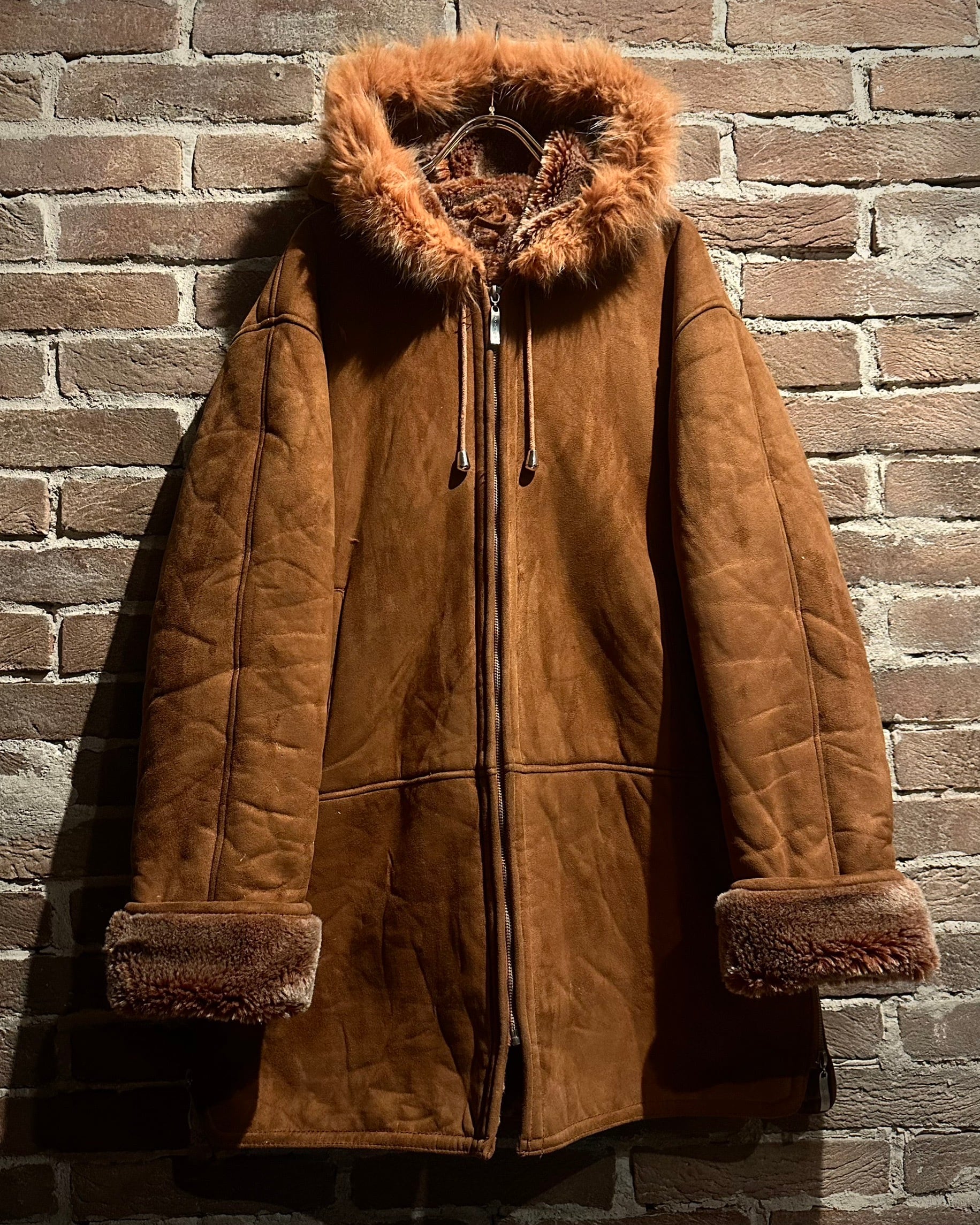 肉厚なフェイクムートンを用いた、ジップアップ仕様のフーデッドジャケット。