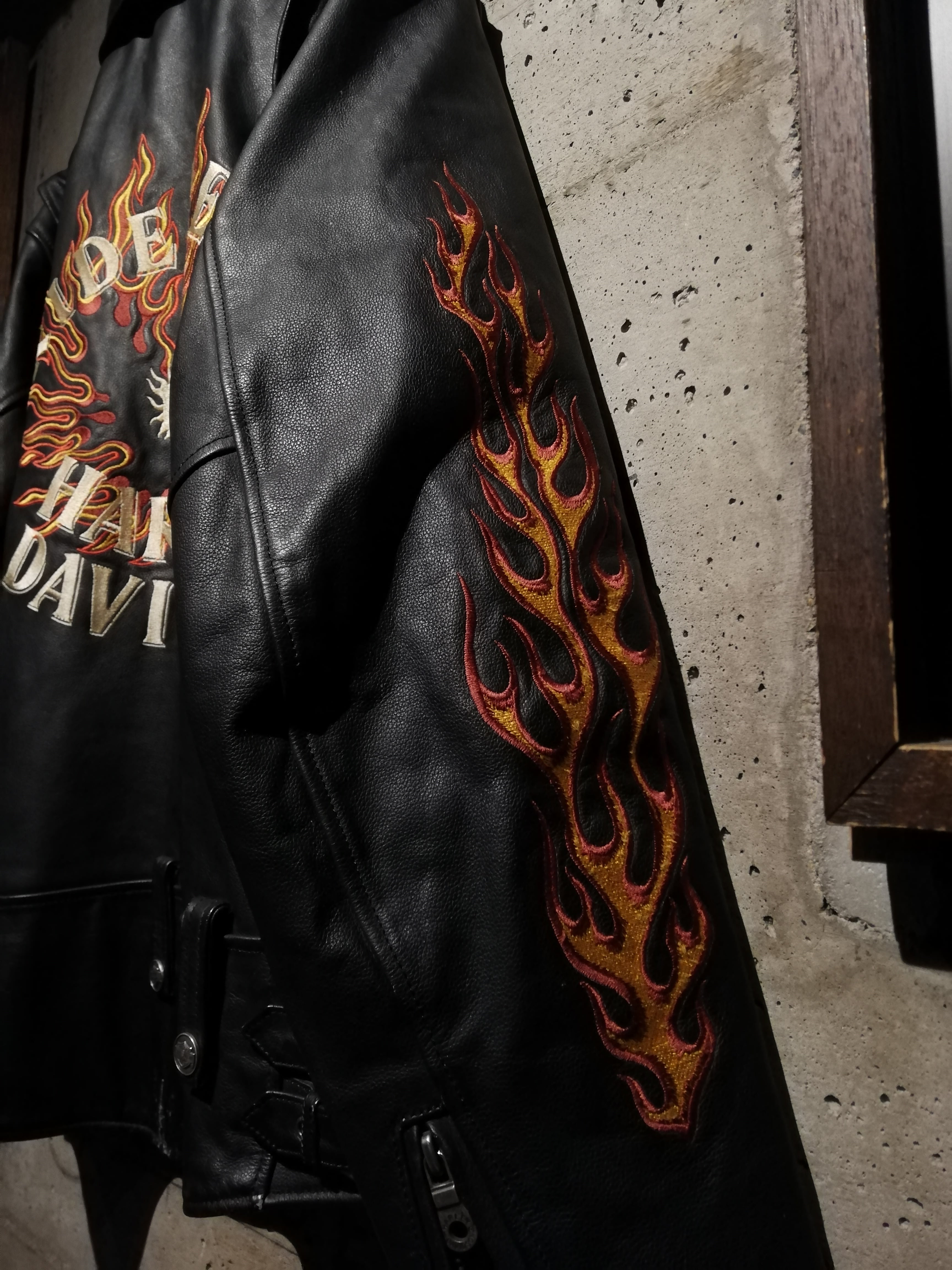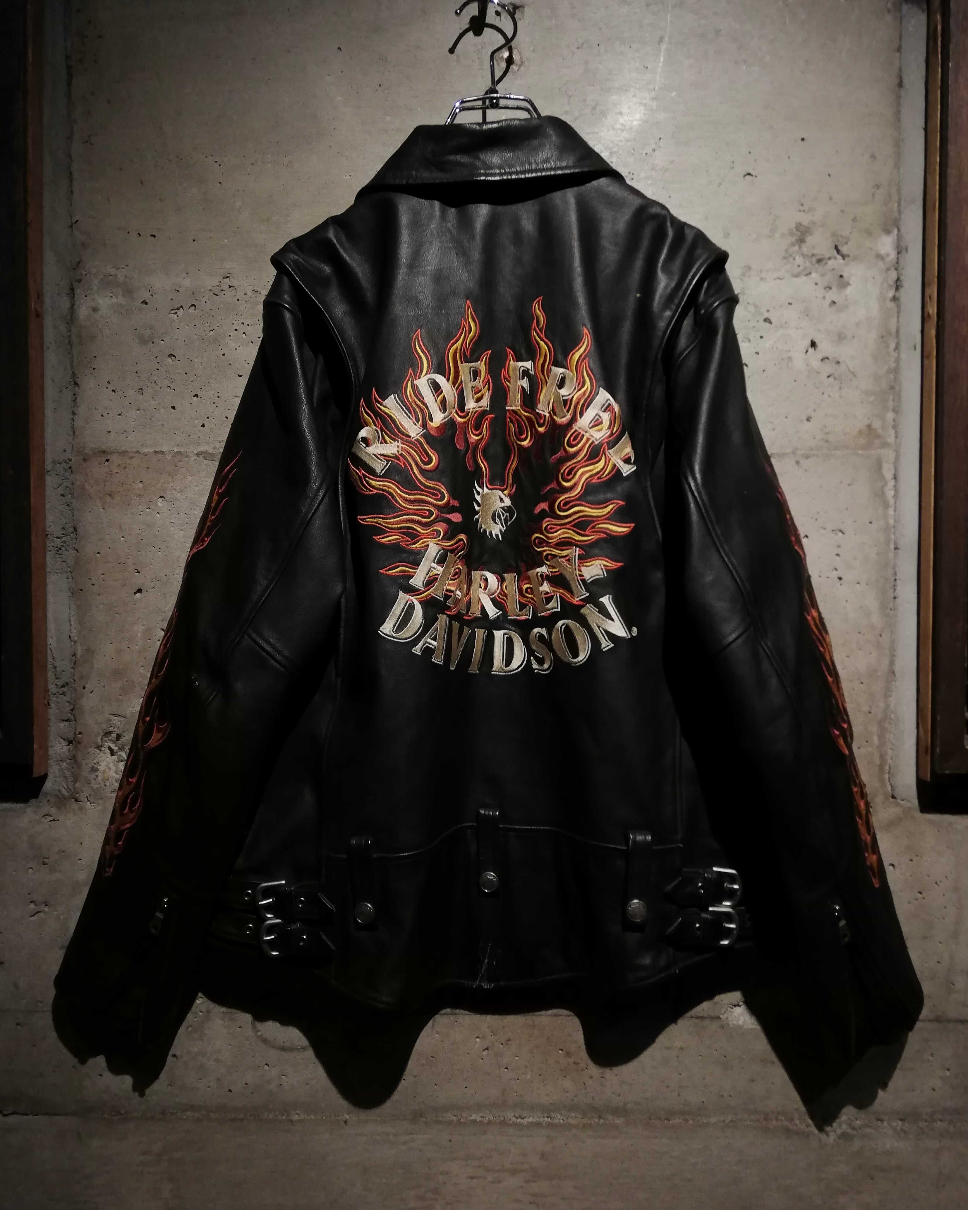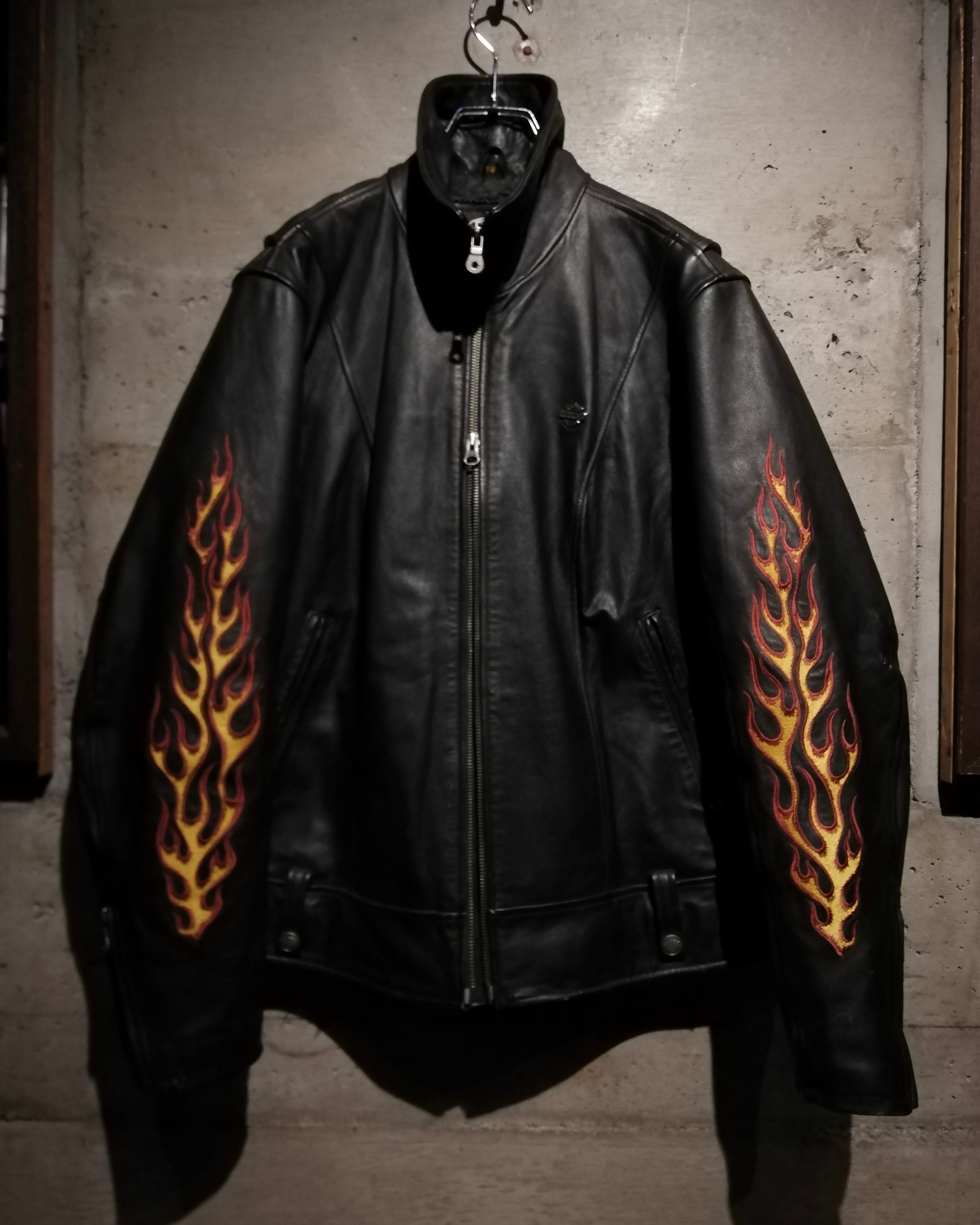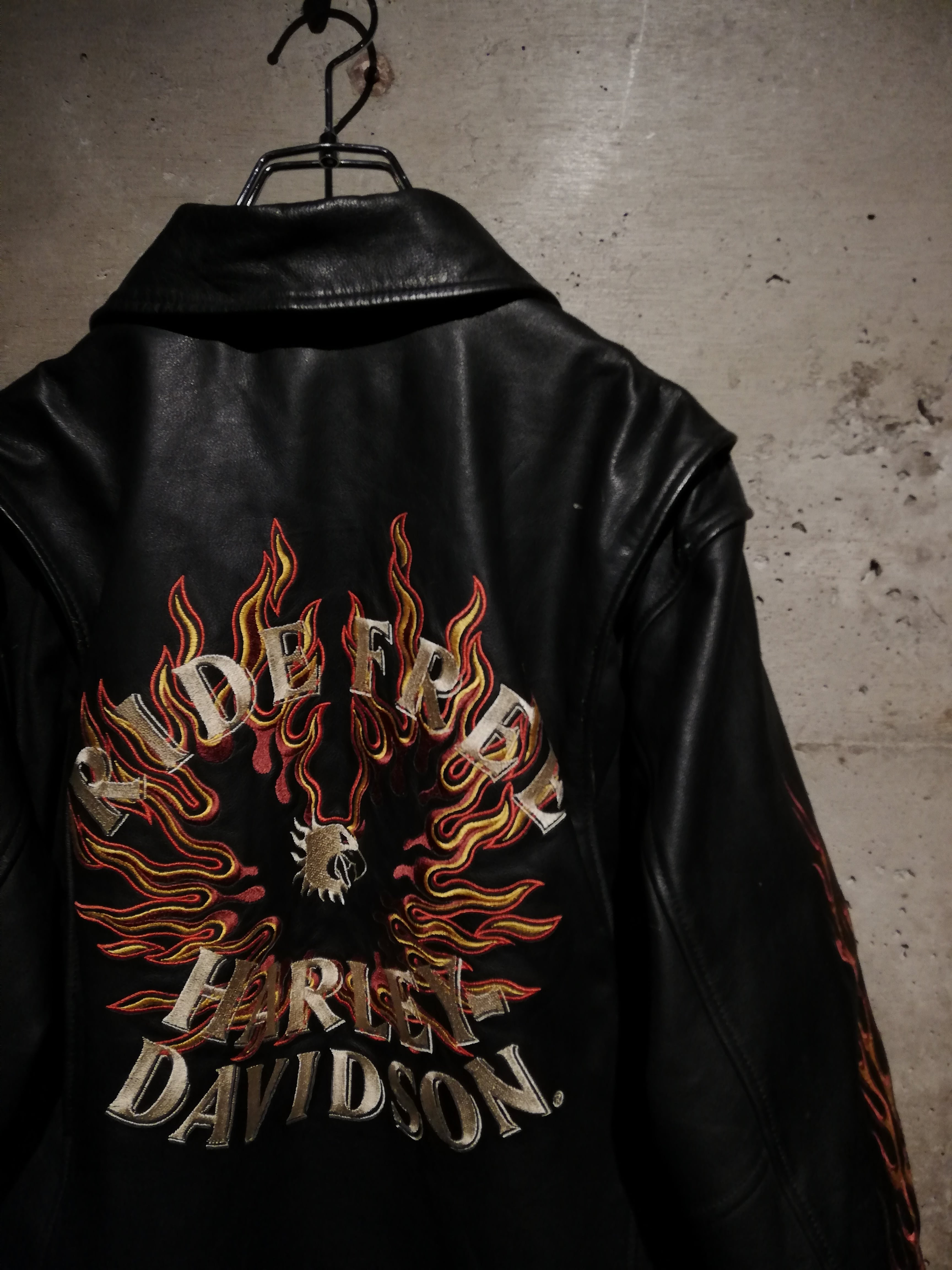 両袖には燃え上がるフレイムモチーフの刺繍を大胆に配置。イエロー×レッドのコントラストがブラックレザーに映え、背面には「RIDE FREE HARLEY DAVIDSON」の文字を囲うように、フレイムとイーグルモチーフの刺繍が施され、バイカーカルチャーを象徴する力強いグラフィックに仕上げられています。