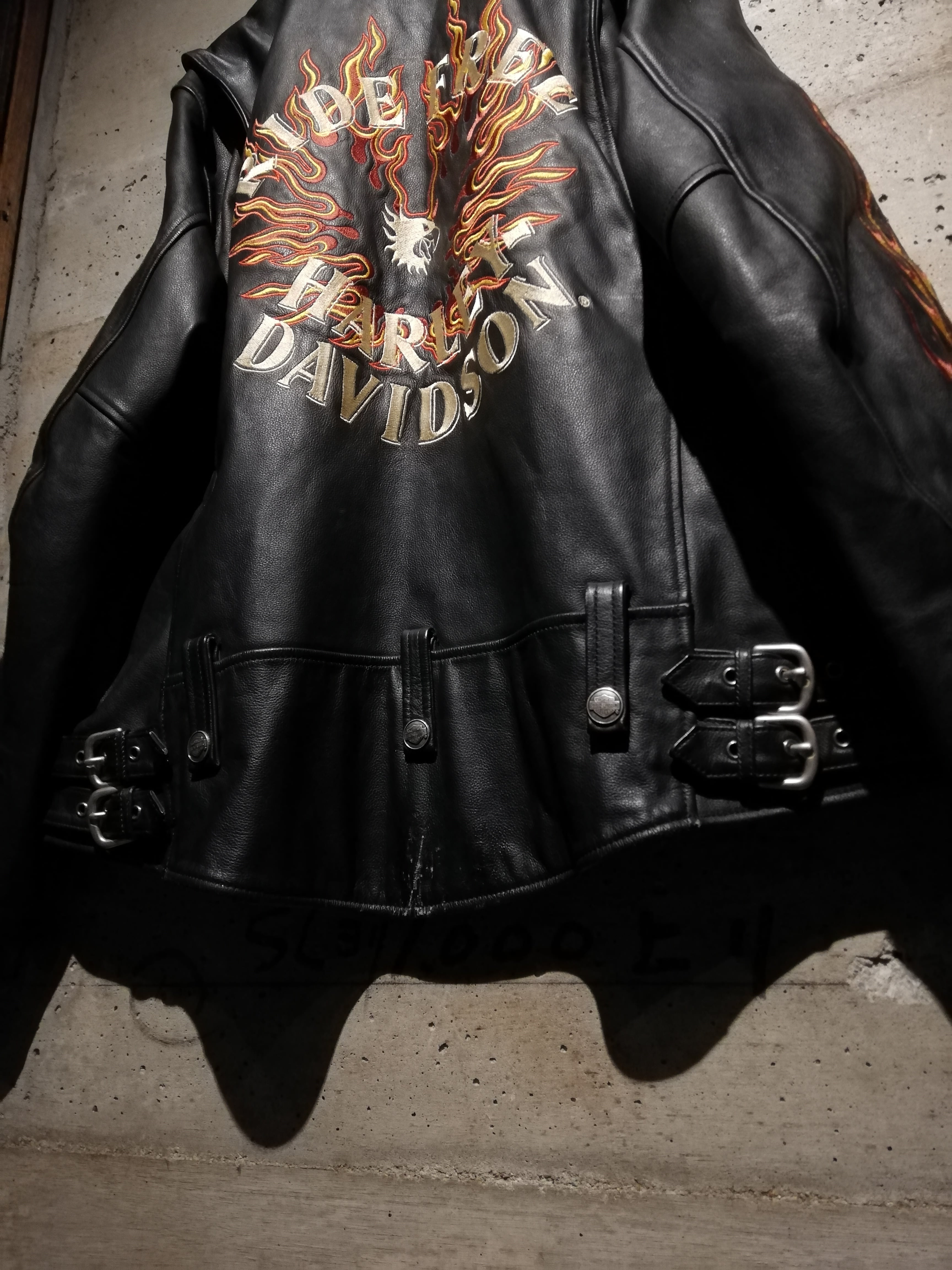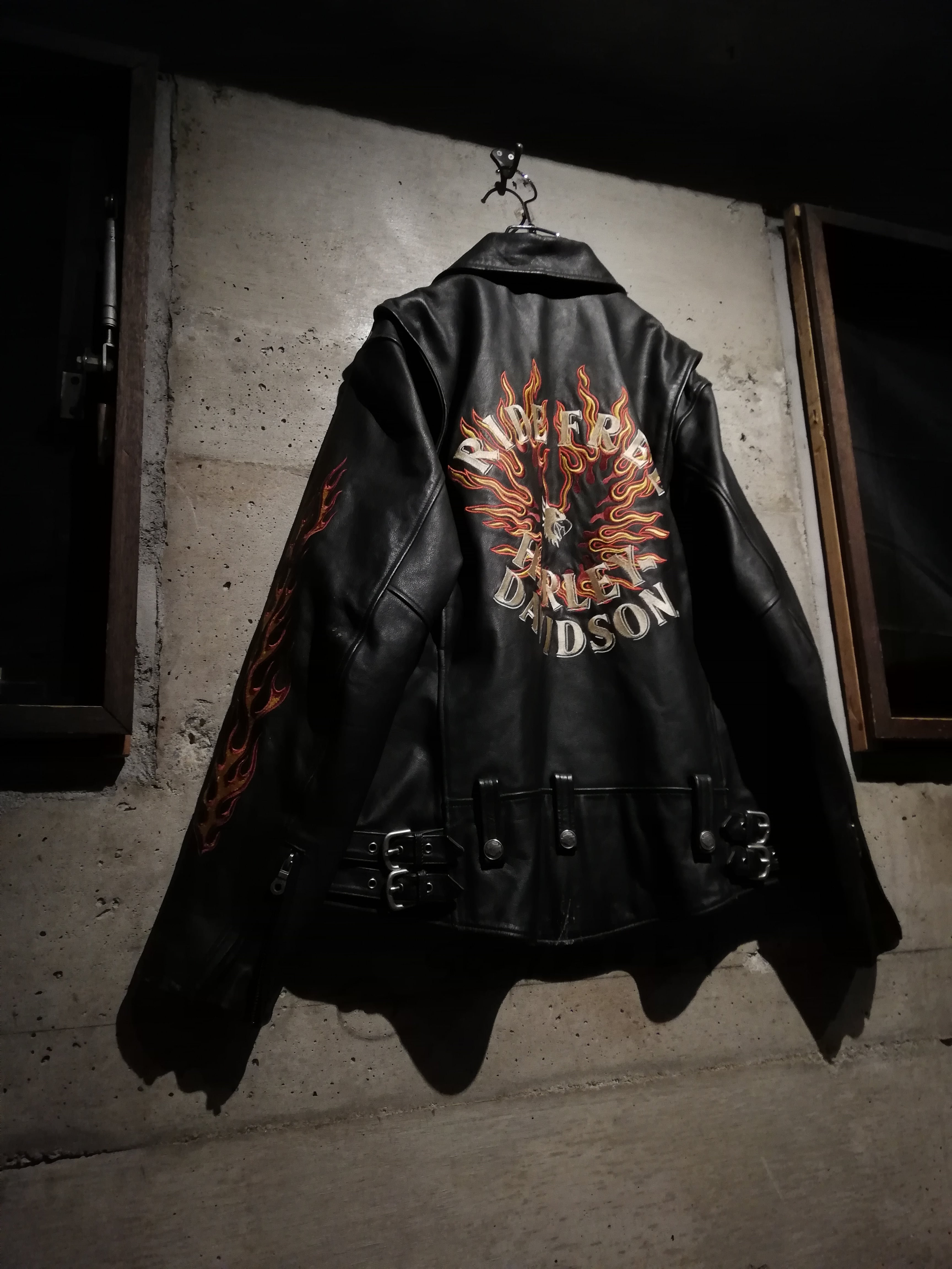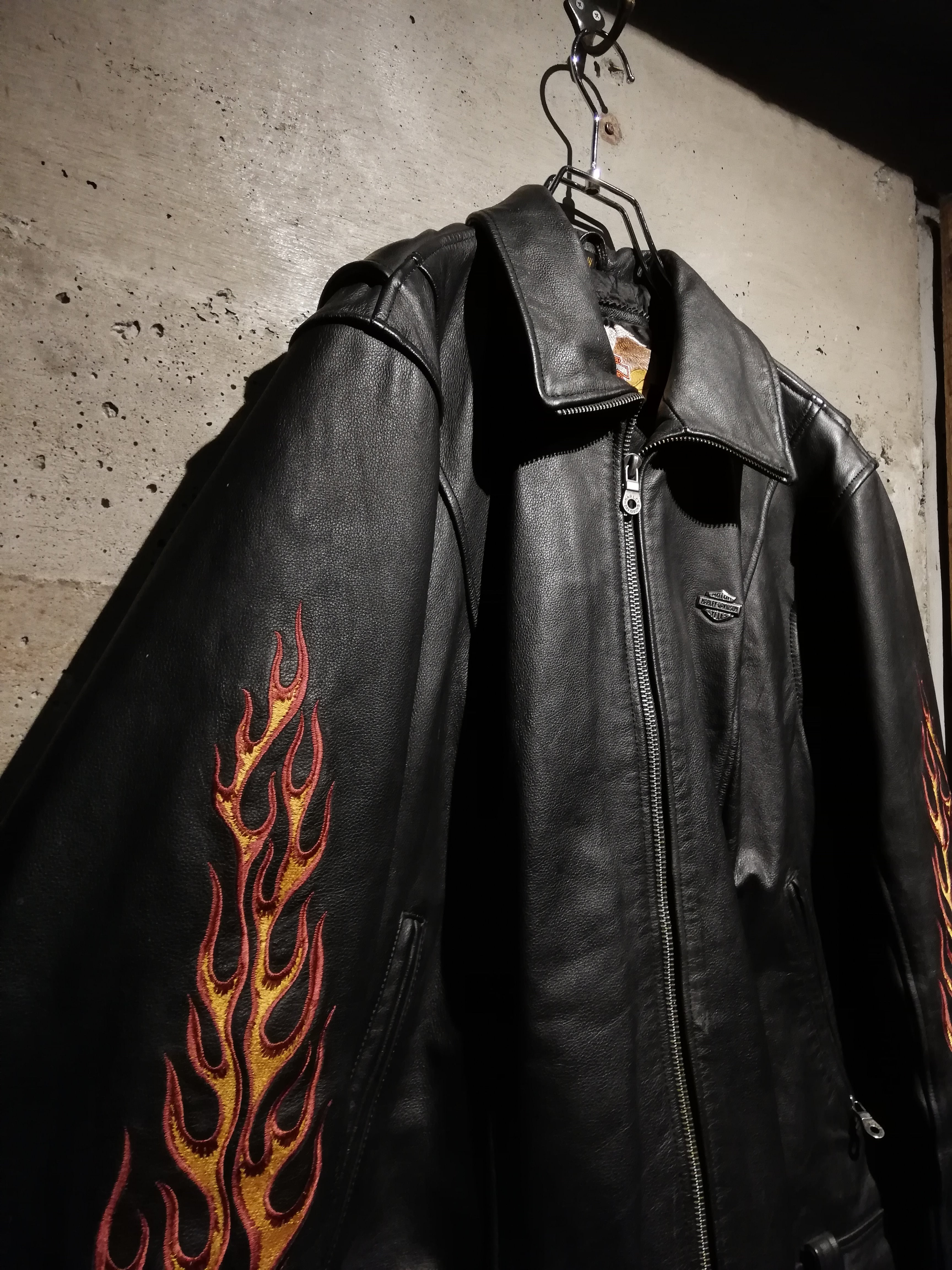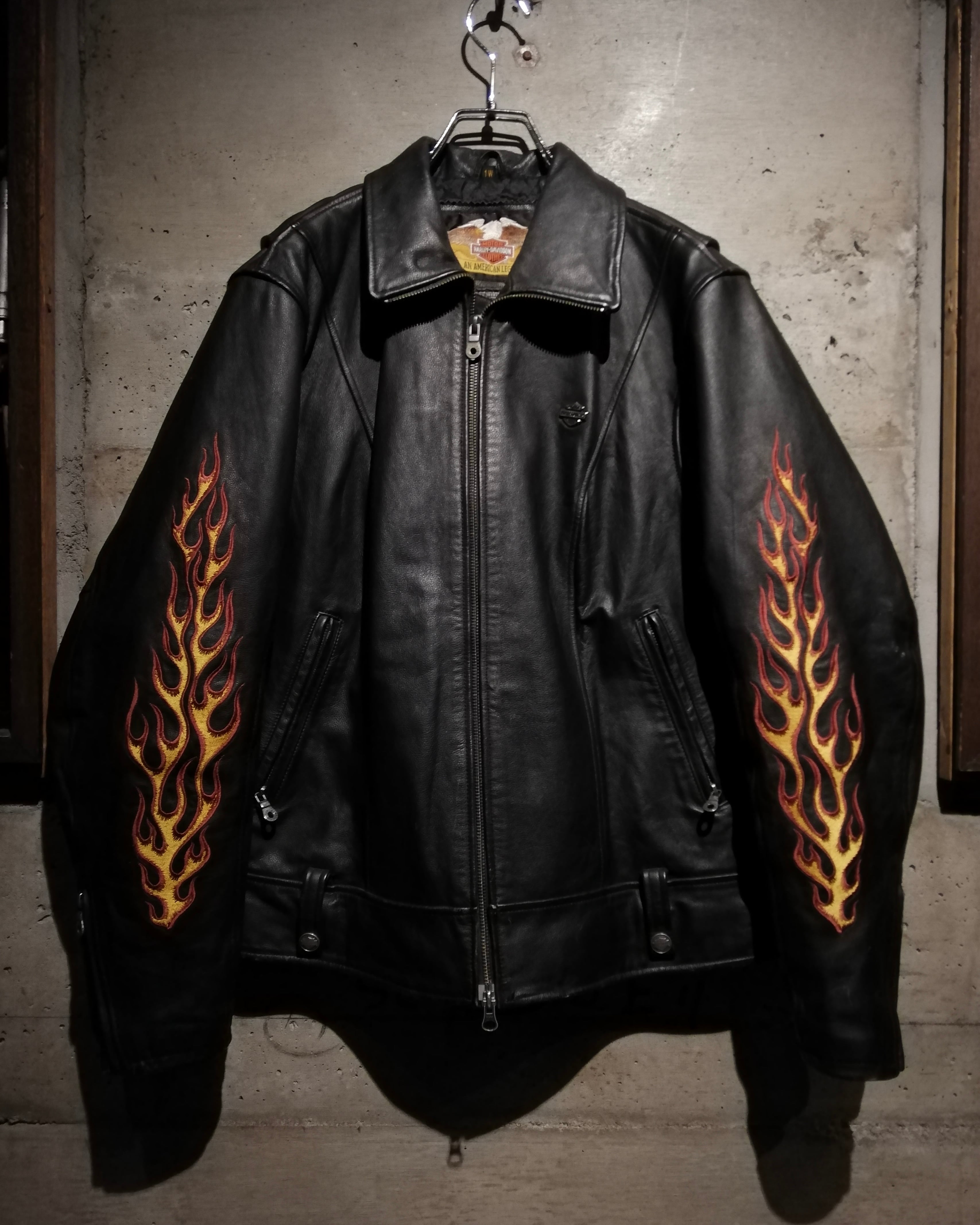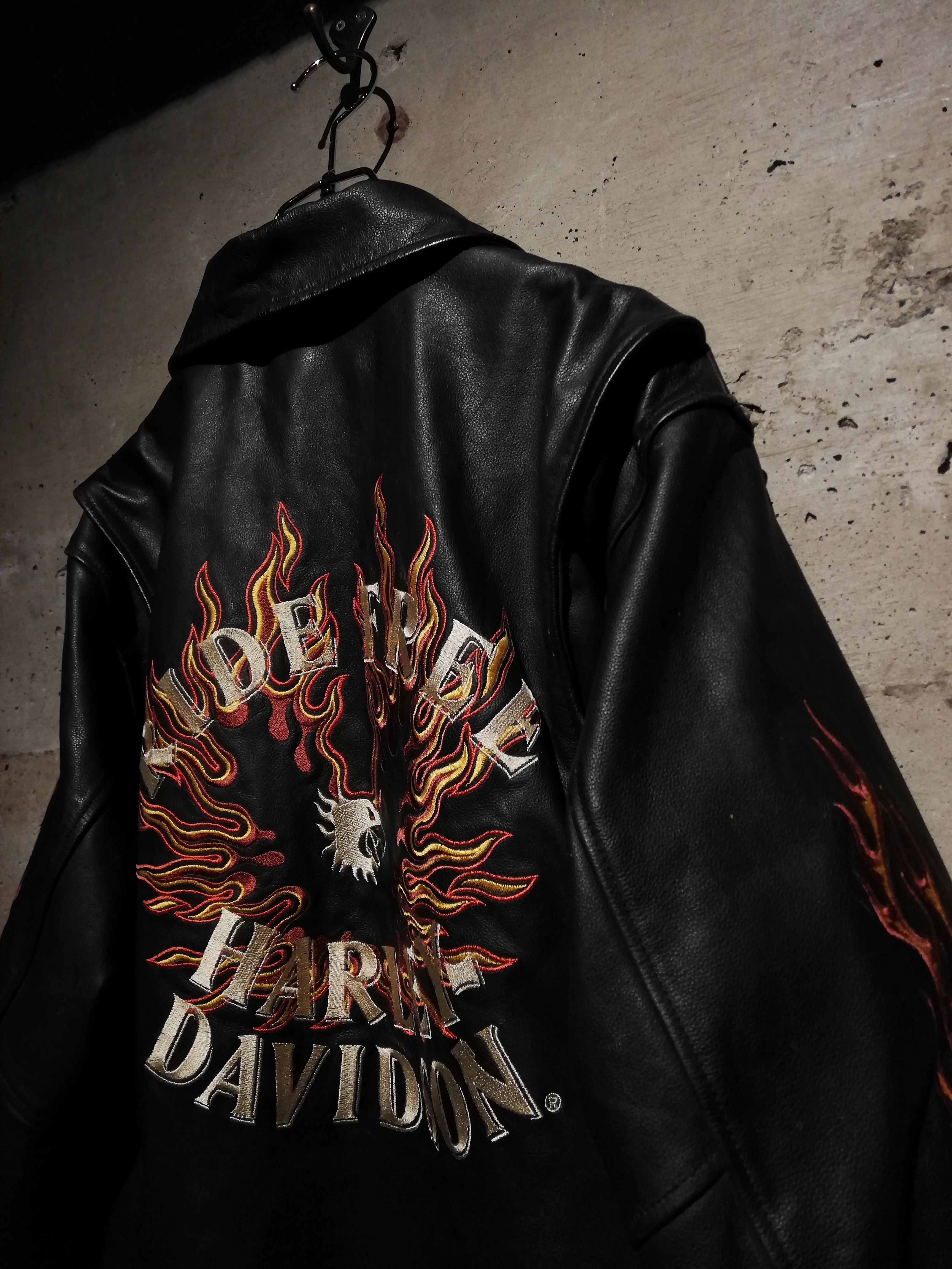 両袖には燃え上がるフレイムモチーフの刺繍を大胆に配置。イエロー×レッドのコントラストがブラックレザーに映え、背面には「RIDE FREE HARLEY DAVIDSON」の文字を囲うように、フレイムとイーグルモチーフの刺繍が施され、バイカーカルチャーを象徴する力強いグラフィックに仕上げられています。