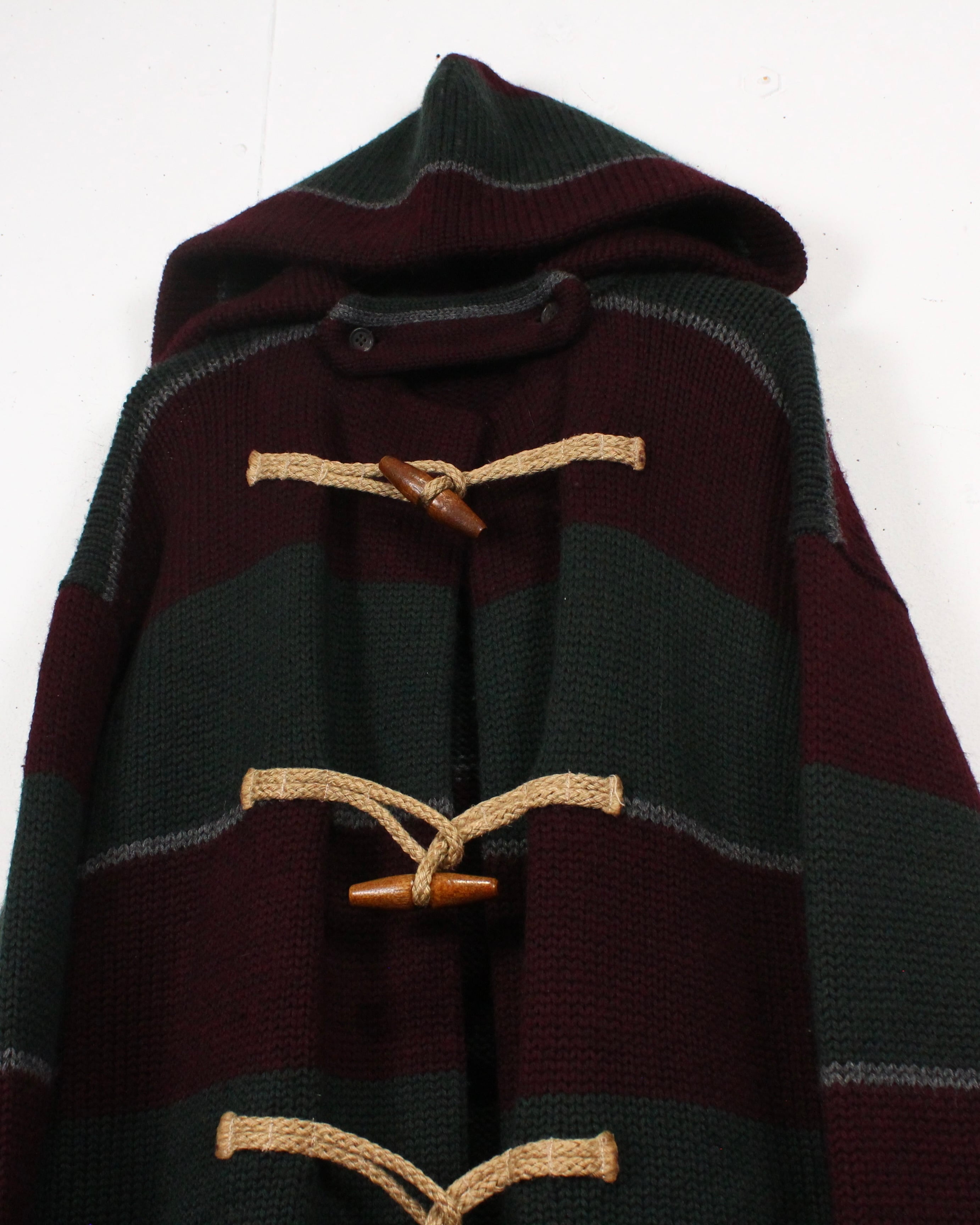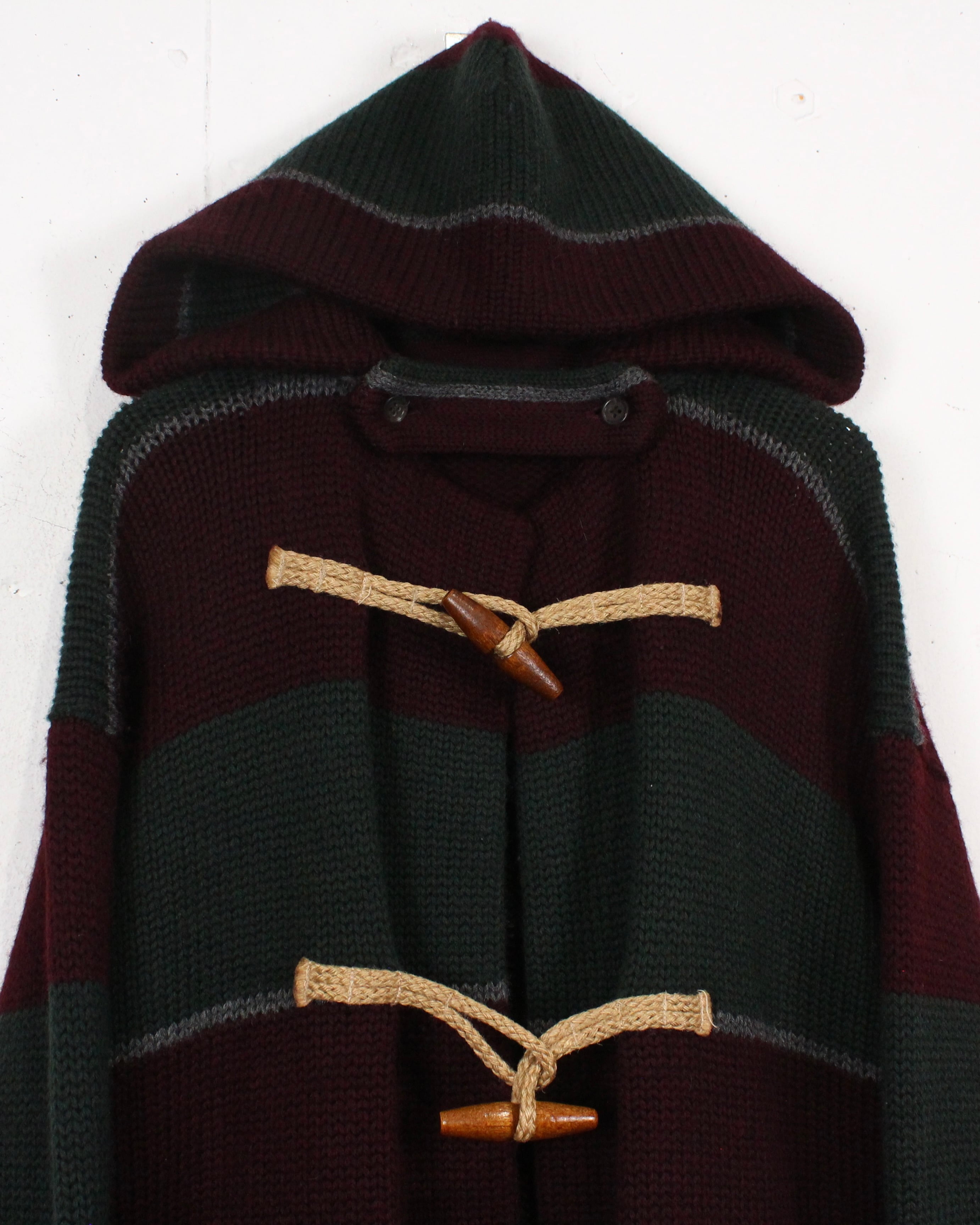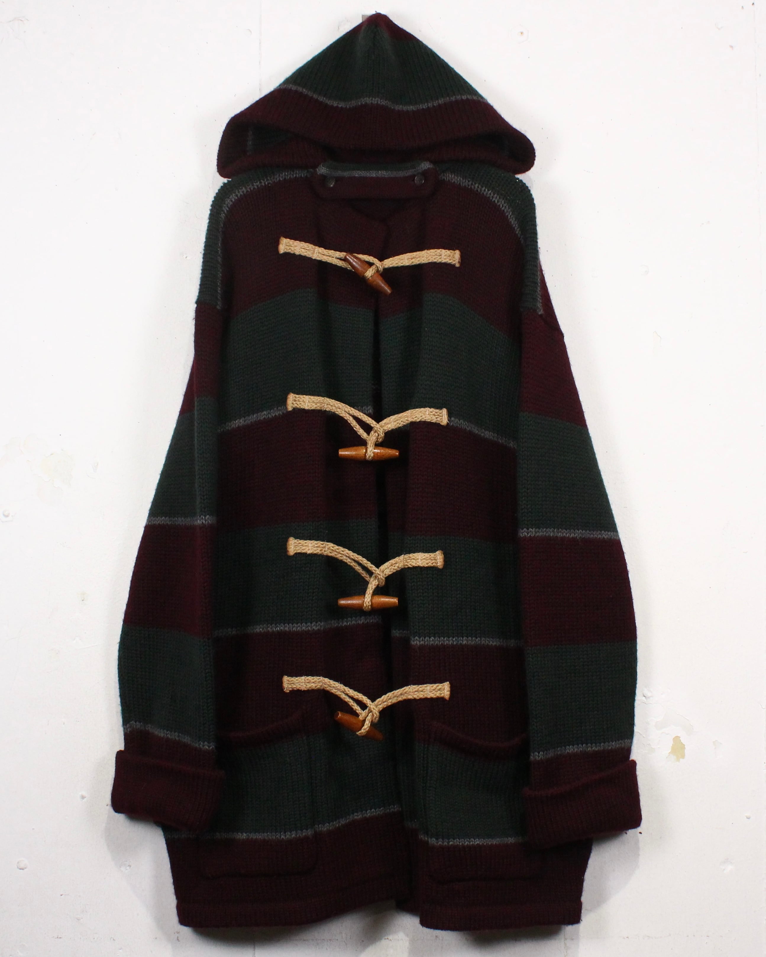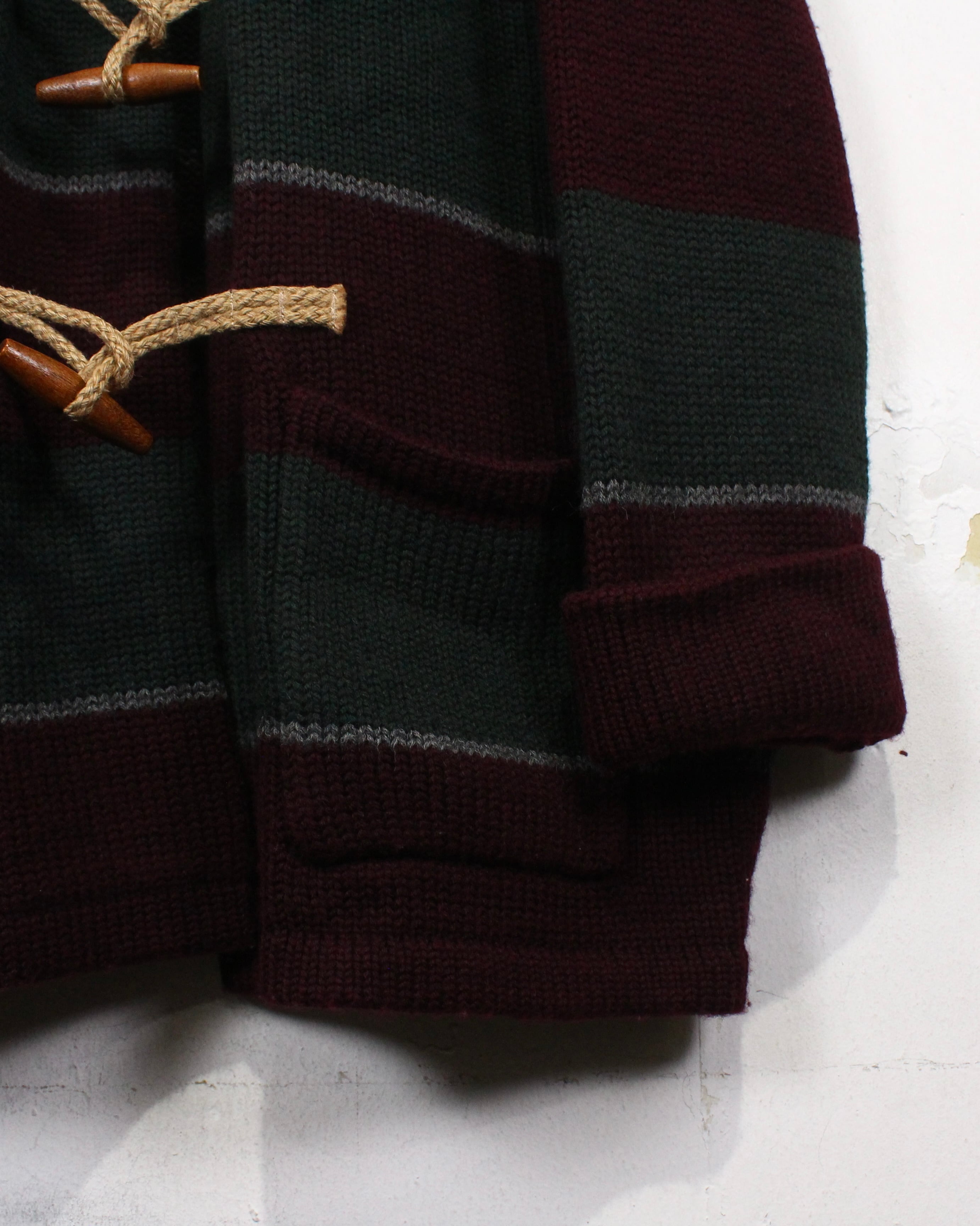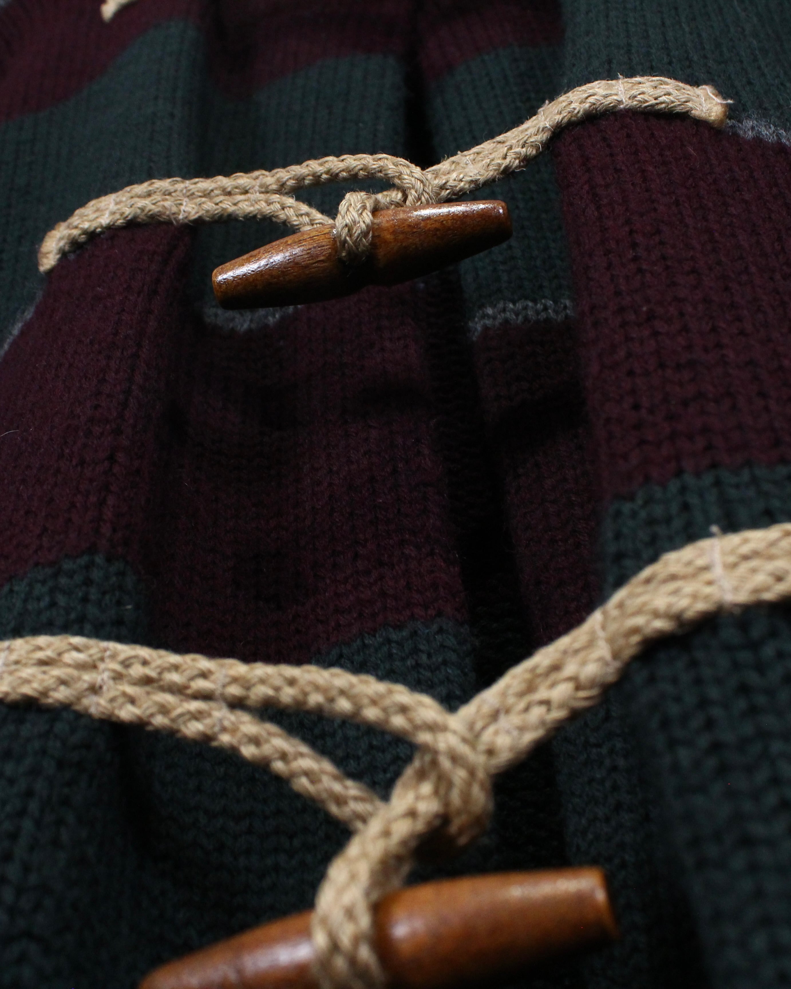 フロントにはダッフルコートを象徴するウッドトグルとロープ留めを採用。ニットならではの温もりある表情と、トグルのクラシックなディテールが好相性で、デザインの要としてしっかり主張します。