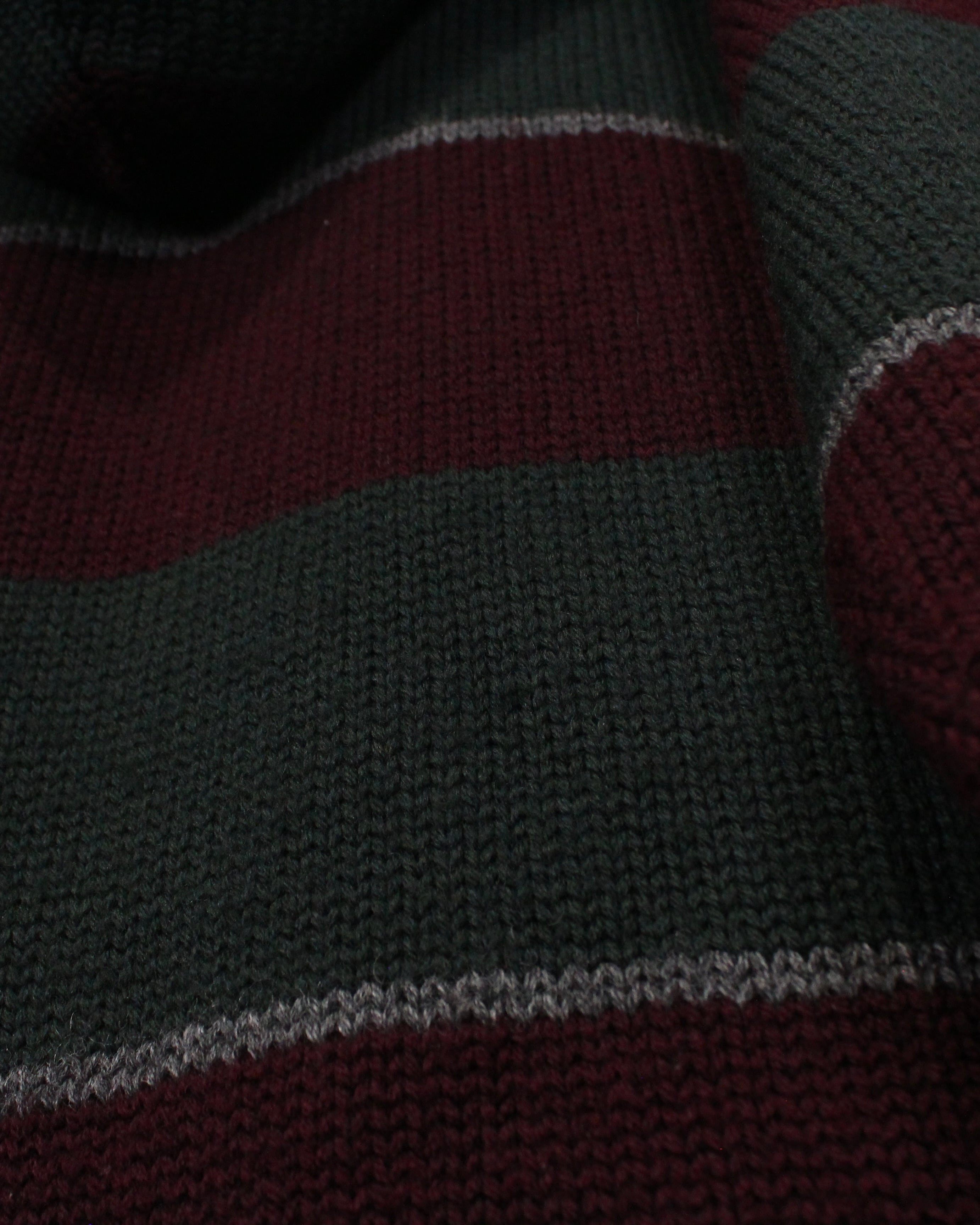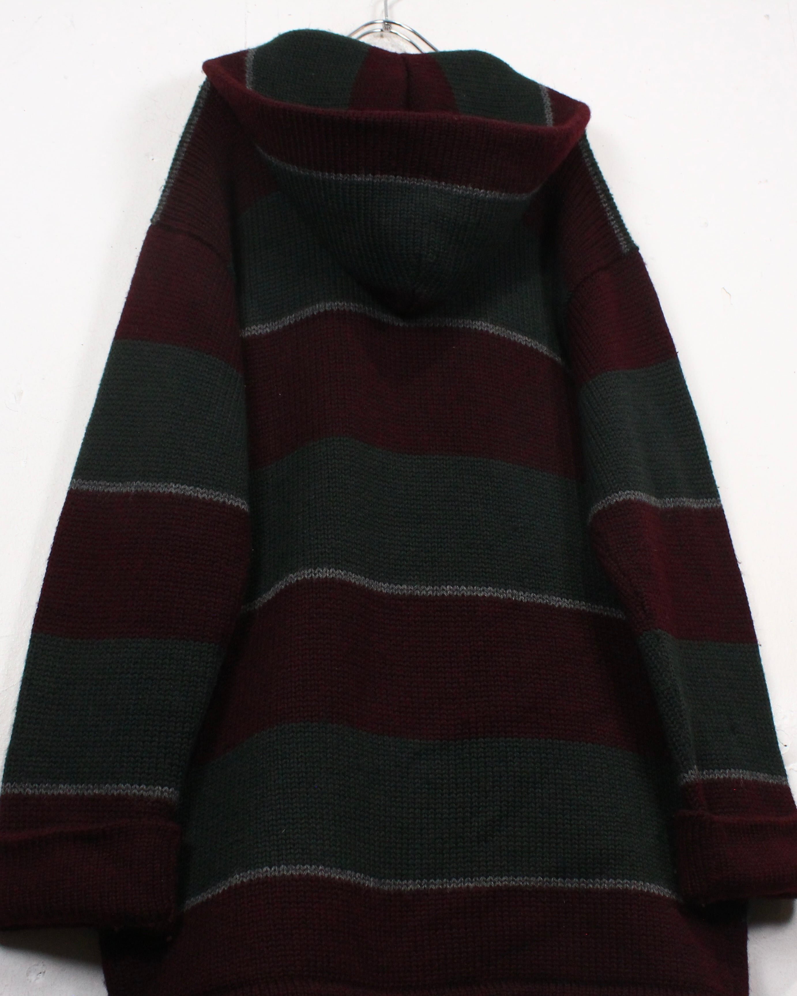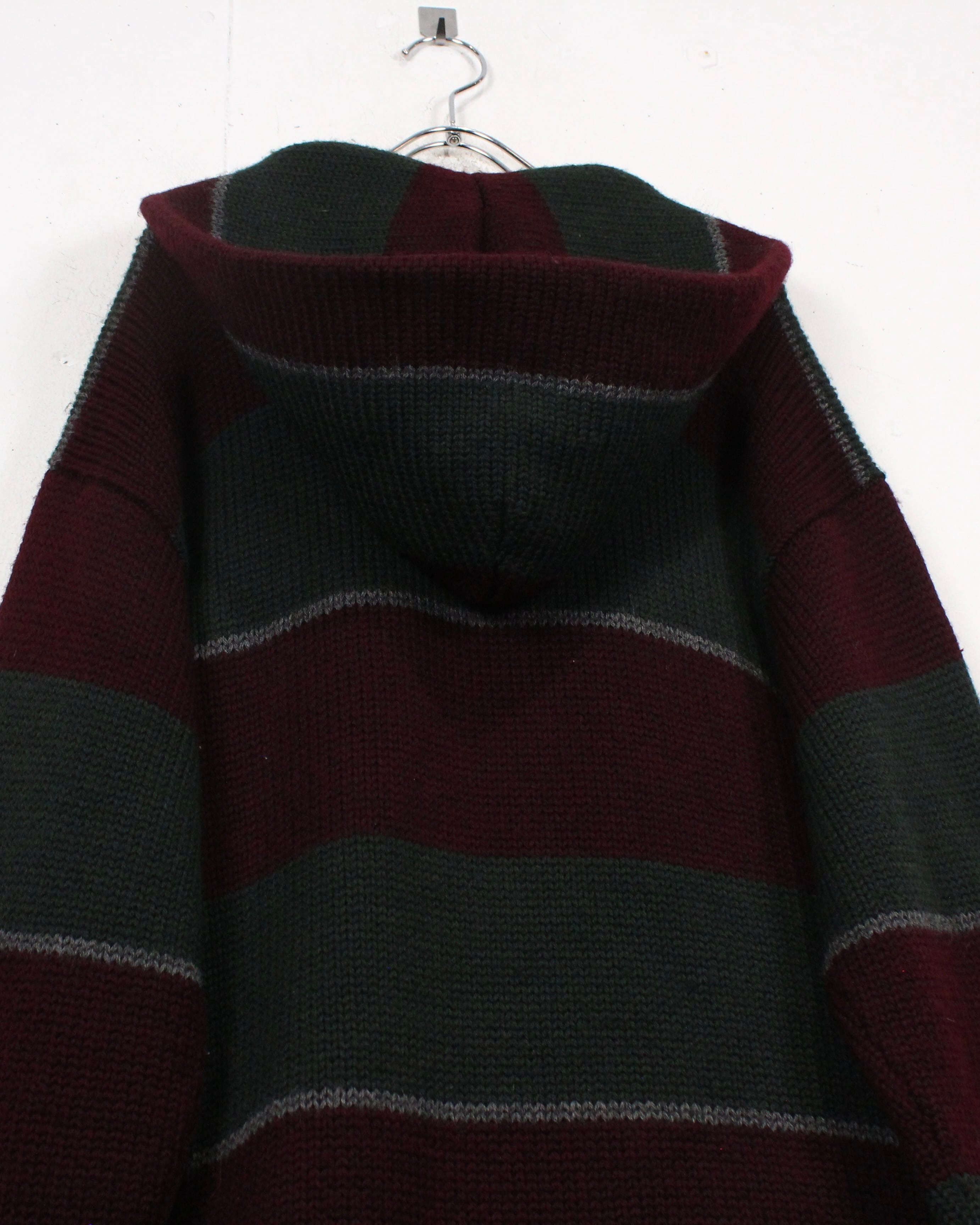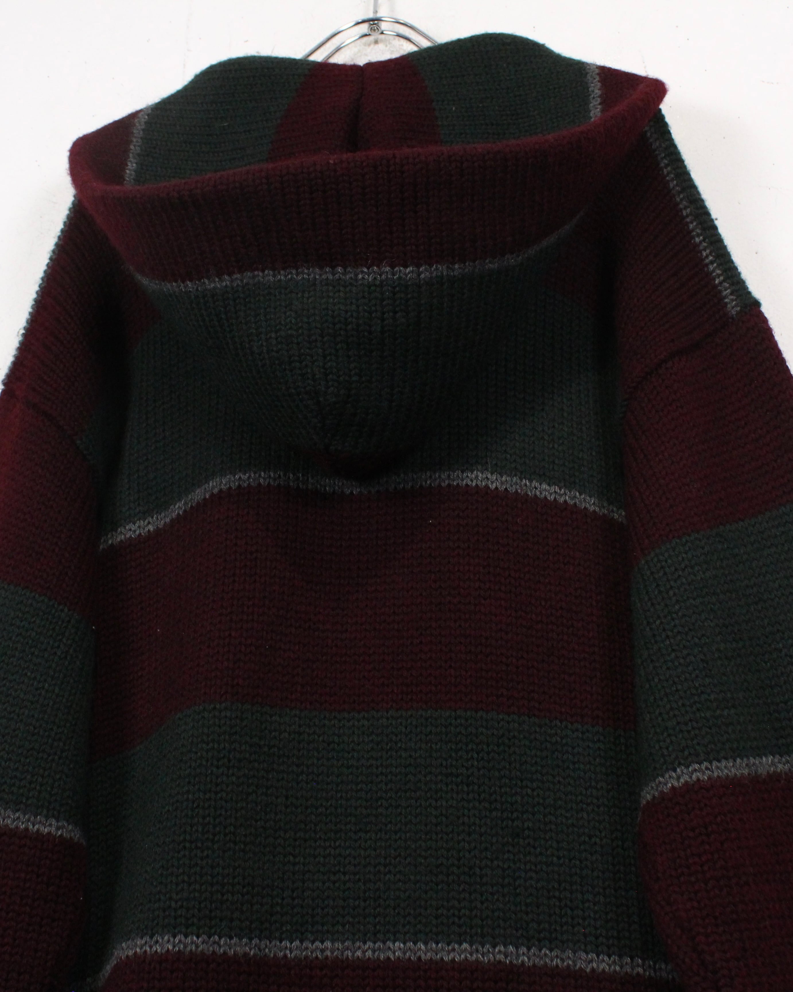 首元のストラップにフード、バーガンディとダークグリーンを基調としたボーダーパターンも◎