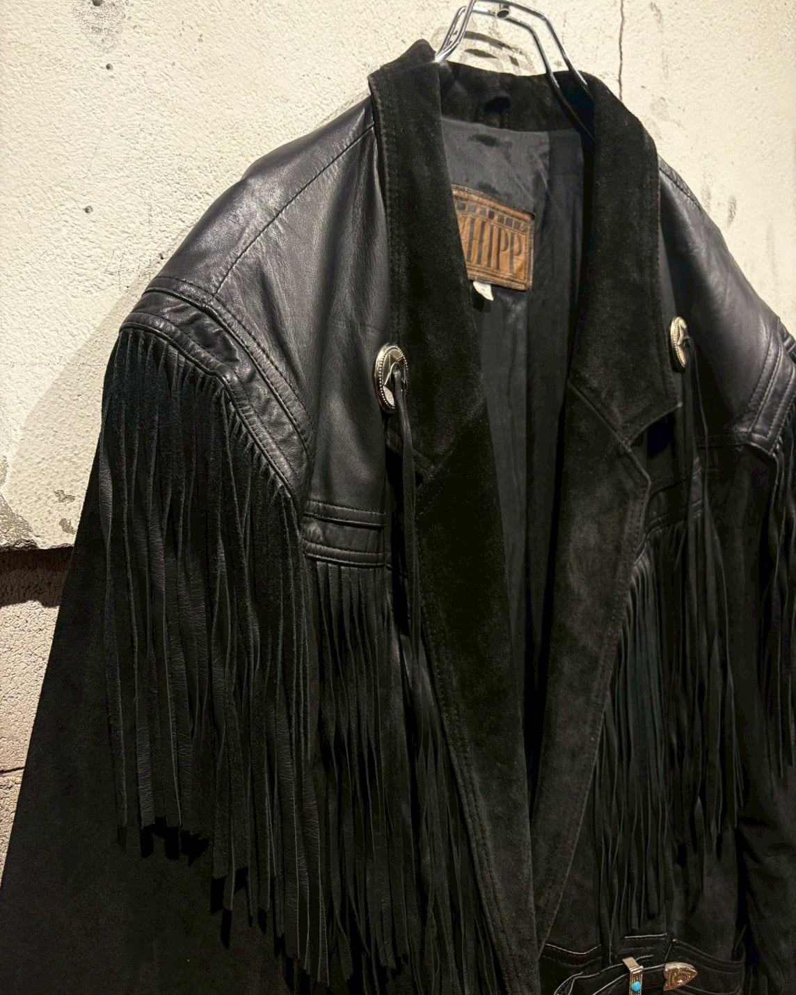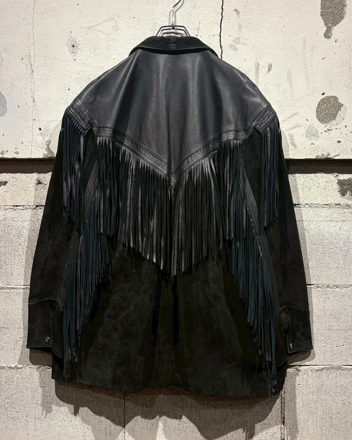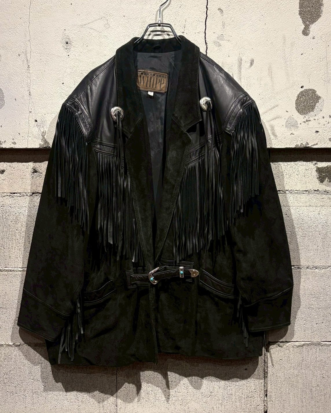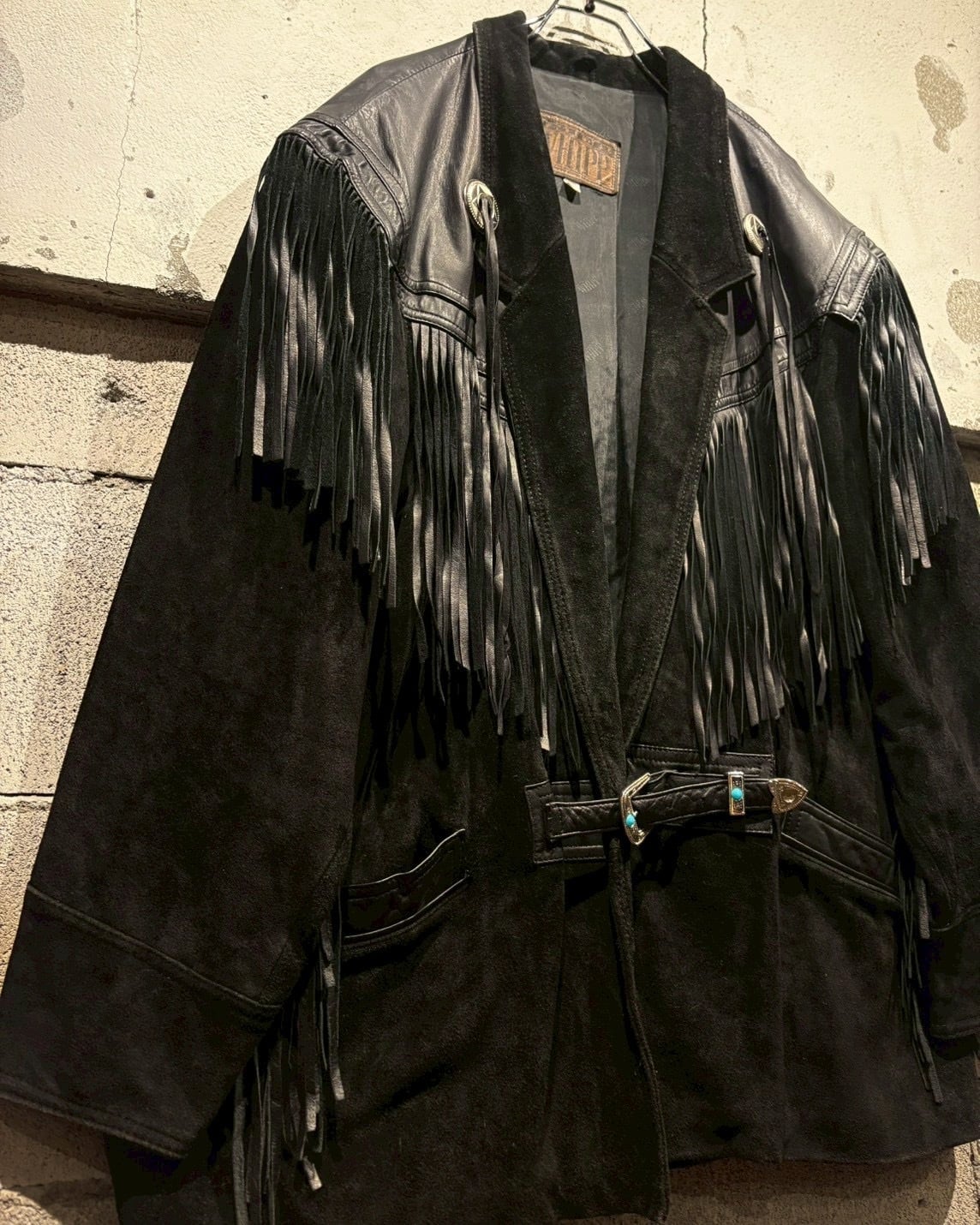 最大の特徴は、袖からフロント、バックのヨークにかけて大胆に施されたレザーフリンジ。動きに合わせて揺れるフリンジ。さらにコンチョボタンの装飾、シルバーのウエスタンベルトを採用し、ディテールの完成度をさらに高めていますね。