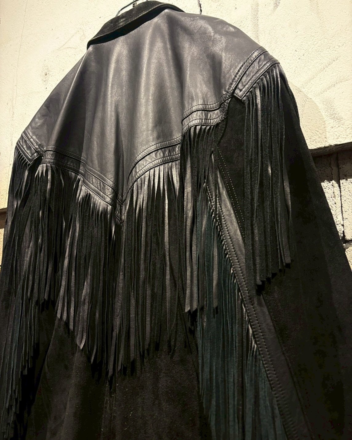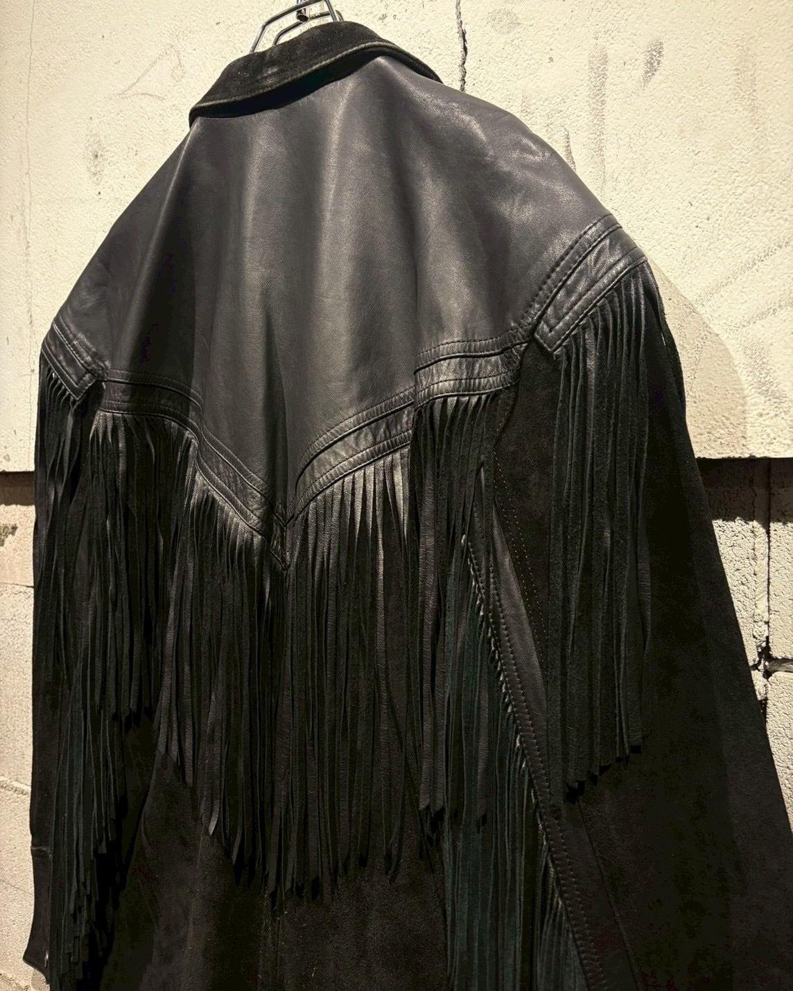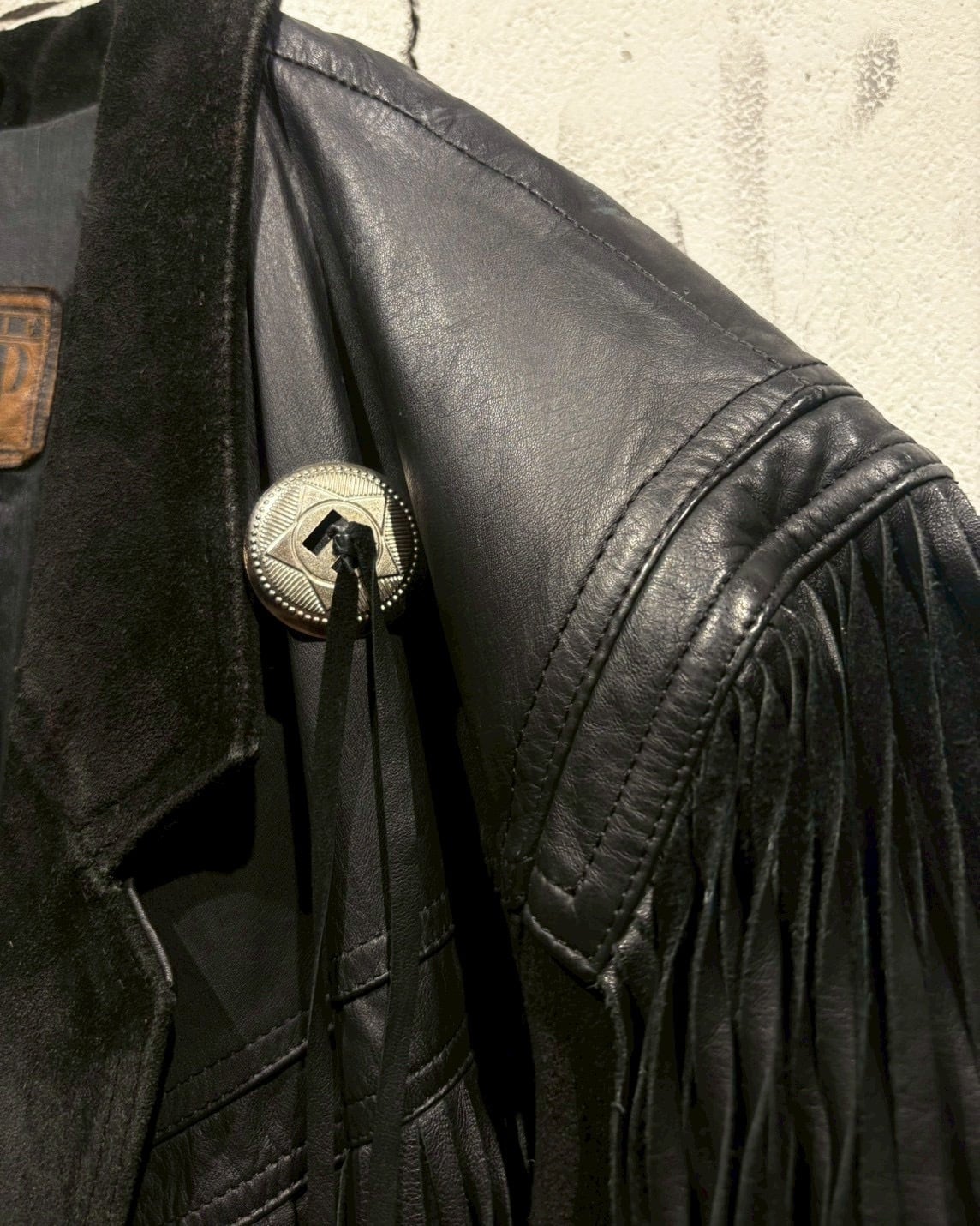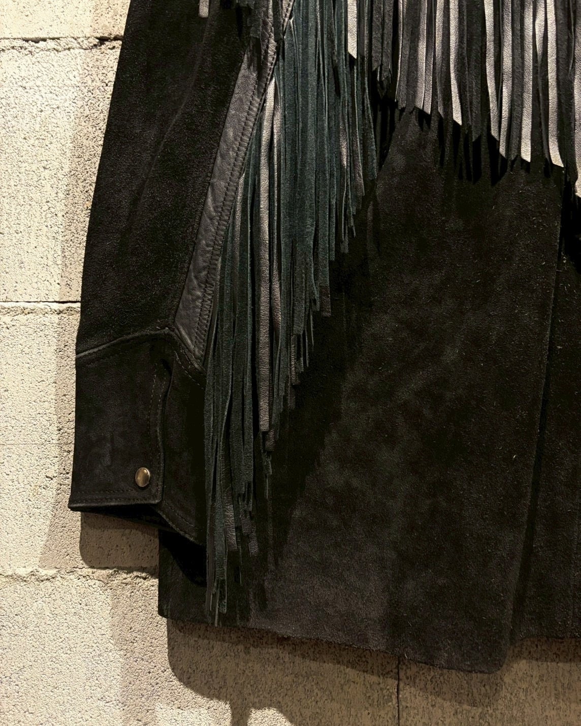 最大の特徴は、袖からフロント、バックのヨークにかけて大胆に施されたレザーフリンジ。動きに合わせて揺れるフリンジ。さらにコンチョボタンの装飾、シルバーのウエスタンベルトを採用し、ディテールの完成度をさらに高めていますね。