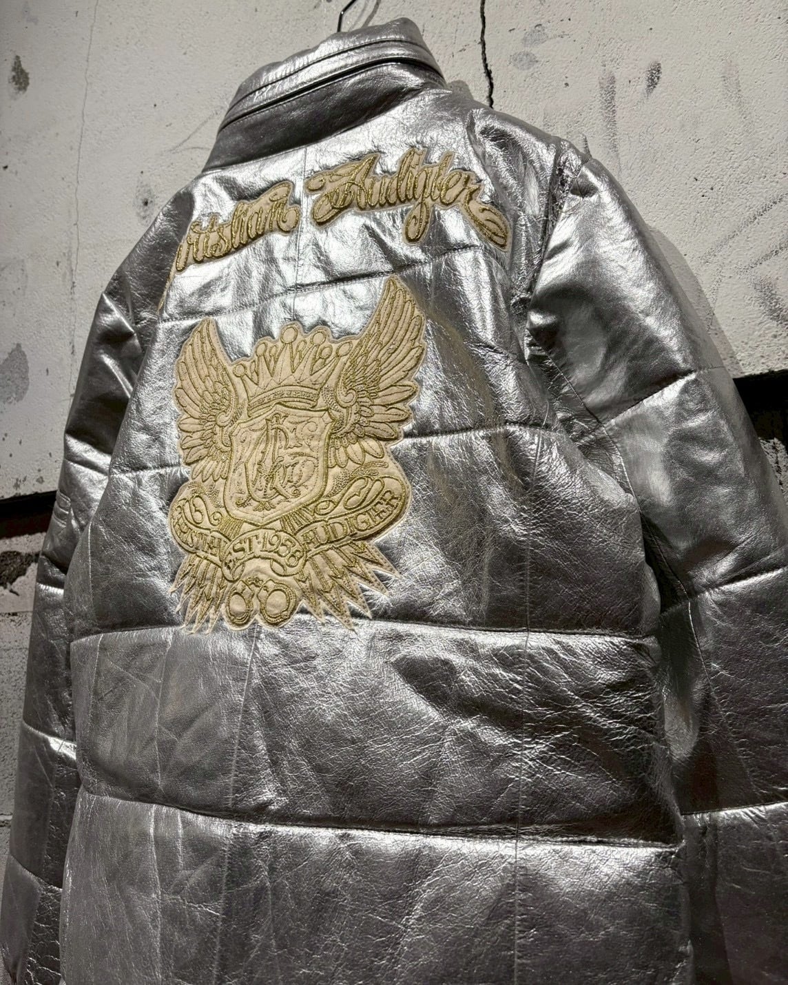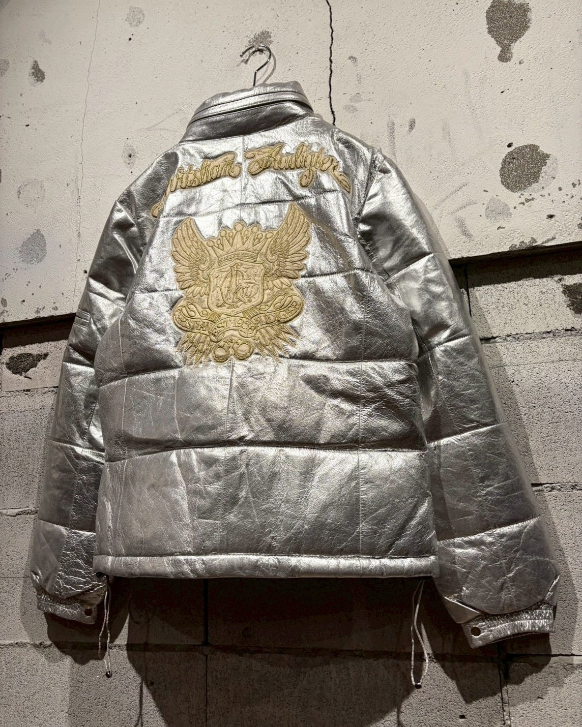 鋭く光を反射するメタリックシルバーのレザーボディをベースに、フロントにはゴールドカラーで施されたブランドロゴワッペンを配置。背面にはエンブレムと、後ろ姿まで抜かりない仕上がりで、シルバー×ゴールドの配色バランスが、ラグジュアリーな雰囲気を漂わせています。