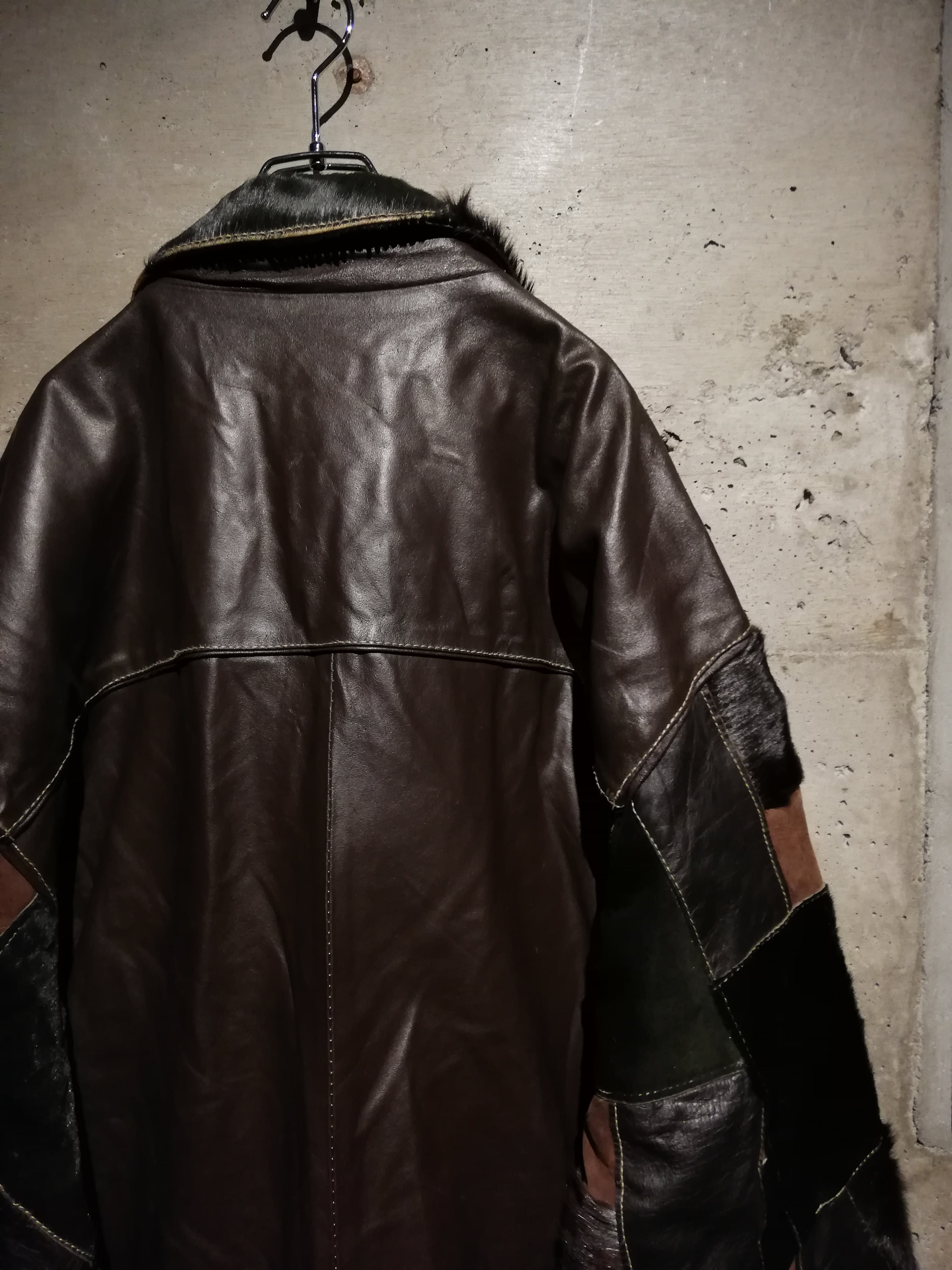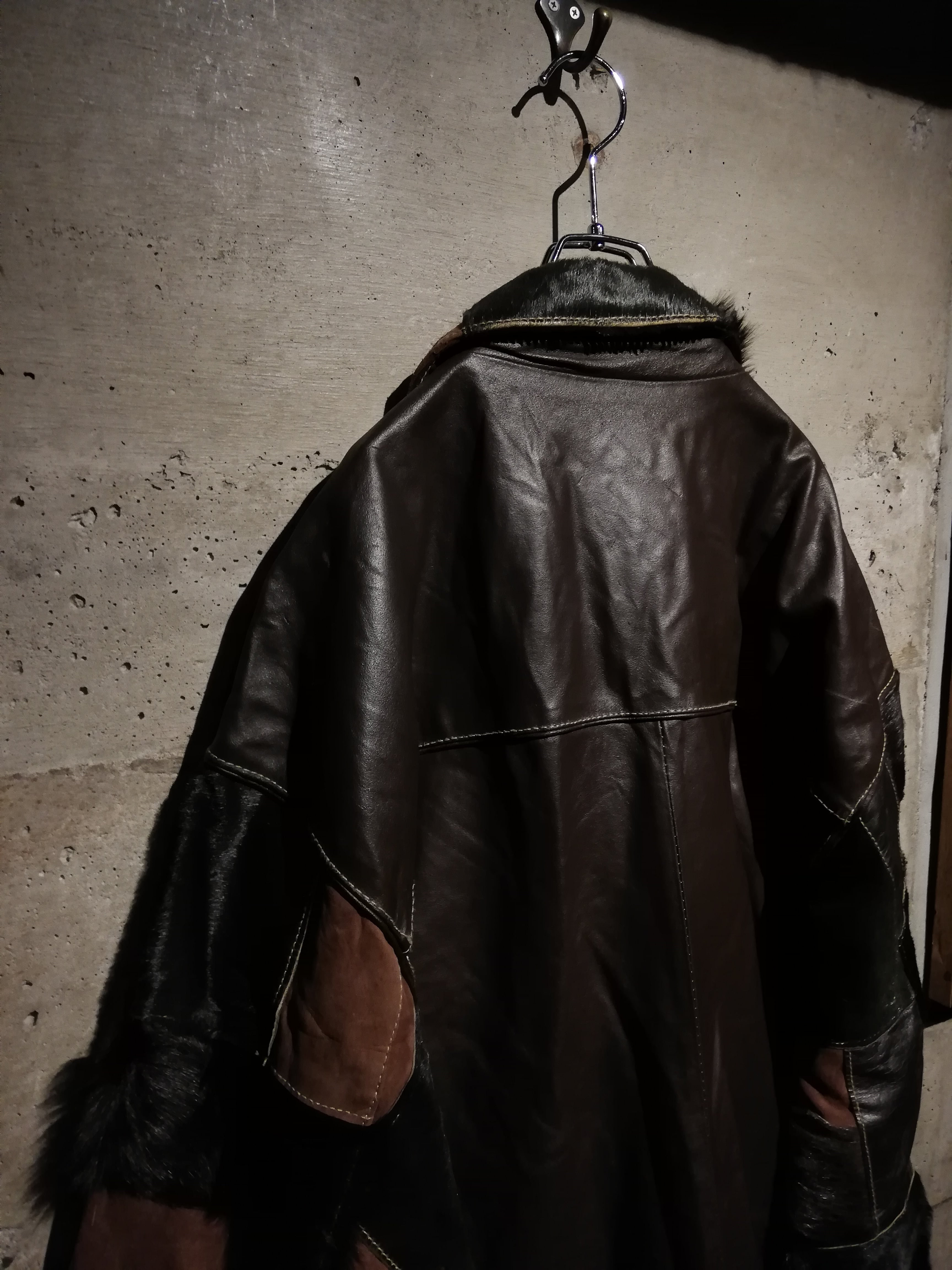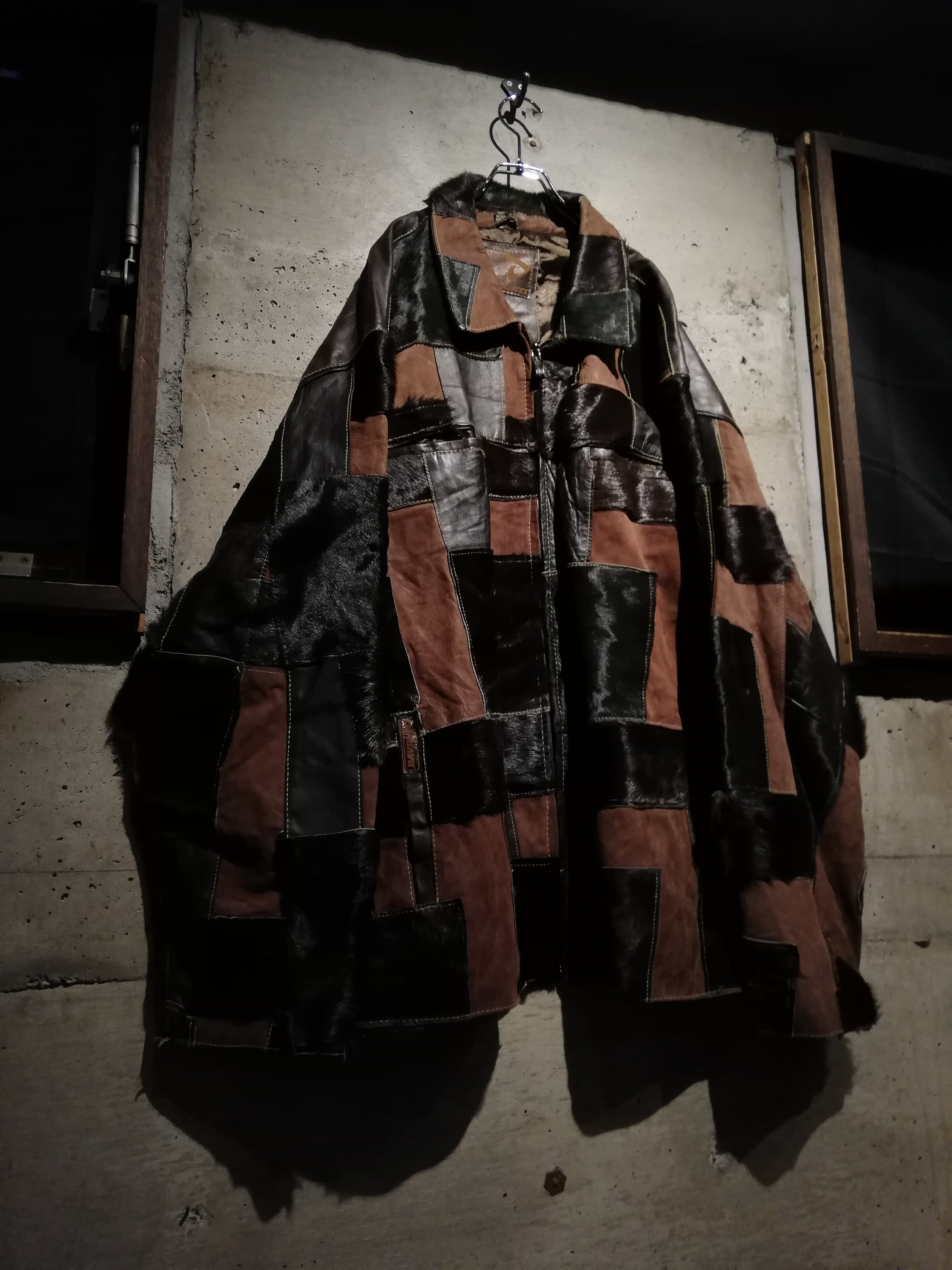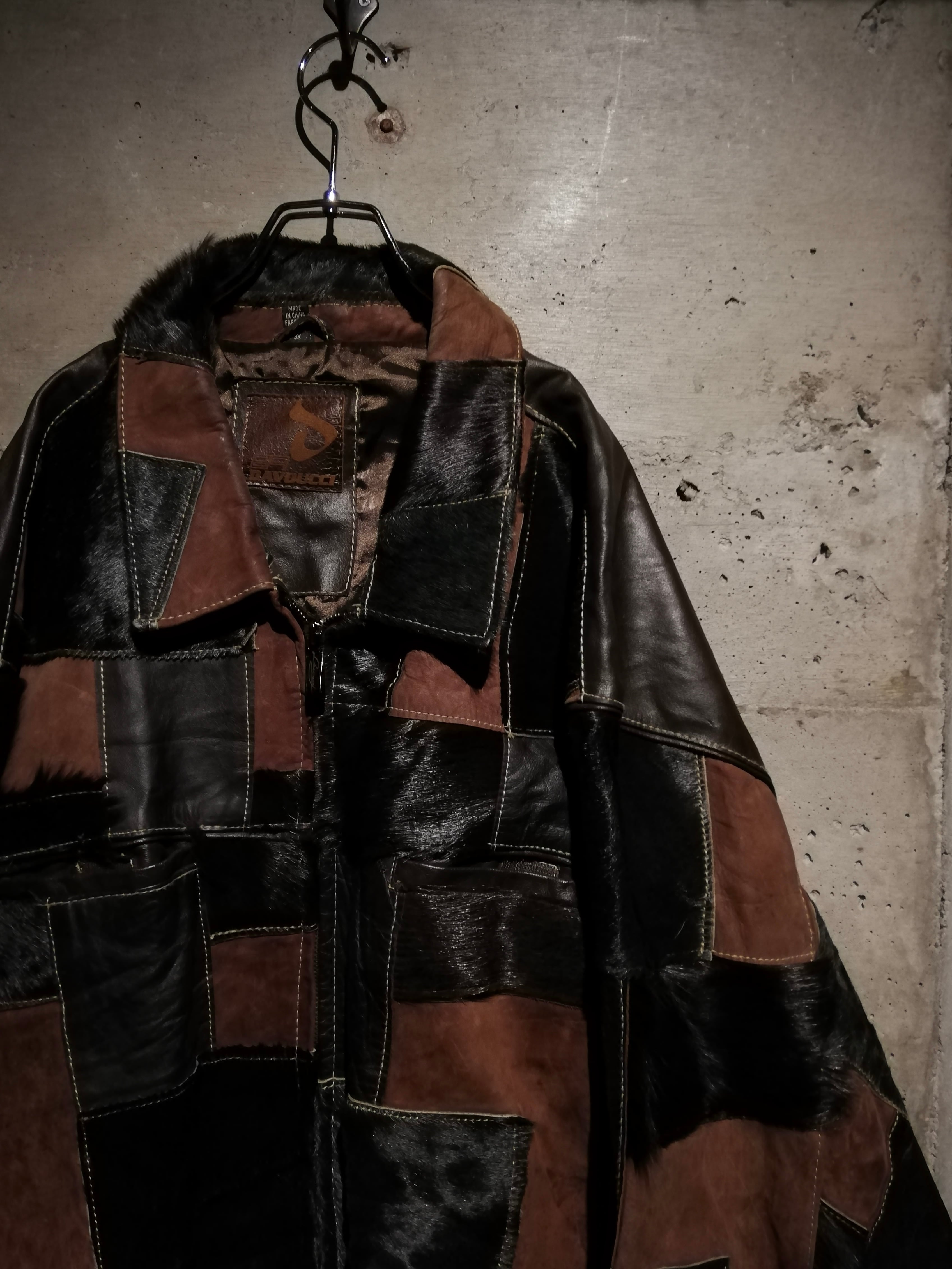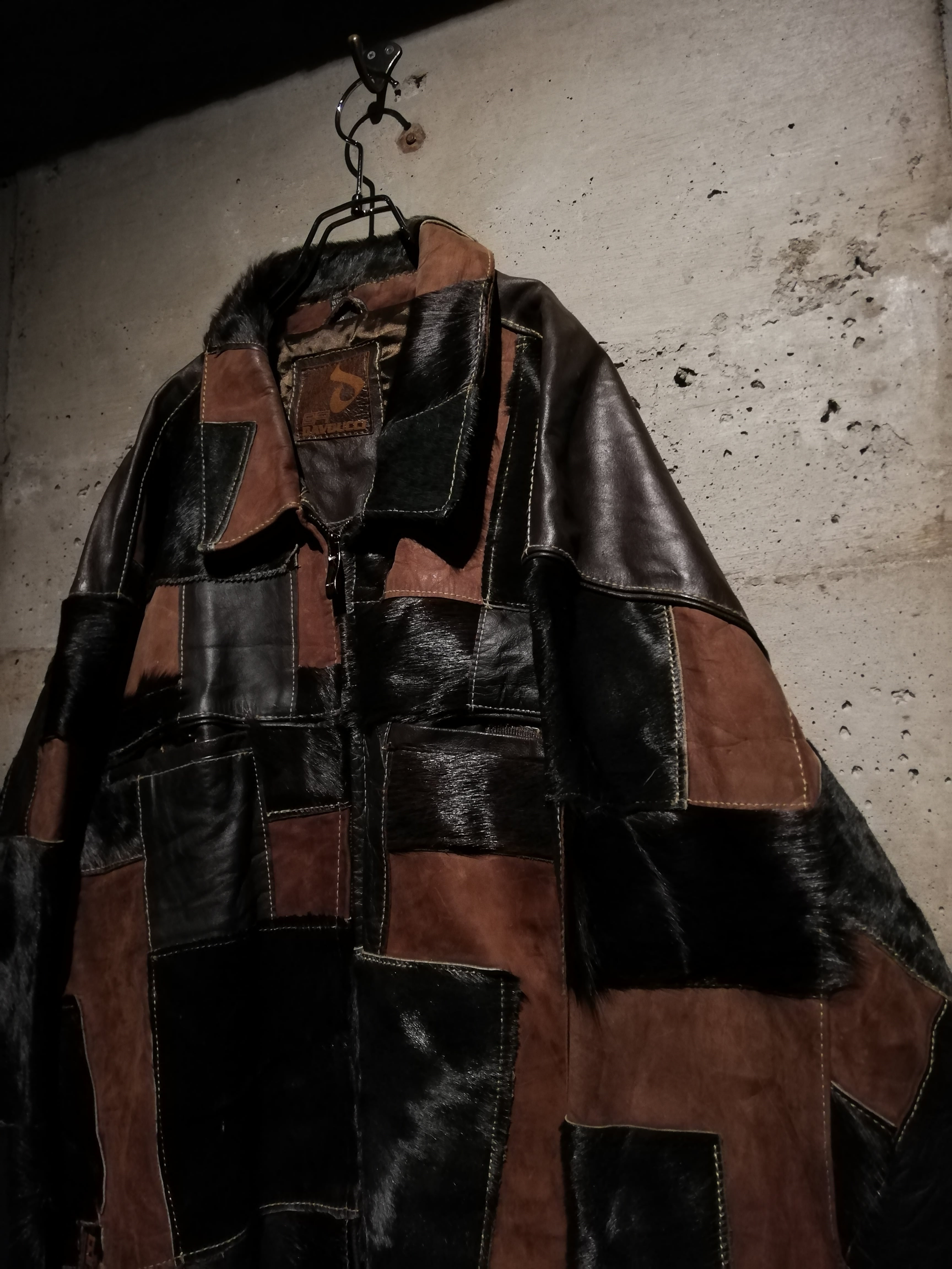 ブラウンのレザーボディに、ハラコとスムースレザーを贅沢に用いたパッチワークで切り替えを施したジャケット。