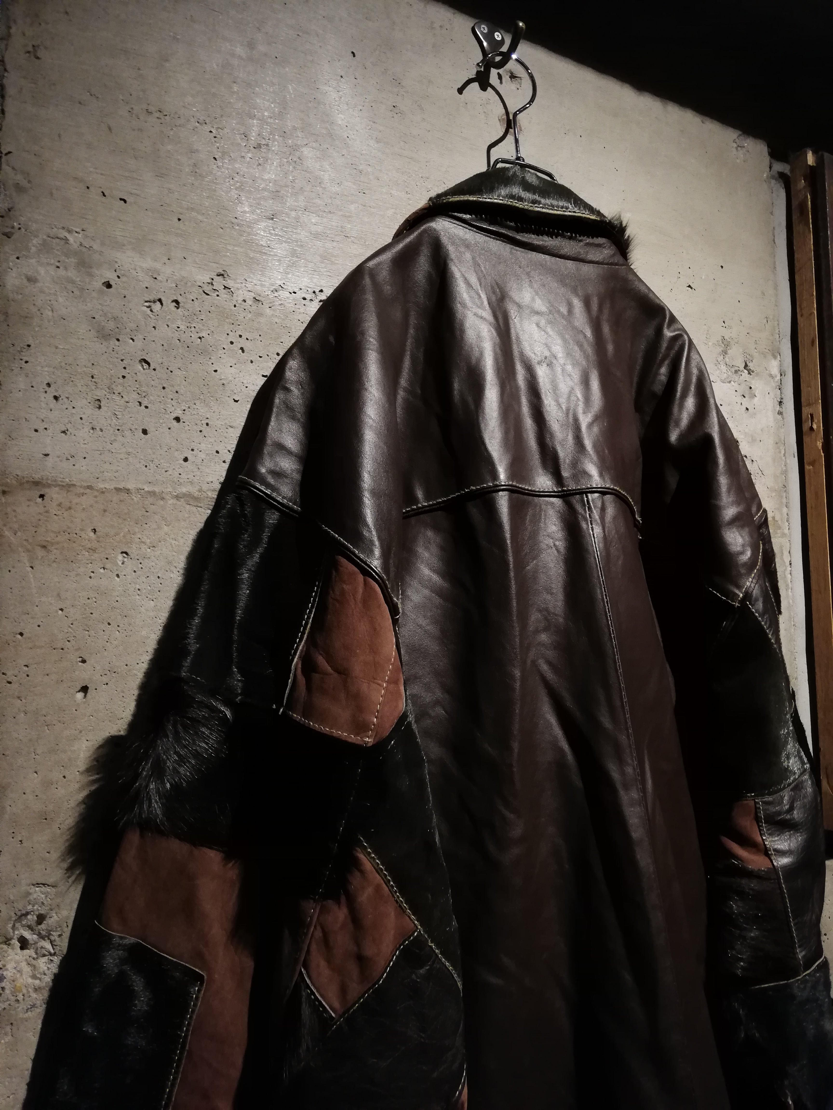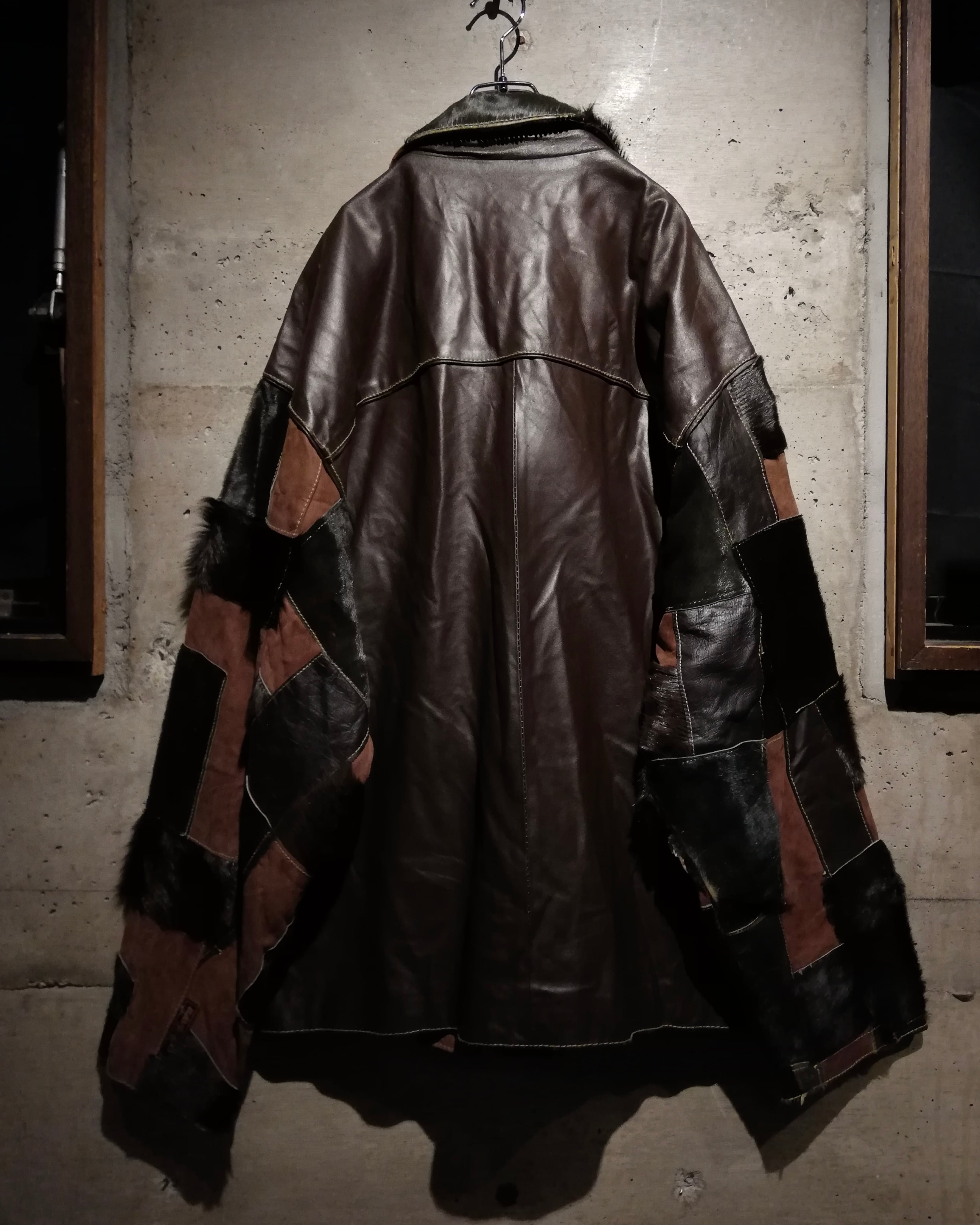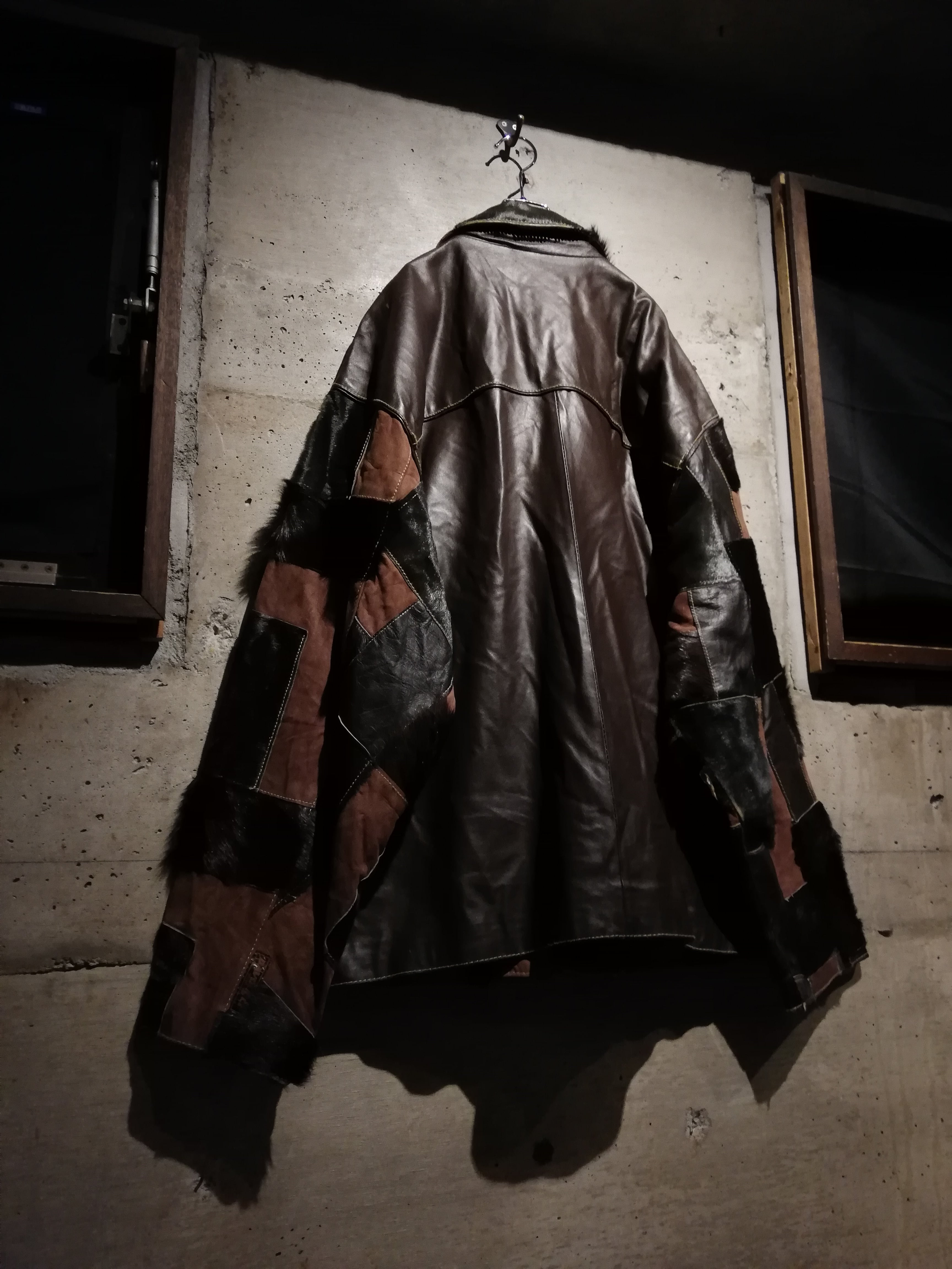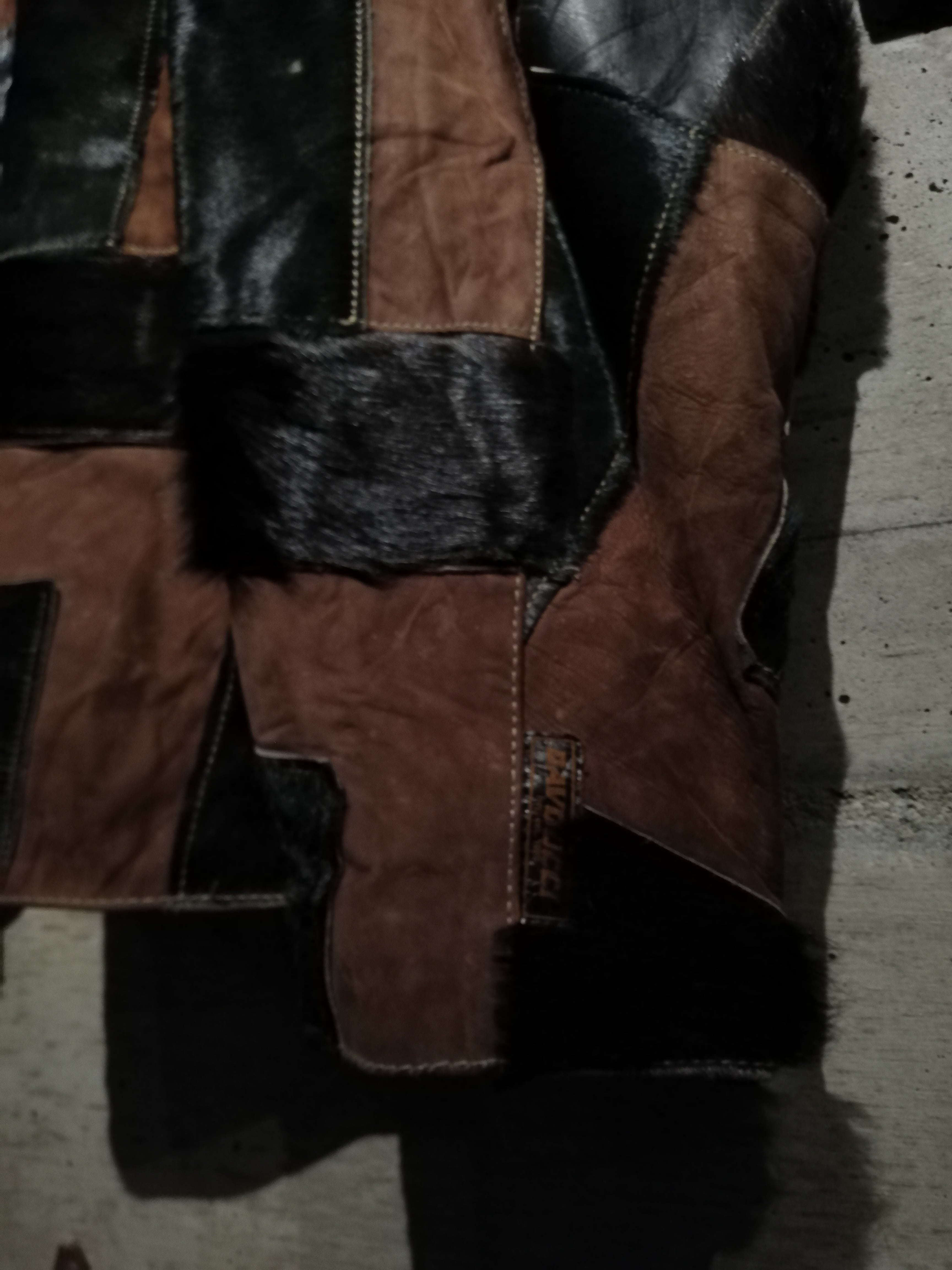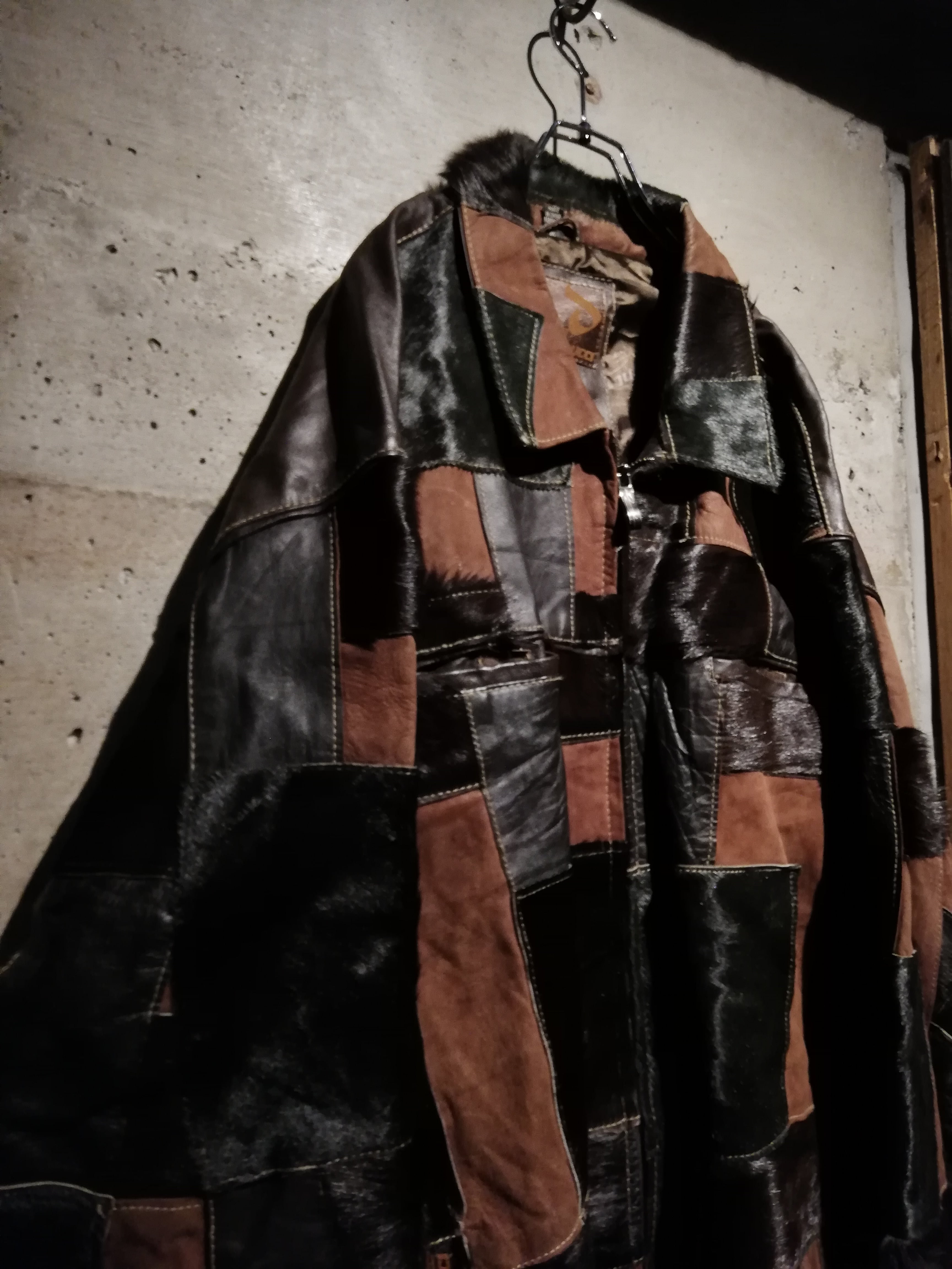ブラウンのレザーボディに、ハラコとスムースレザーを贅沢に用いたパッチワークで切り替えを施したジャケット。