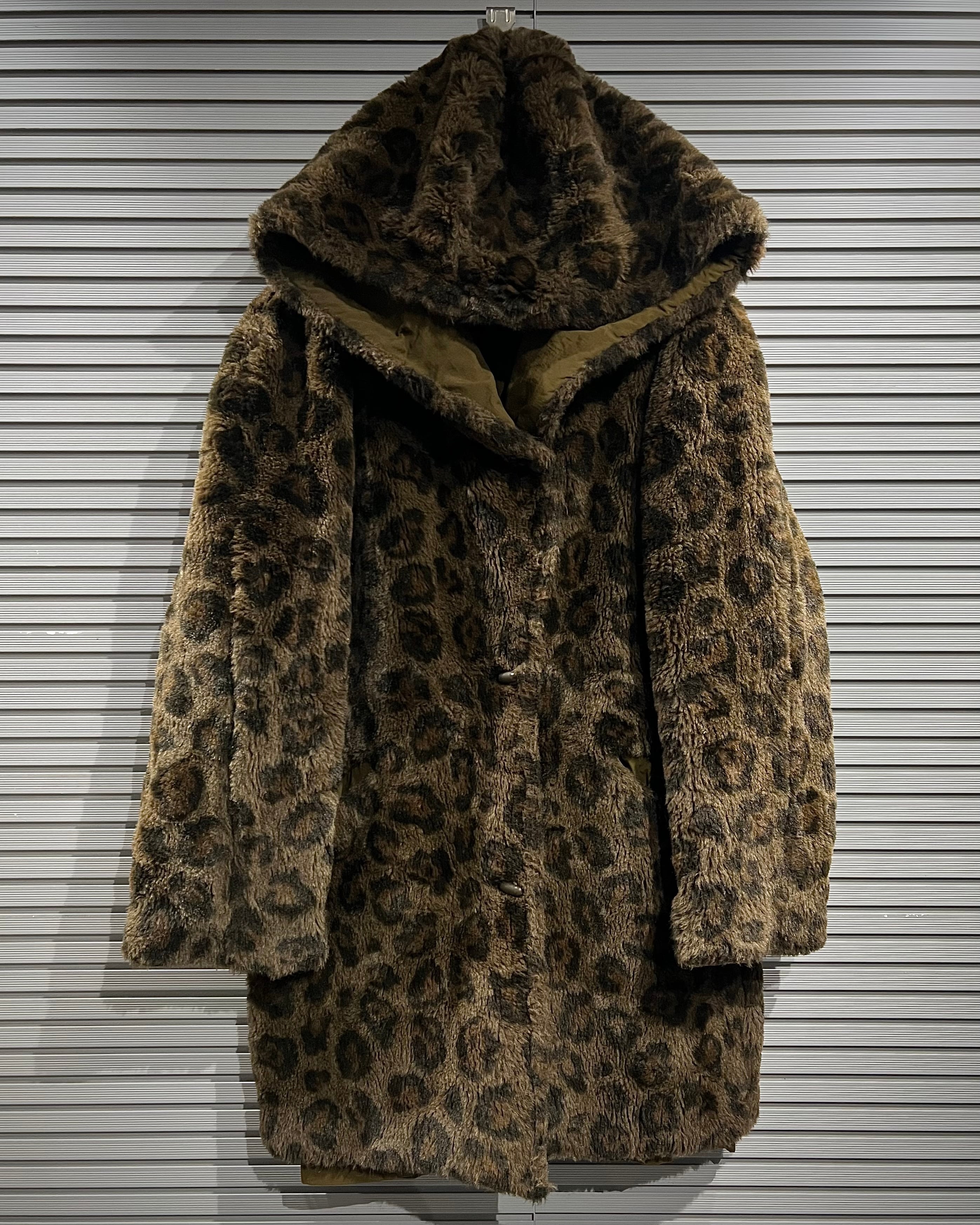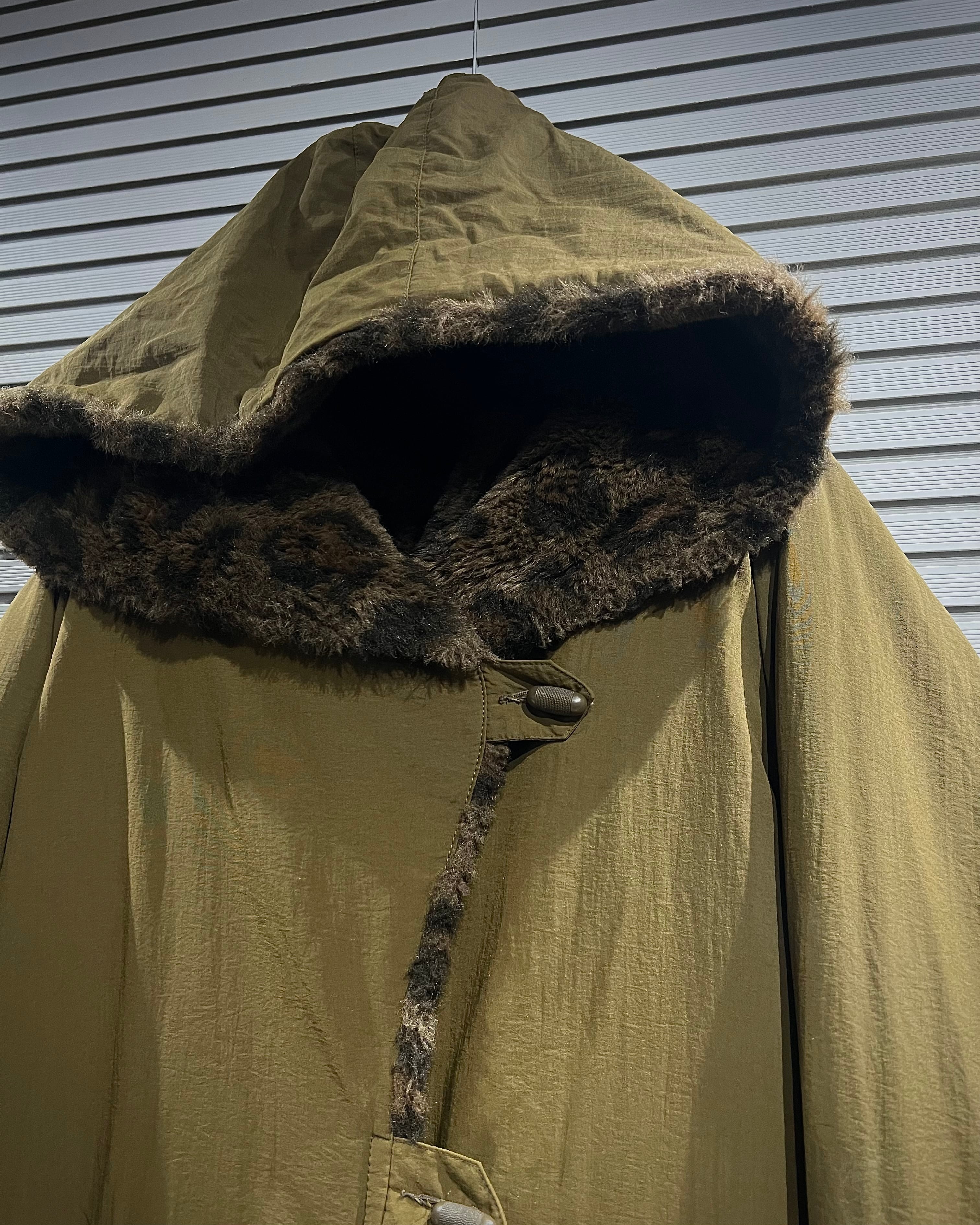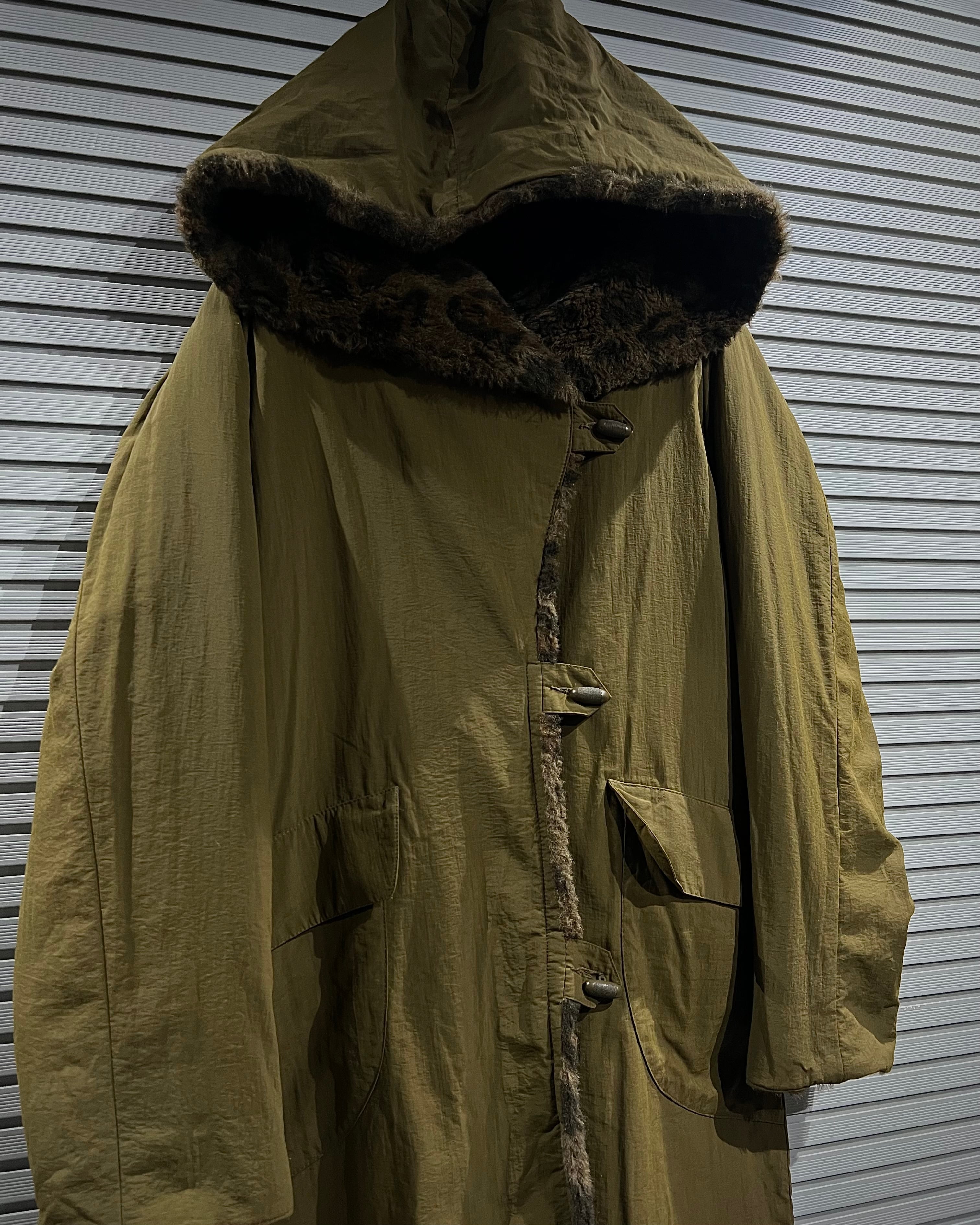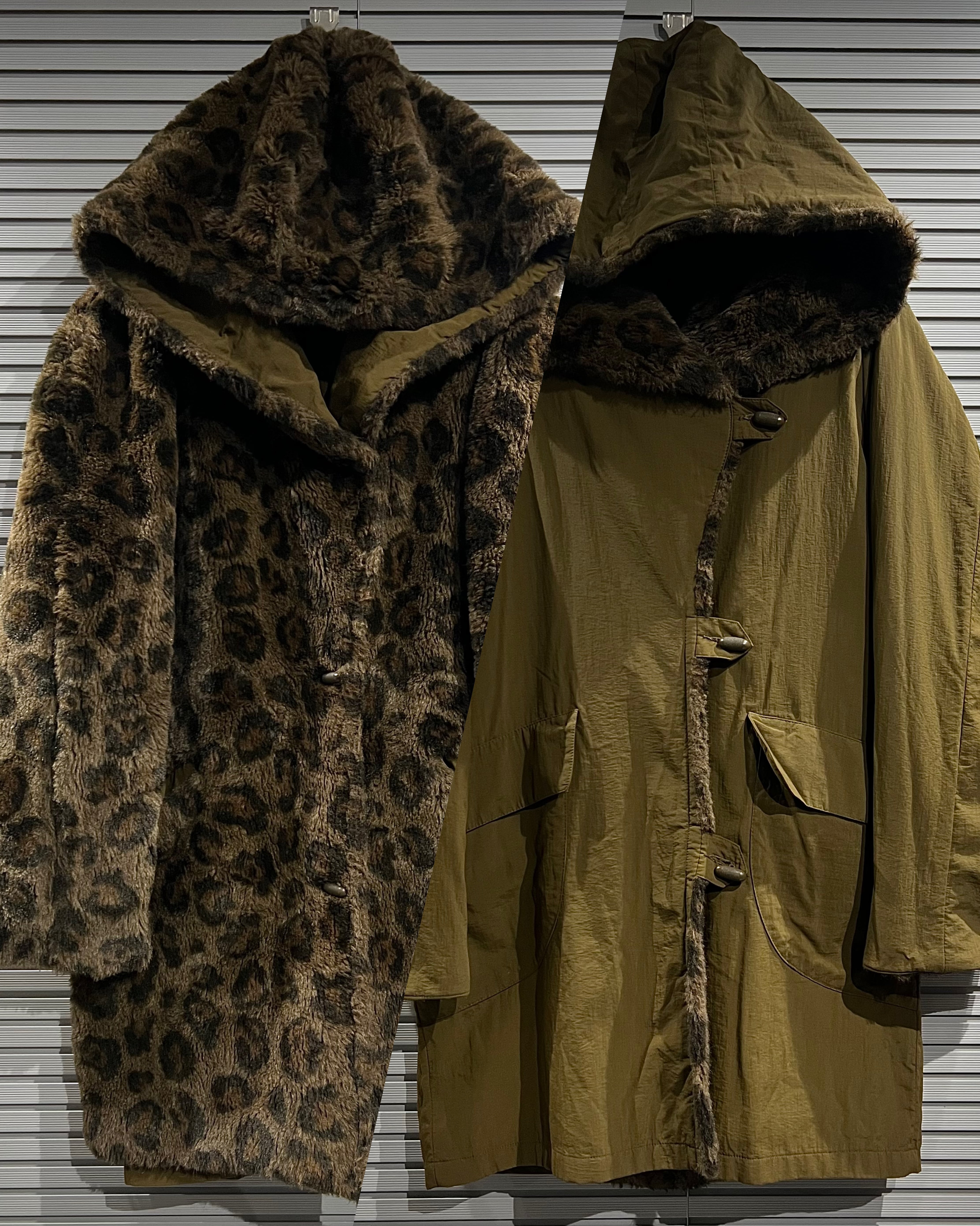 レオパード柄のフェイクファーと、ナイロンシェルを組み合わせたリバーシブル仕様のフーデッドコート。
