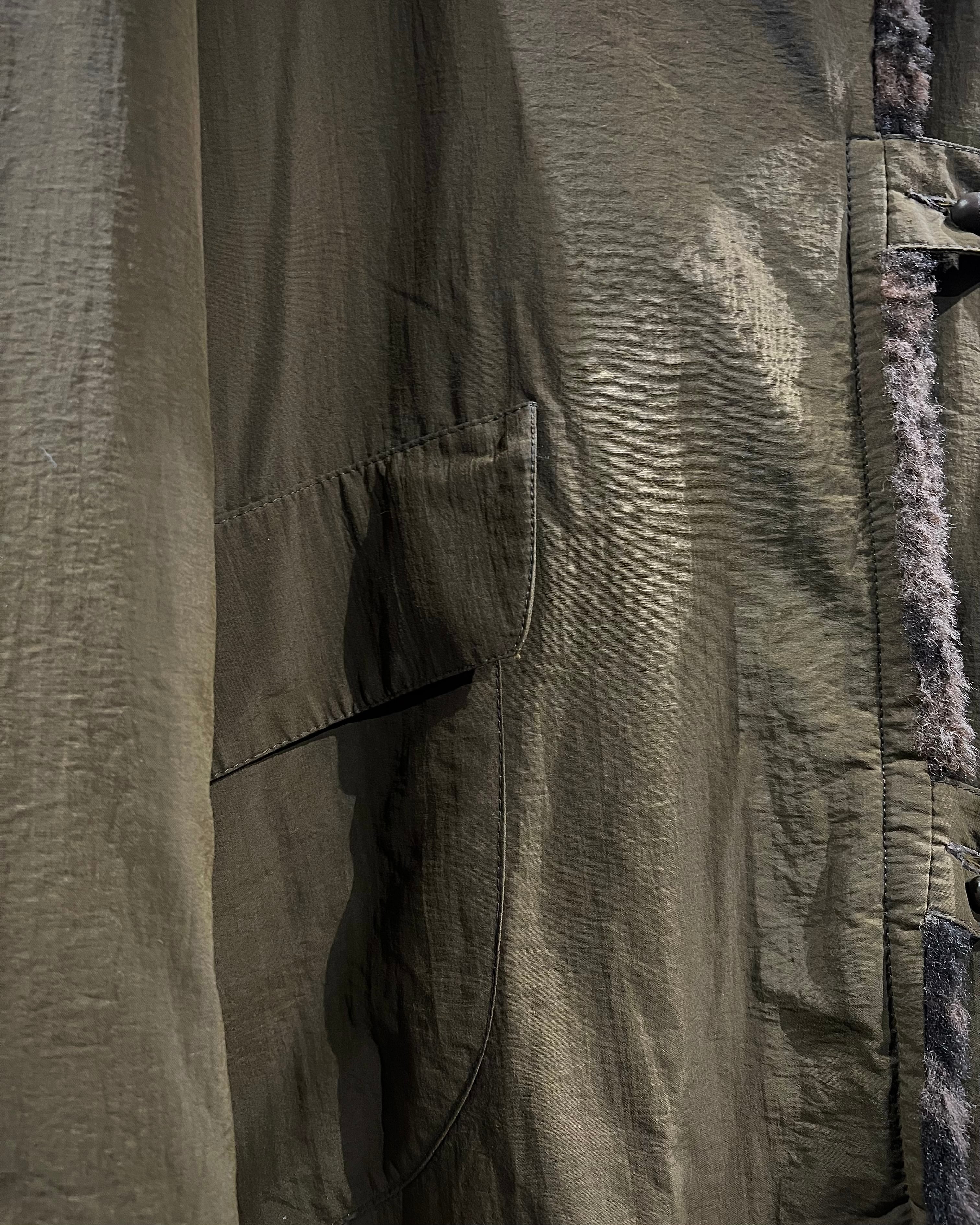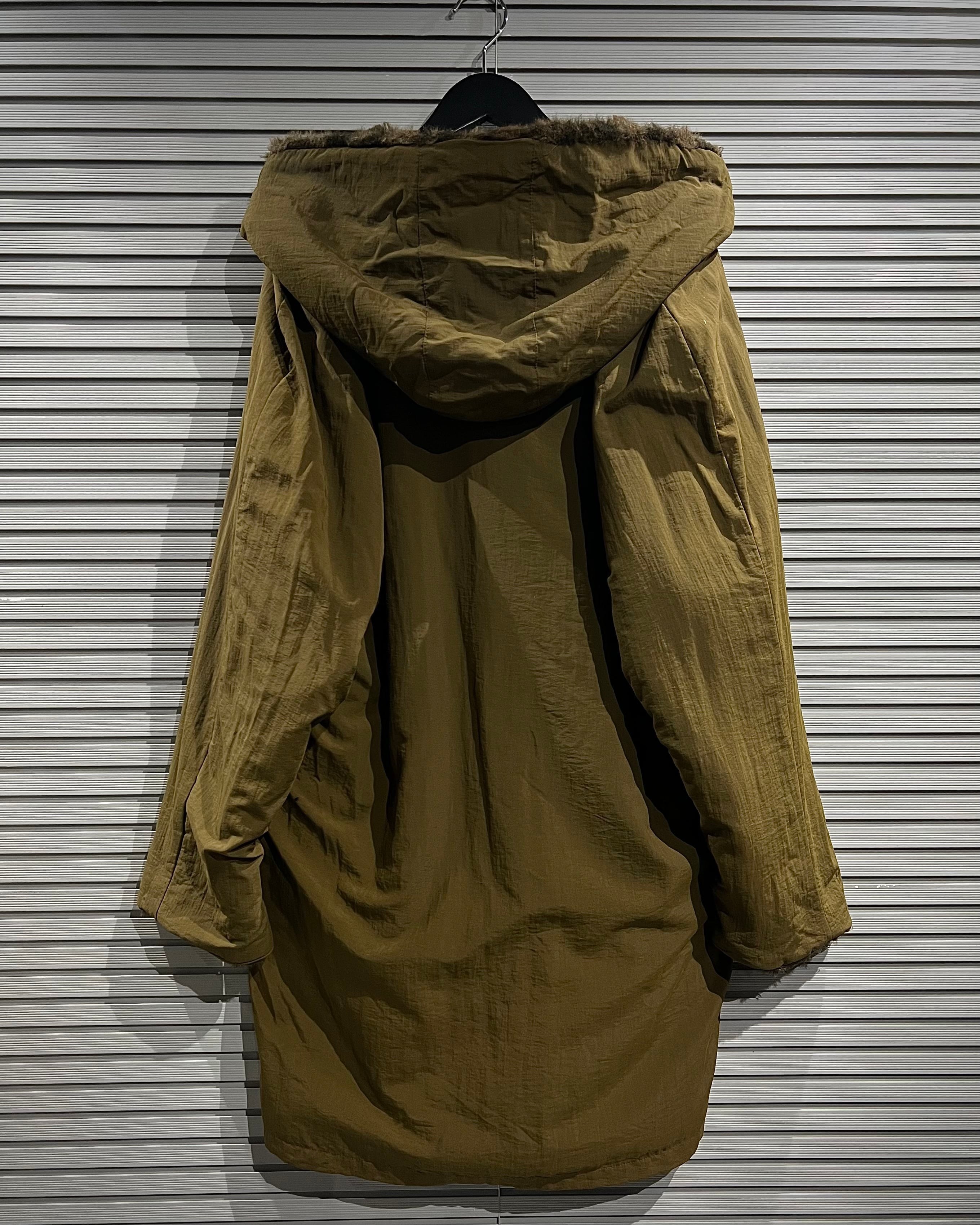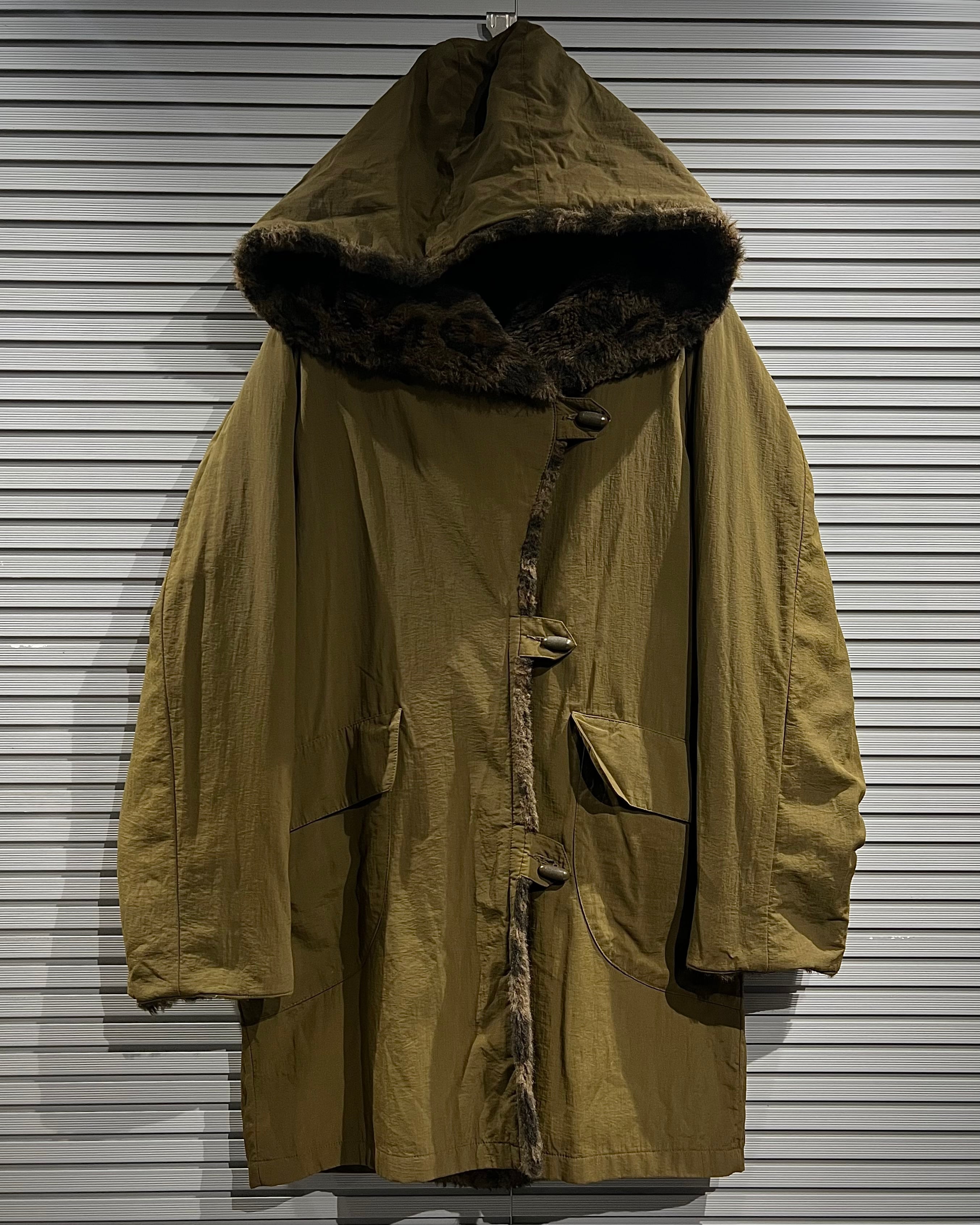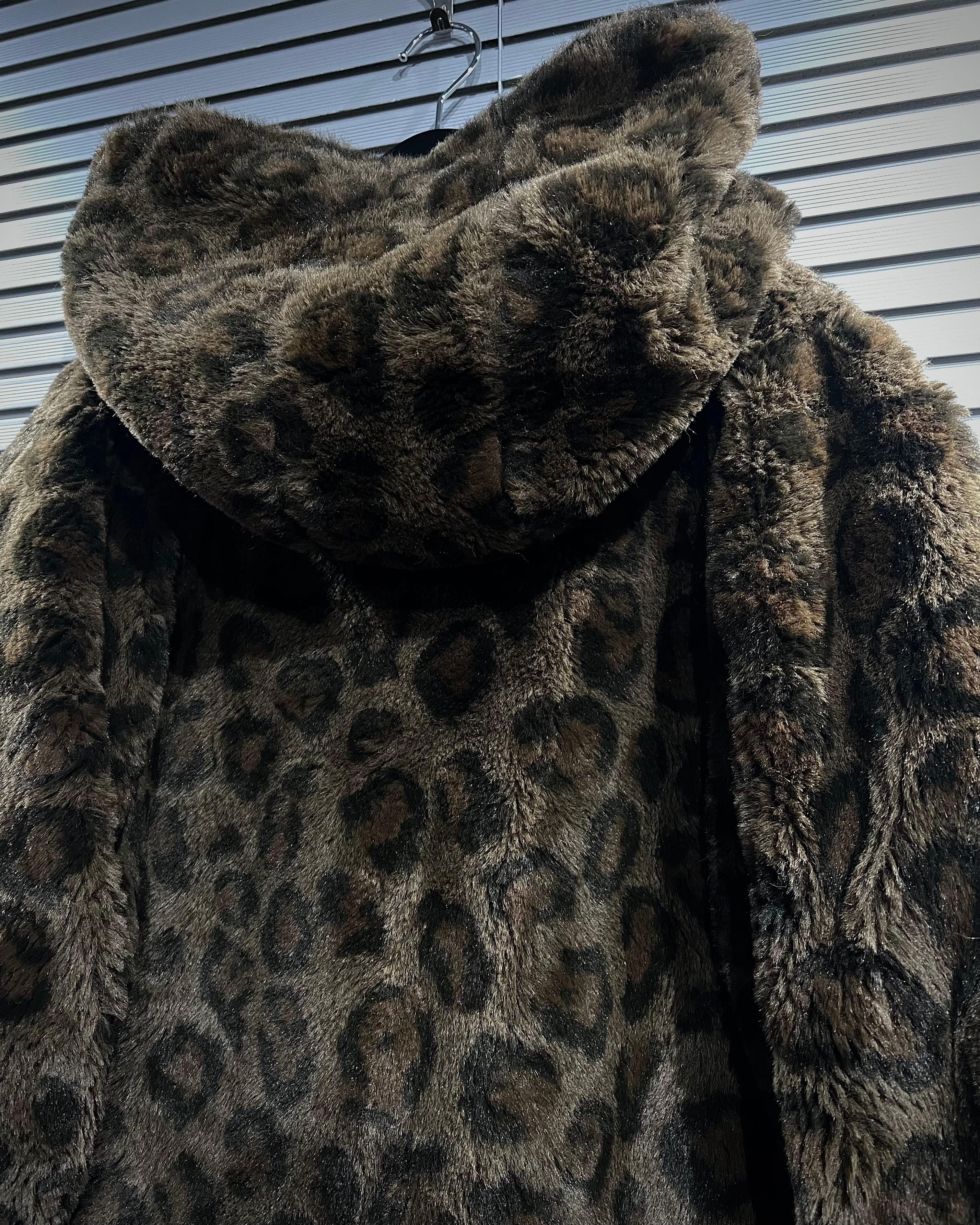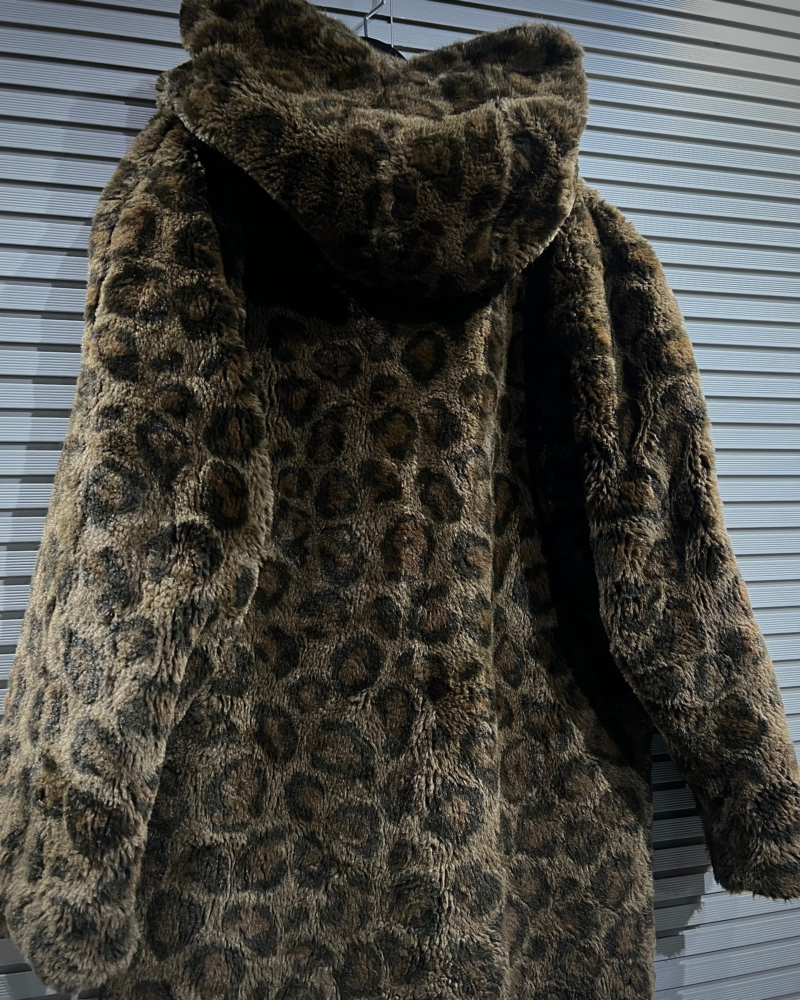レオパード柄のフェイクファーと、ナイロンシェルを組み合わせたリバーシブル仕様のフーデッドコート。