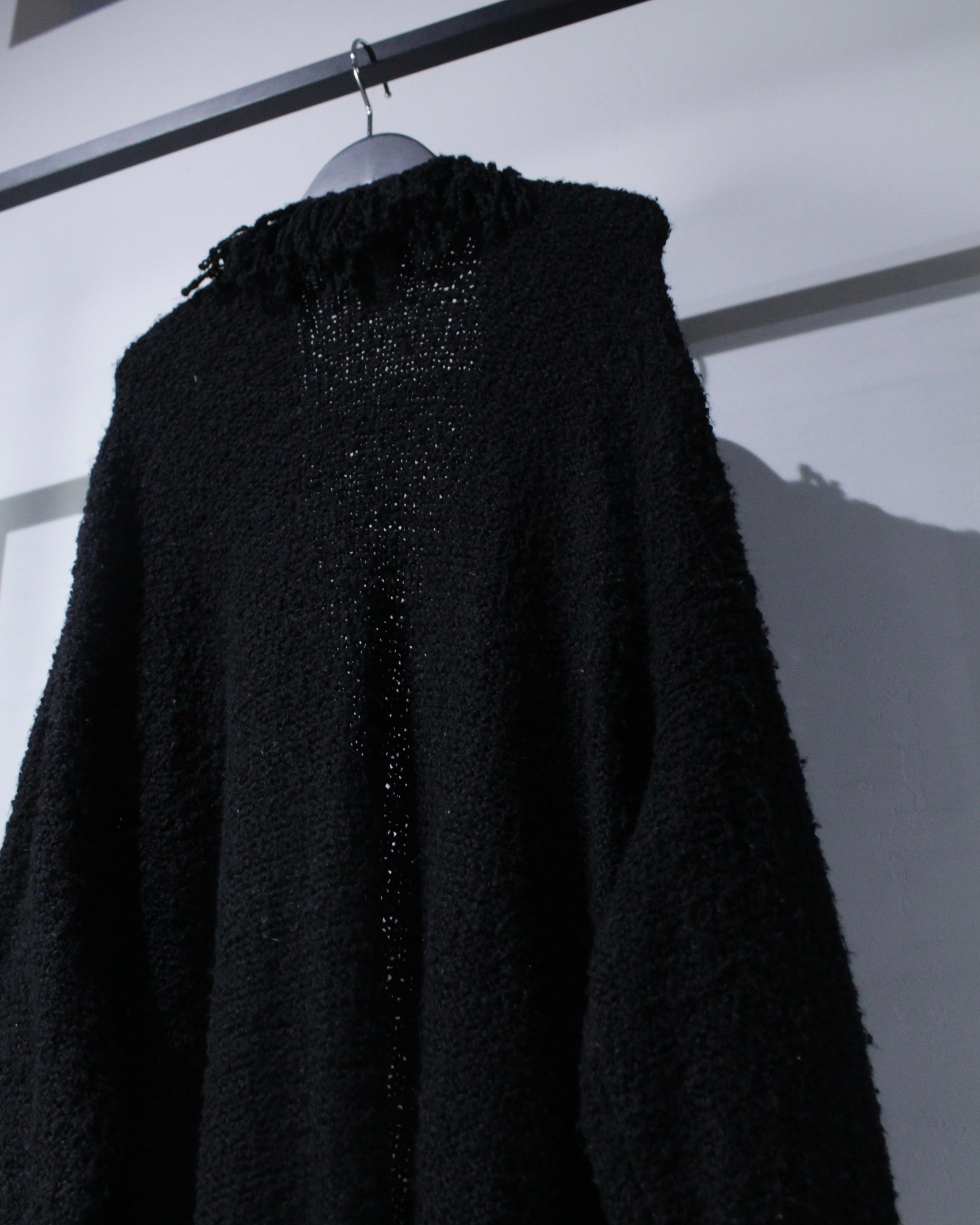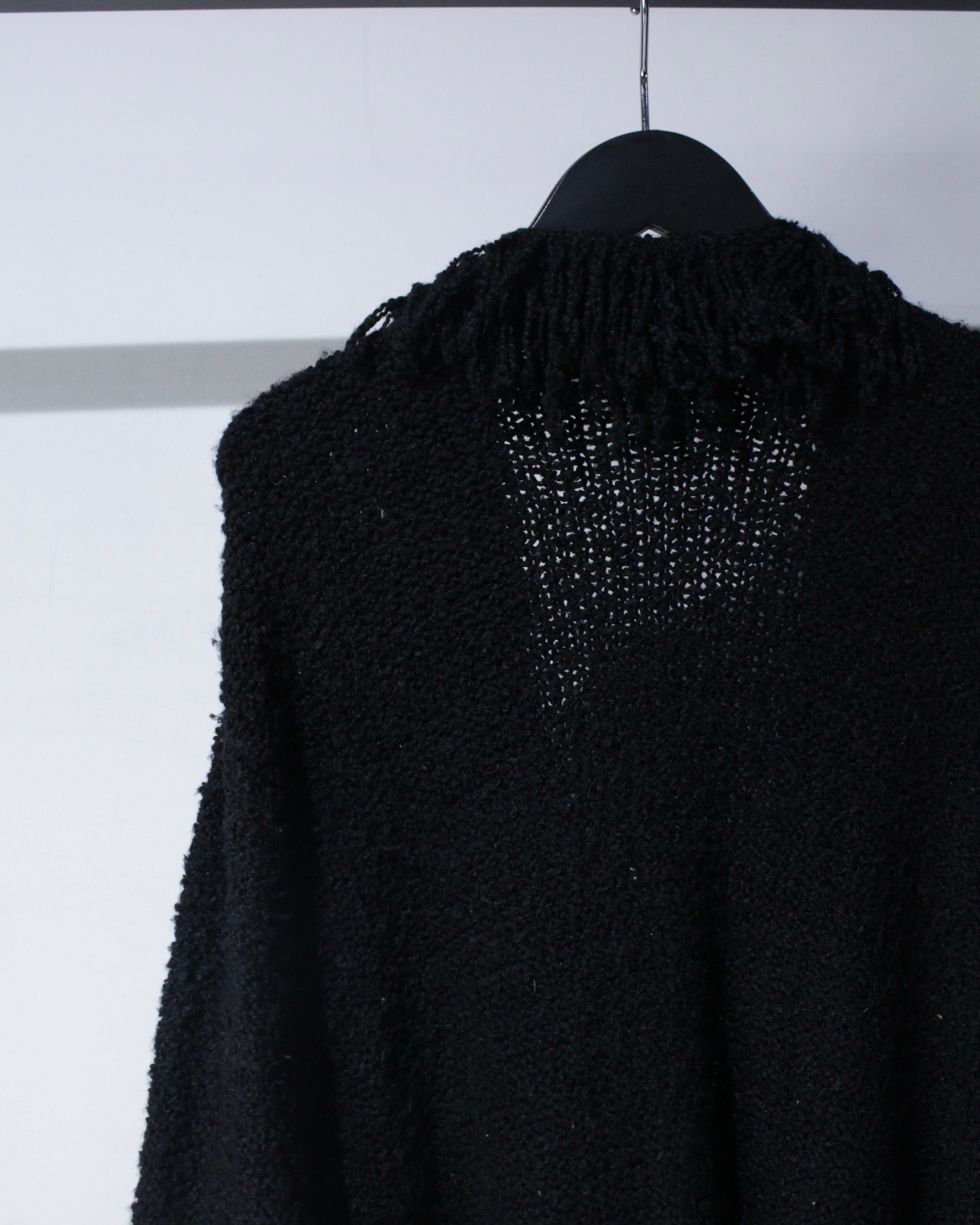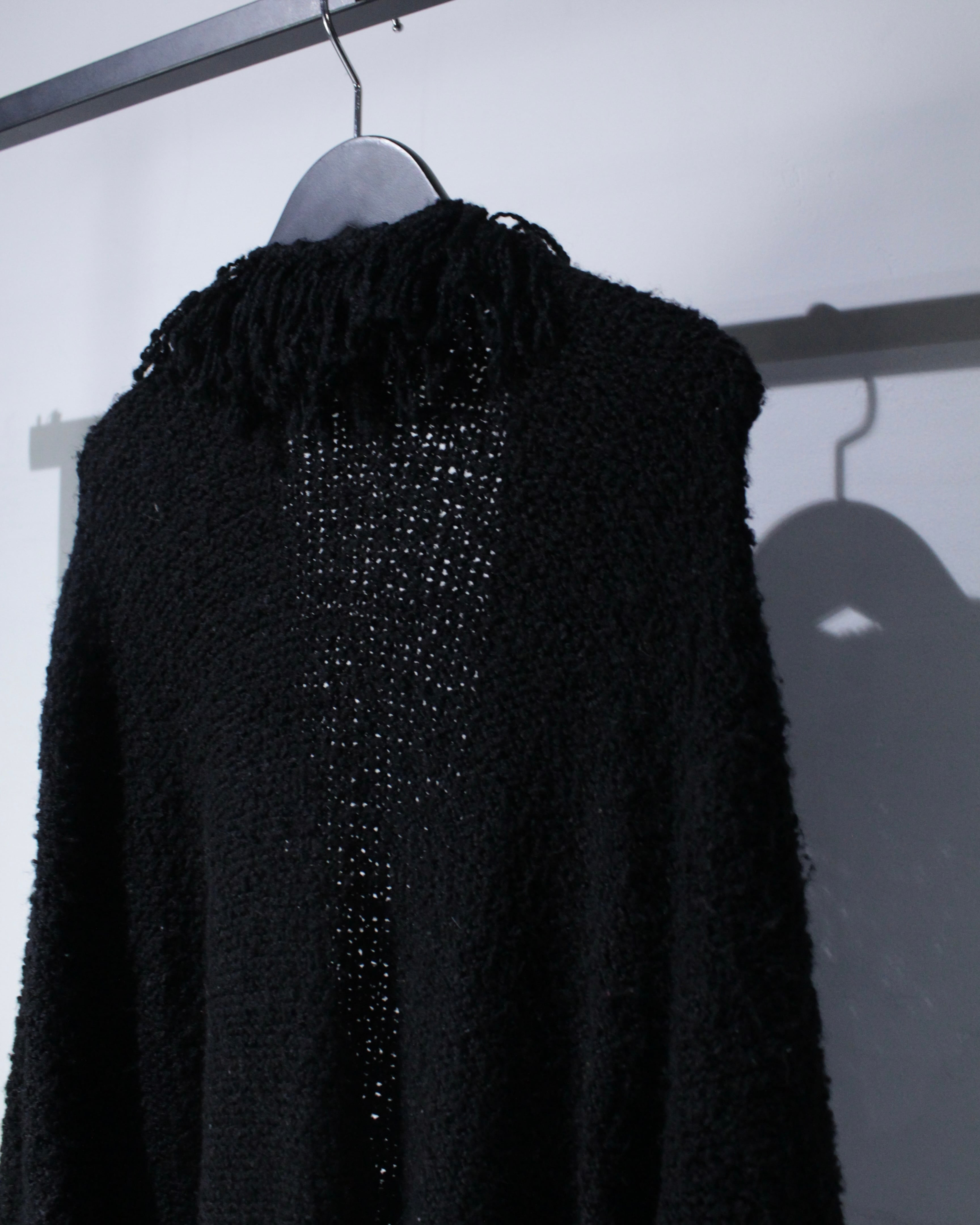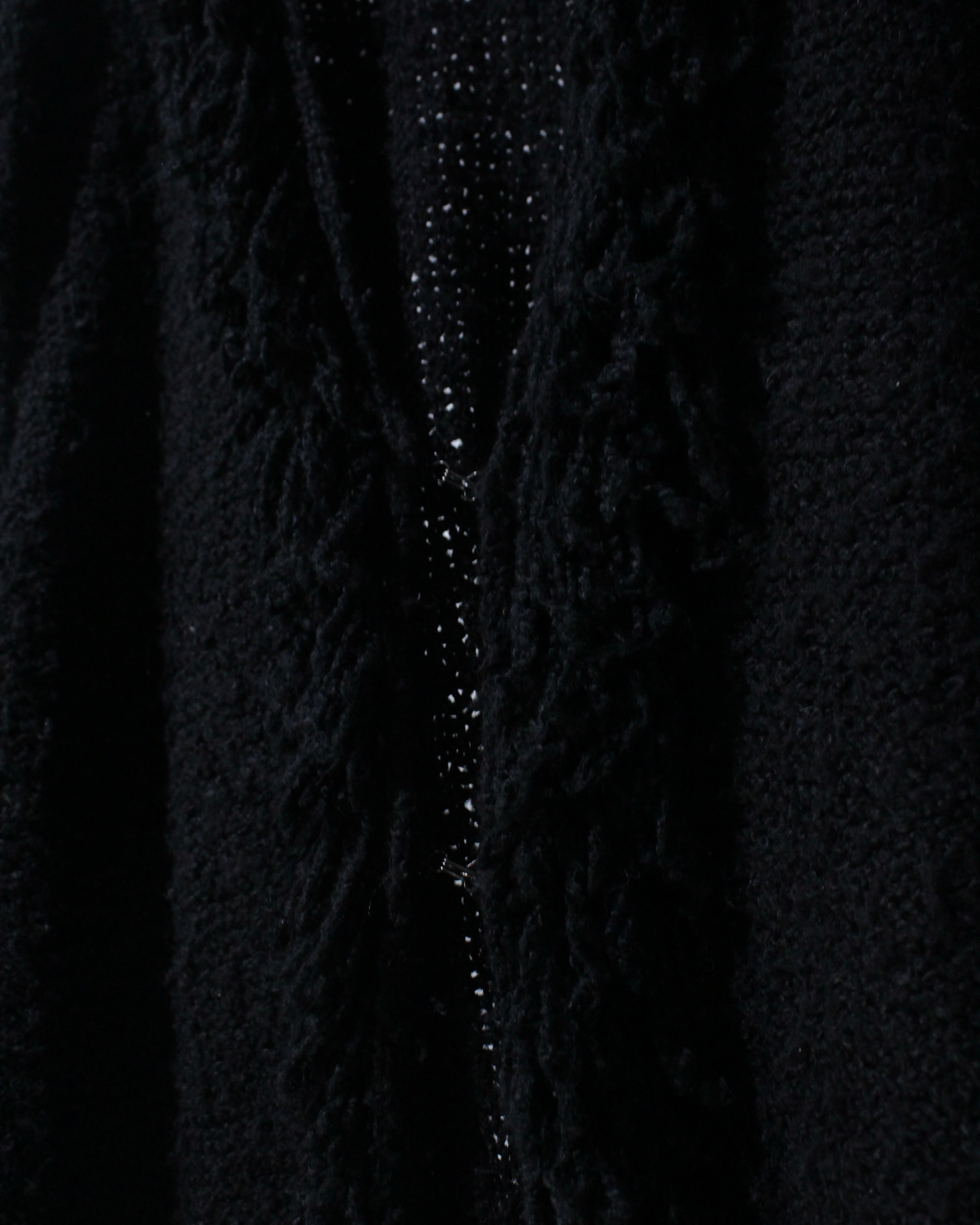 縦に流れるシルエットを強調するように編み立てられたボディに、フリンジを思わせる立体的な編み地が重なり、確かな存在感を放ちます。