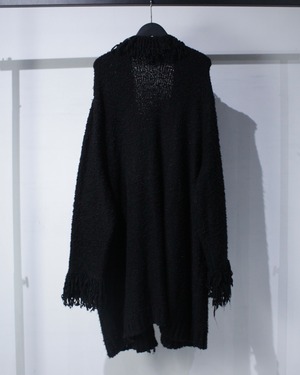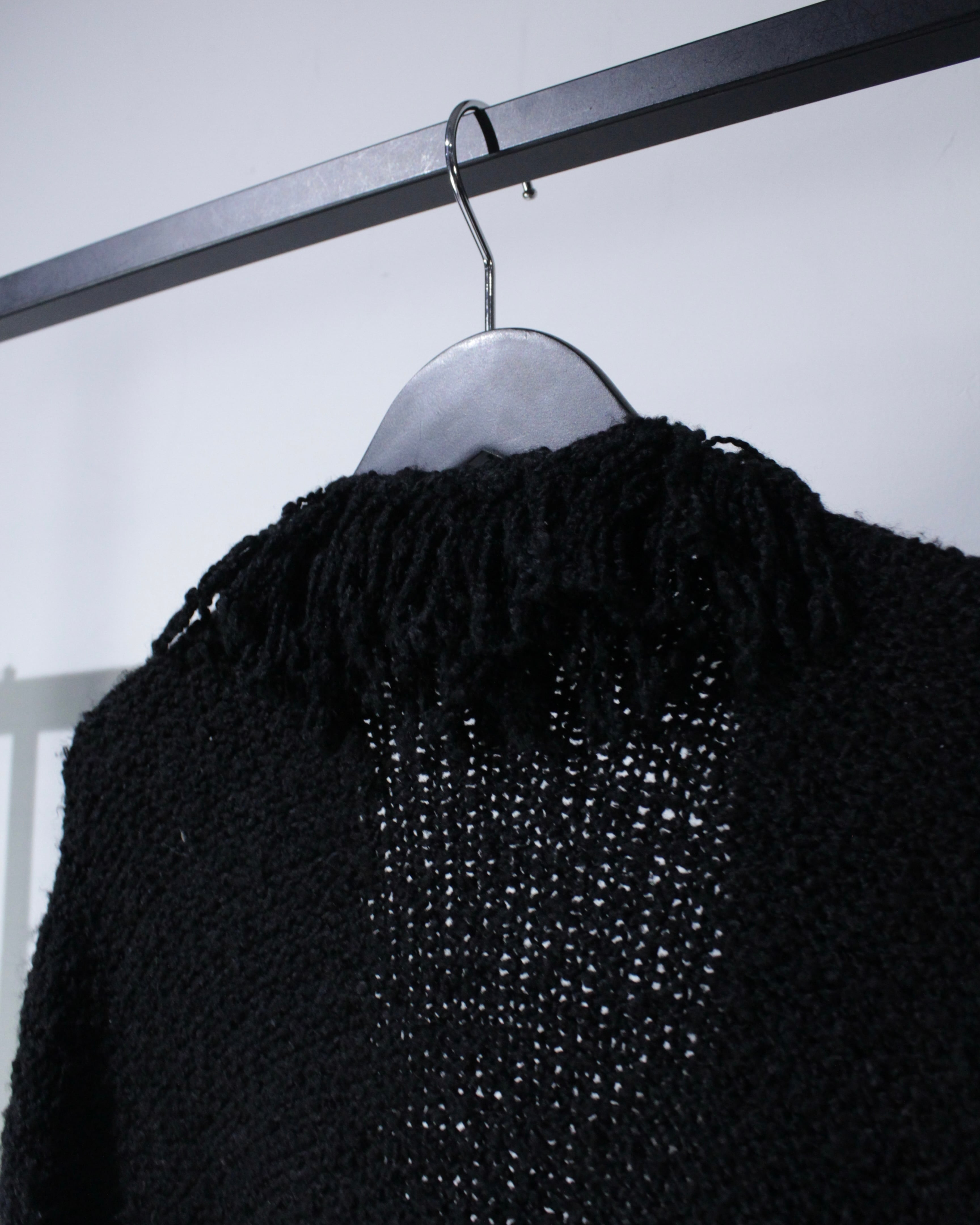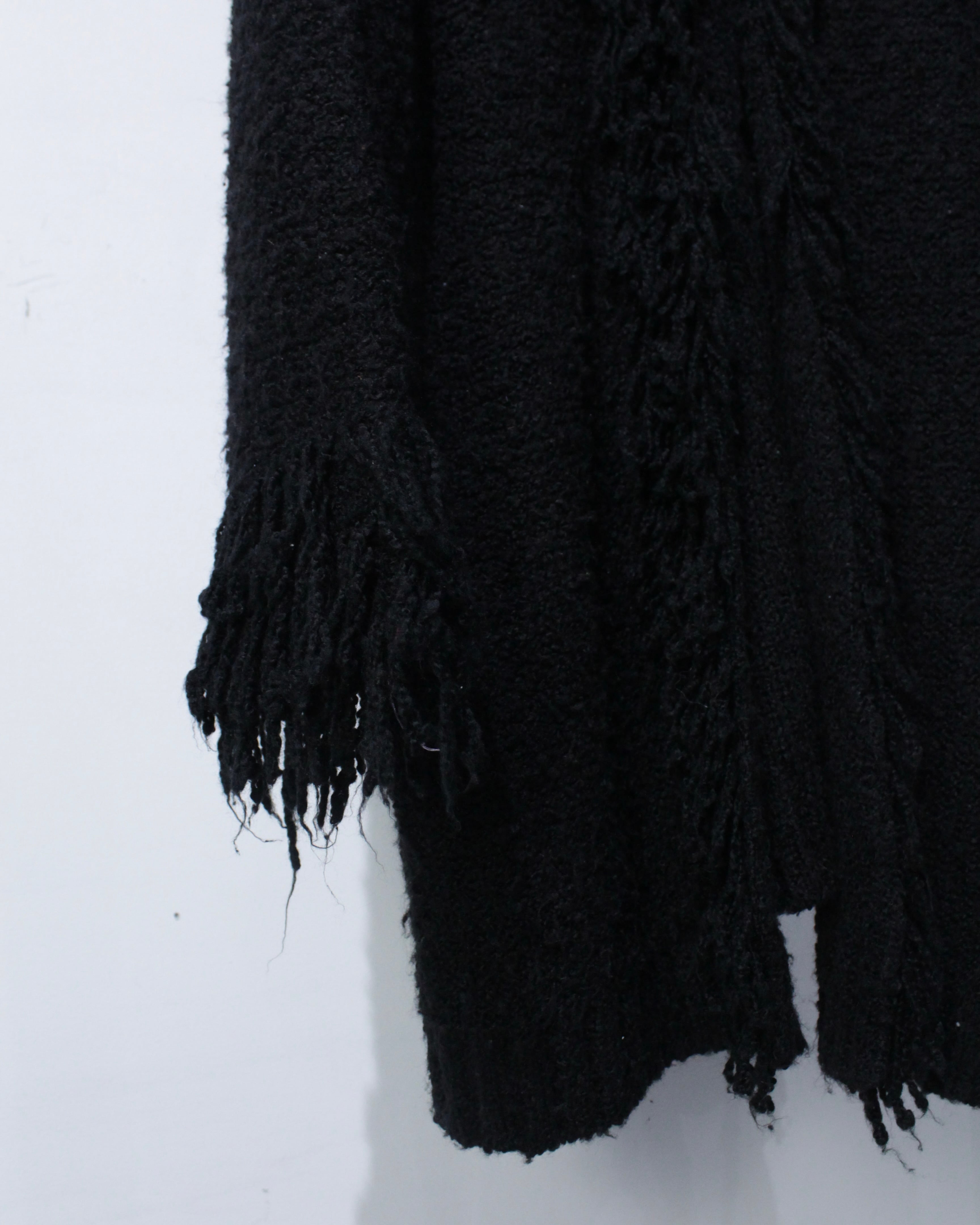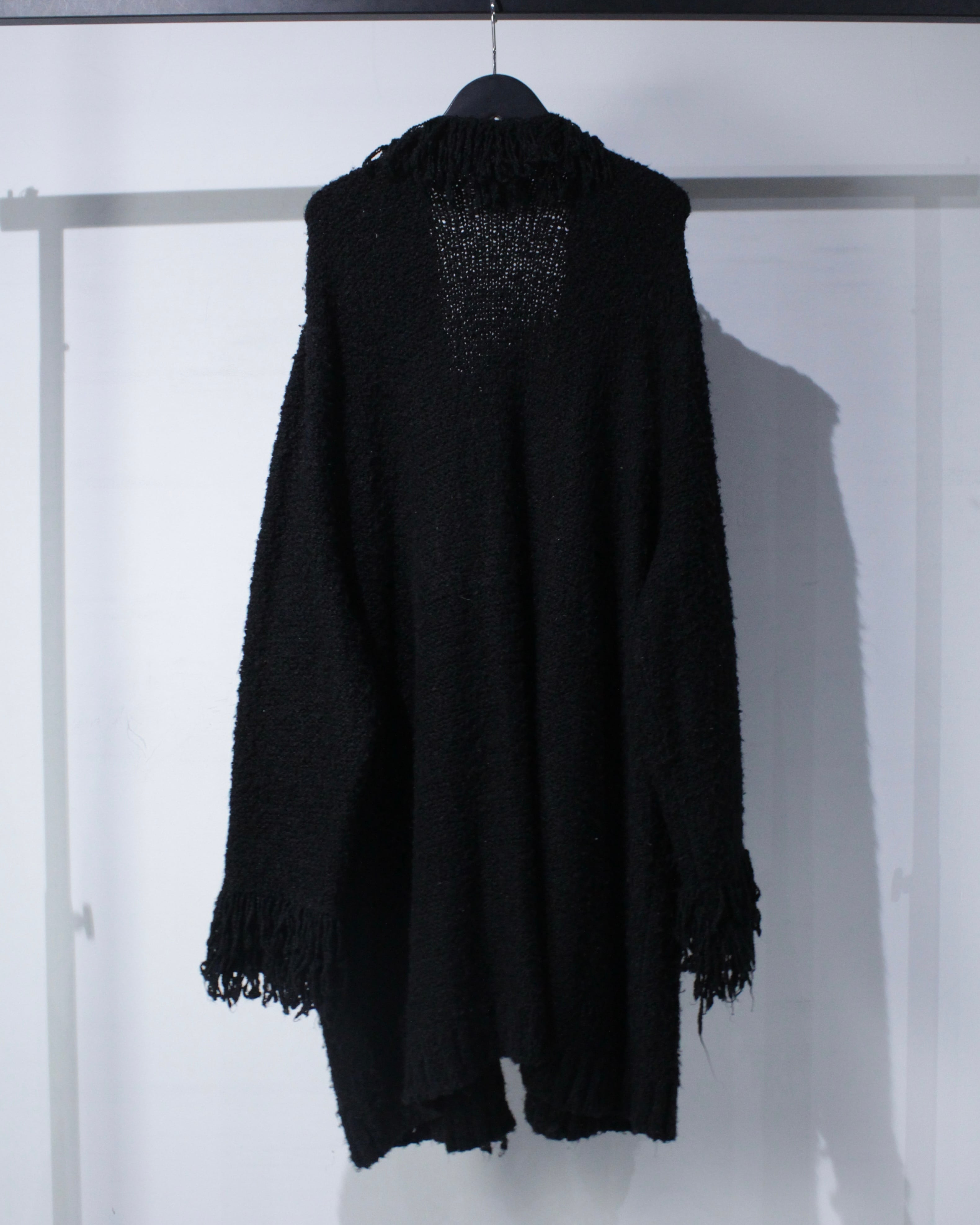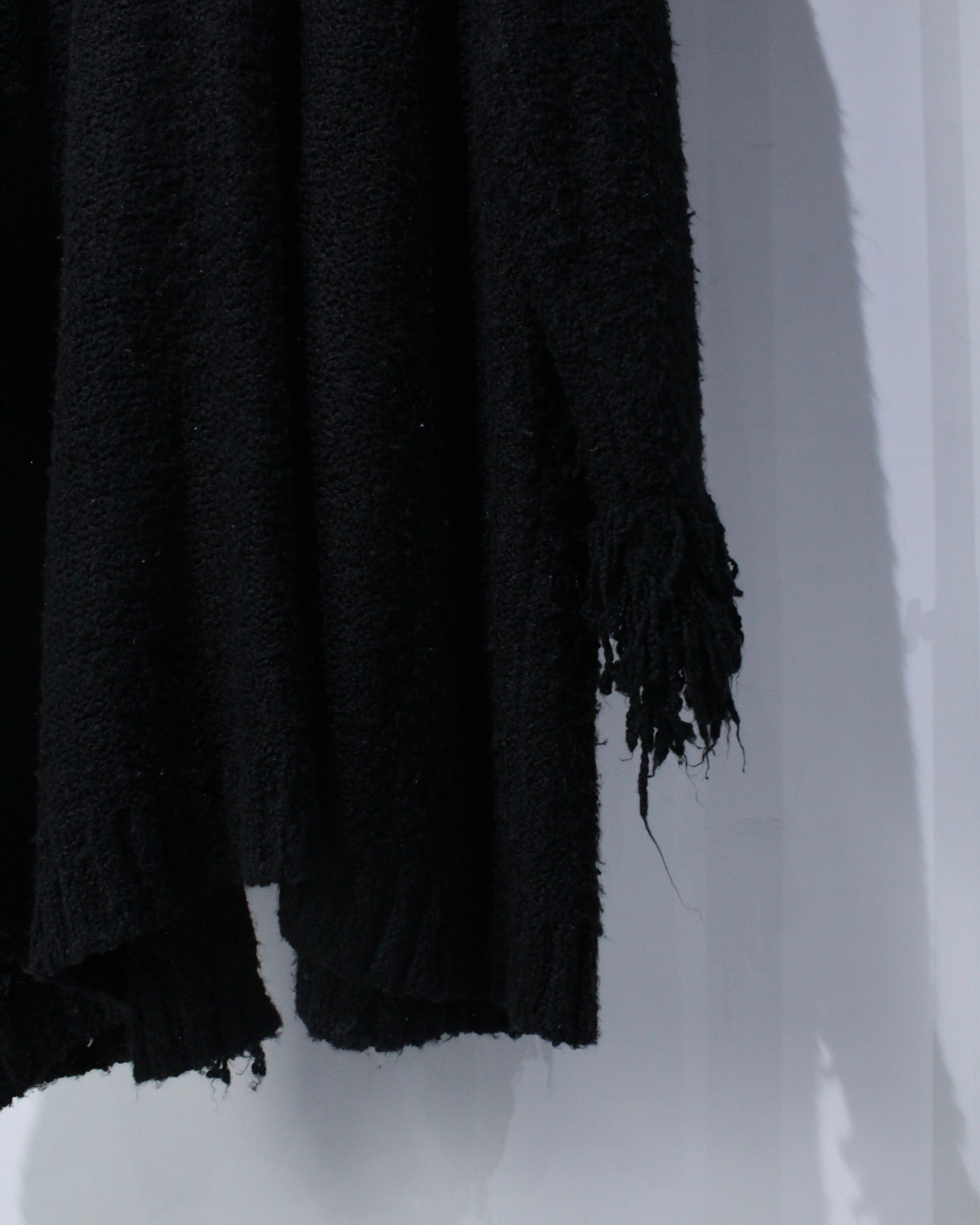 縦に流れるシルエットを強調するように編み立てられたボディに、フリンジを思わせる立体的な編み地が重なり、確かな存在感を放ちます。