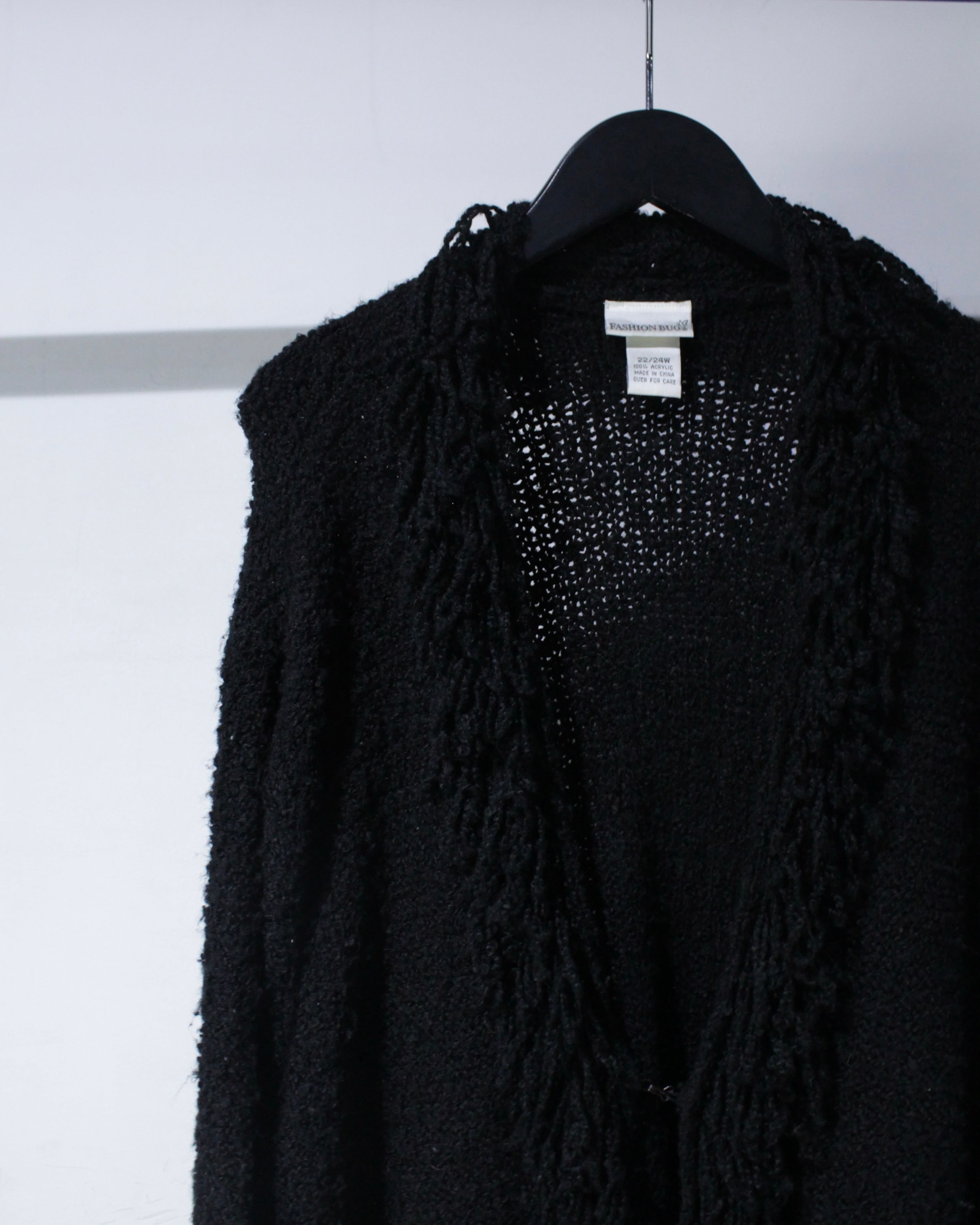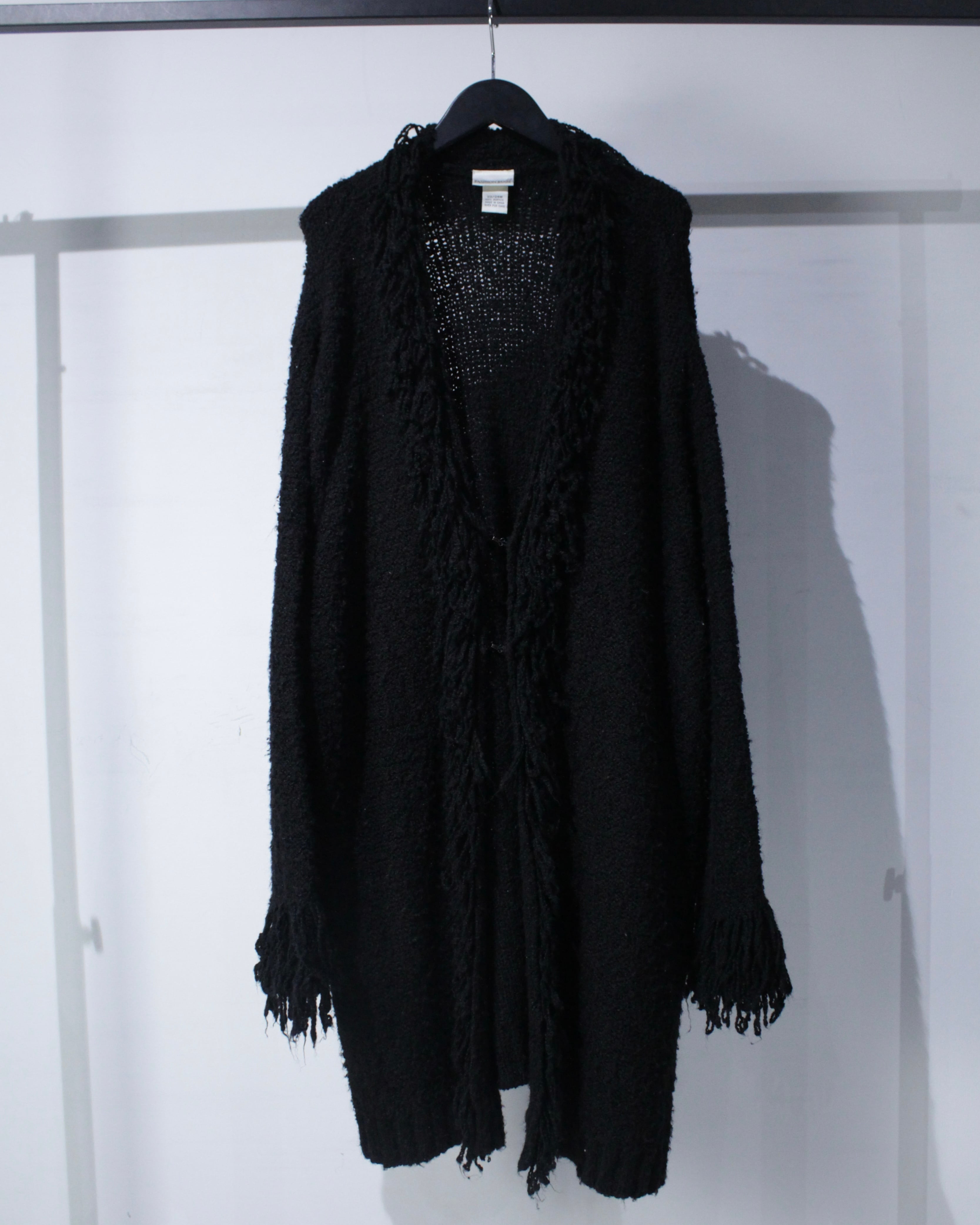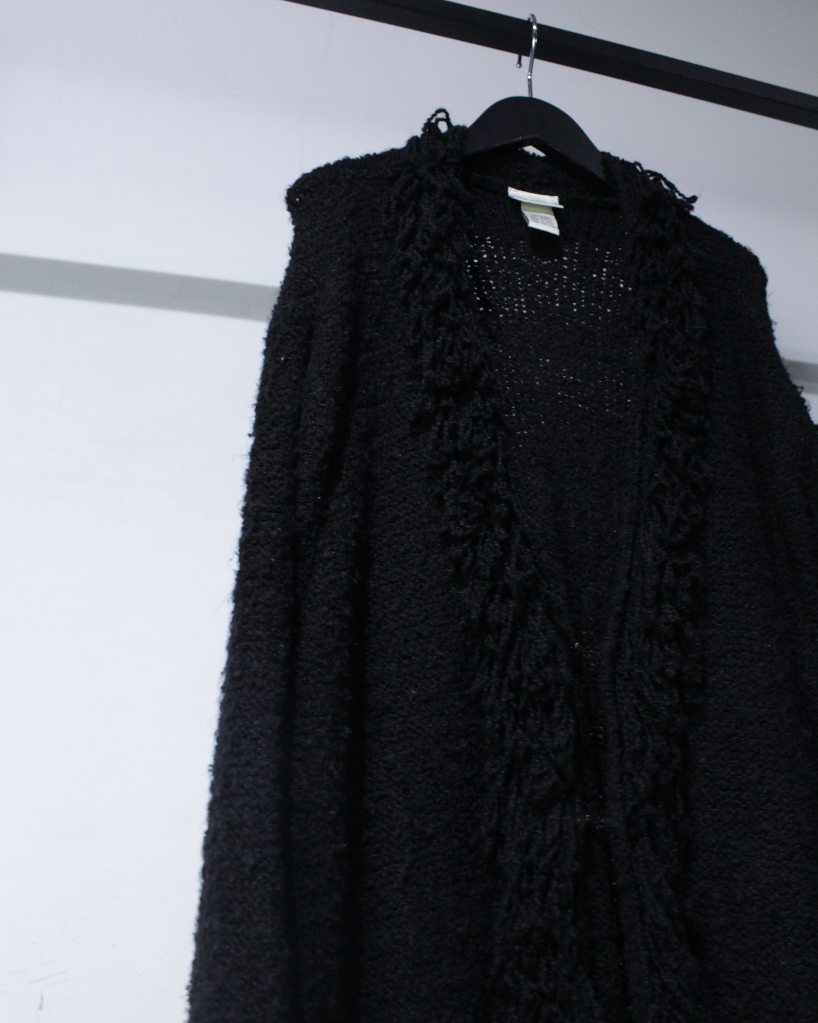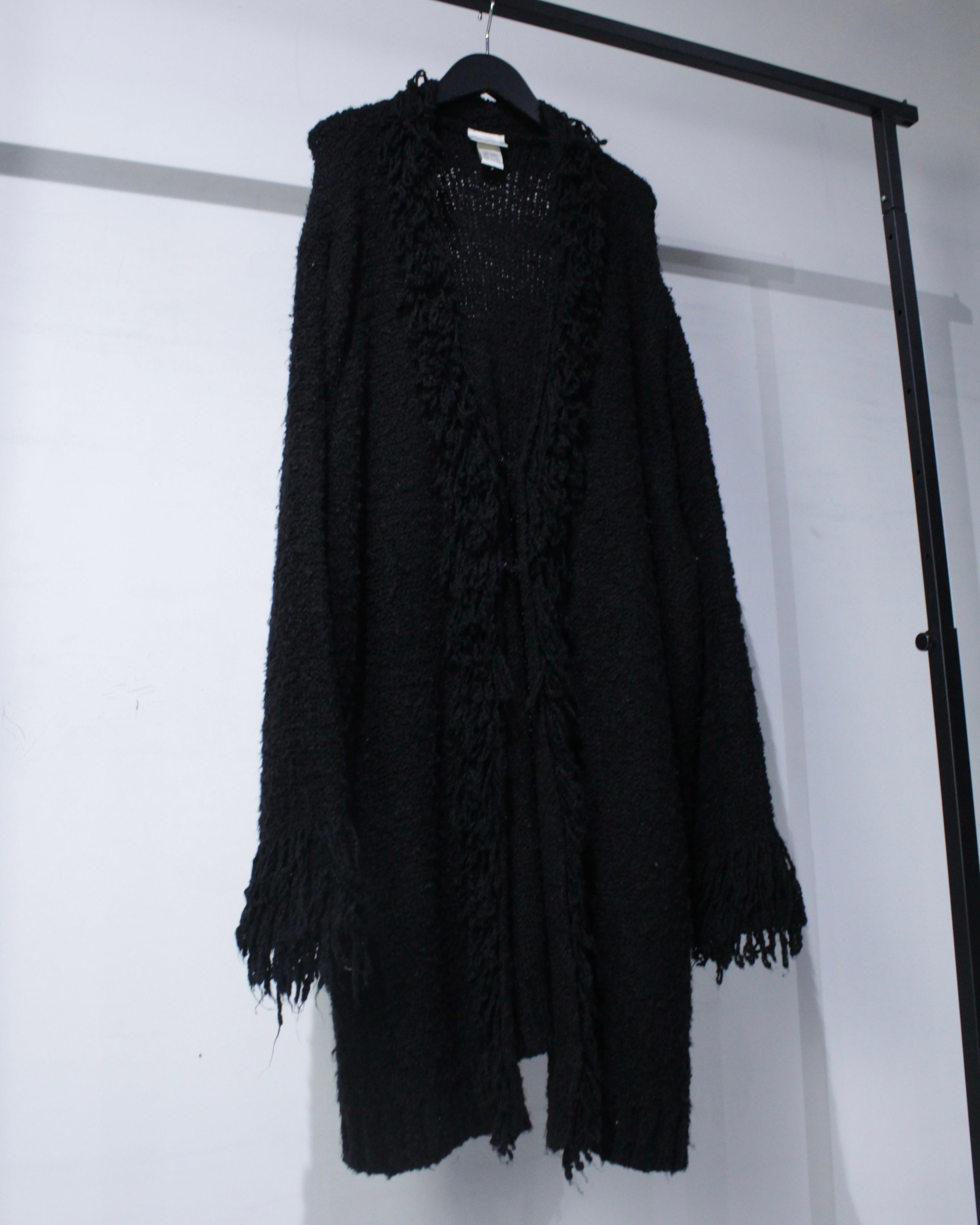 縦に流れるシルエットを強調するように編み立てられたボディに、フリンジを思わせる立体的な編み地が重なり、確かな存在感を放ちます。