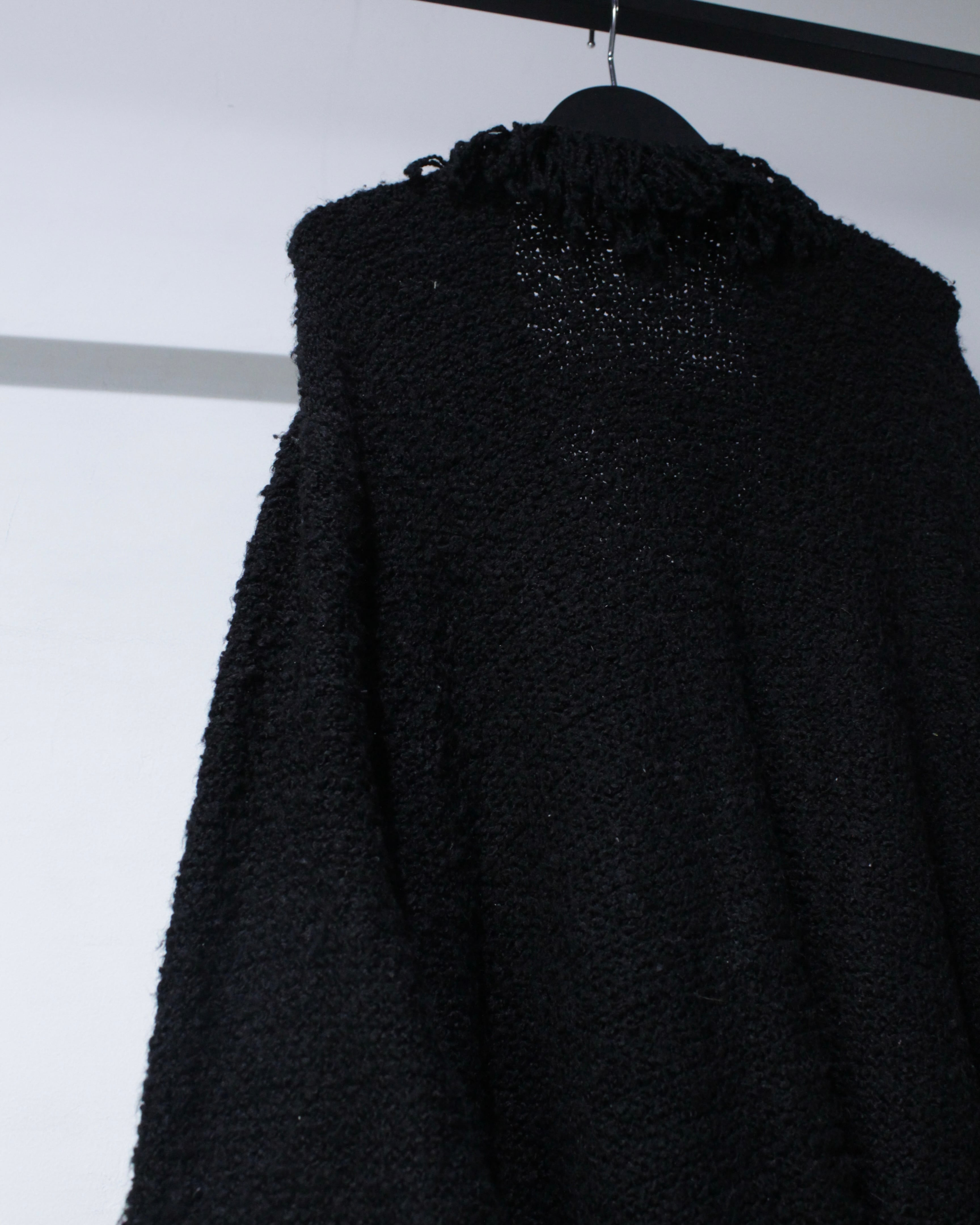表情のあるブラックニットは、起毛感と凹凸が共存した奥行きのある質感。動くたびに揺れるフリンジ風のディテールが、ミニマルなカラーリングの中で陰影を生み、スタイリングにリズムをプラス。
