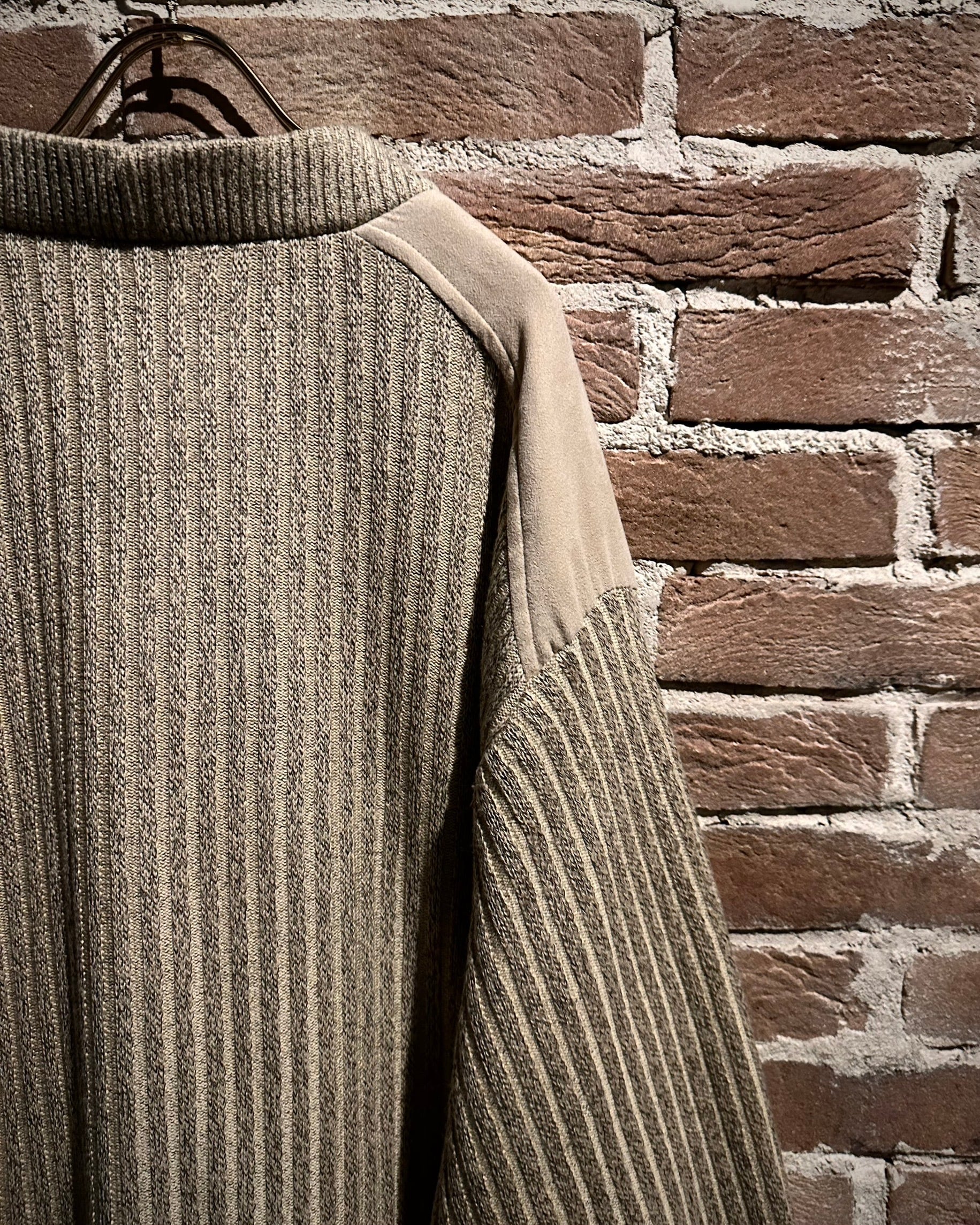 ベースには柔らかく程よい肉感のあるニット素材を採用。フロントには立体的な編みを、袖や背面にはリブ編みを組み合わせることで、単調にならない奥行きのある表情に仕上げられています。