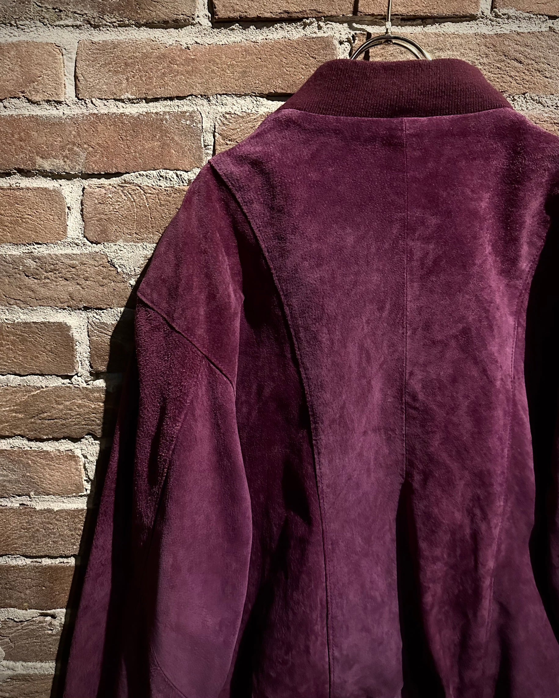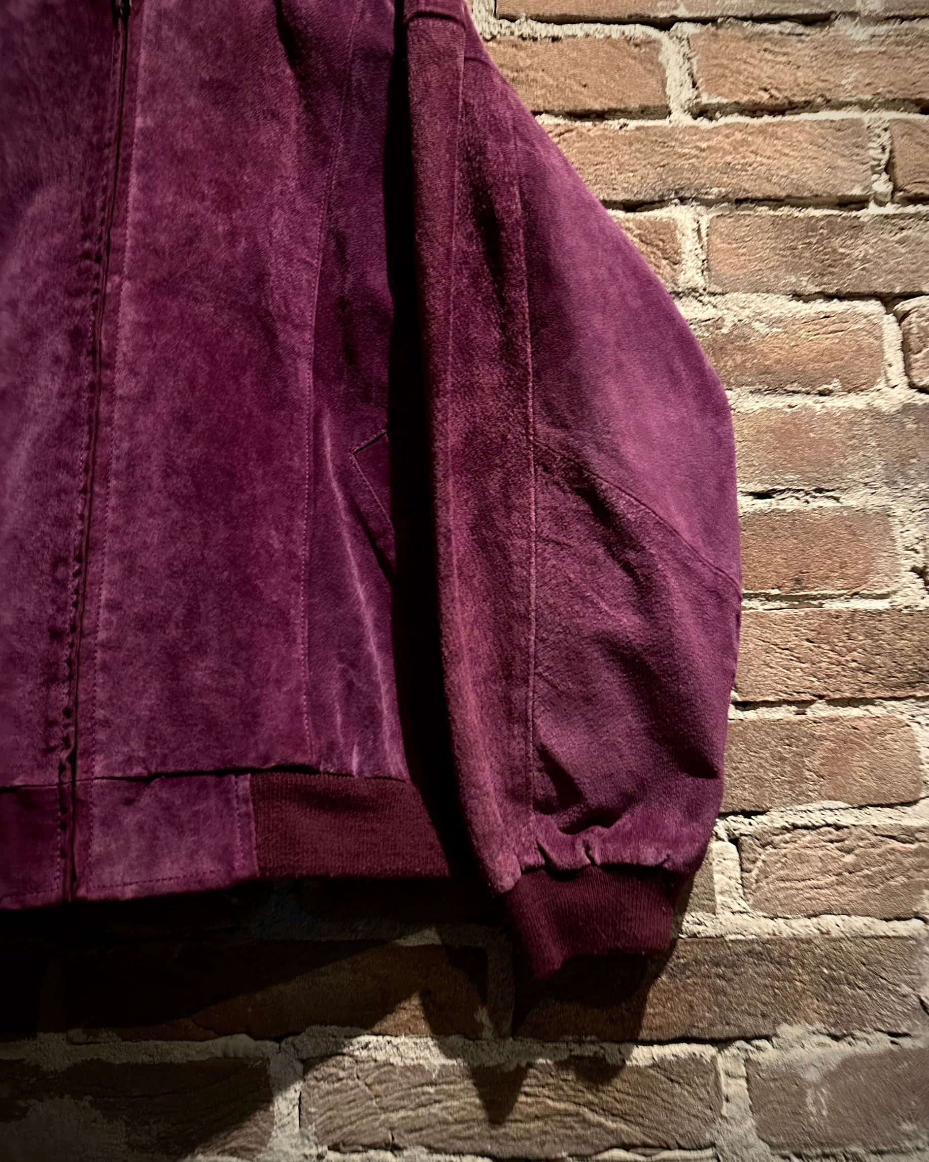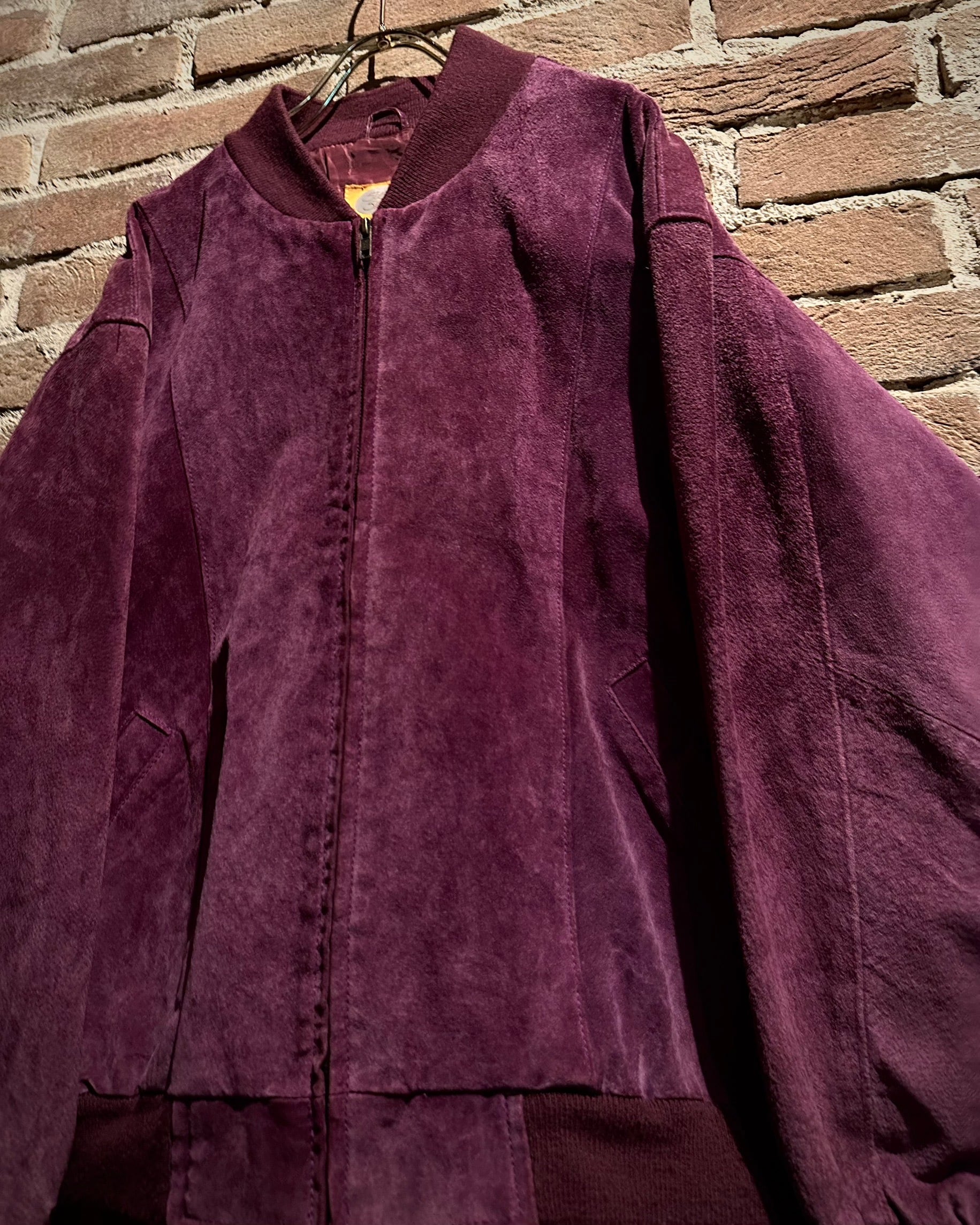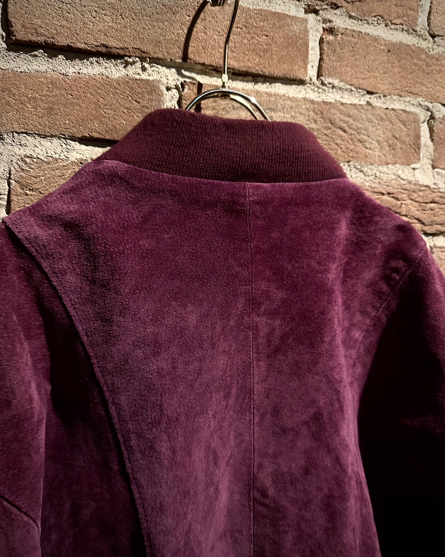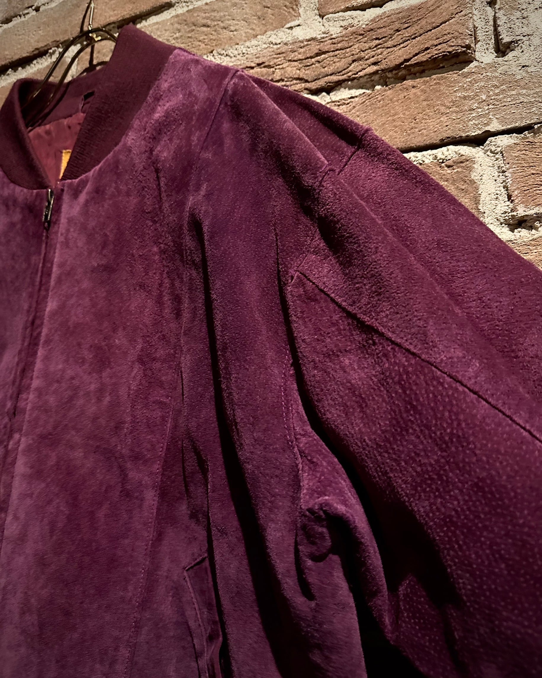 スエードレザー特有のしっとりとした質感と、深みのあるパープルカラーが印象的なボンバージャケット。