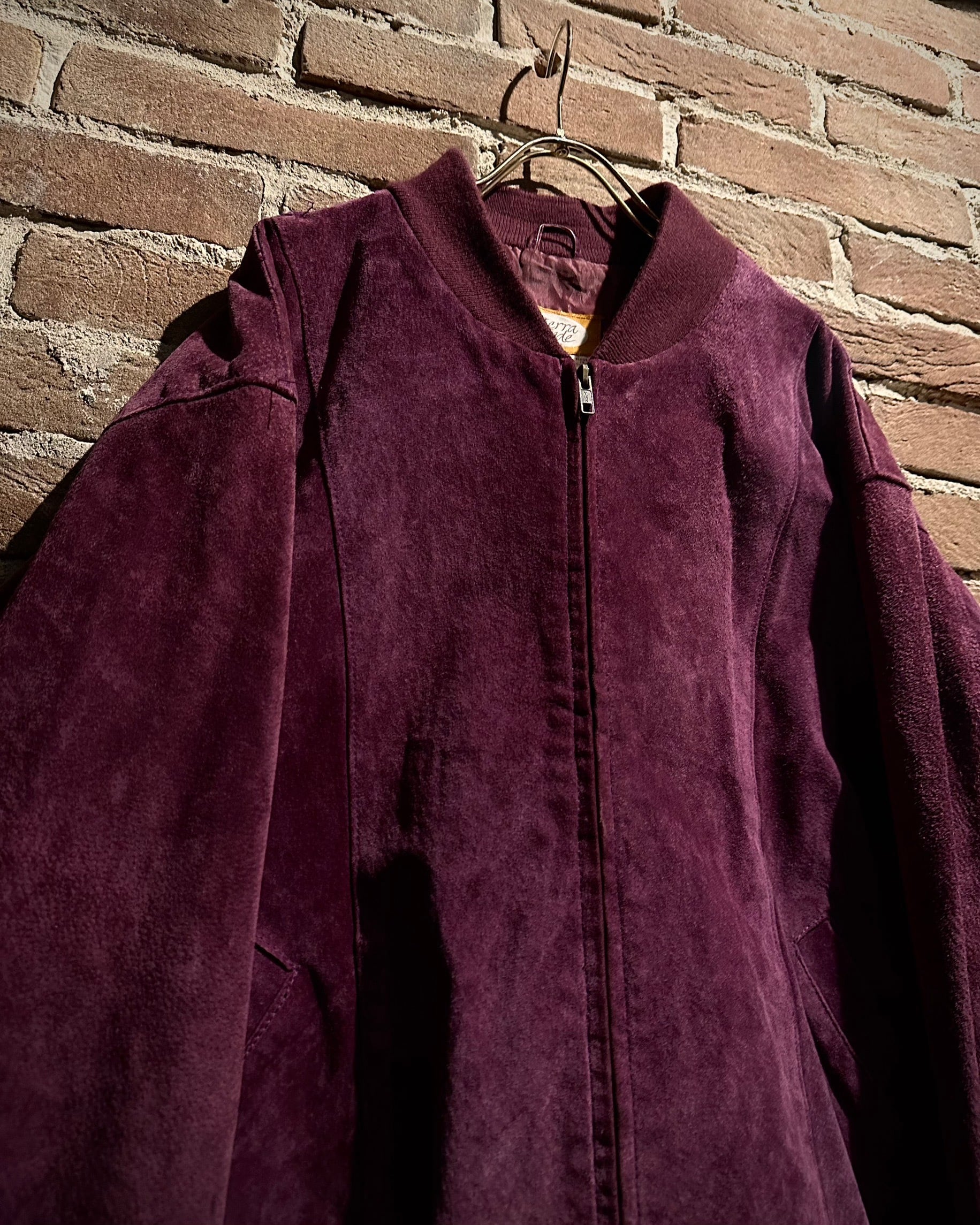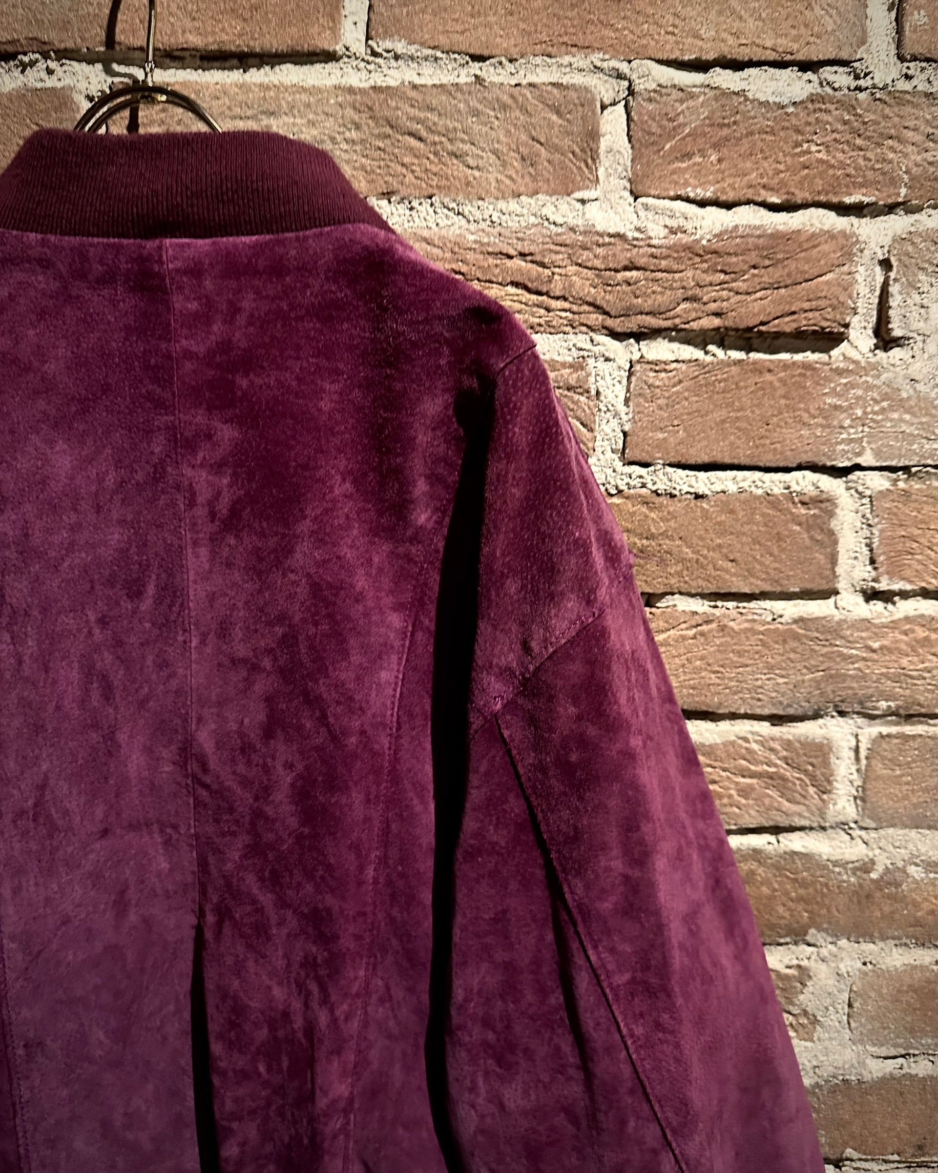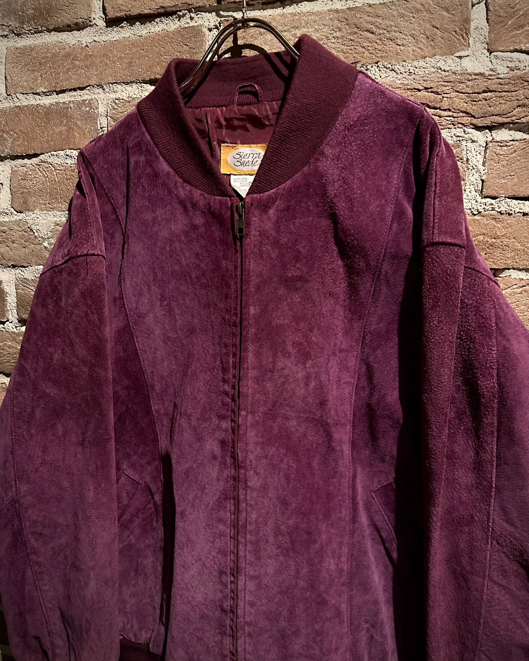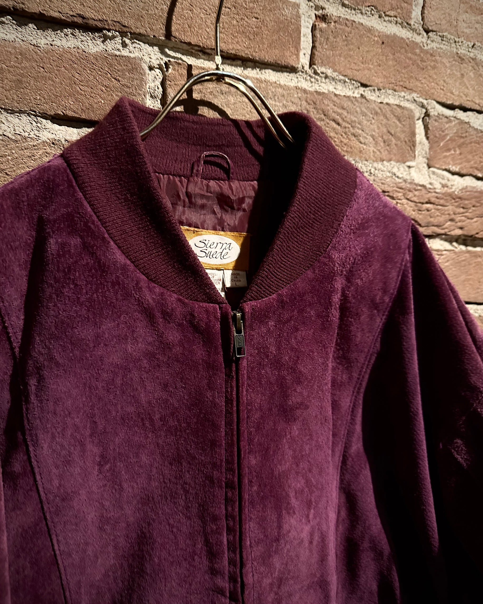 スエードレザー特有のしっとりとした質感と、深みのあるパープルカラーが印象的なボンバージャケット。