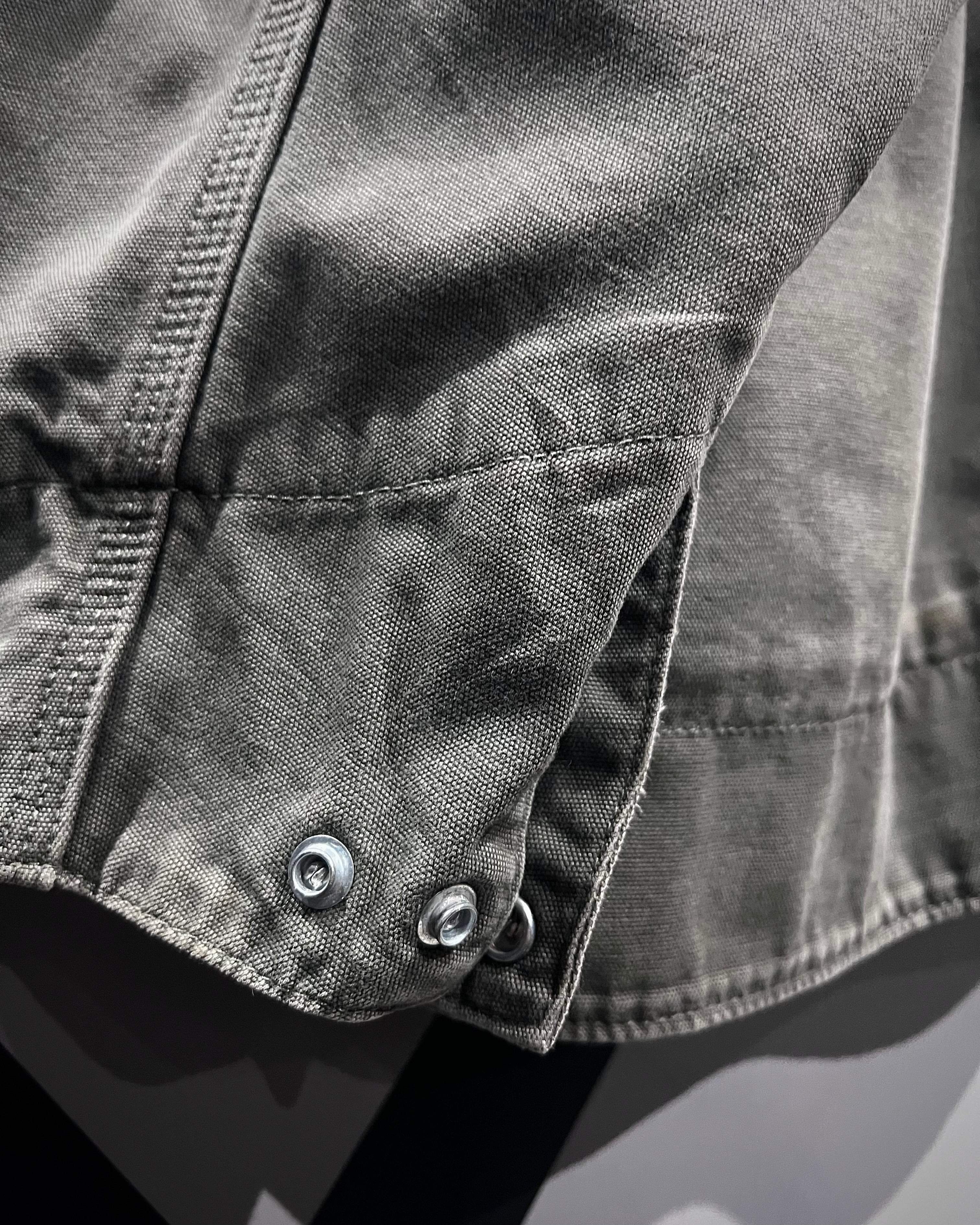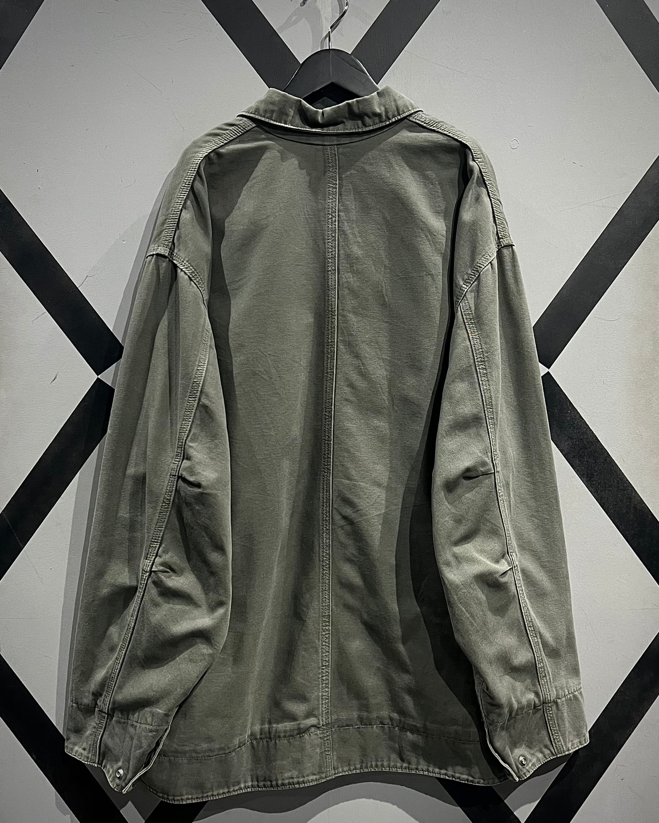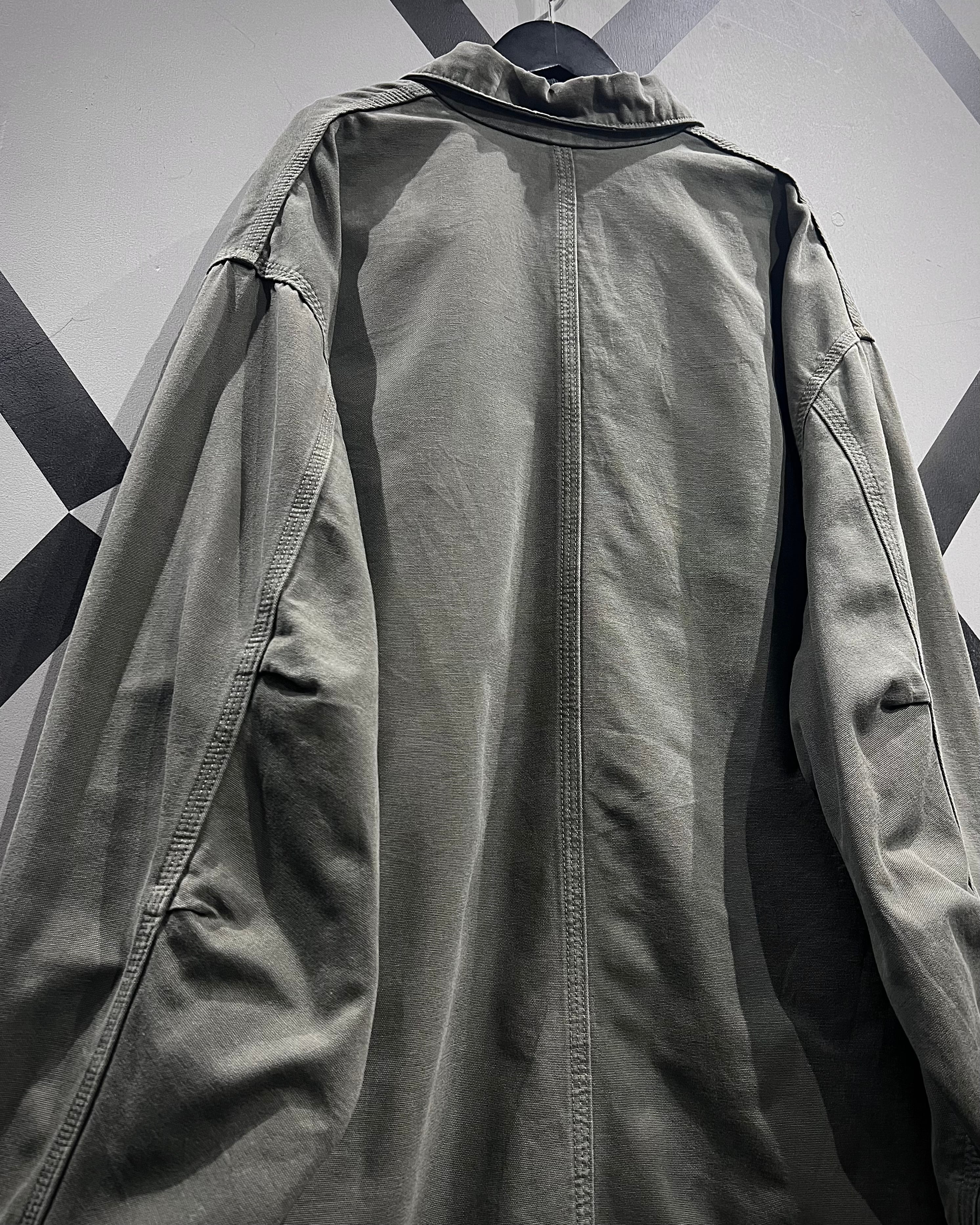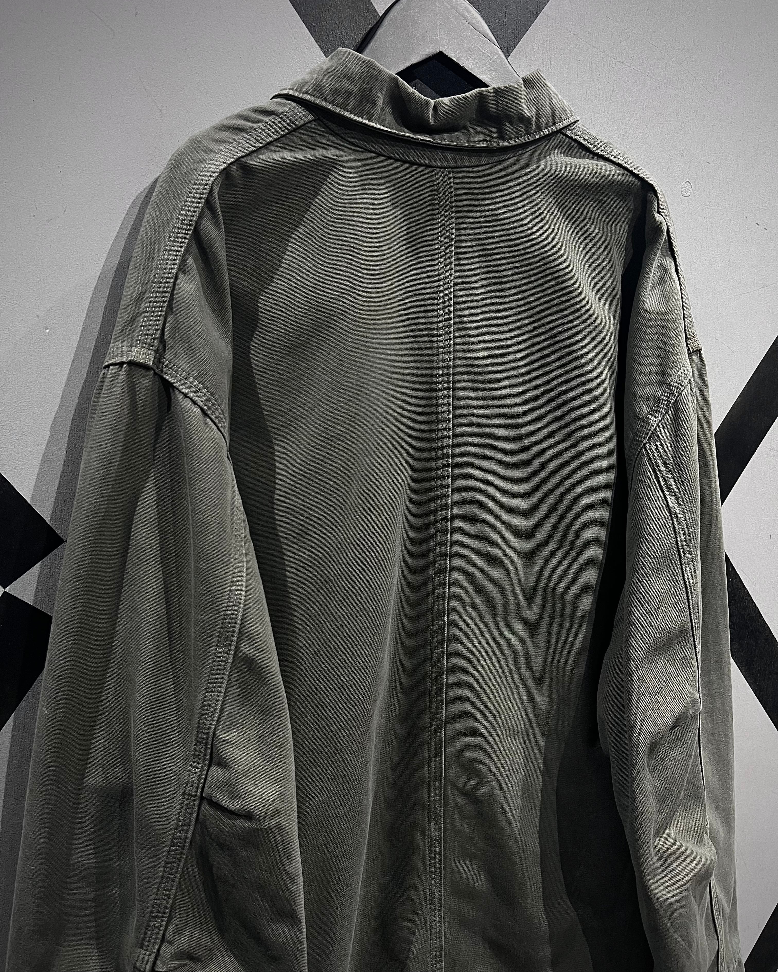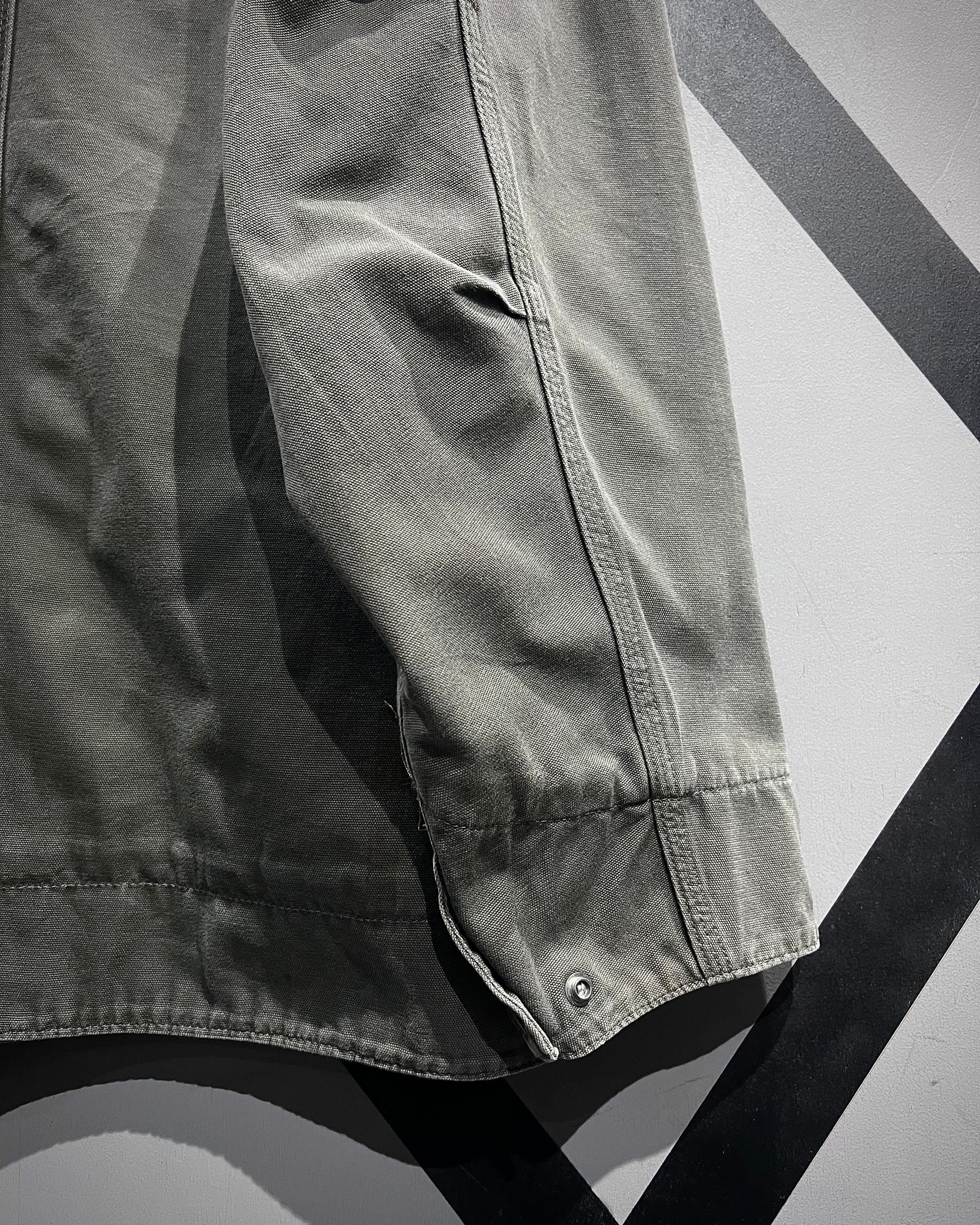 ボディにはタフなコットンダック地を採用し、長年の着用によって生まれた褪色が全面に広がる、唯一無二の表情が魅力。グリーンが抜けたスモーキーで枯れた色味は、リアルワーク由来ならではの説得力を感じさせます。