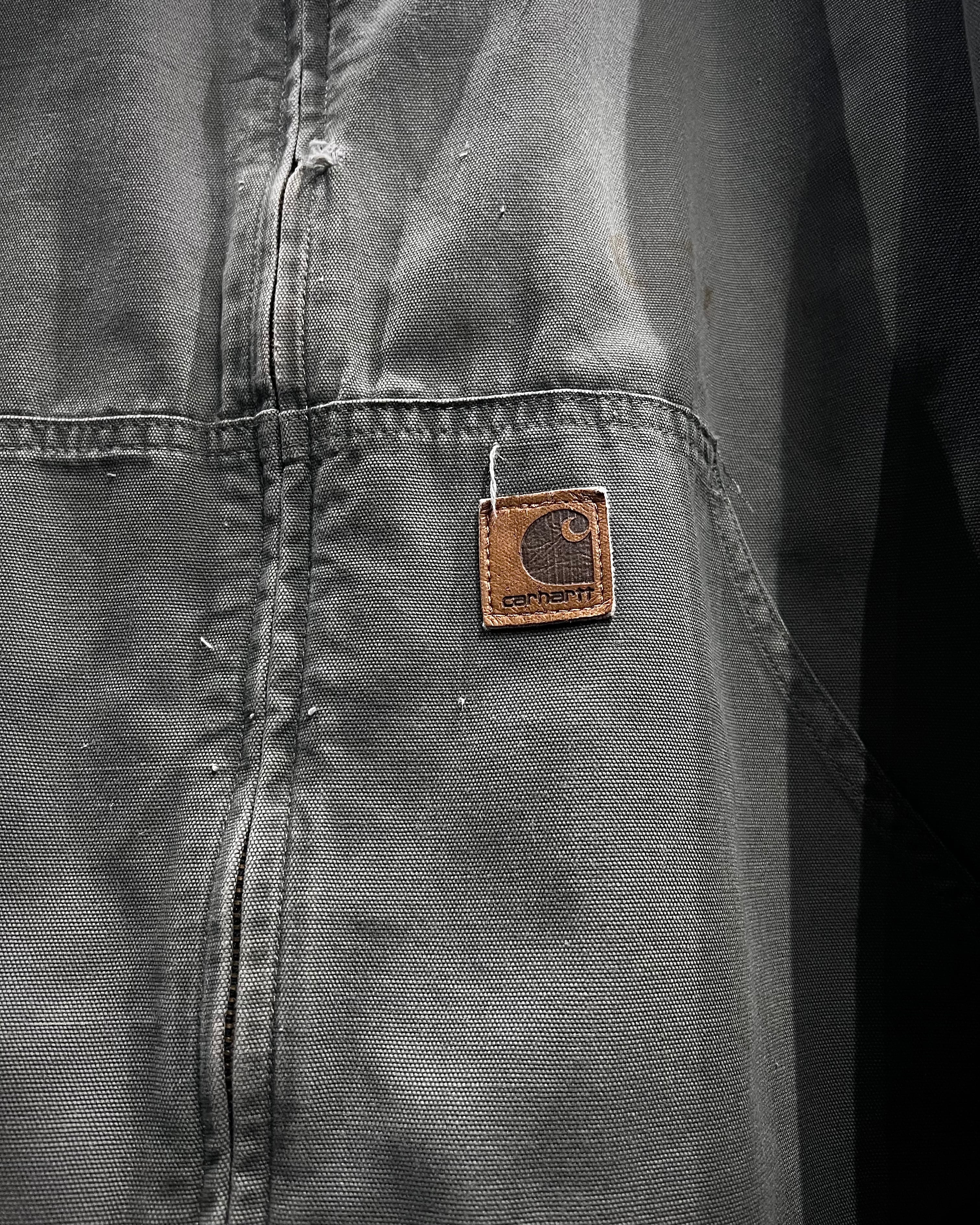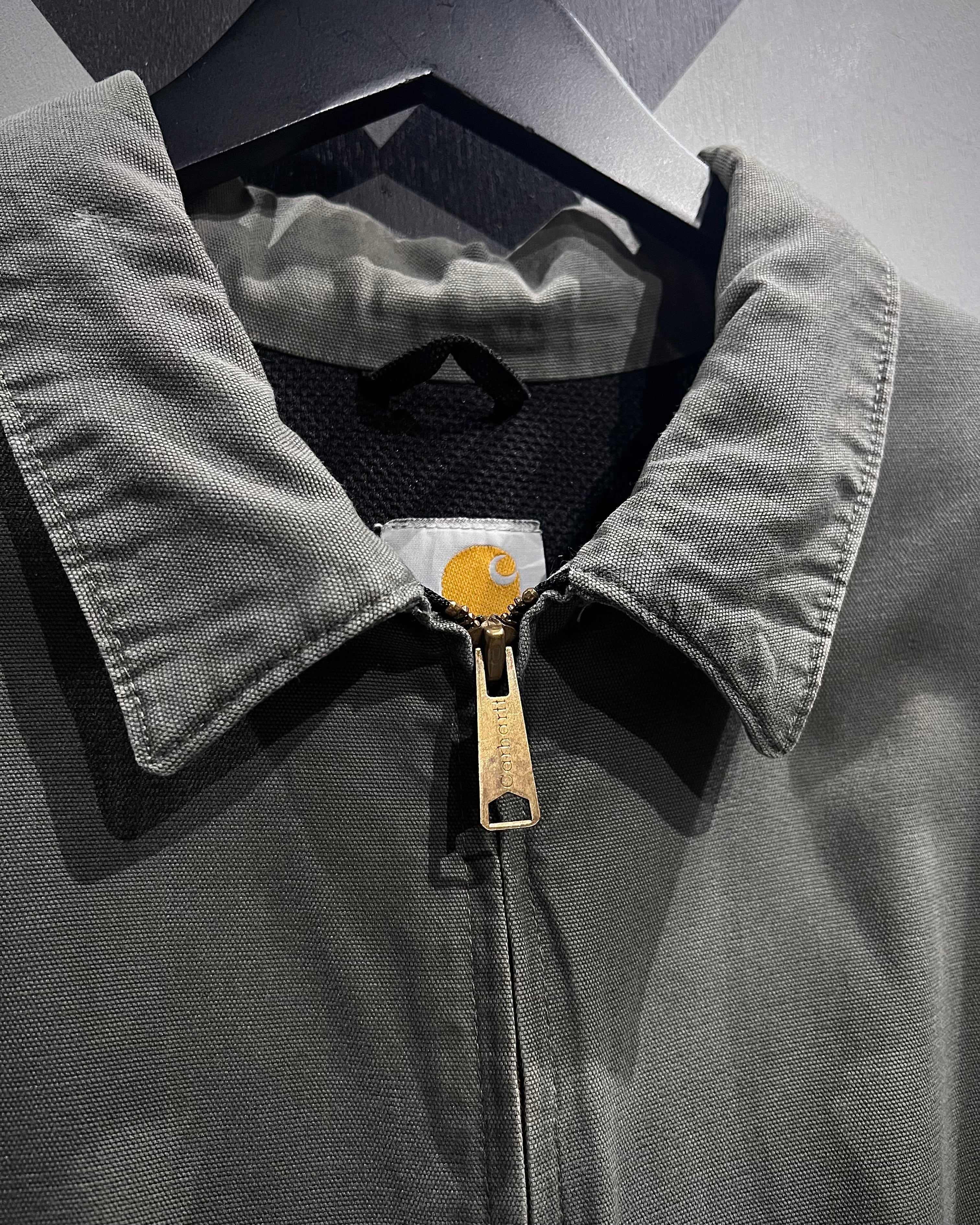 フロントはジップアップ仕様、ハンドウォームポケットとカーハート定番のスクエアロゴパッチを配置。無駄のないシンプルなディテールが、フェード感をより一層引き立てていますね。
