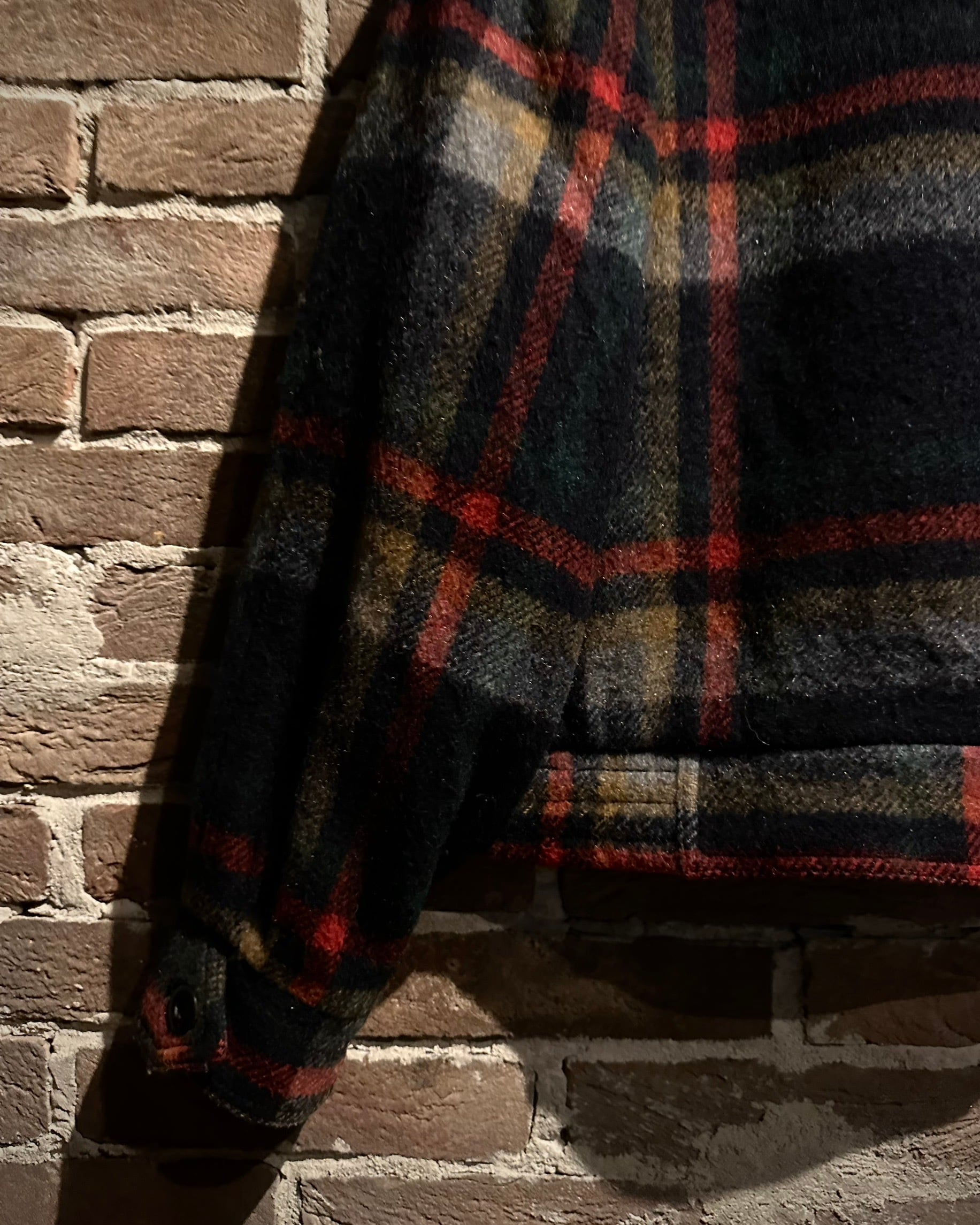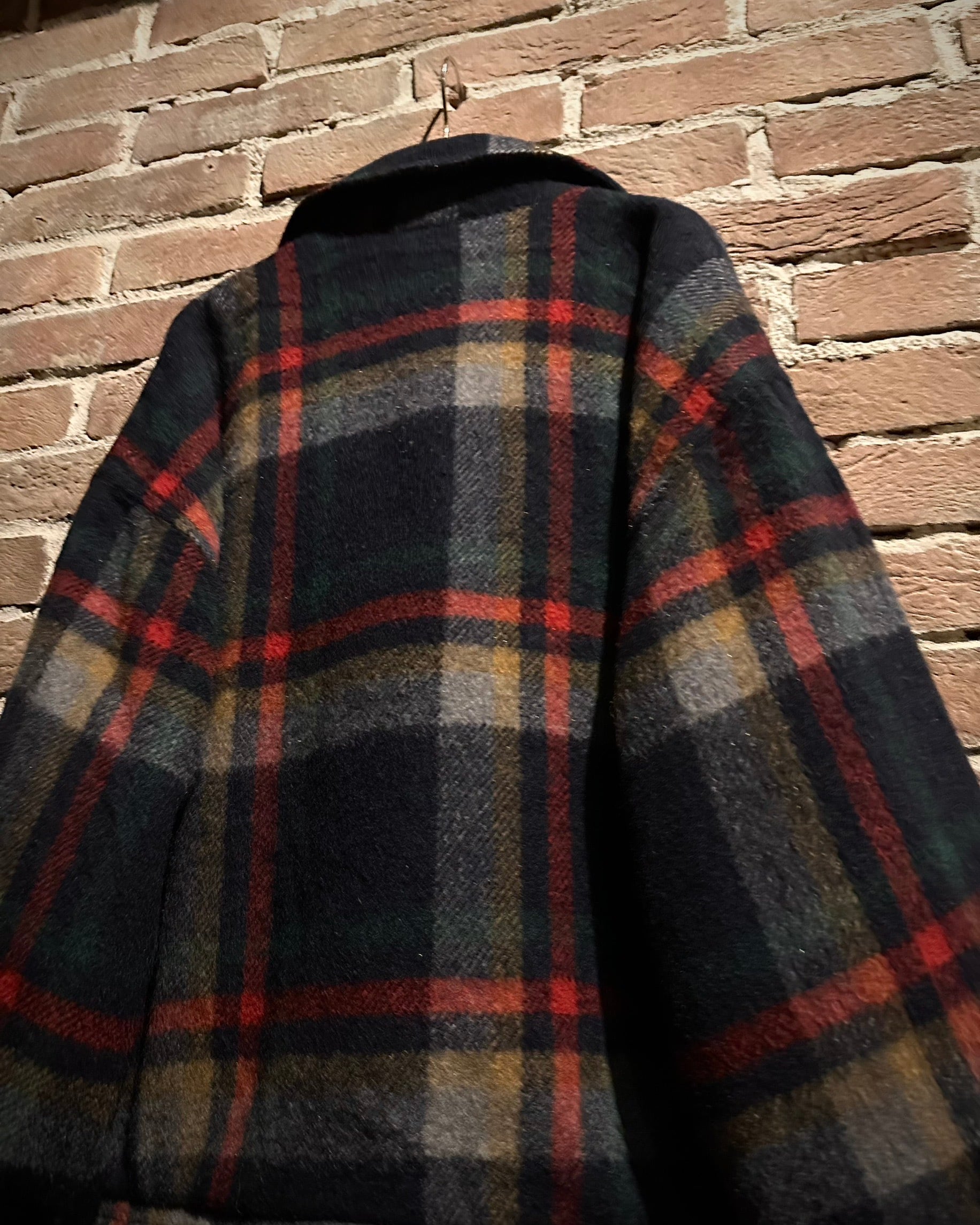 素材には暖かみのあるウール生地を採用。重厚感がありながらも硬すぎない風合いで、チェックパターンの配色バランスと相まって、クラシックと遊び心が共存した表情に仕上がっています。