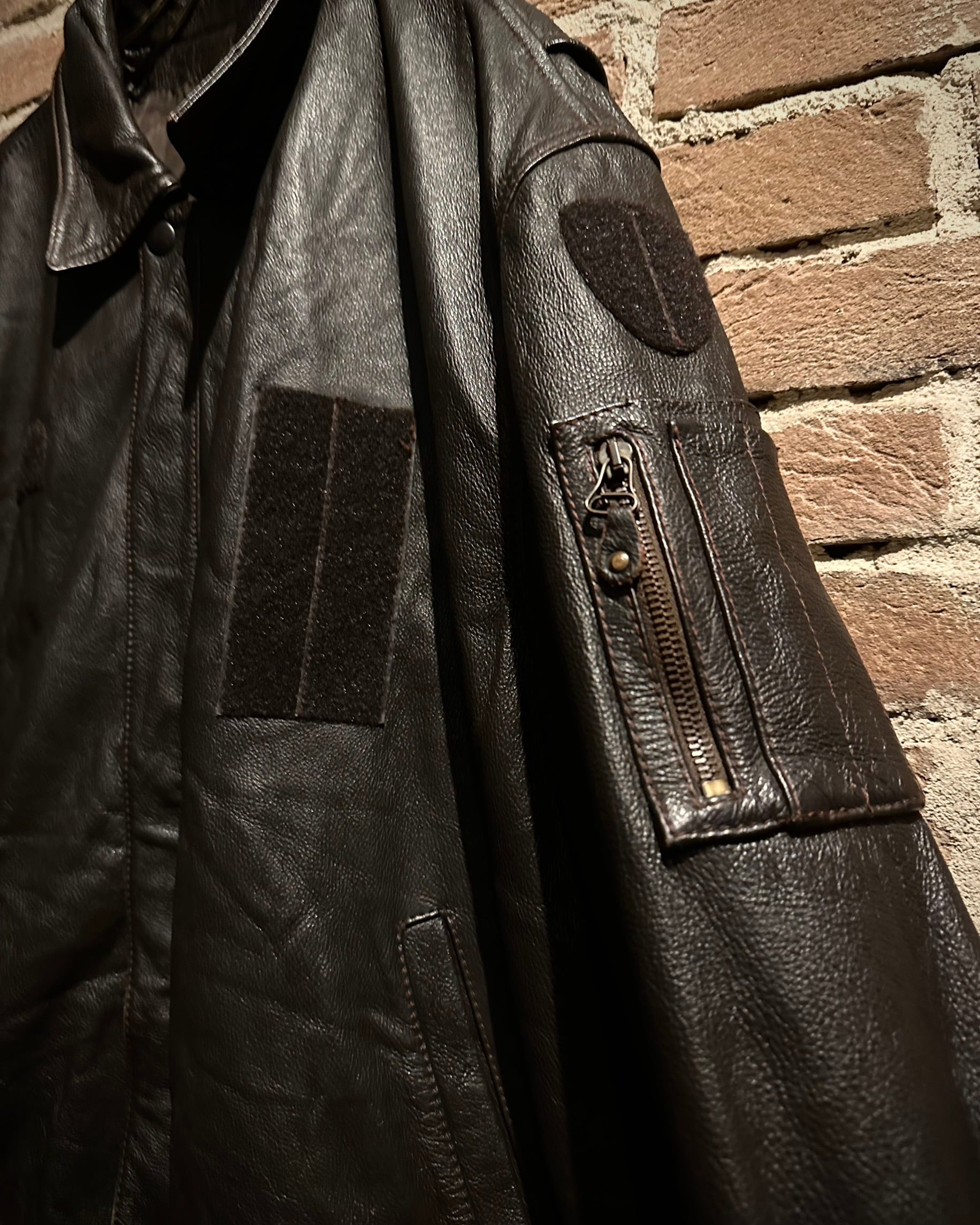 ボディにはシボ感のあるブラウンレザーを採用。着込まれることで表情を深めていくレザー特有の風合いが、ミリタリー由来の無骨さと相まって非常に雰囲気のある佇まいを演出します。
