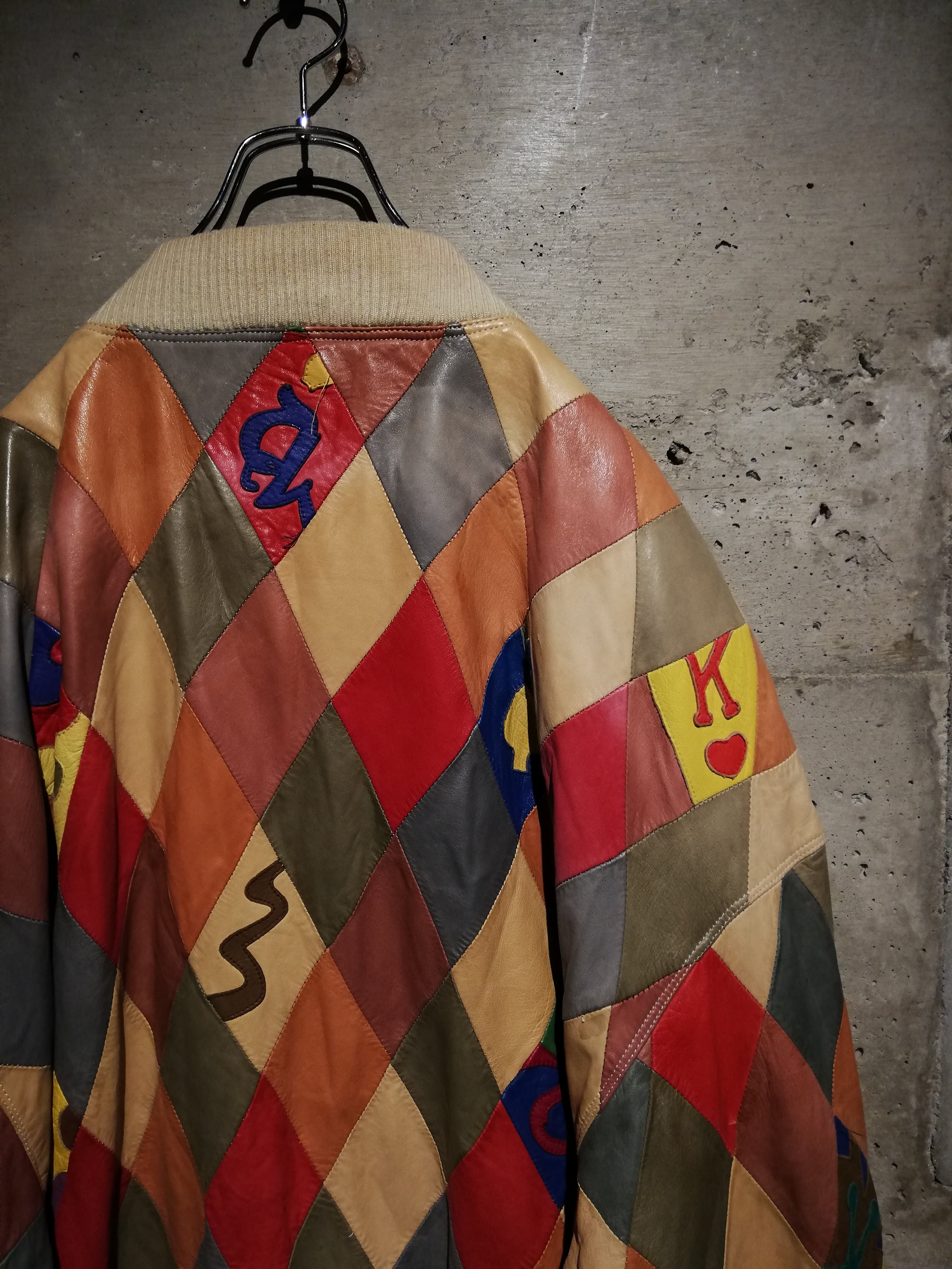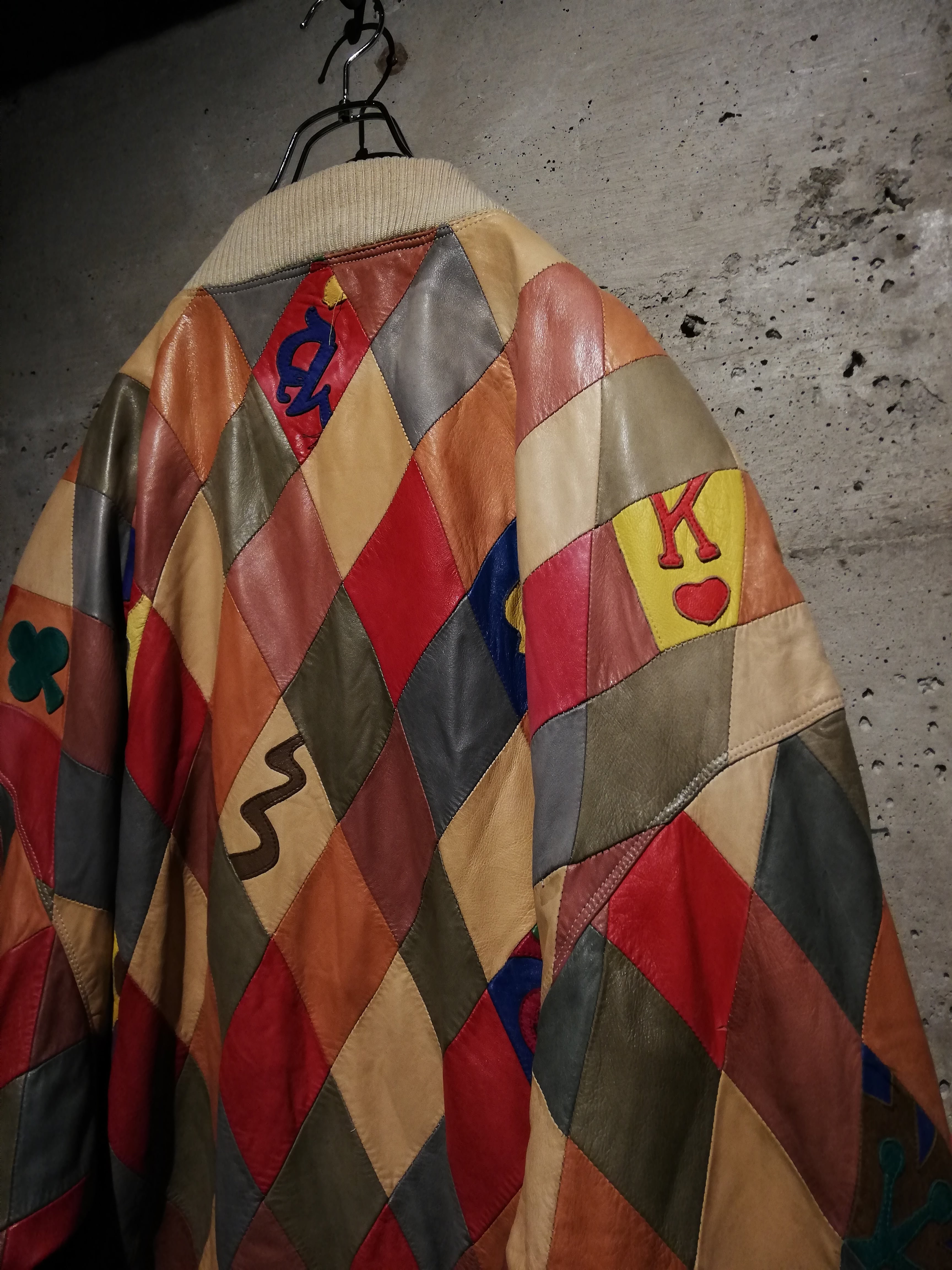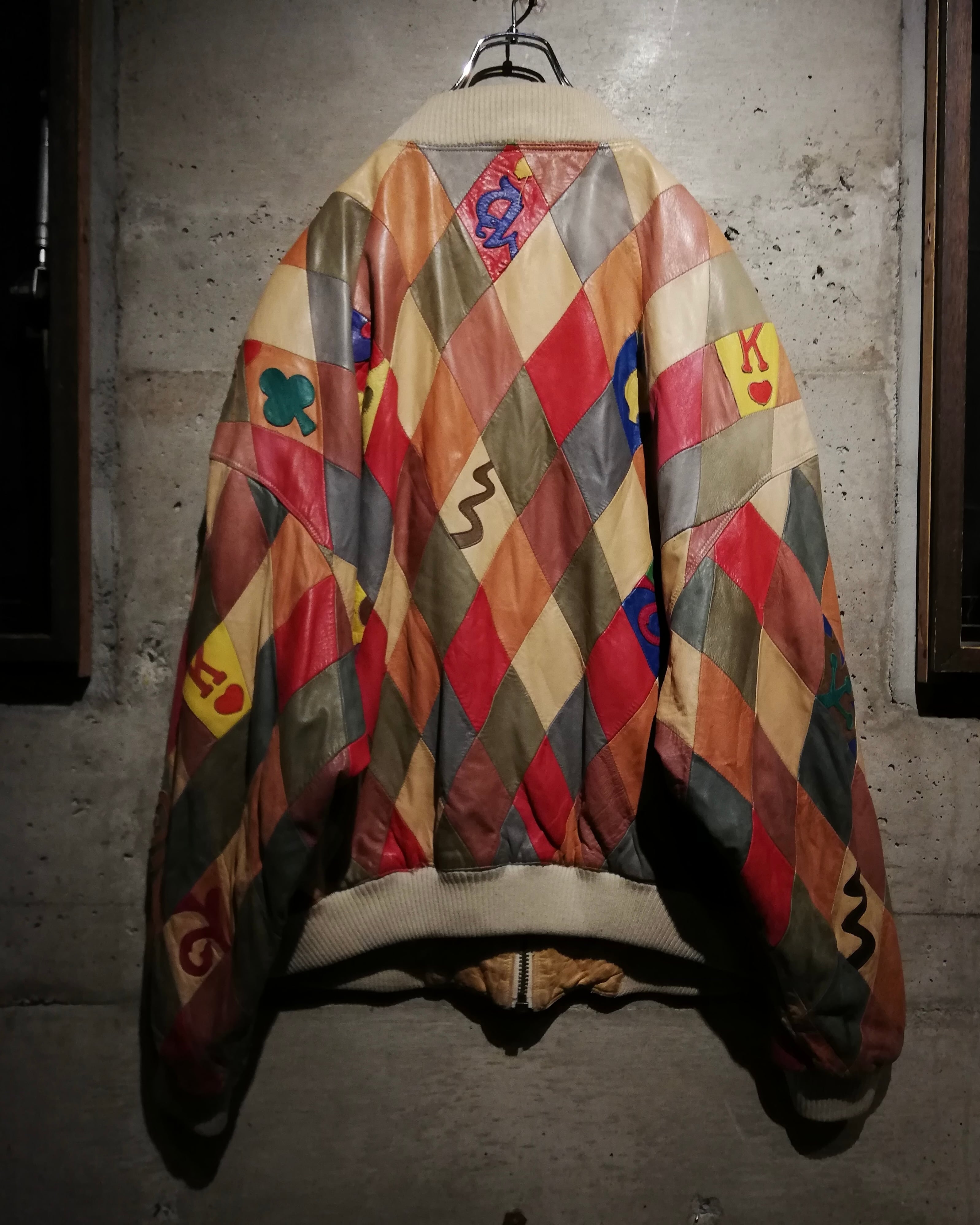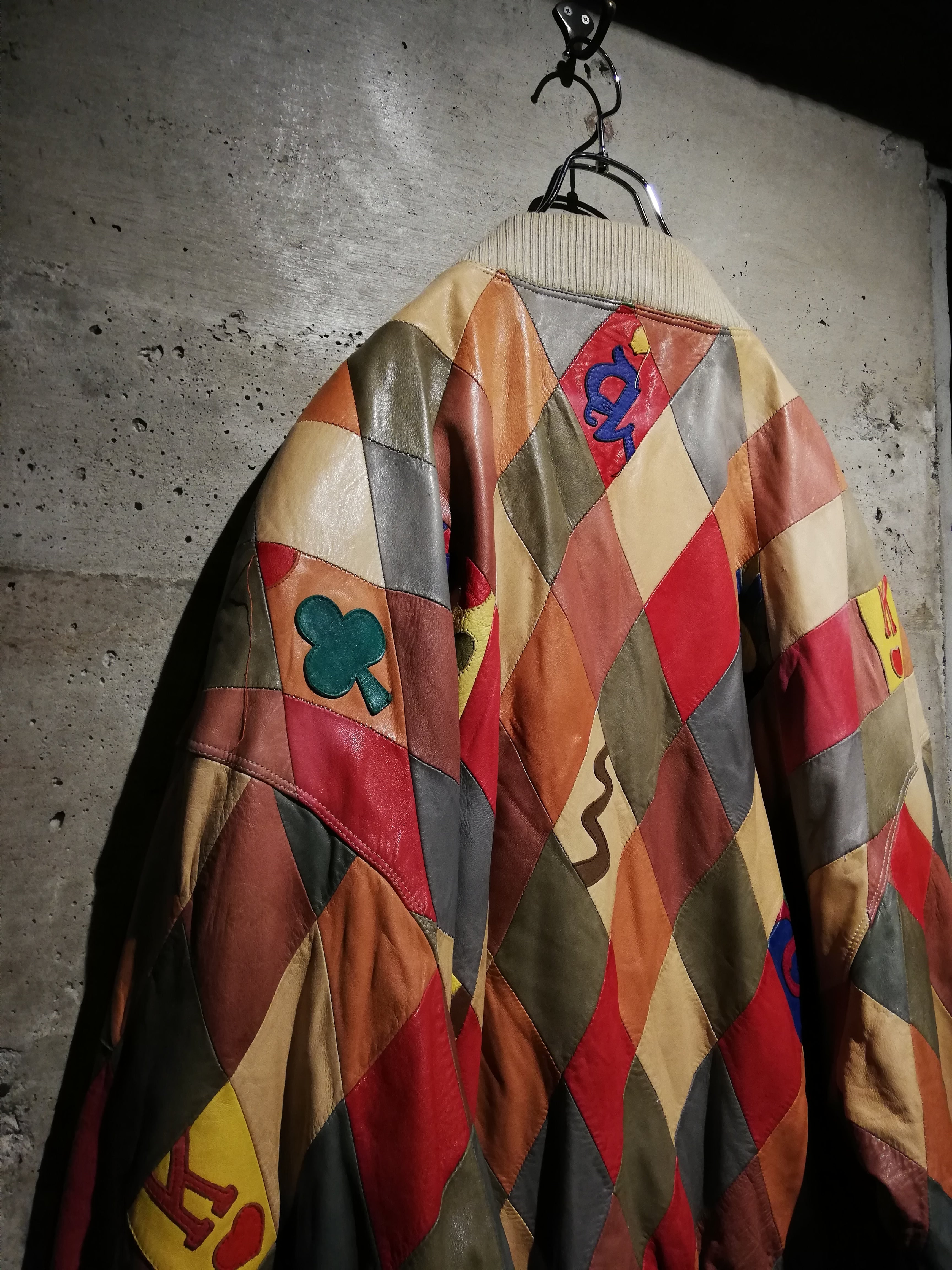 パッチワーク随所に施されたトランプモチーフや記号的エンボス。素材の質感と立体感が重なり、Pelle Pelleらしいラグジュアリーとストリートの均衡を形成。リブ付きのネック、袖、裾まで含め、完成度の高い作り。