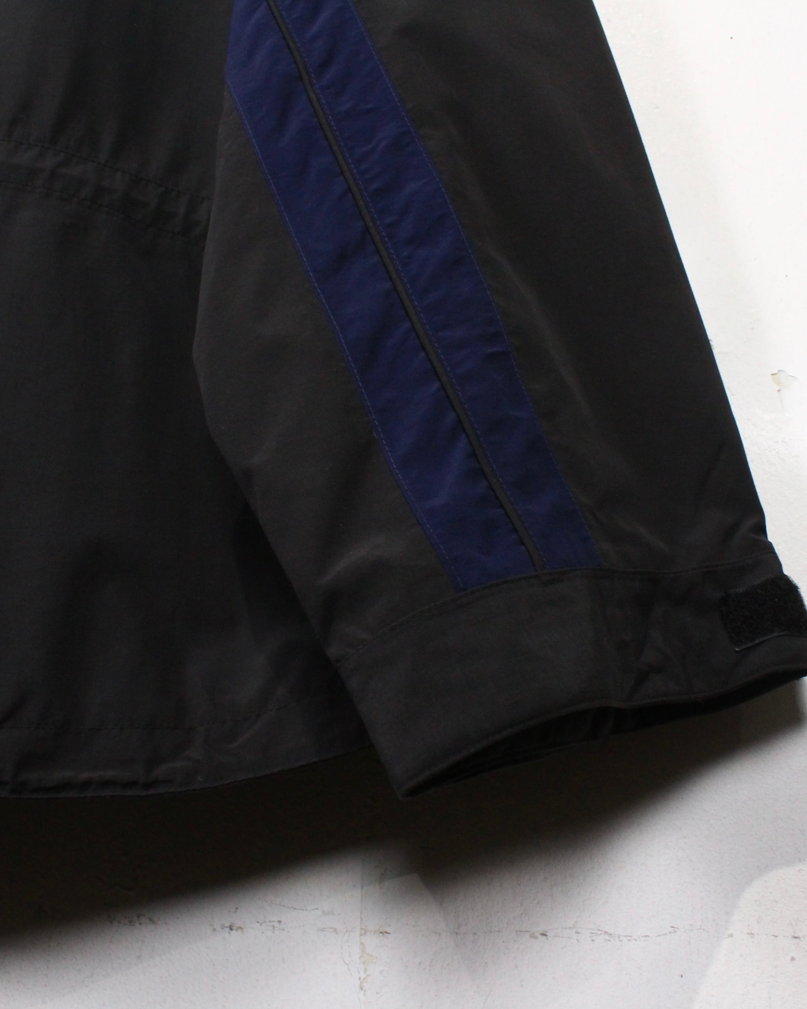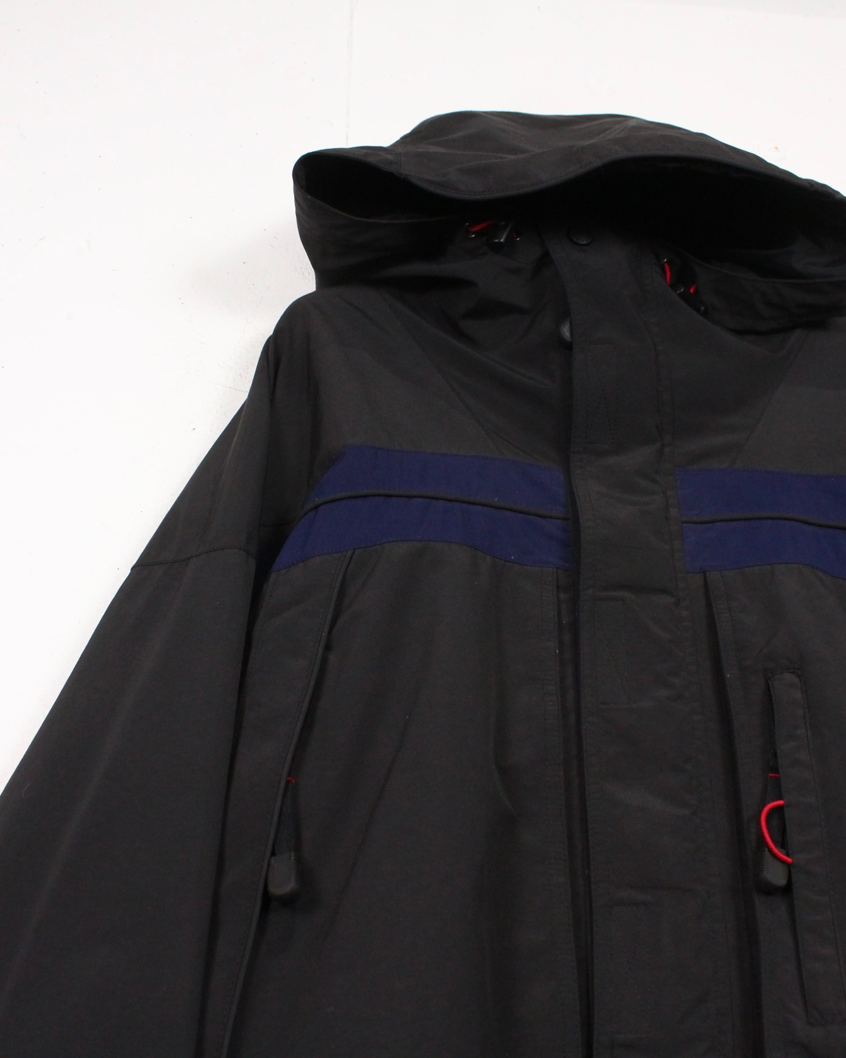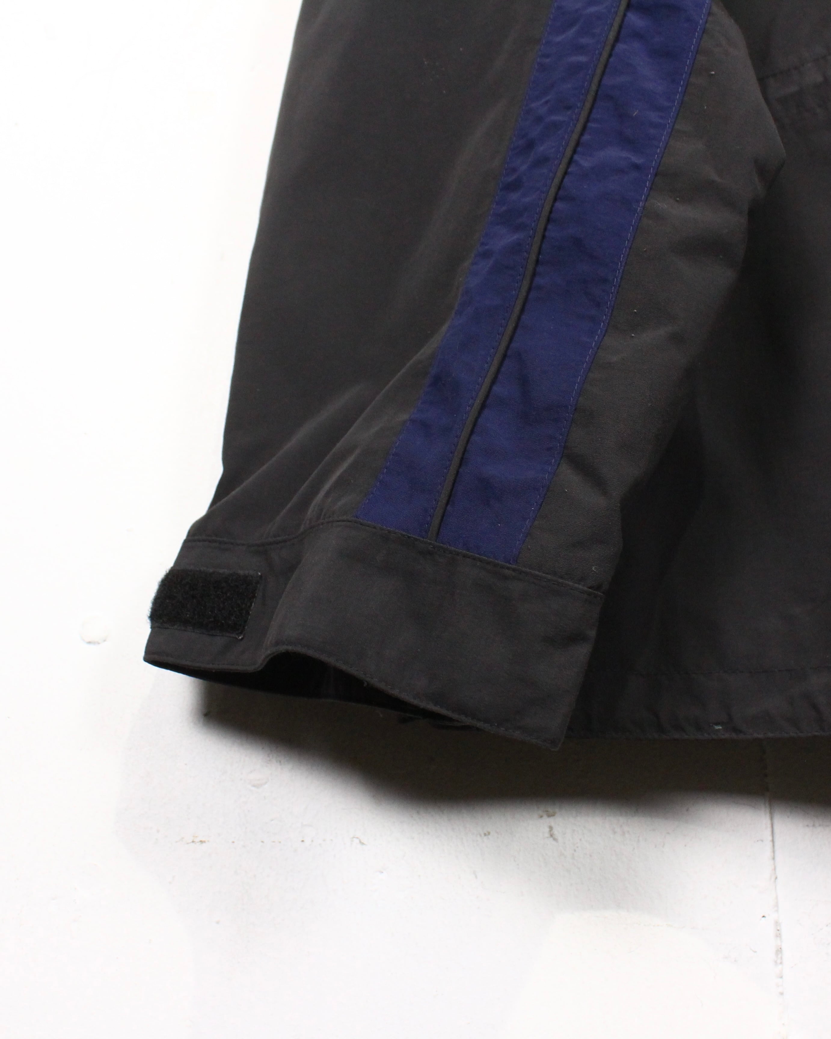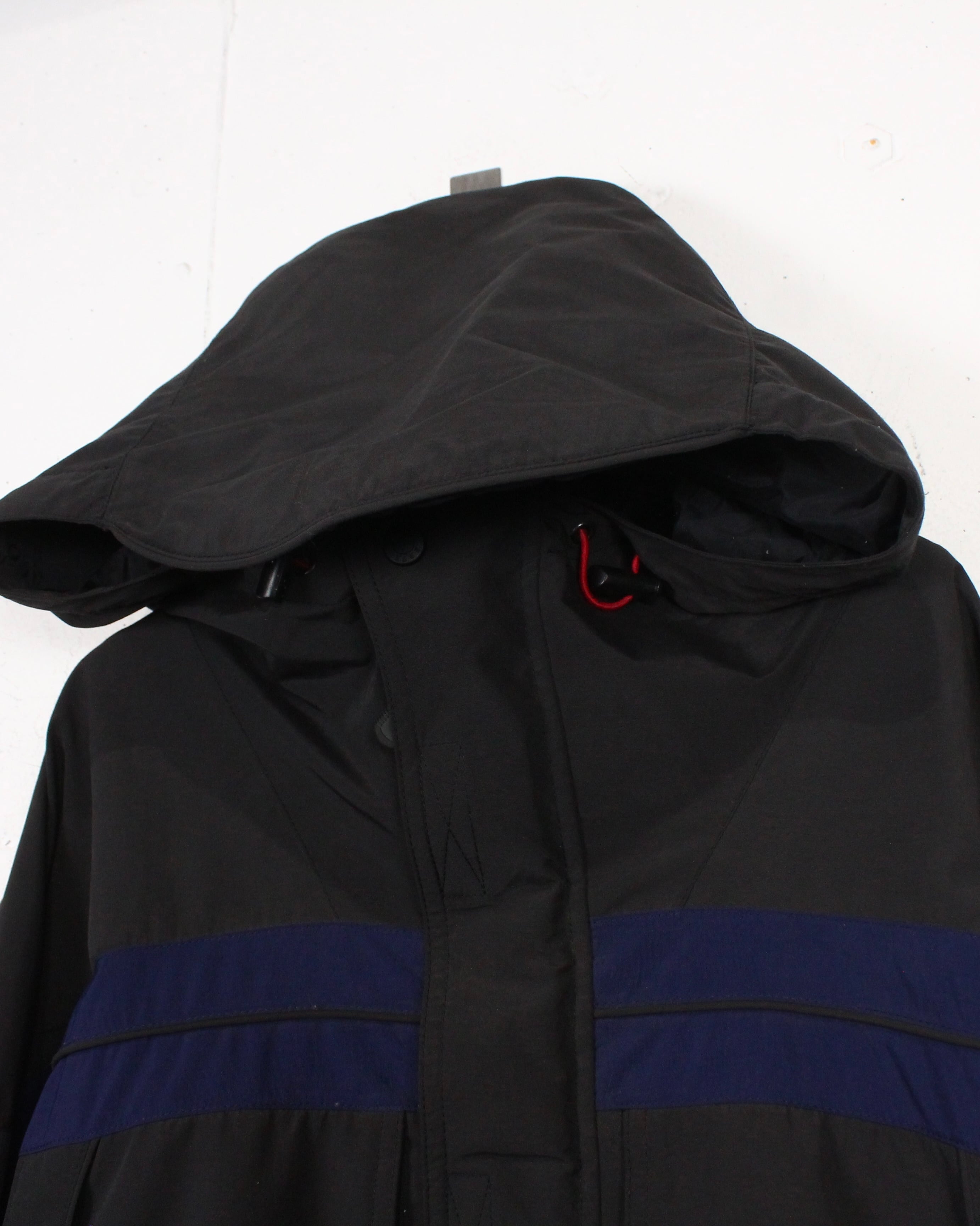 前立てはジップとベルクロの二層構造。フード部や裾のドローコードによりシルエットの変更も可能。随所のステッチワークやパイピングが圧倒的ギア感を漂わせています。