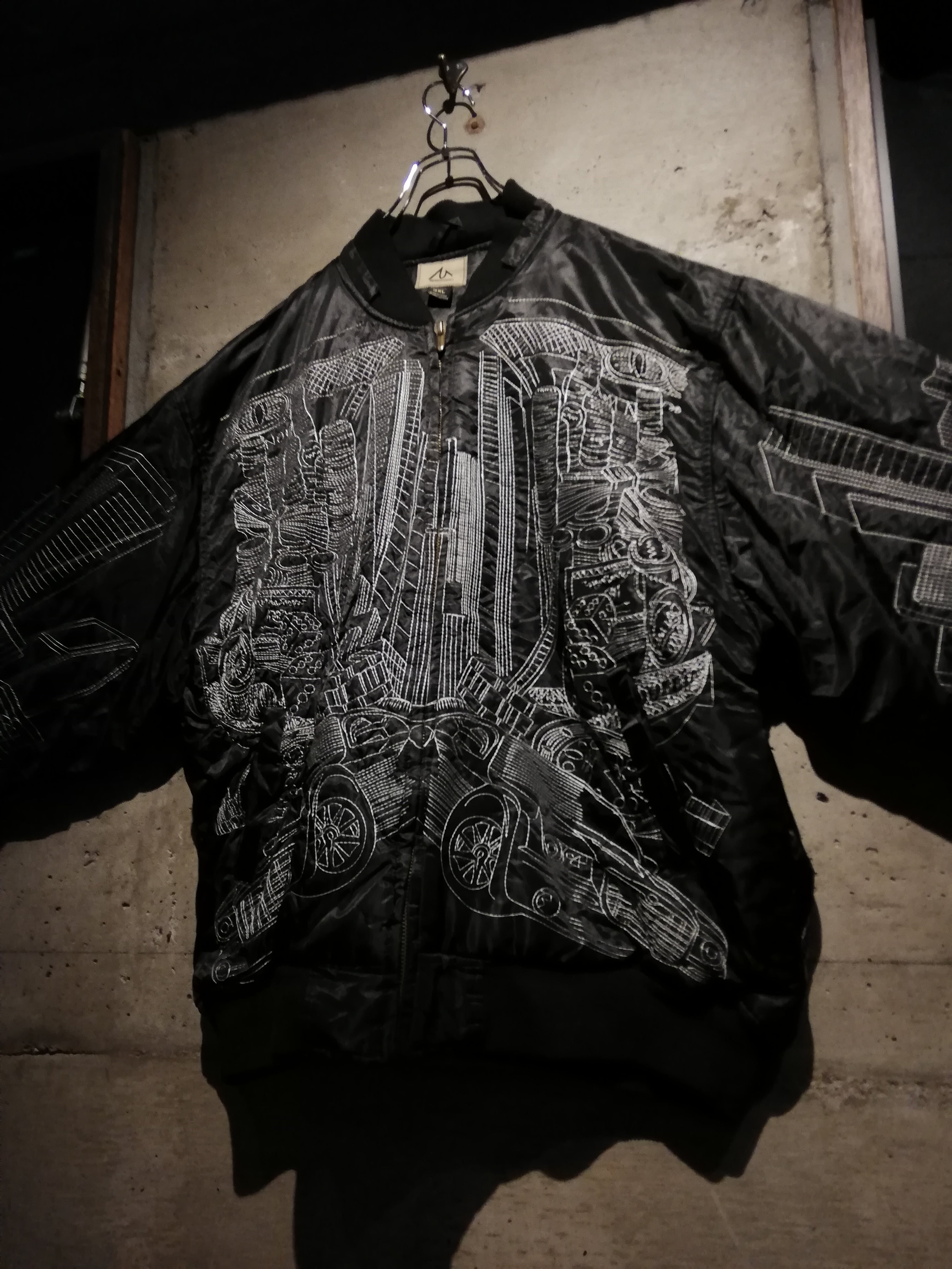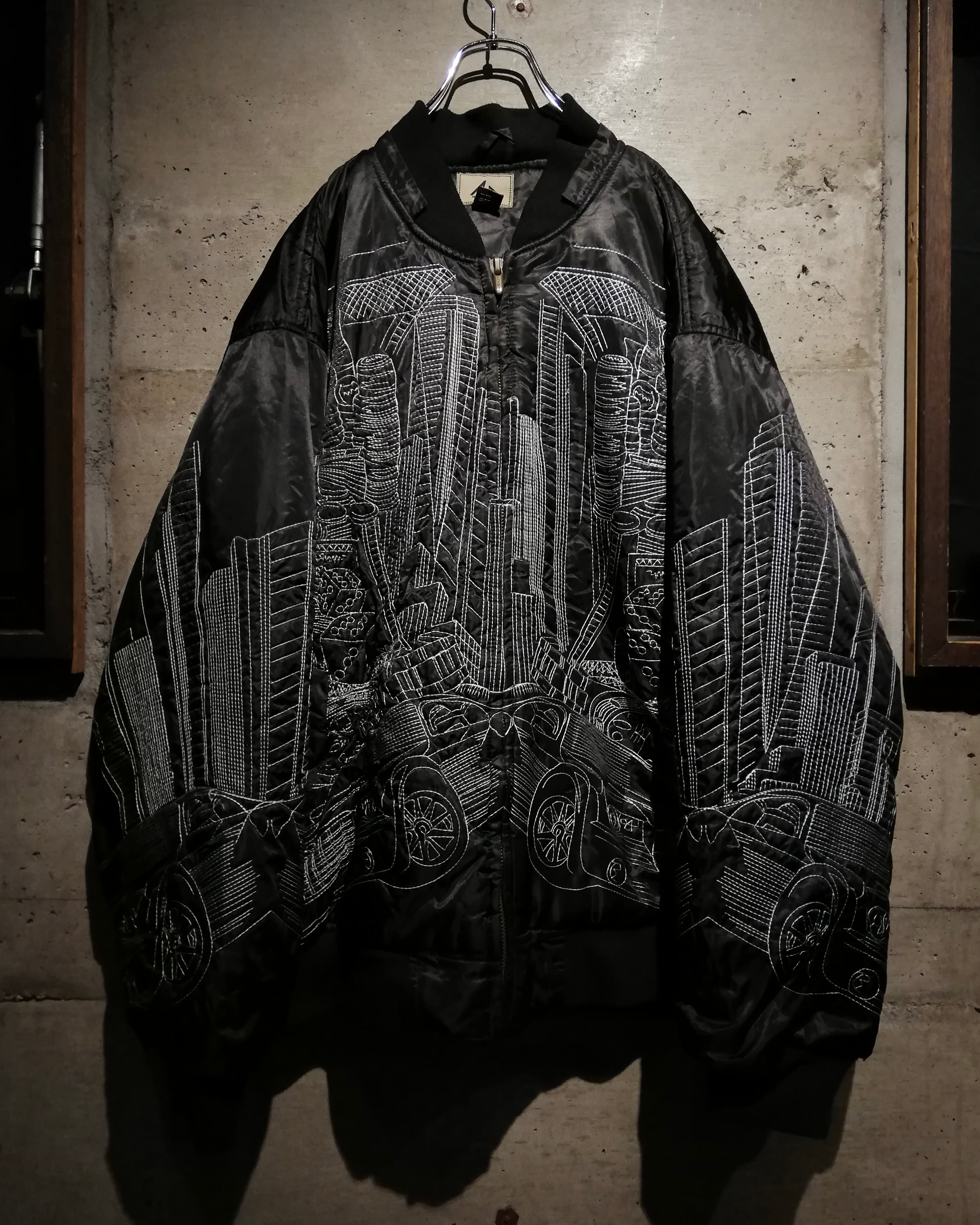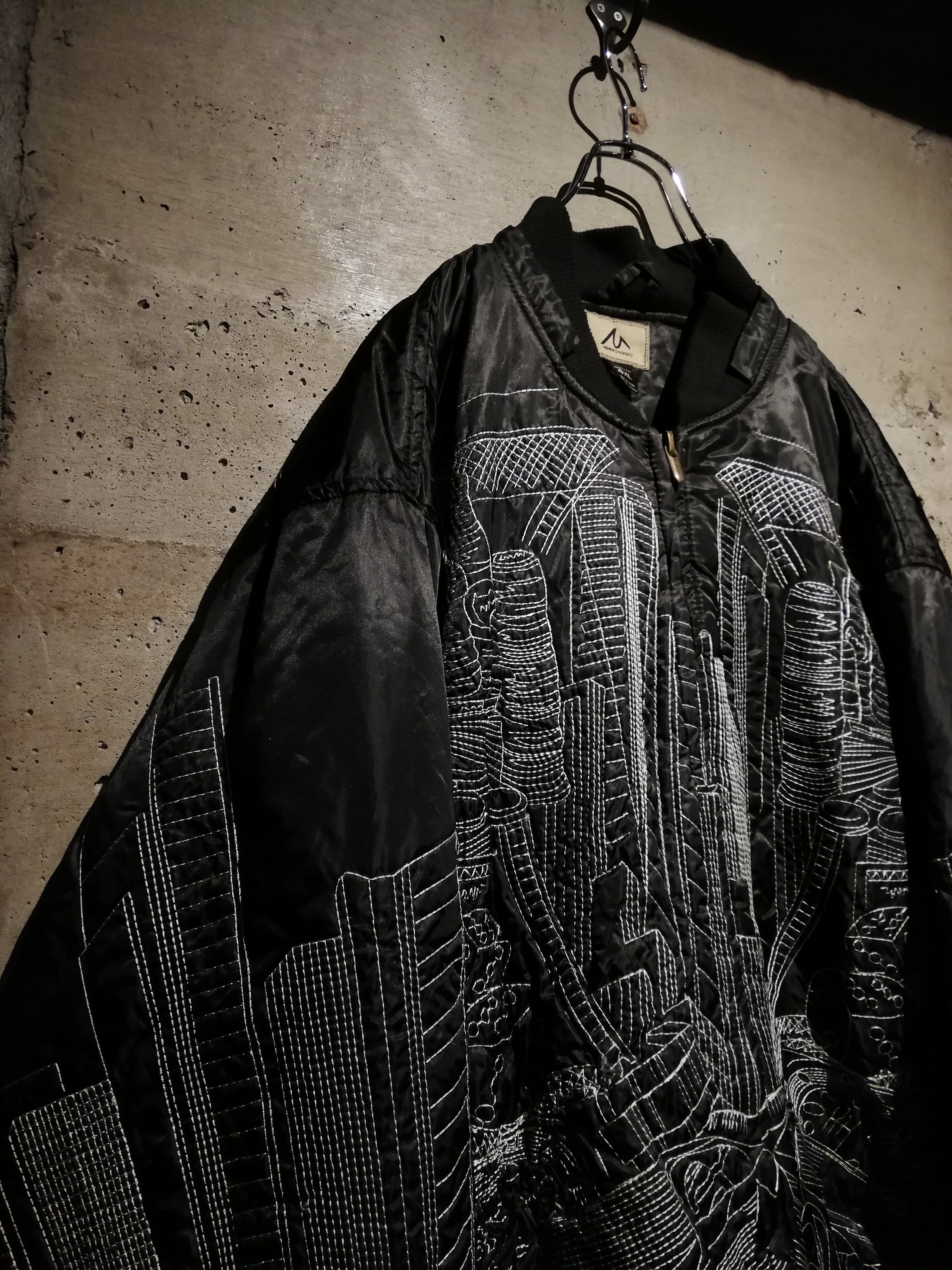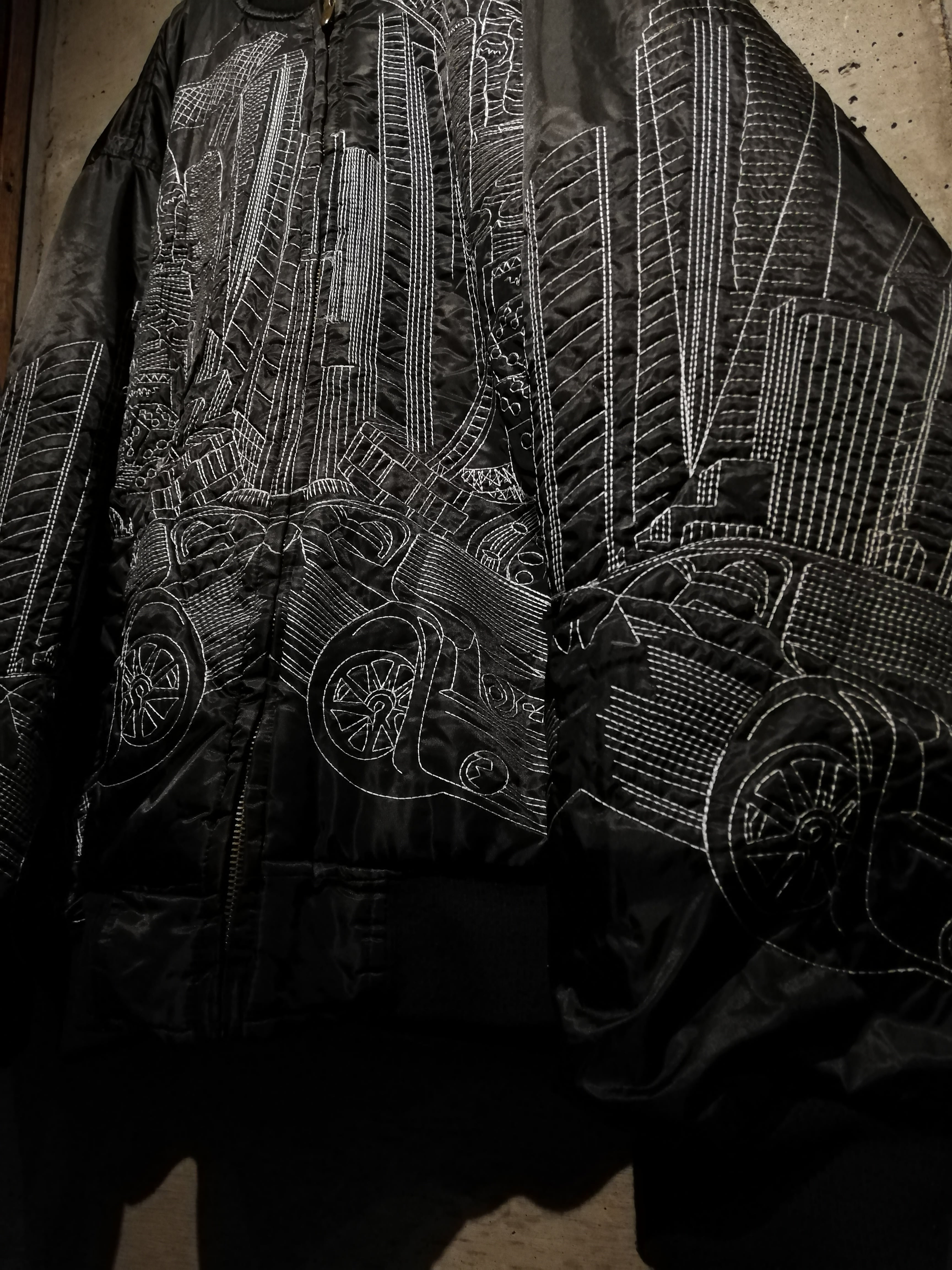 ブラックベースのボンバージャケットに、都市や車、モチーフを描くように細密なステッチワークが広がり、プリントでは演出出来ない立体感と重厚さを備えています。