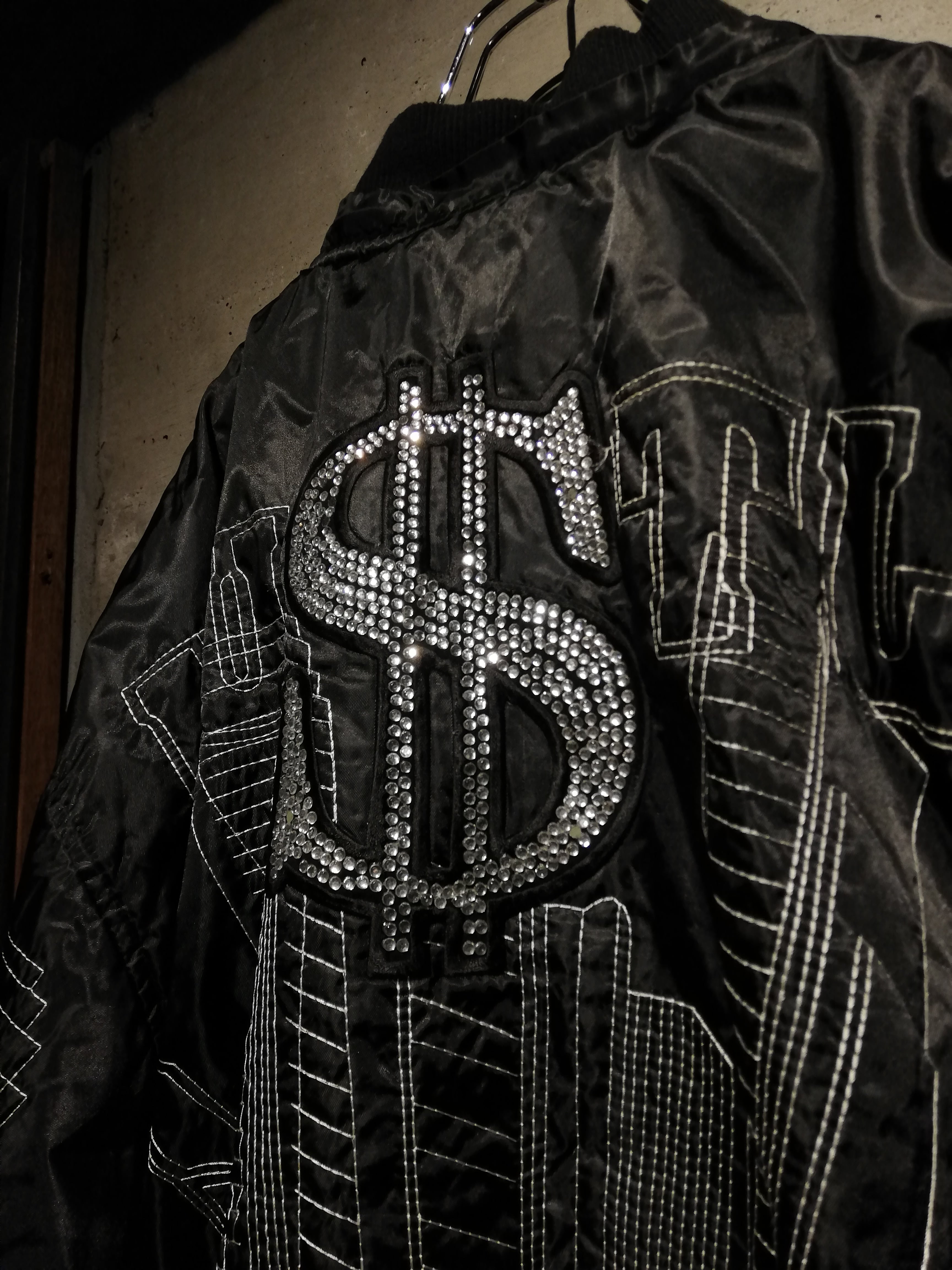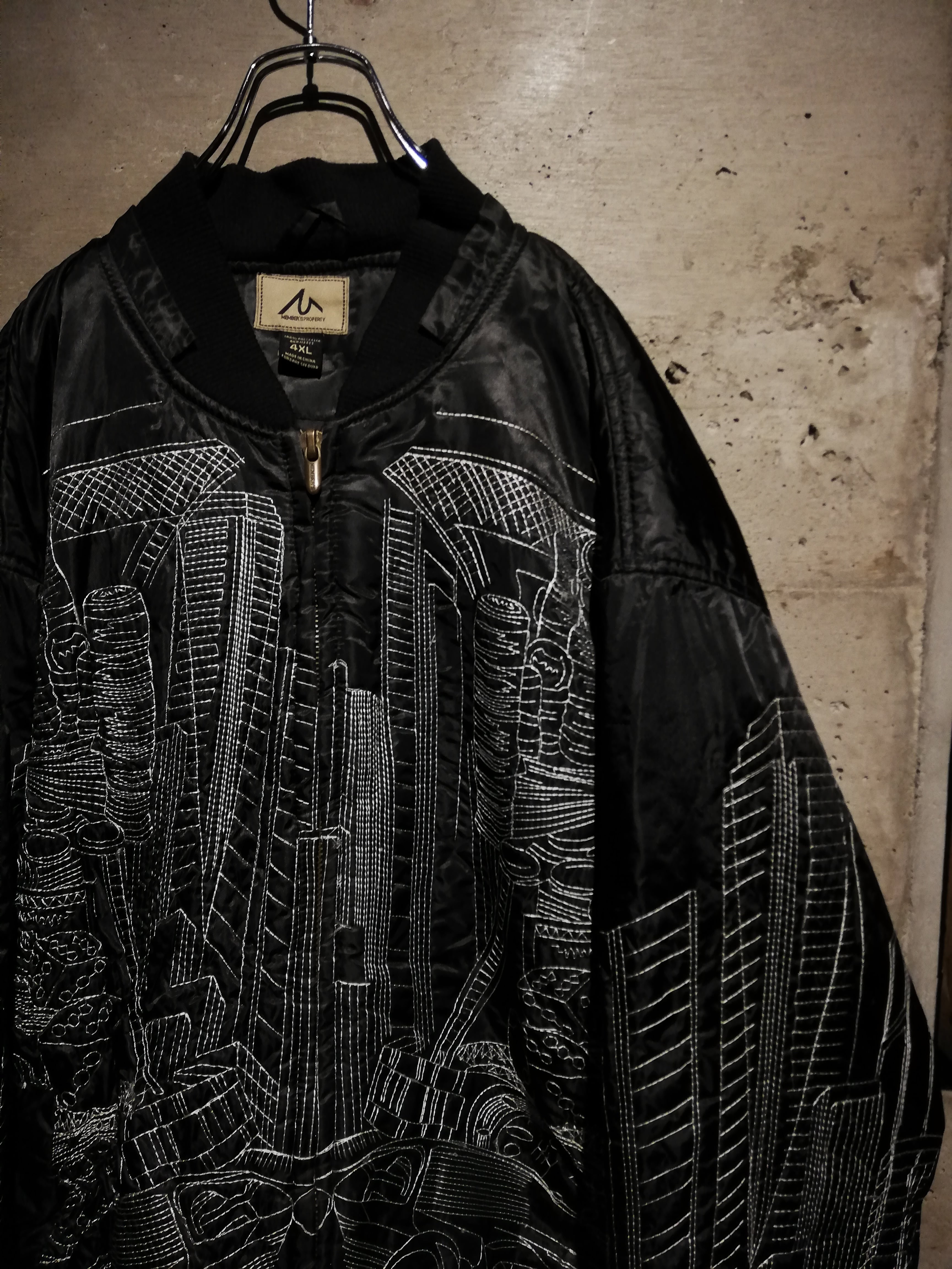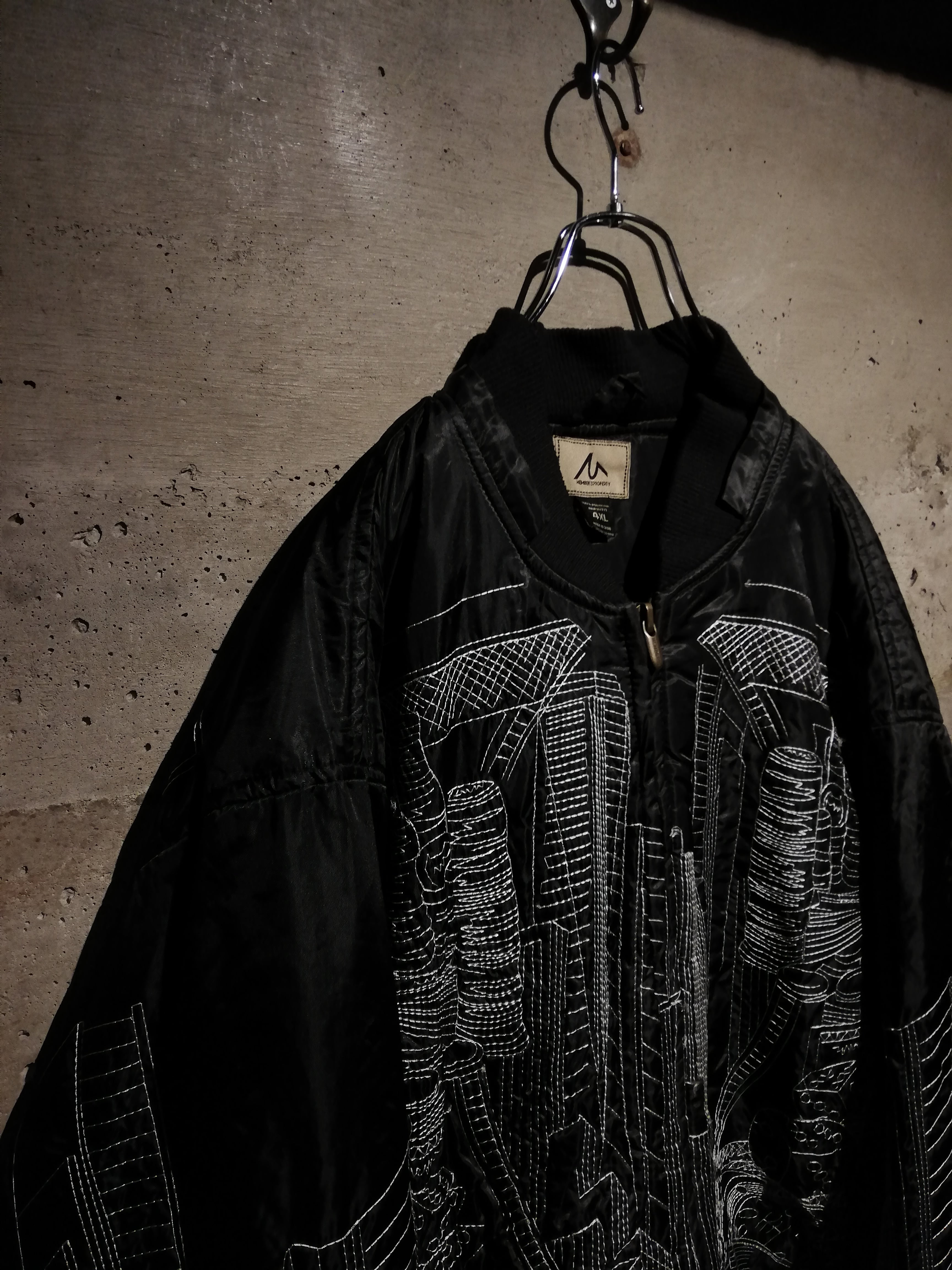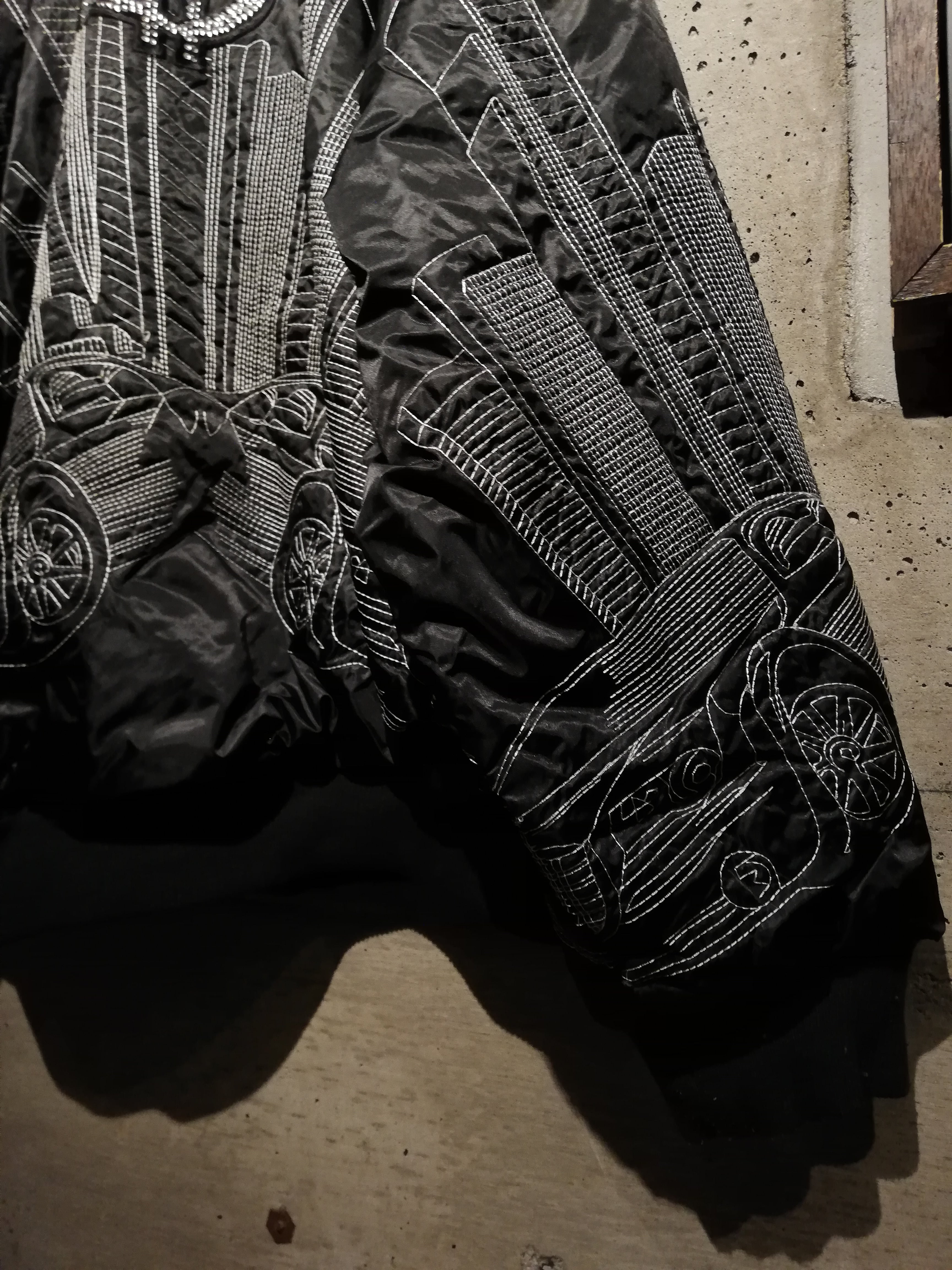 ブラックベースのボンバージャケットに、都市や車、モチーフを描くように細密なステッチワークが広がり、プリントでは演出出来ない立体感と重厚さを備えています。