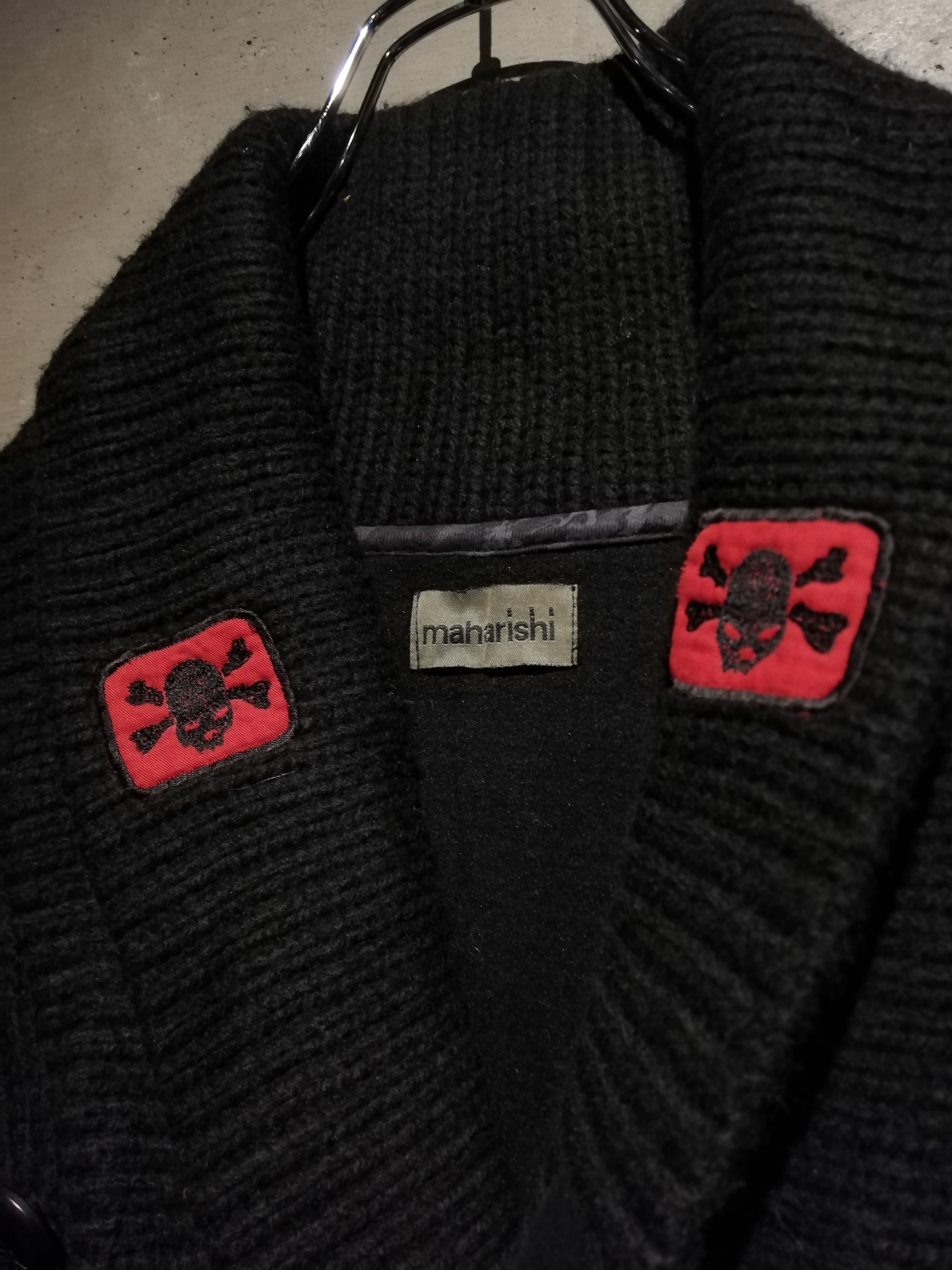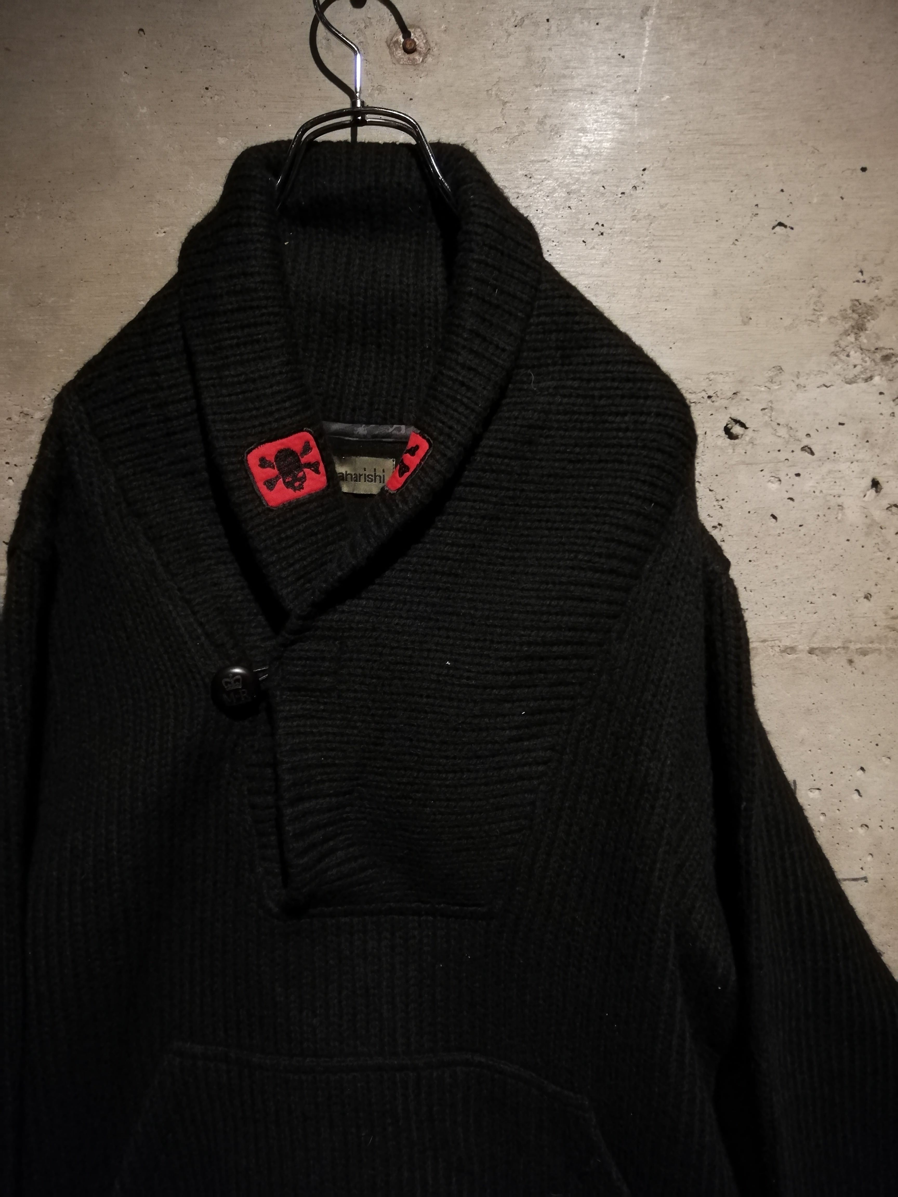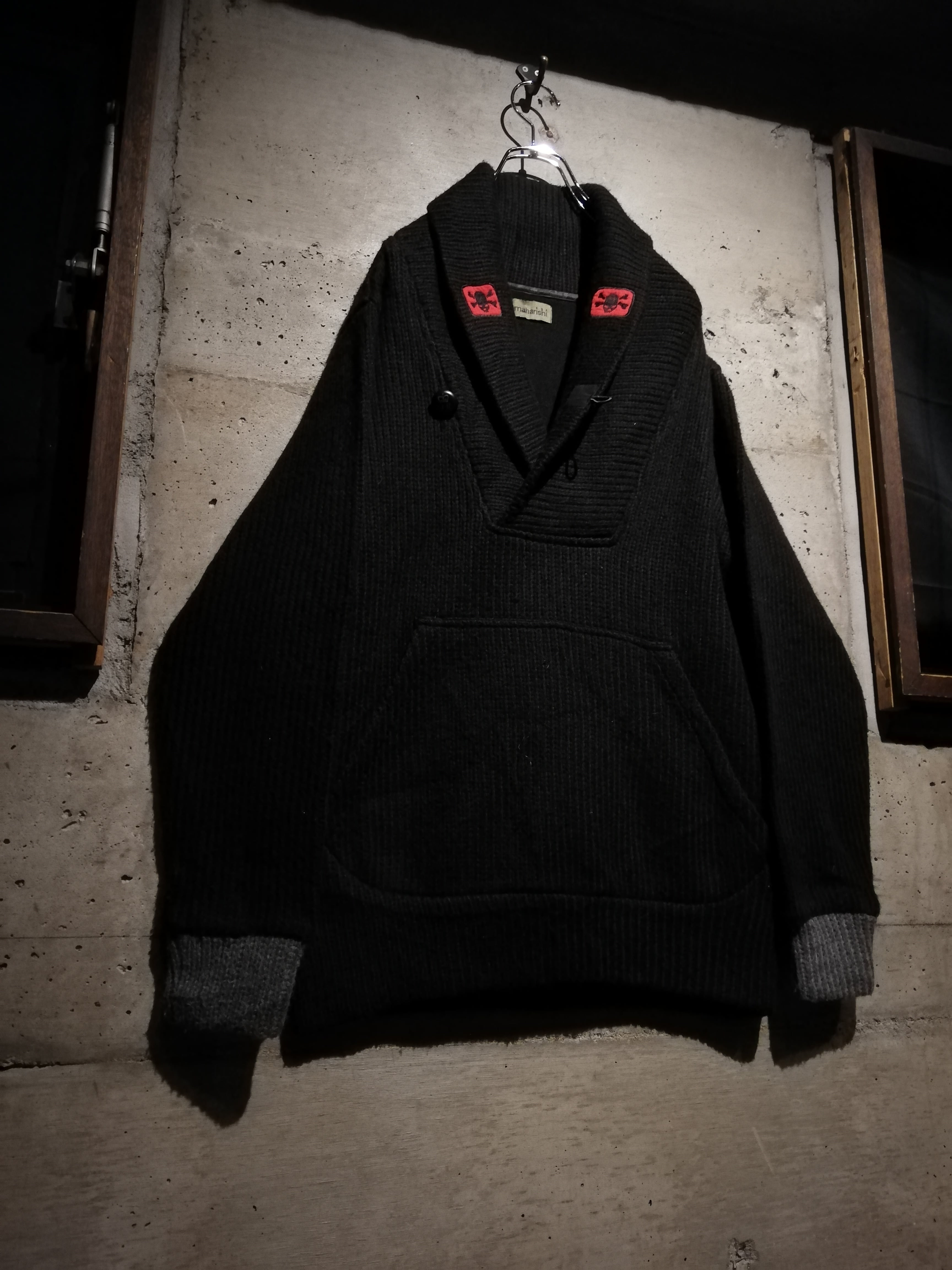 フワッと柔らかいブラックのニットをボディに用い、襟にスカルの刺繍を施した、当ブランドらしいストリート感を見せるショールカラーニット。