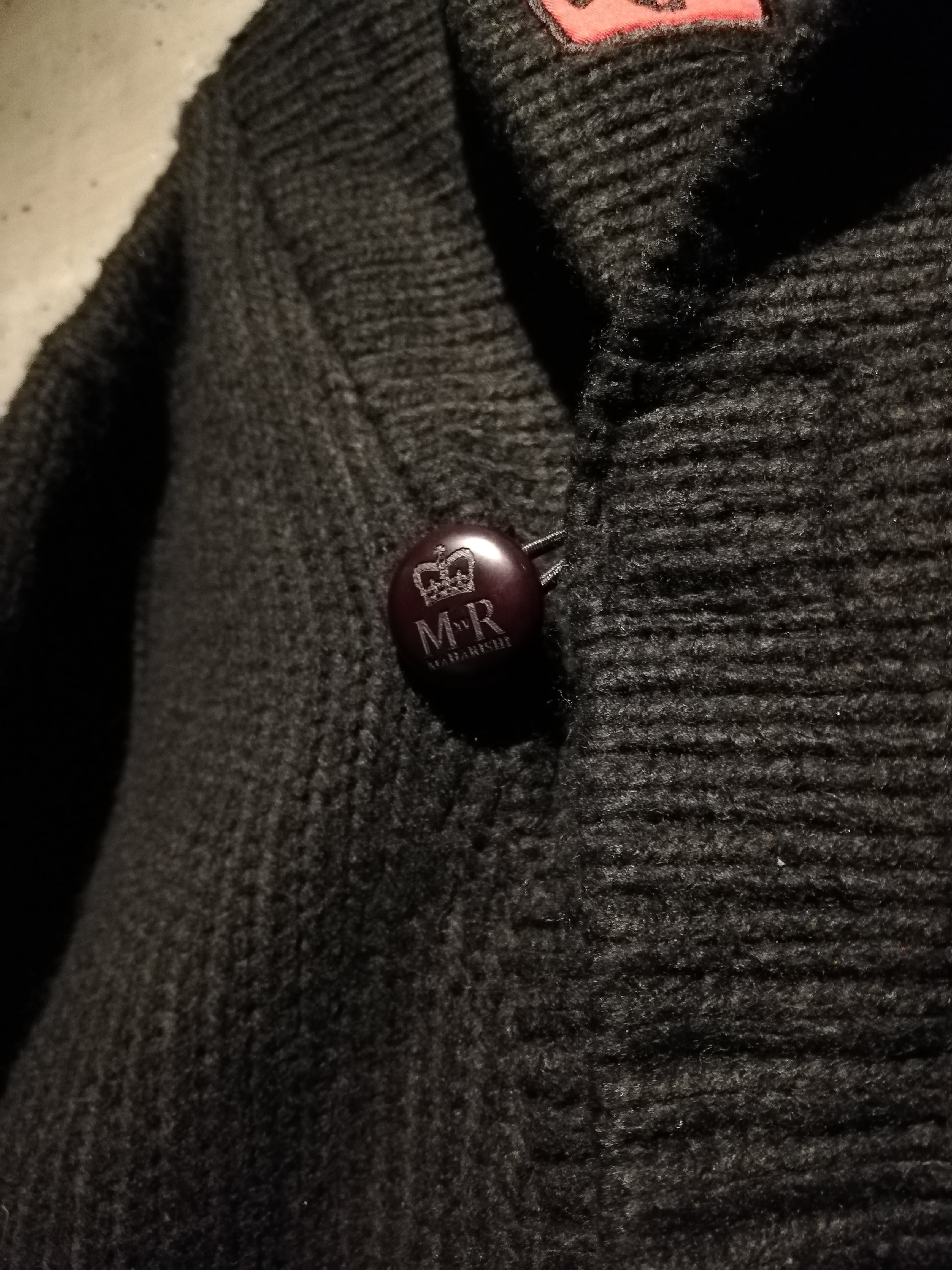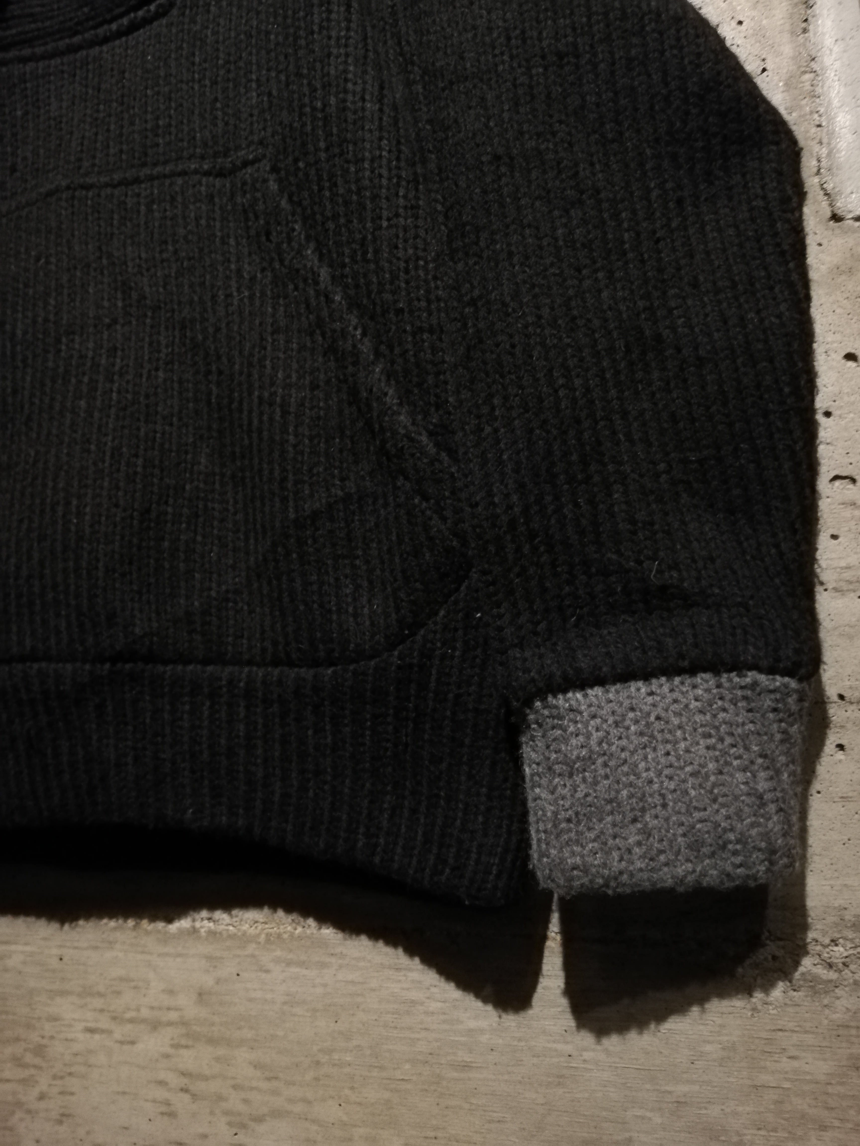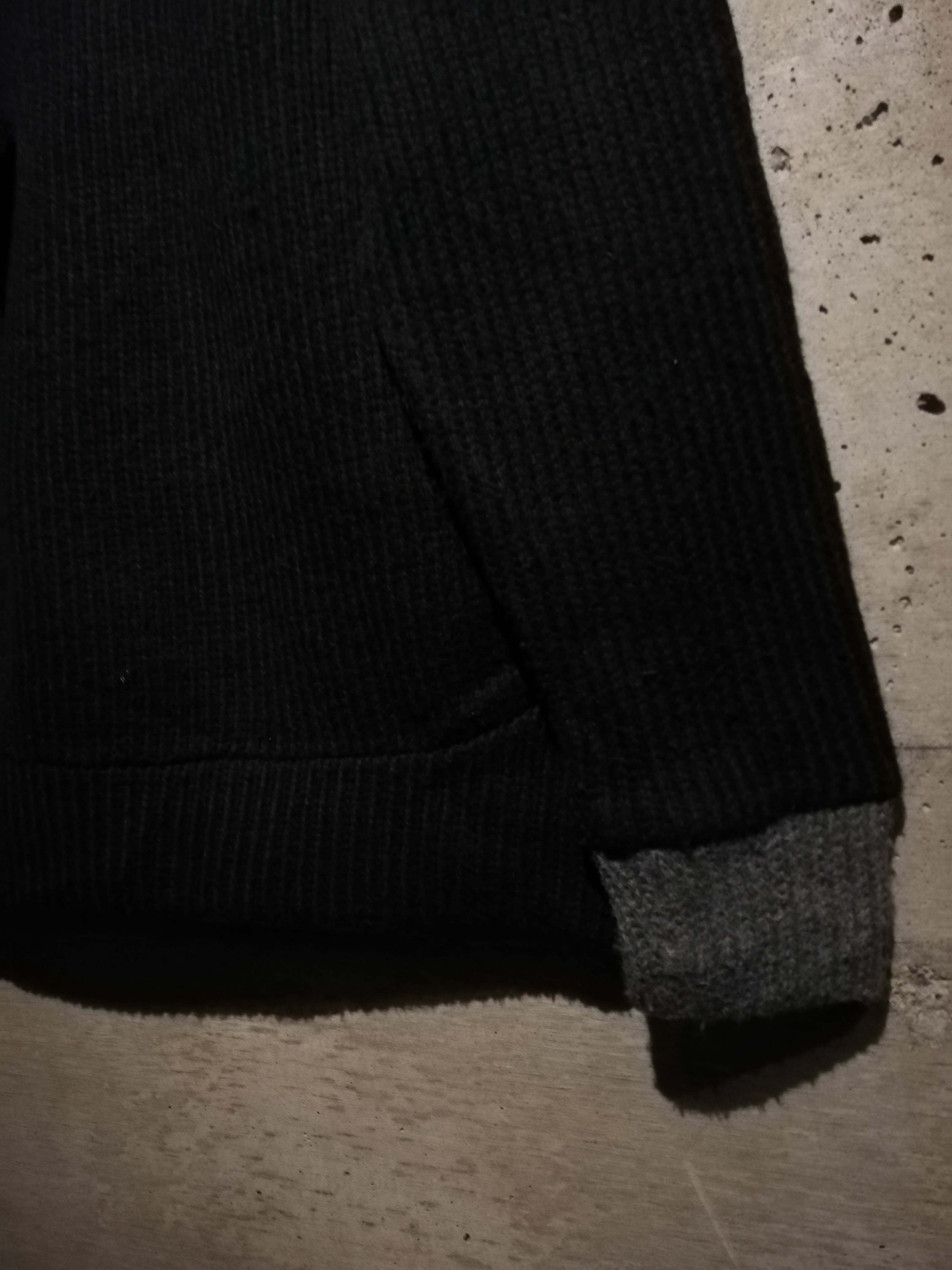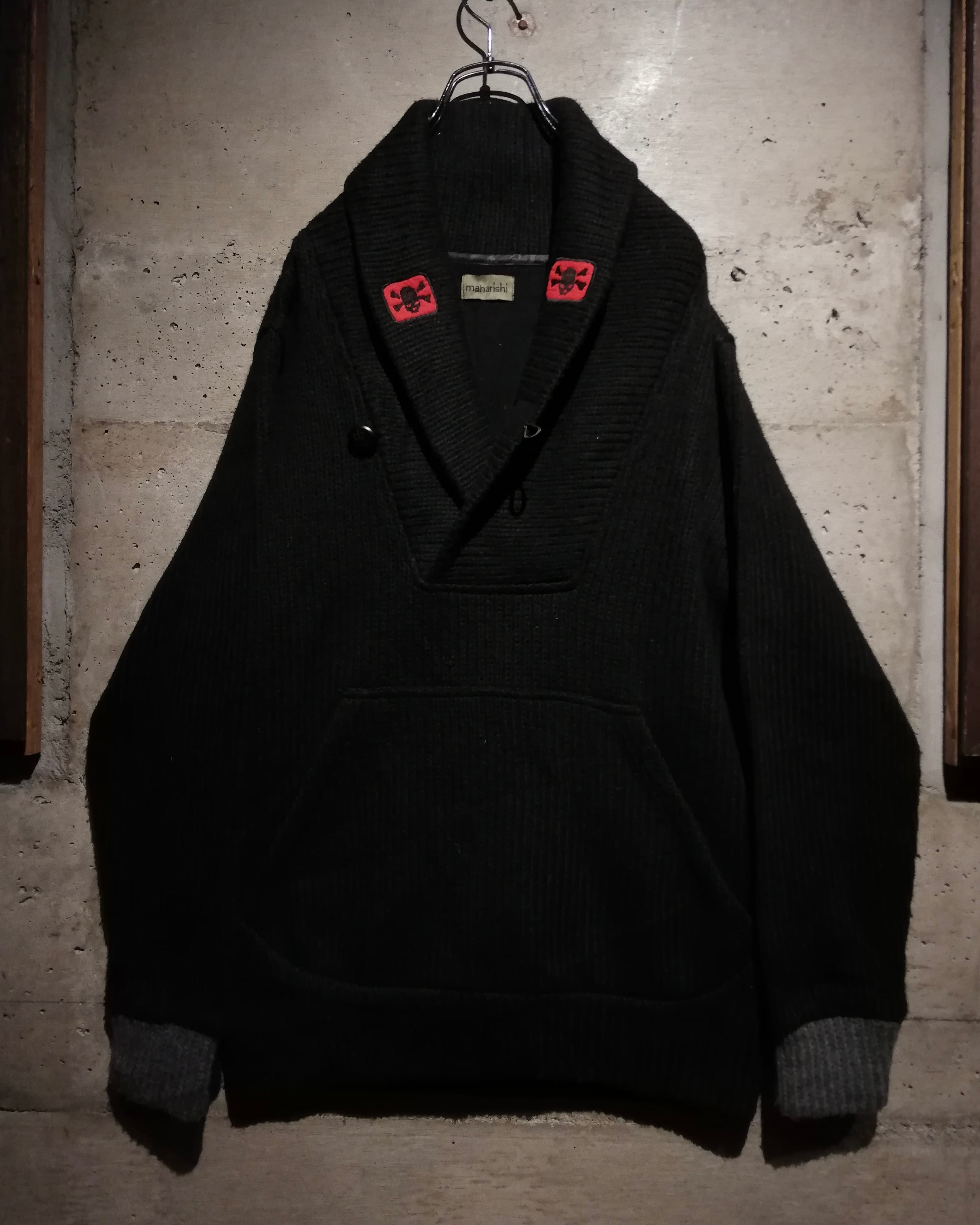 フワッと柔らかいブラックのニットをボディに用い、襟にスカルの刺繍を施した、当ブランドらしいストリート感を見せるショールカラーニット。