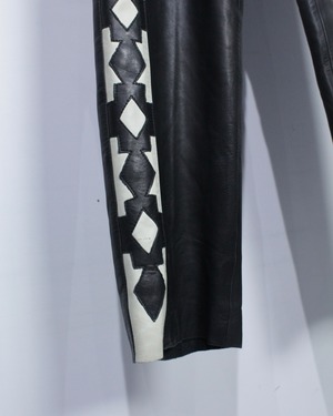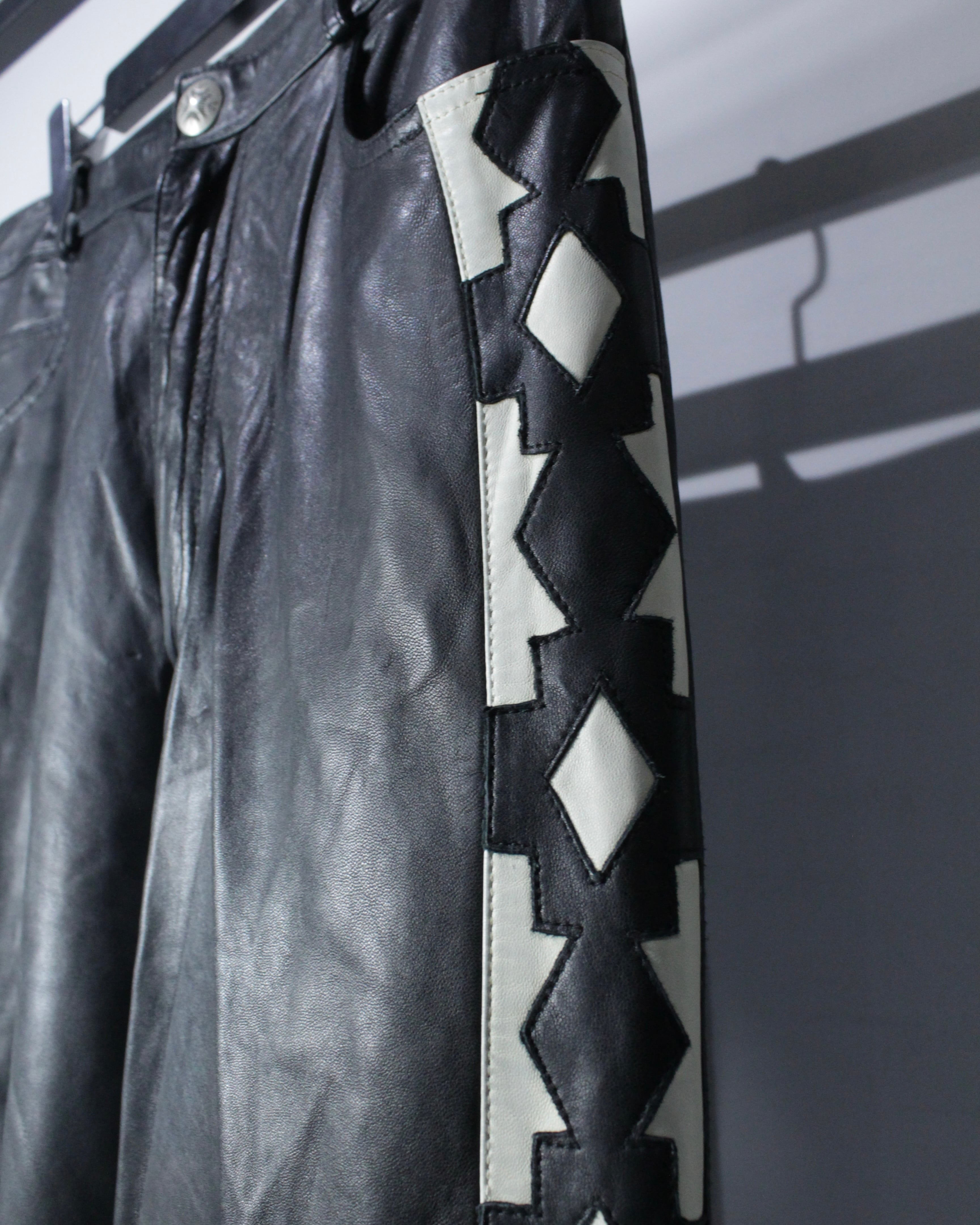 両サイドにはコントラストの効いたレザー切り替えを配置し、幾何学的なパターンを描くデザインが強いアクセントに。ウエストのメタルボタンやステッチワークなど、細部まで抜かりない作りが全体の完成度を底上げしています。