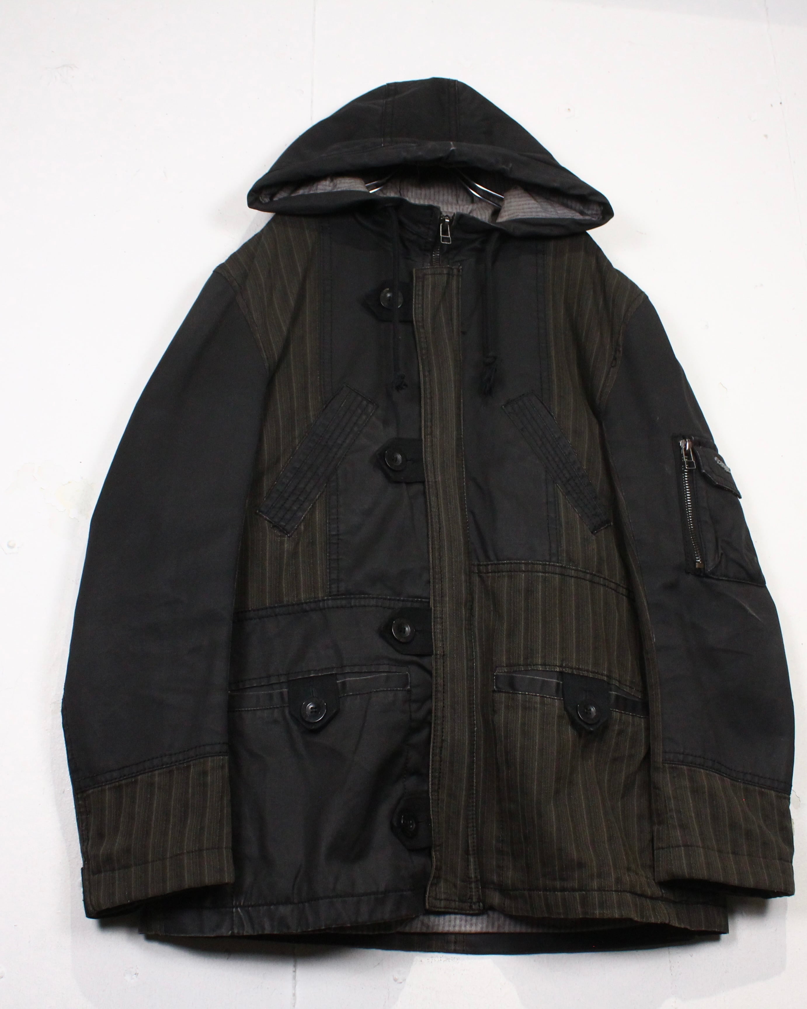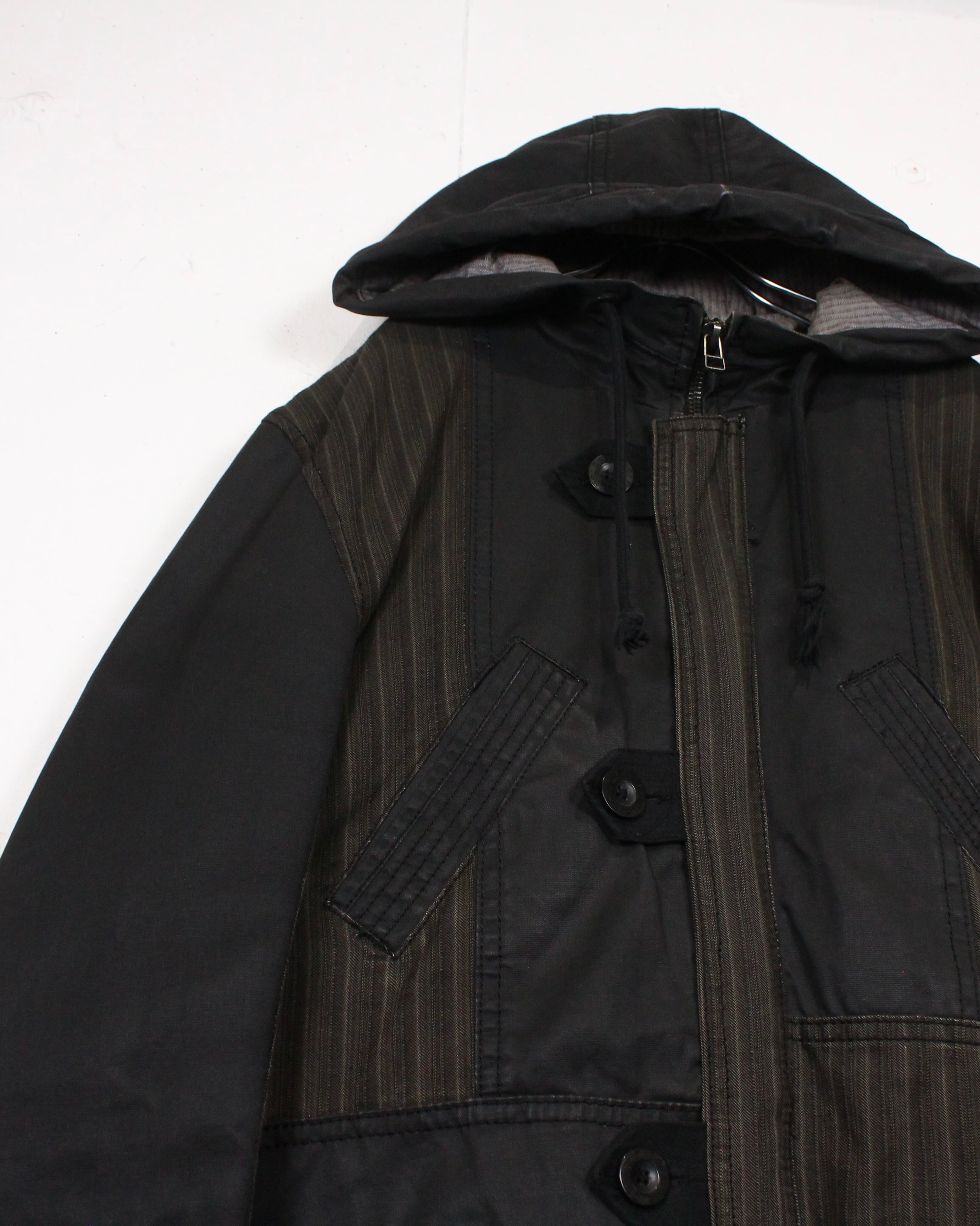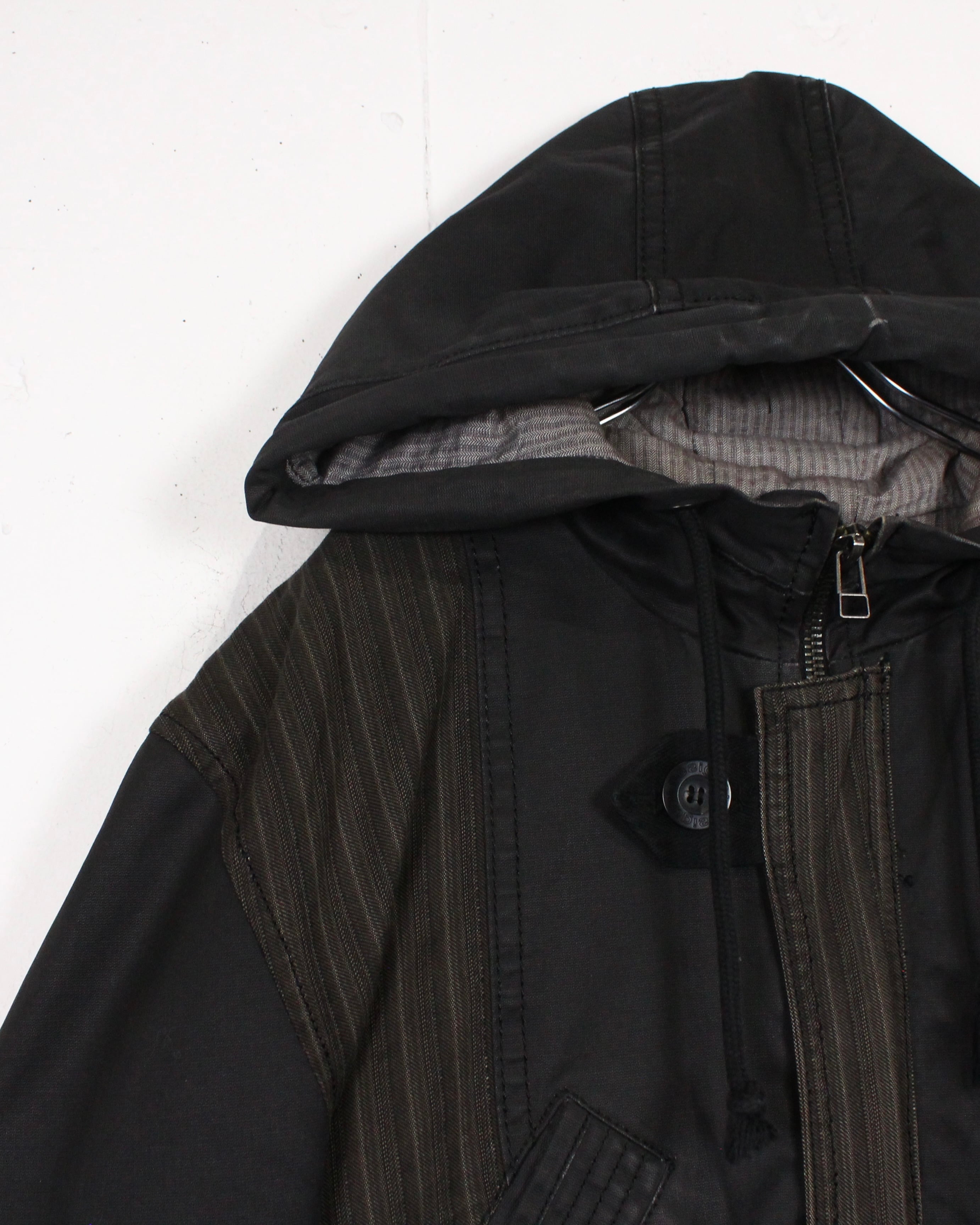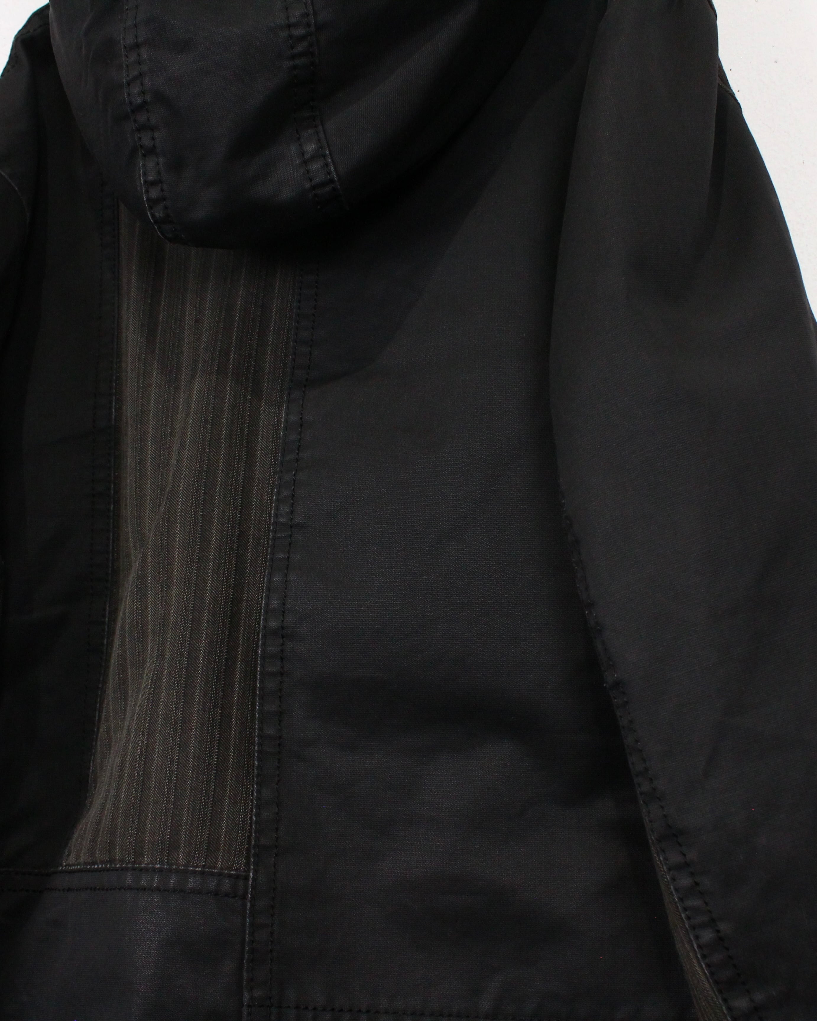 ストライプ、プレーンな生地を切り替えたボディに、フロントにはスラッシュポケット、アームにはユーティリティポケットのギミックを盛り込んだフーデッドジャケット。