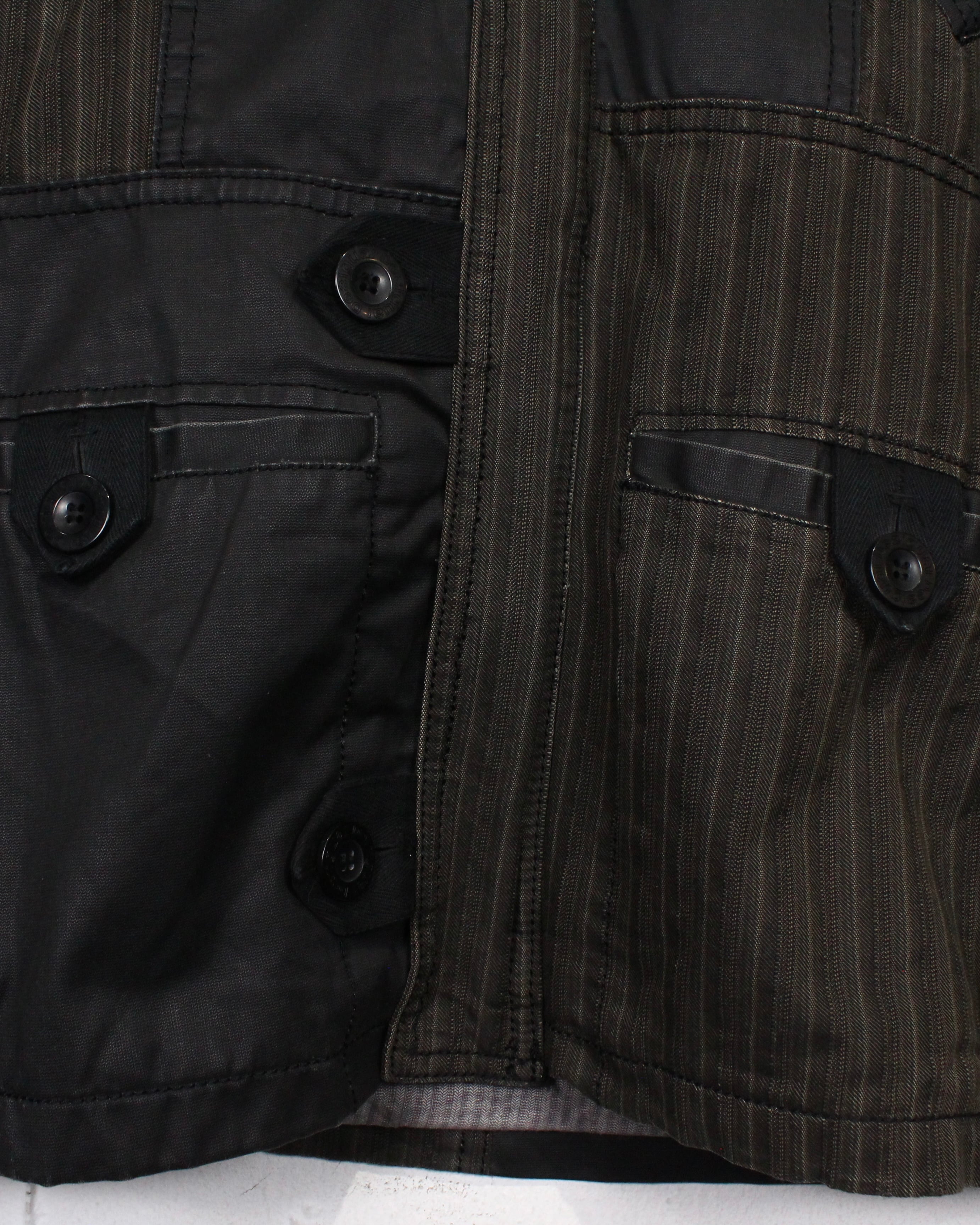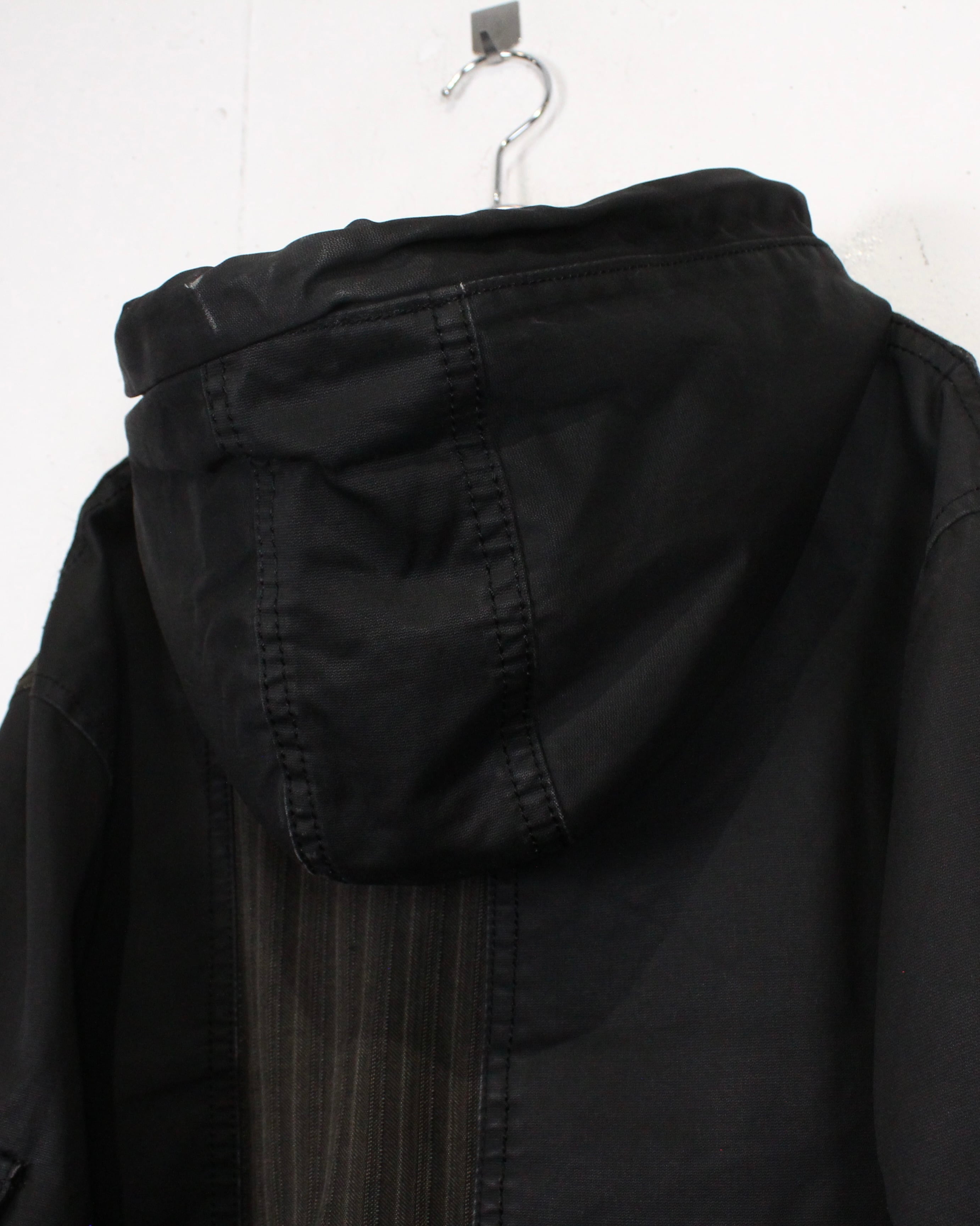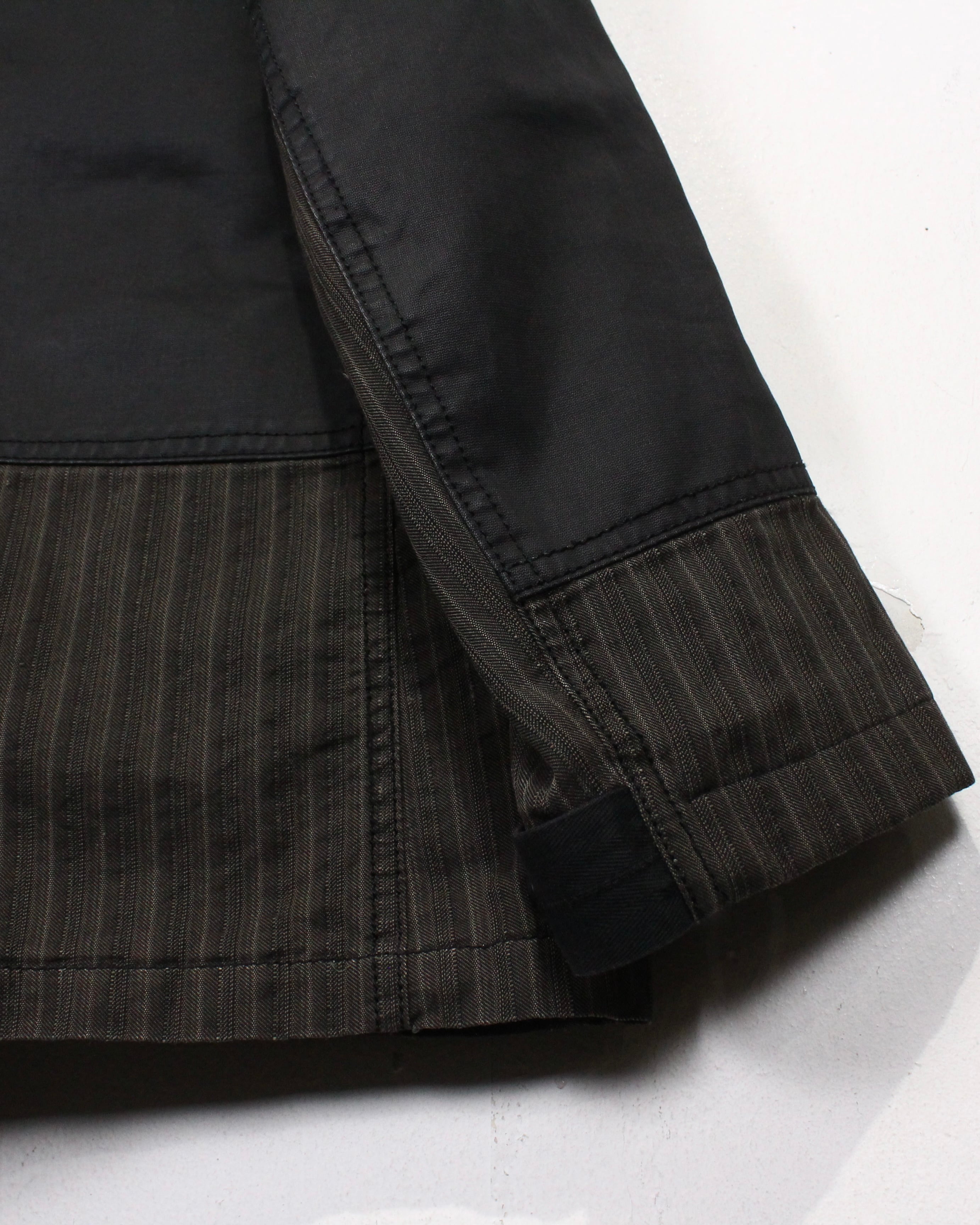 ストライプ、プレーンな生地を切り替えたボディに、フロントにはスラッシュポケット、アームにはユーティリティポケットのギミックを盛り込んだフーデッドジャケット。