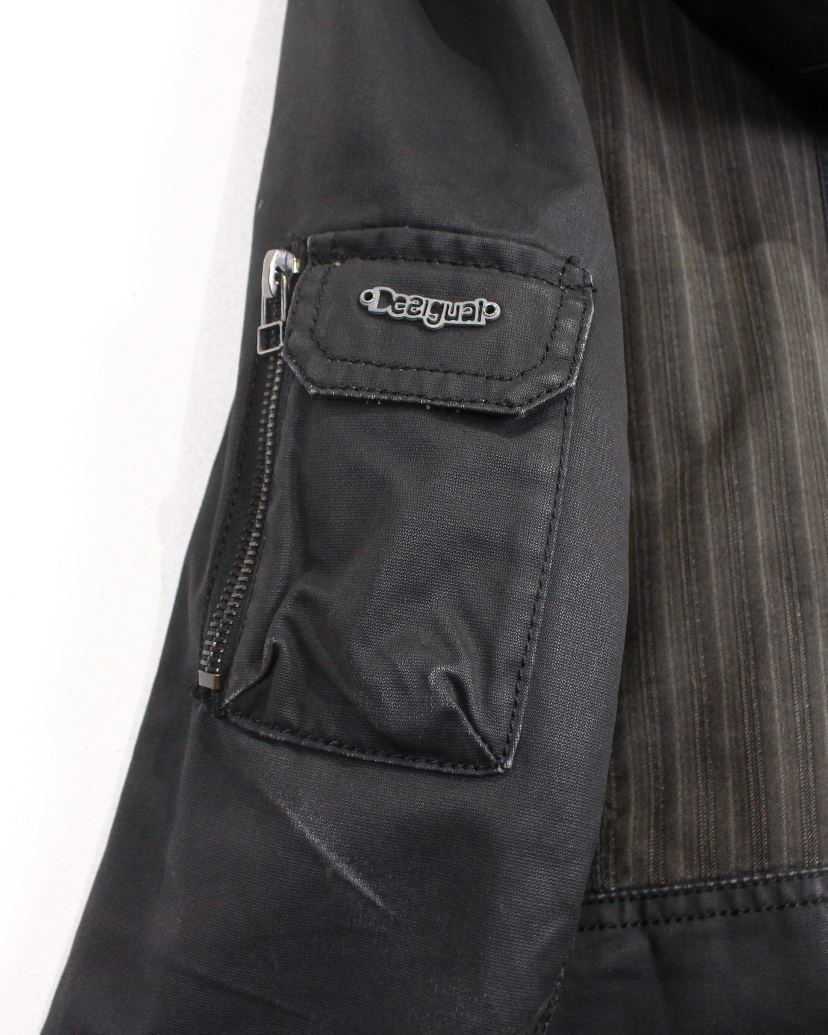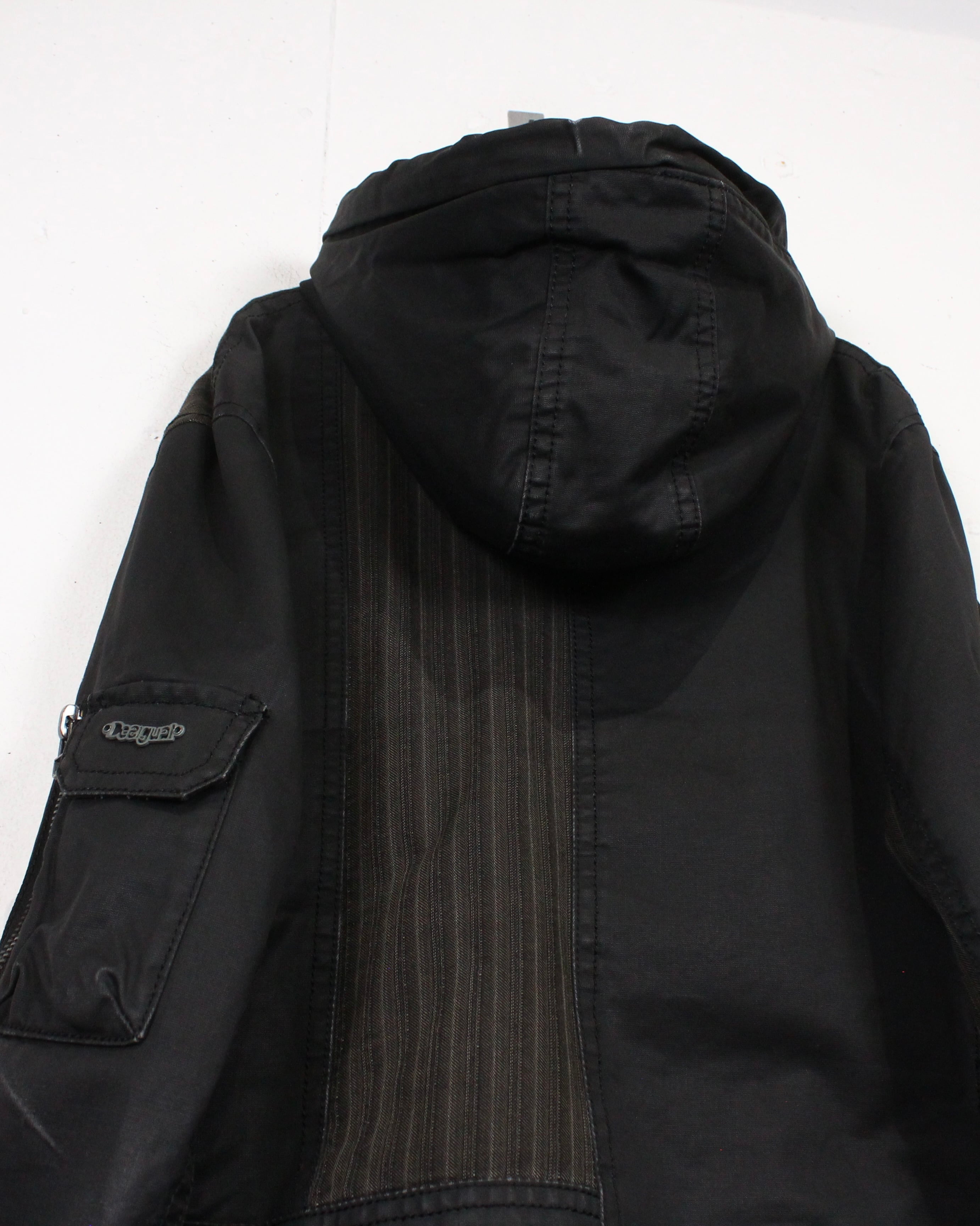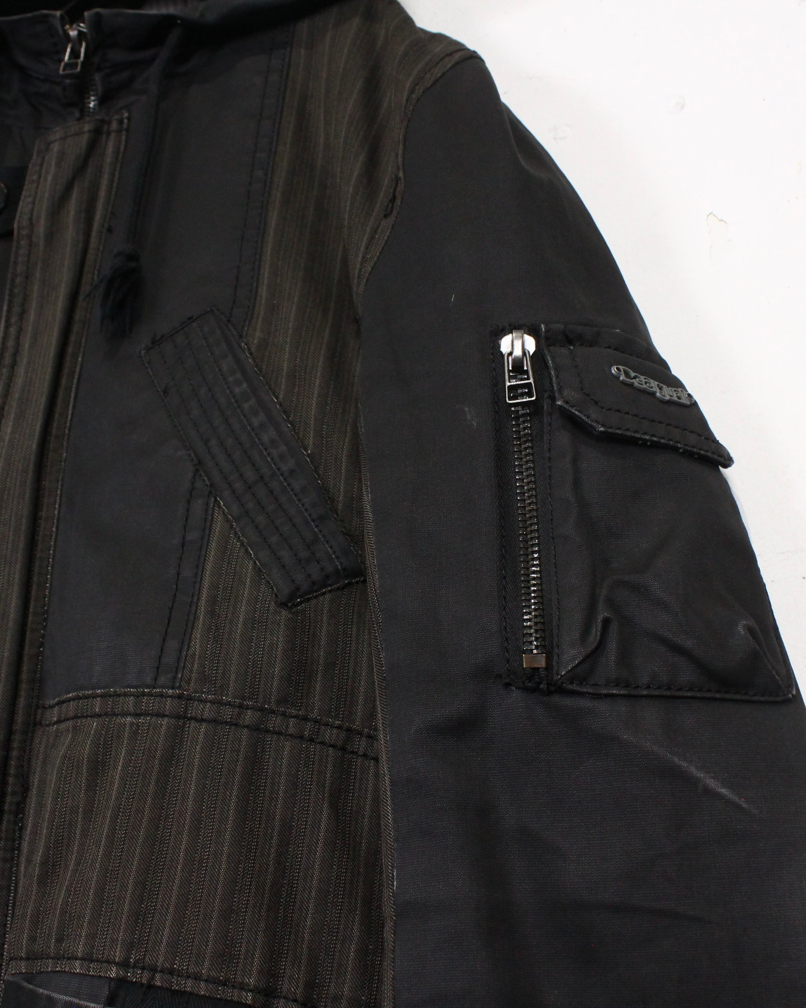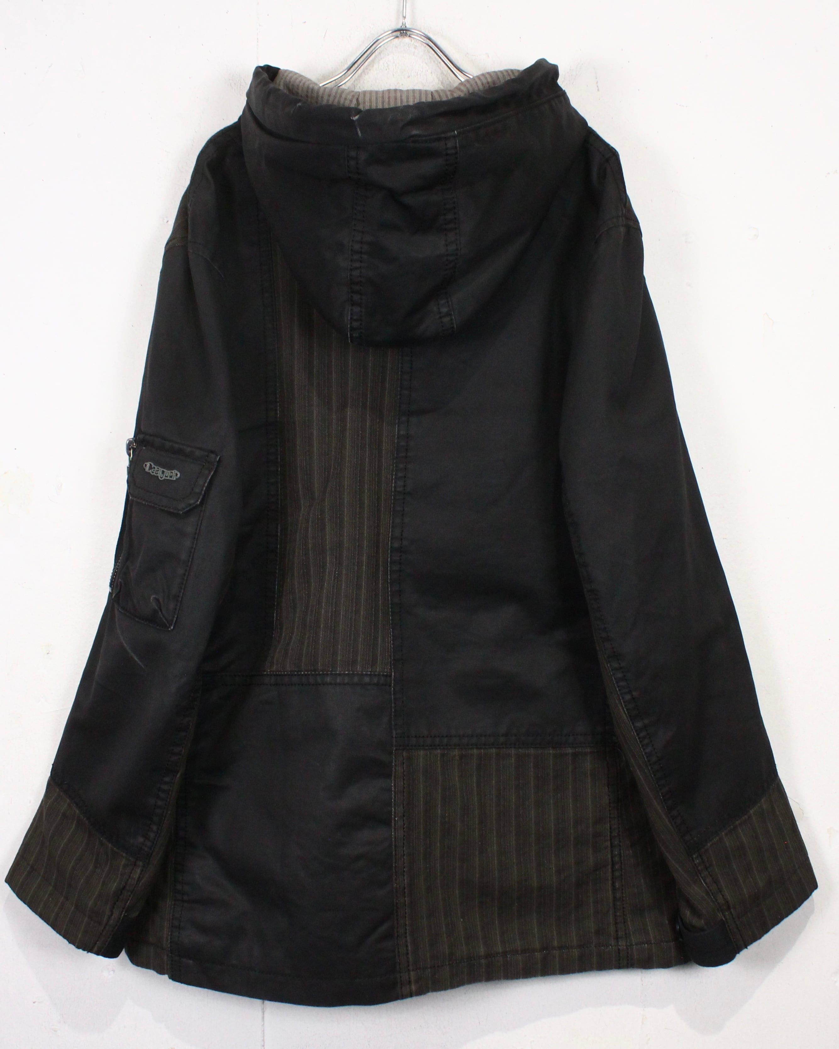 ストライプ、プレーンな生地を切り替えたボディに、フロントにはスラッシュポケット、アームにはユーティリティポケットのギミックを盛り込んだフーデッドジャケット。