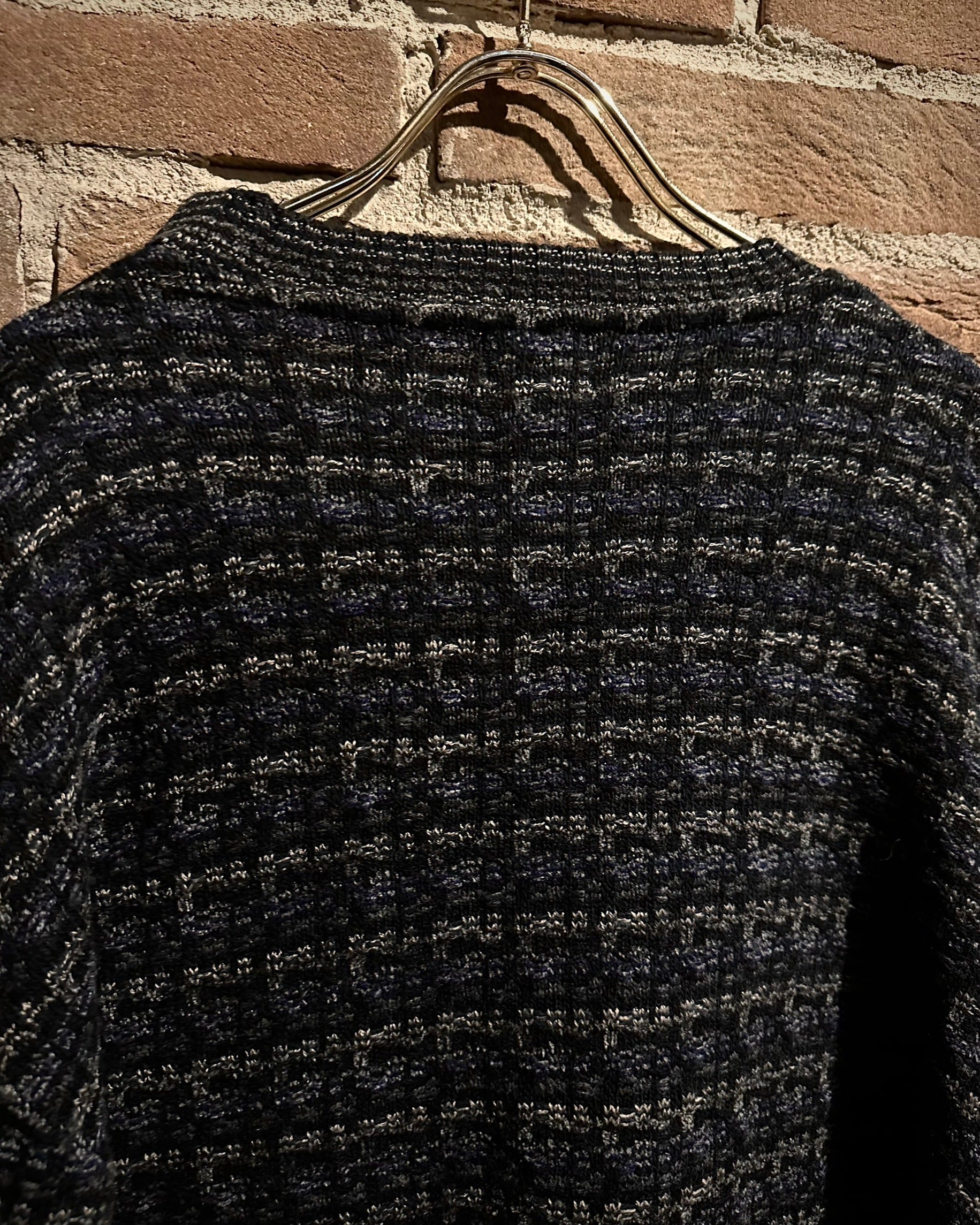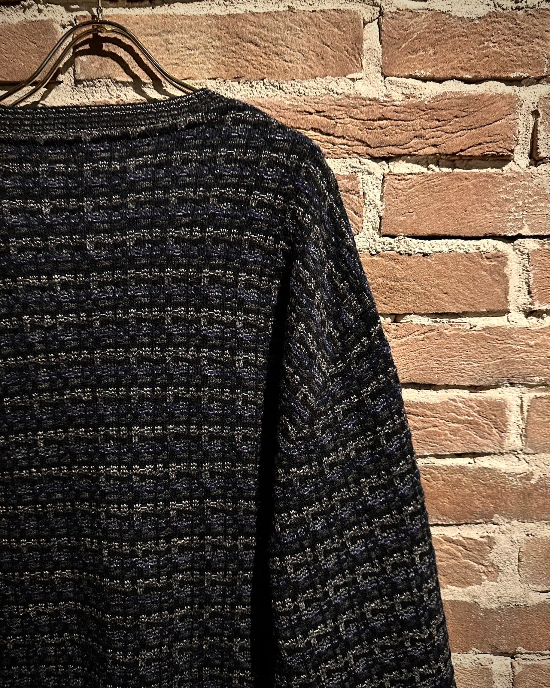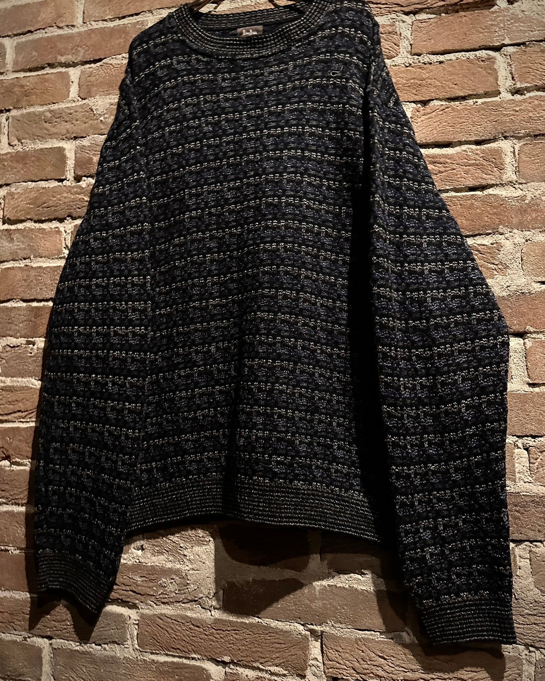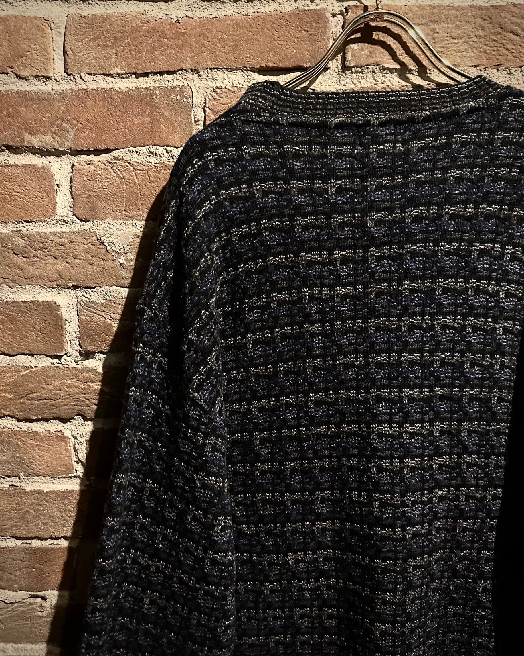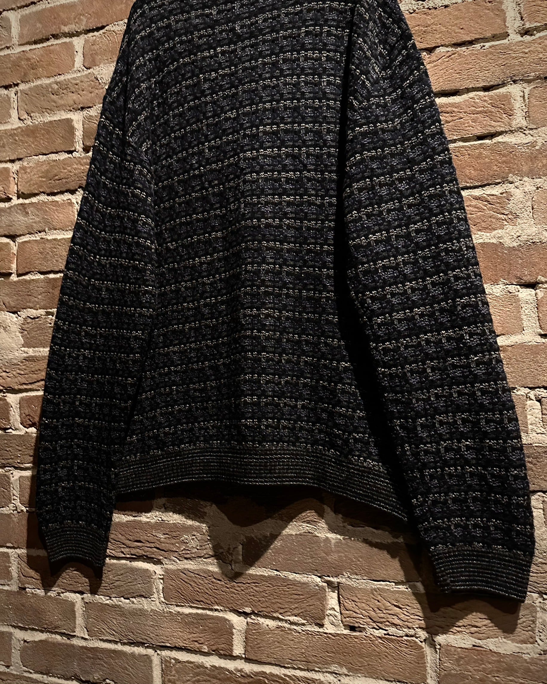ブラックをベースに、グレーやネイビーが混ざり合うミックス調の編み柄で、シンプルながら奥行きのある佇まいに。素材、編み地ともに非常に丁寧な仕上がりで、さすがのクオリティを感じさせます。