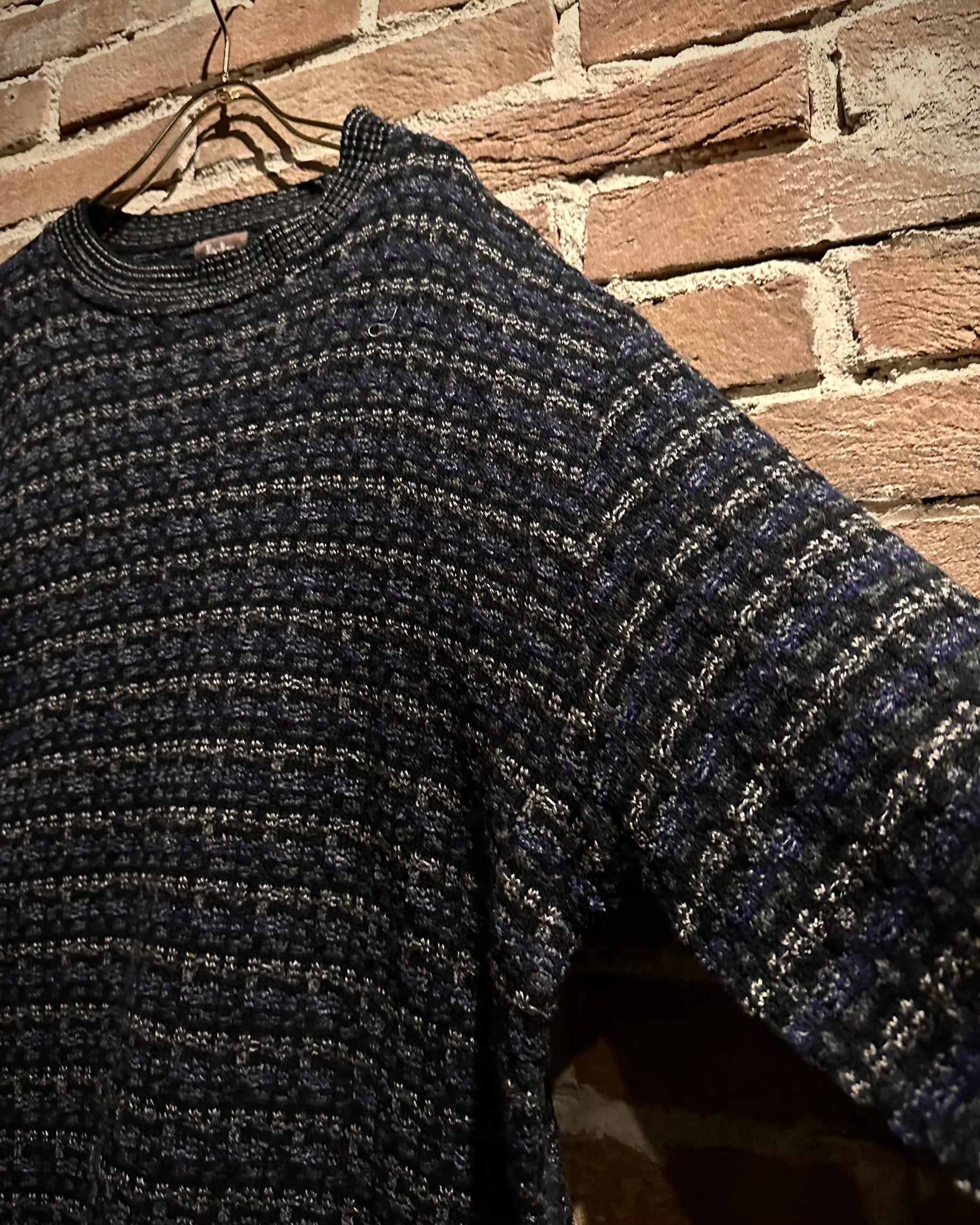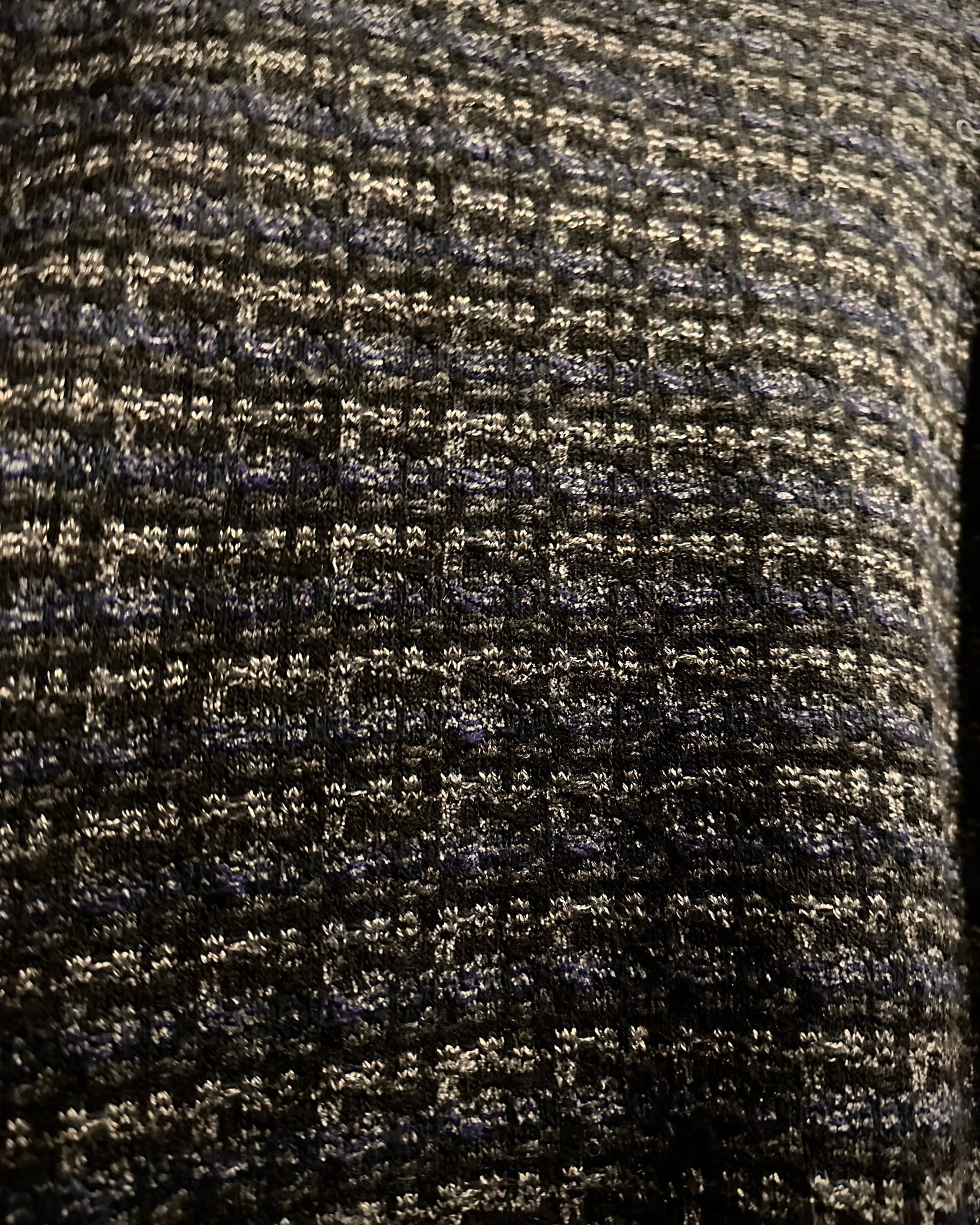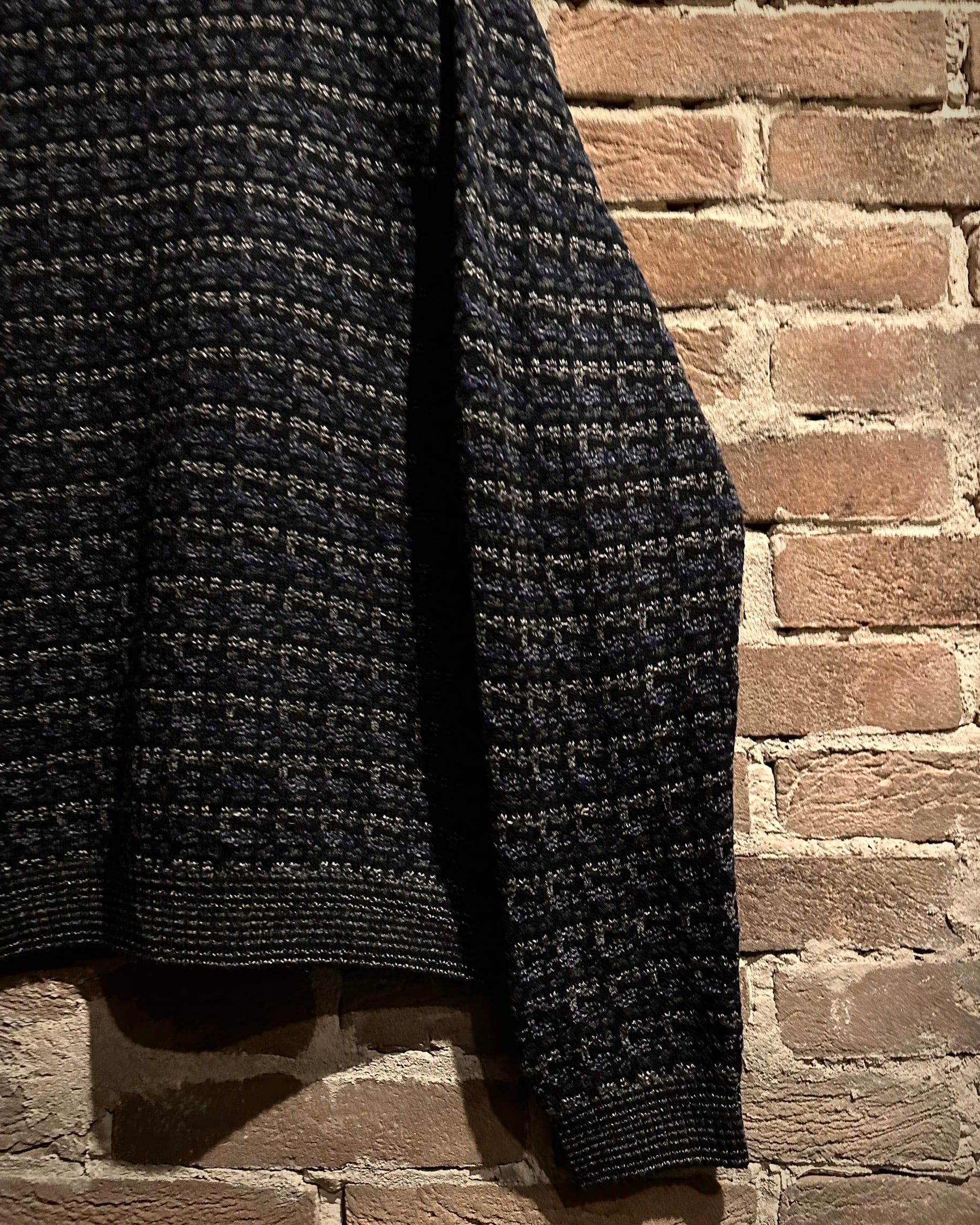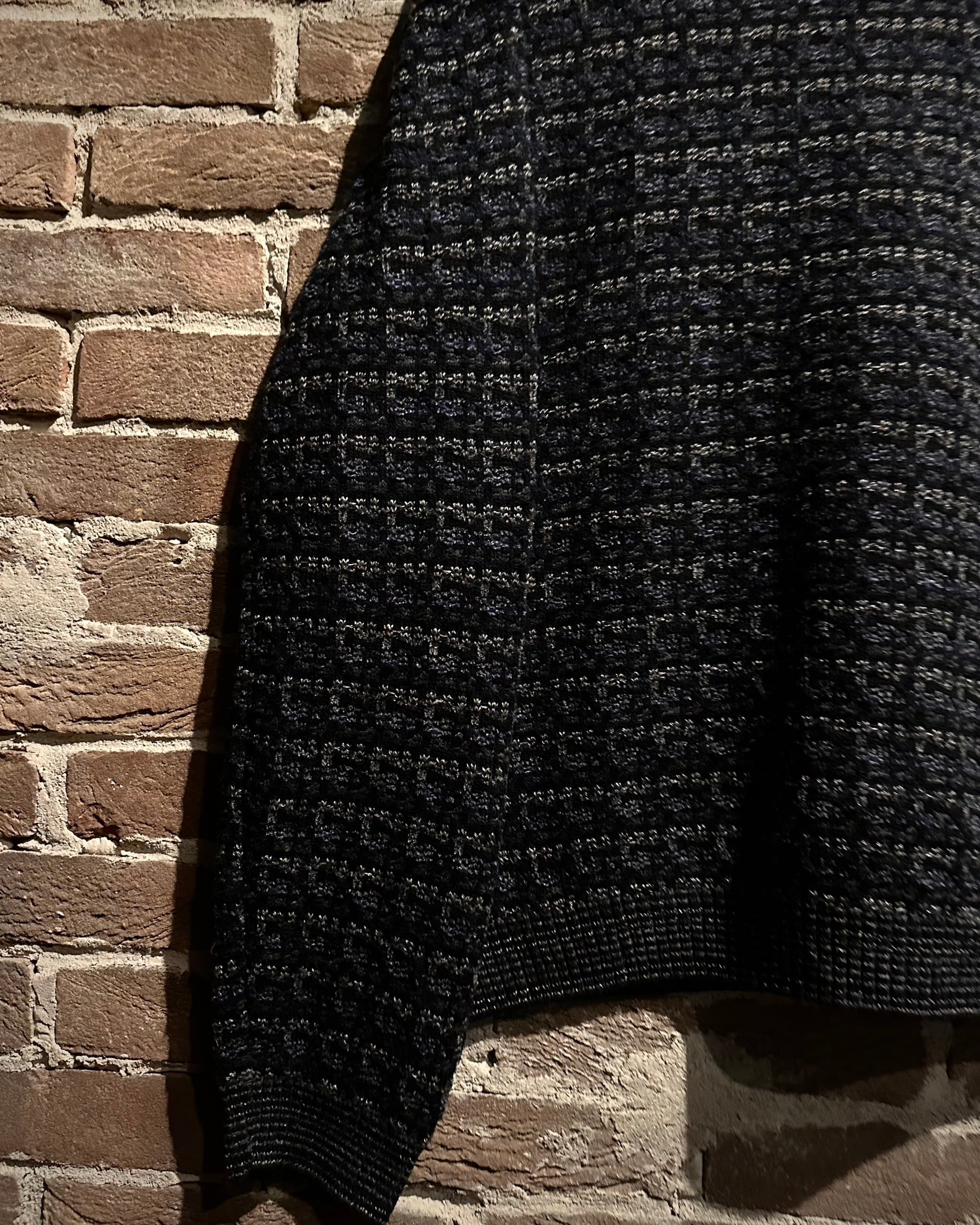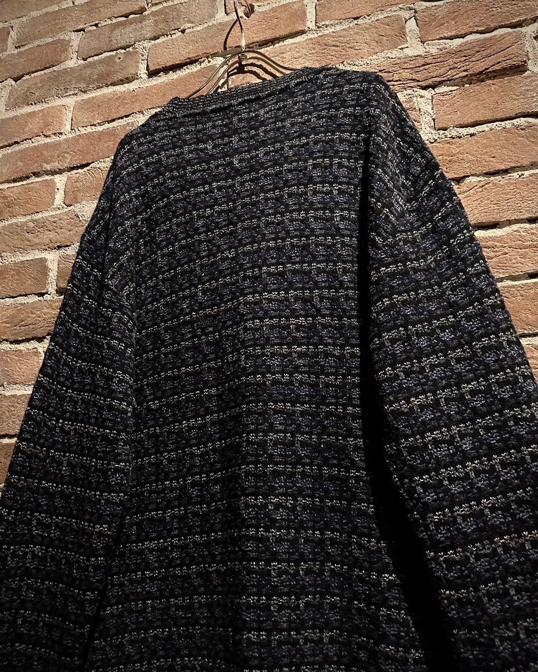 ブラックをベースに、グレーやネイビーが混ざり合うミックス調の編み柄で、シンプルながら奥行きのある佇まいに。素材、編み地ともに非常に丁寧な仕上がりで、さすがのクオリティを感じさせます。