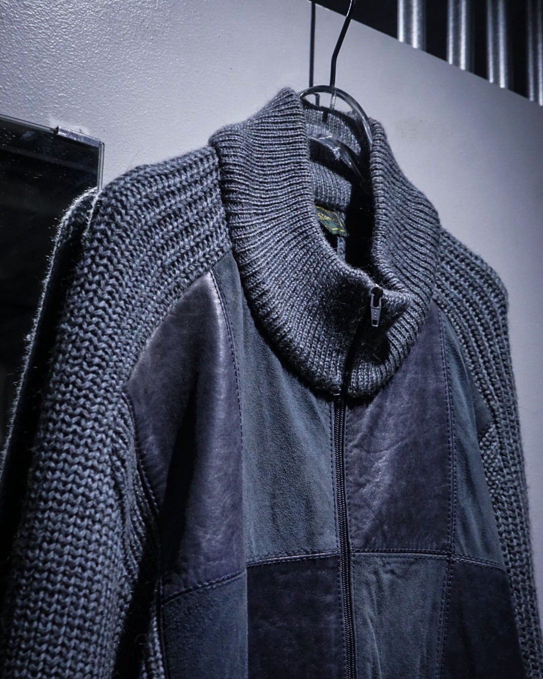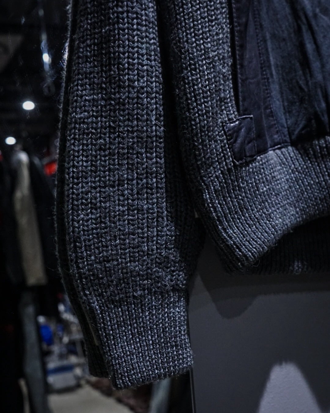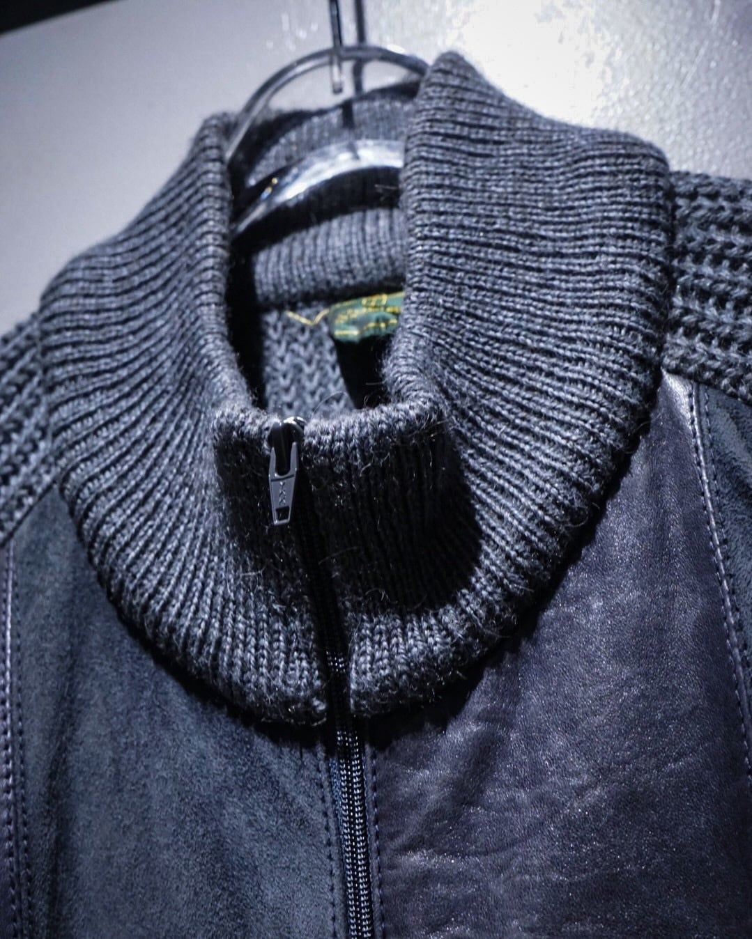 肉感のあるグレーのニットをボディのベースに、フロントにはモチモチとした極上のラムレザーを切り替えたドライバーズニット。