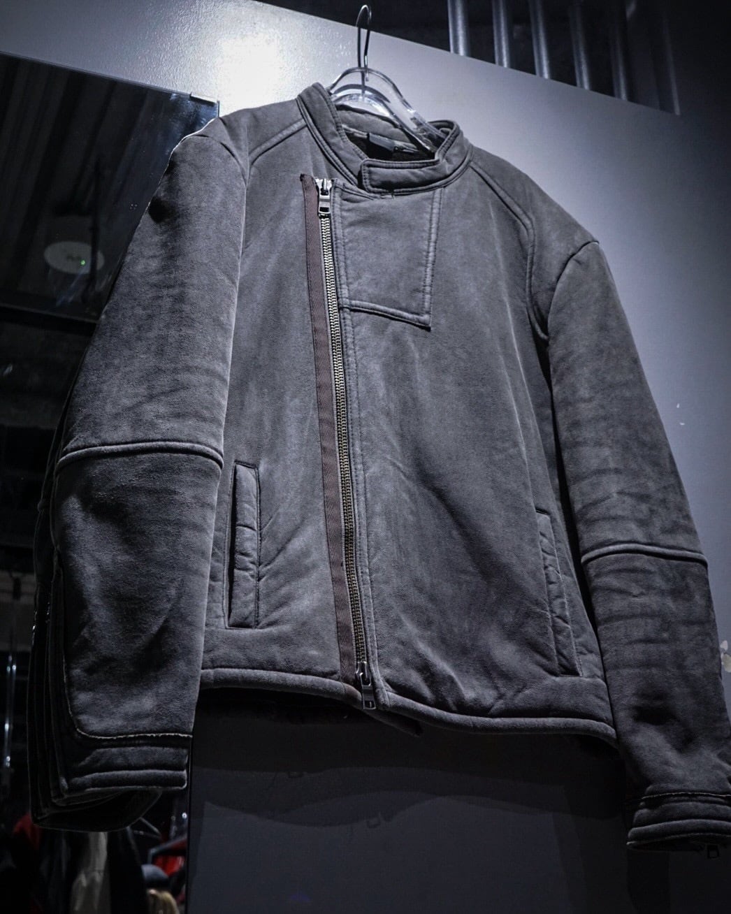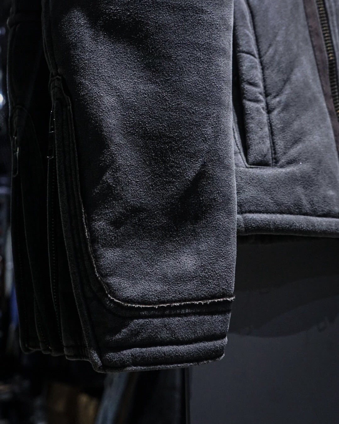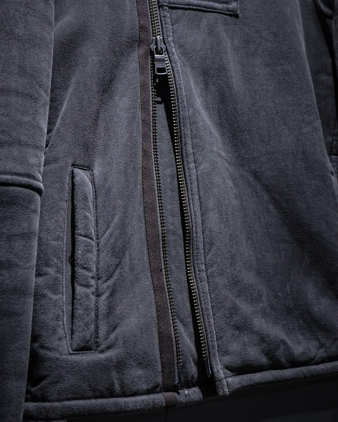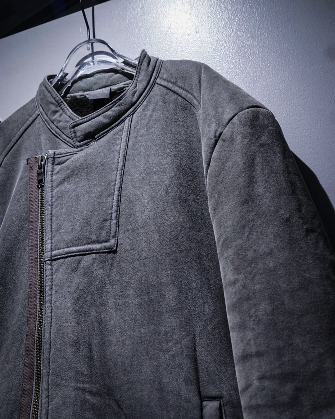 ムートンジャケットでこの型は非常に珍しいですね。フェイクムートンならではのボリューム感とライダースのスタイリッシュな印象が見事に調和。そしてフェードグレーのカラーリングと、エッジの効いた切り替えによる立体的なルックスも素晴らしい、、、
