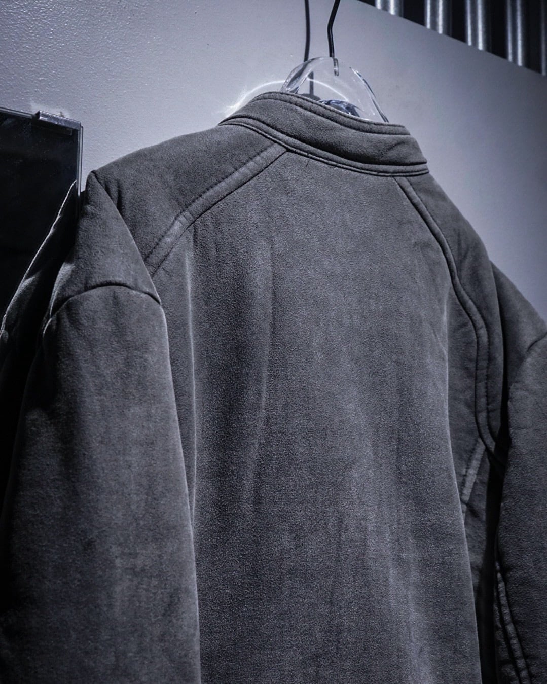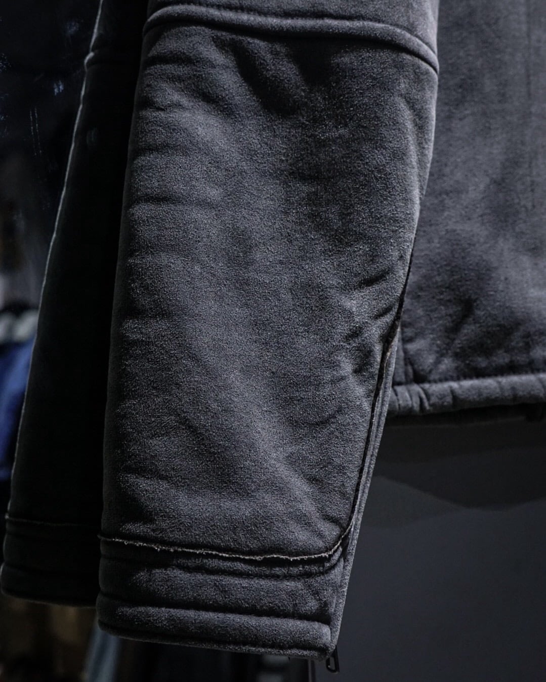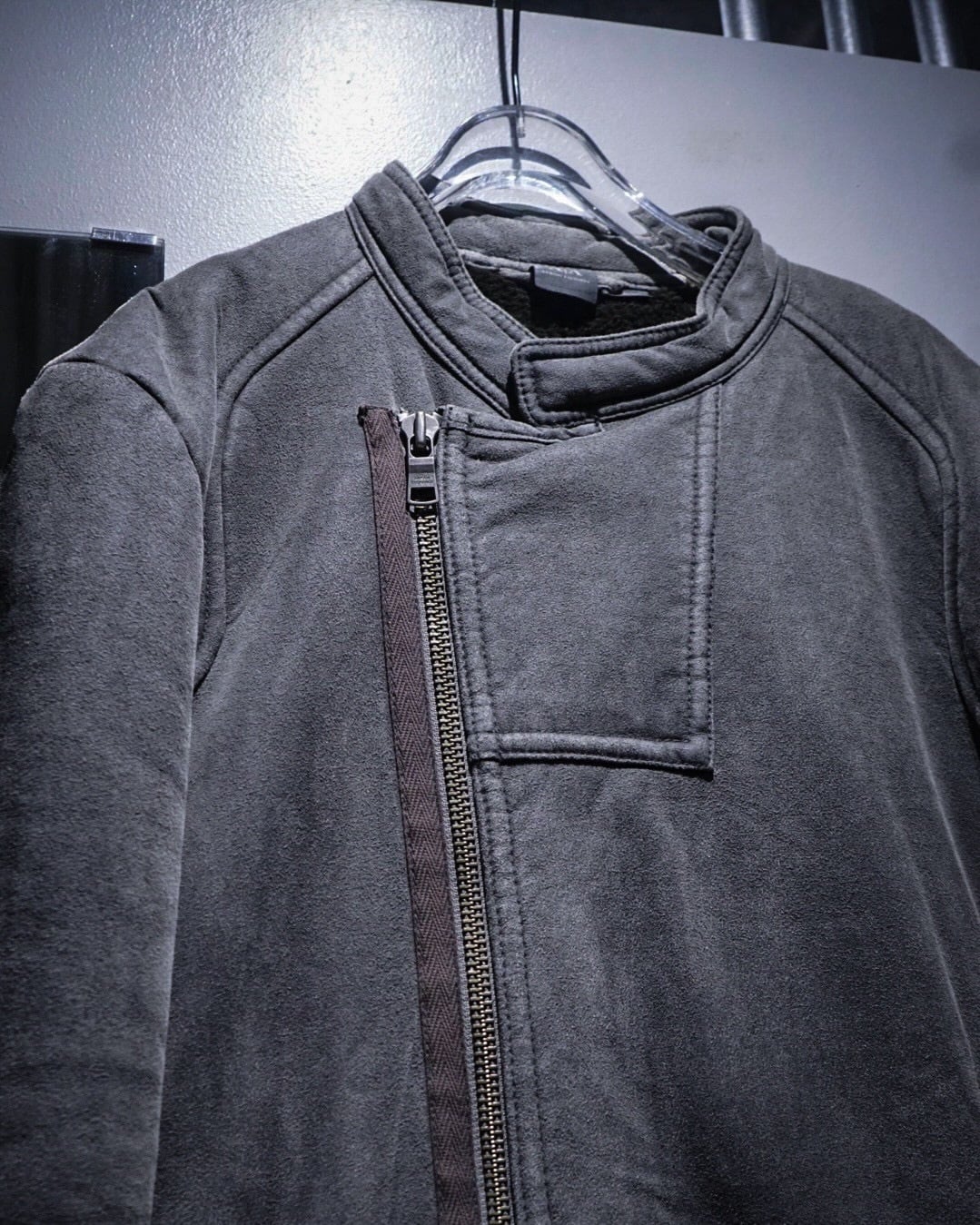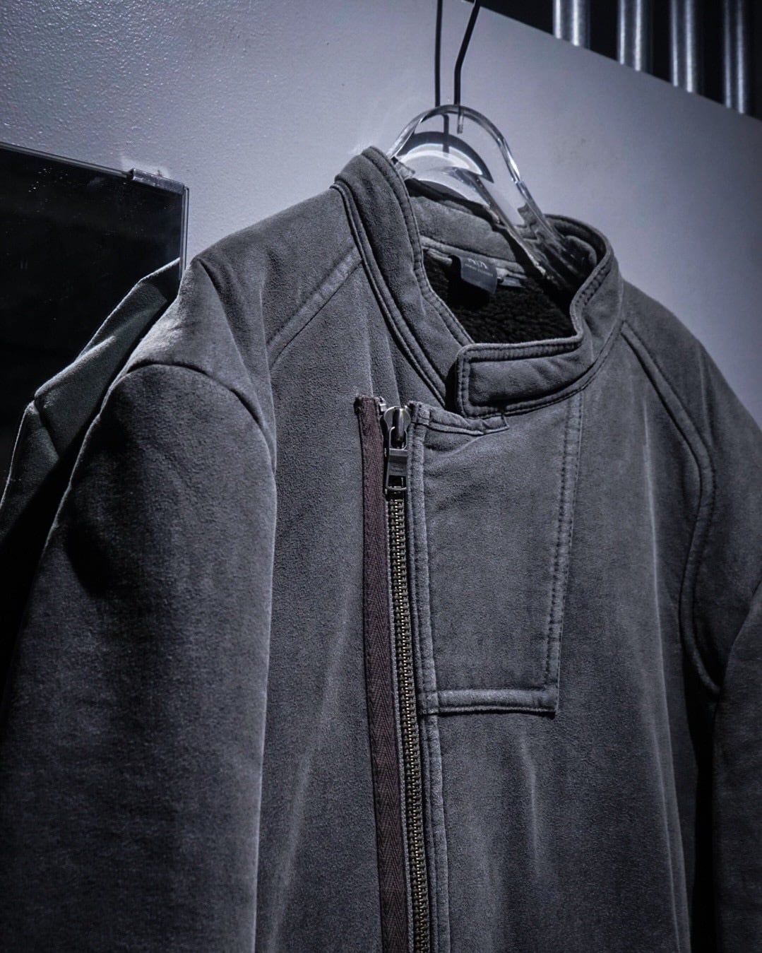 ムートンジャケットでこの型は非常に珍しいですね。フェイクムートンならではのボリューム感とライダースのスタイリッシュな印象が見事に調和。そしてフェードグレーのカラーリングと、エッジの効いた切り替えによる立体的なルックスも素晴らしい、、、
