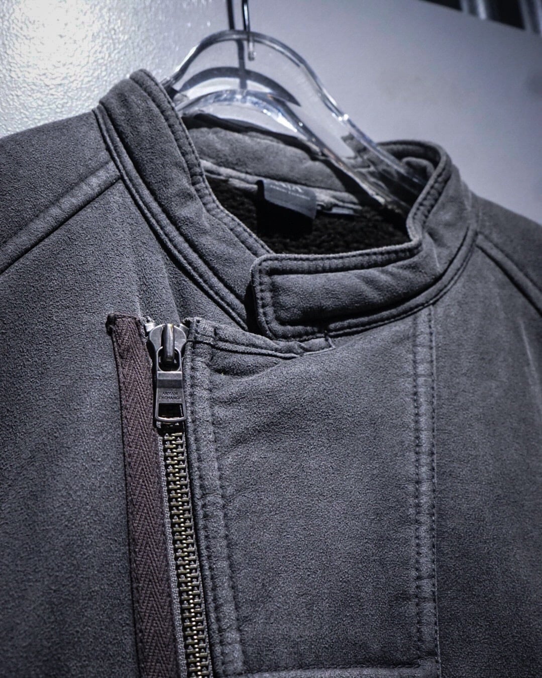 モードな雰囲気漂うデザインに、保温性も抜群。"ARMANI EXCHANGE"の稀有なライダースタイプのムートンジャケットです。
