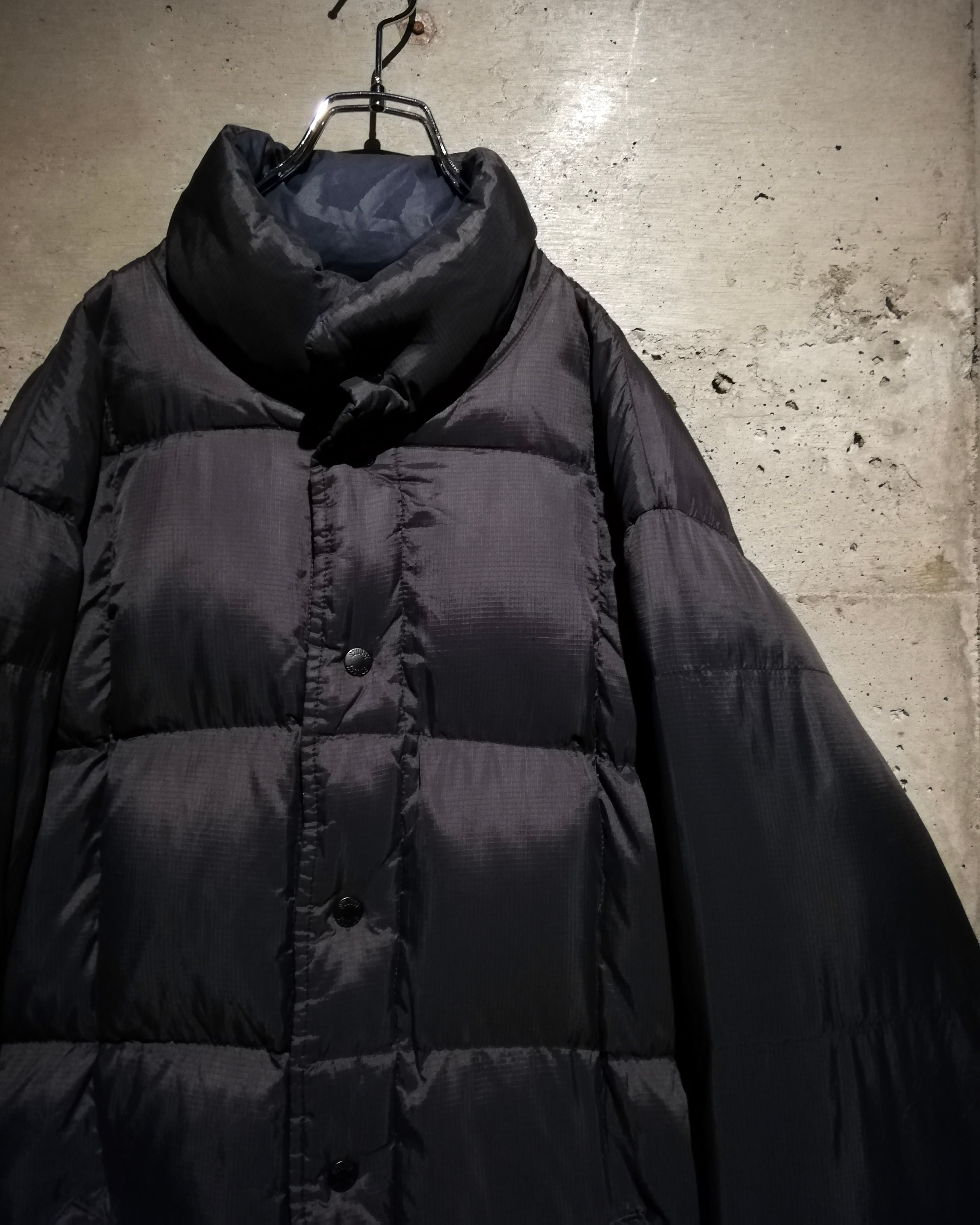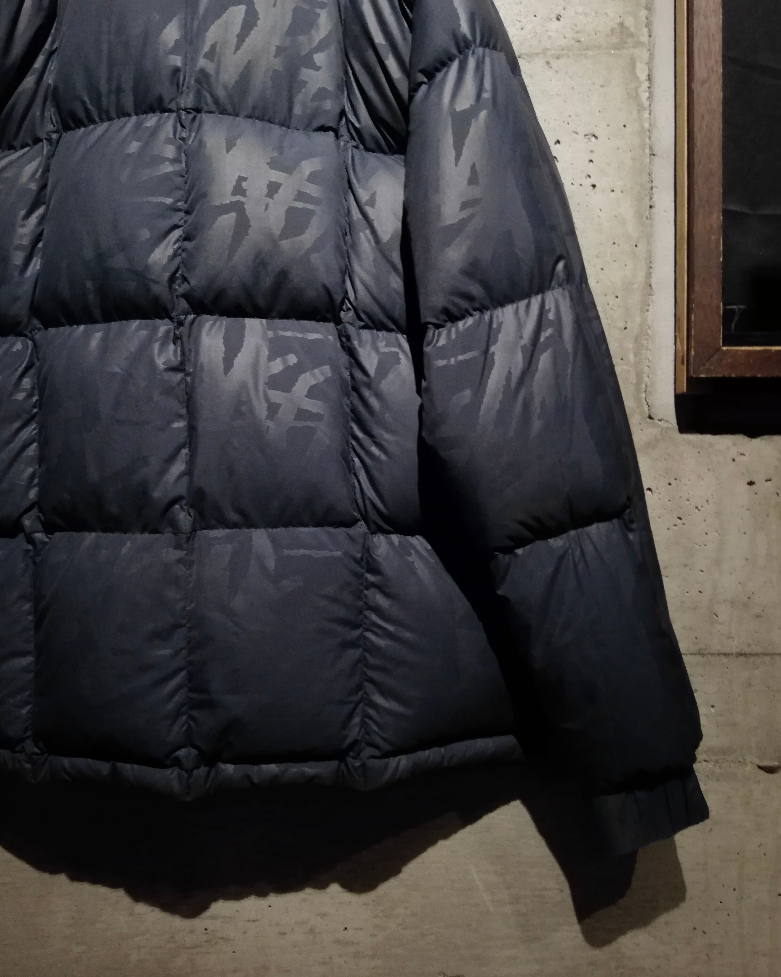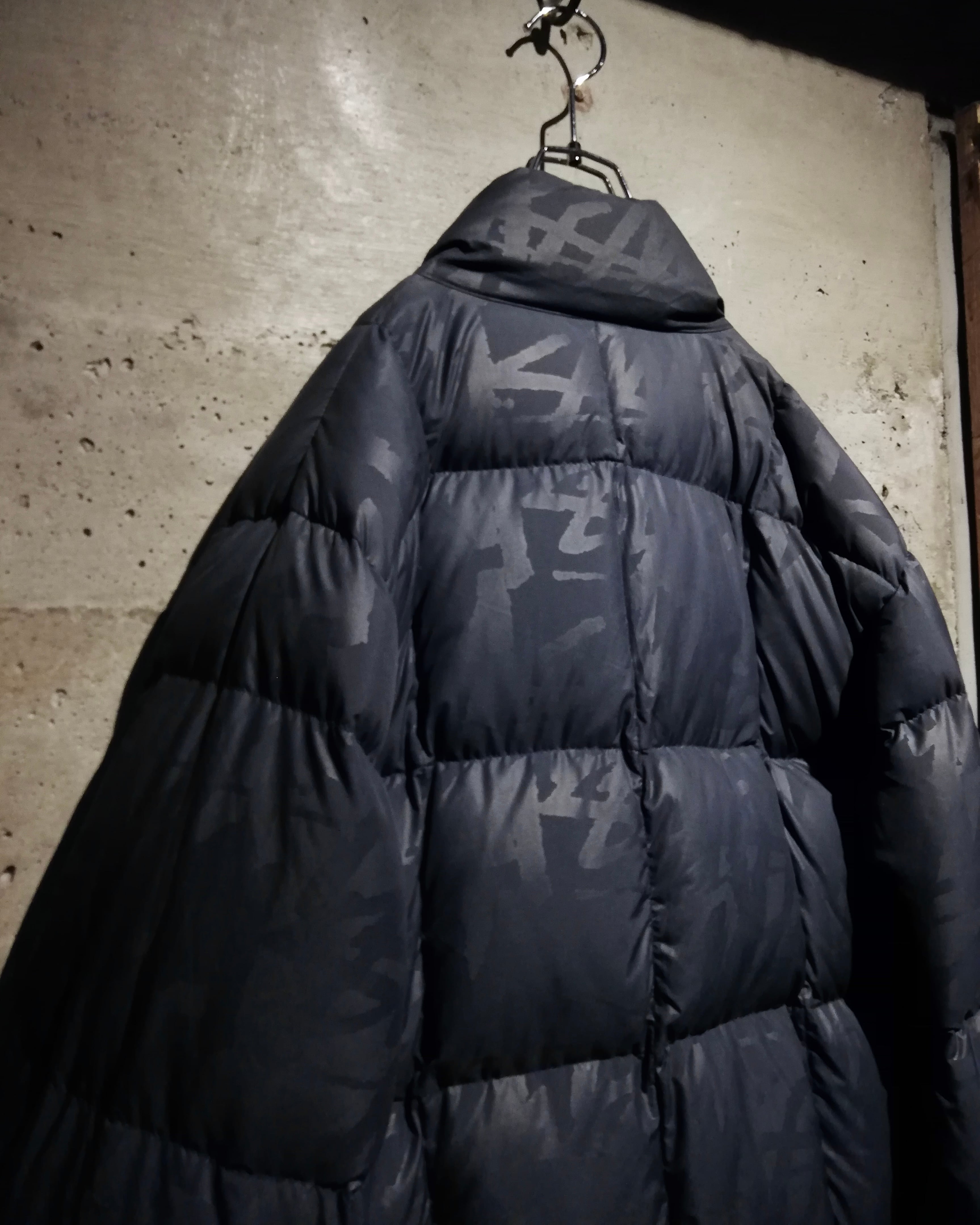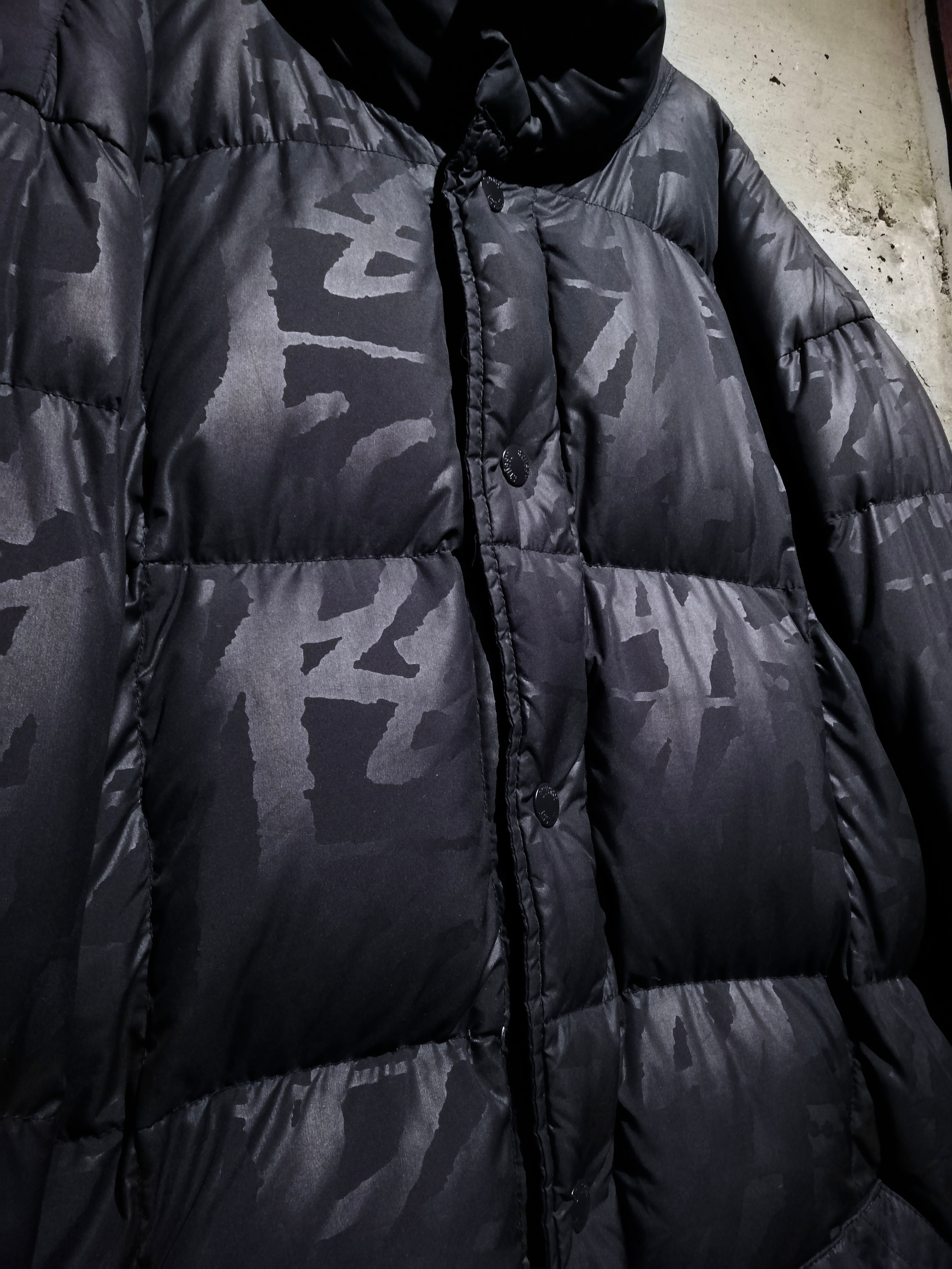 表面はネイビーのボディにブランドロゴを総柄で載せ、ガバッと裏返すとリップストップナイロンを用いたブラックのボディへと変化する、稀有なリバーシブル仕様のダウンジャケット。