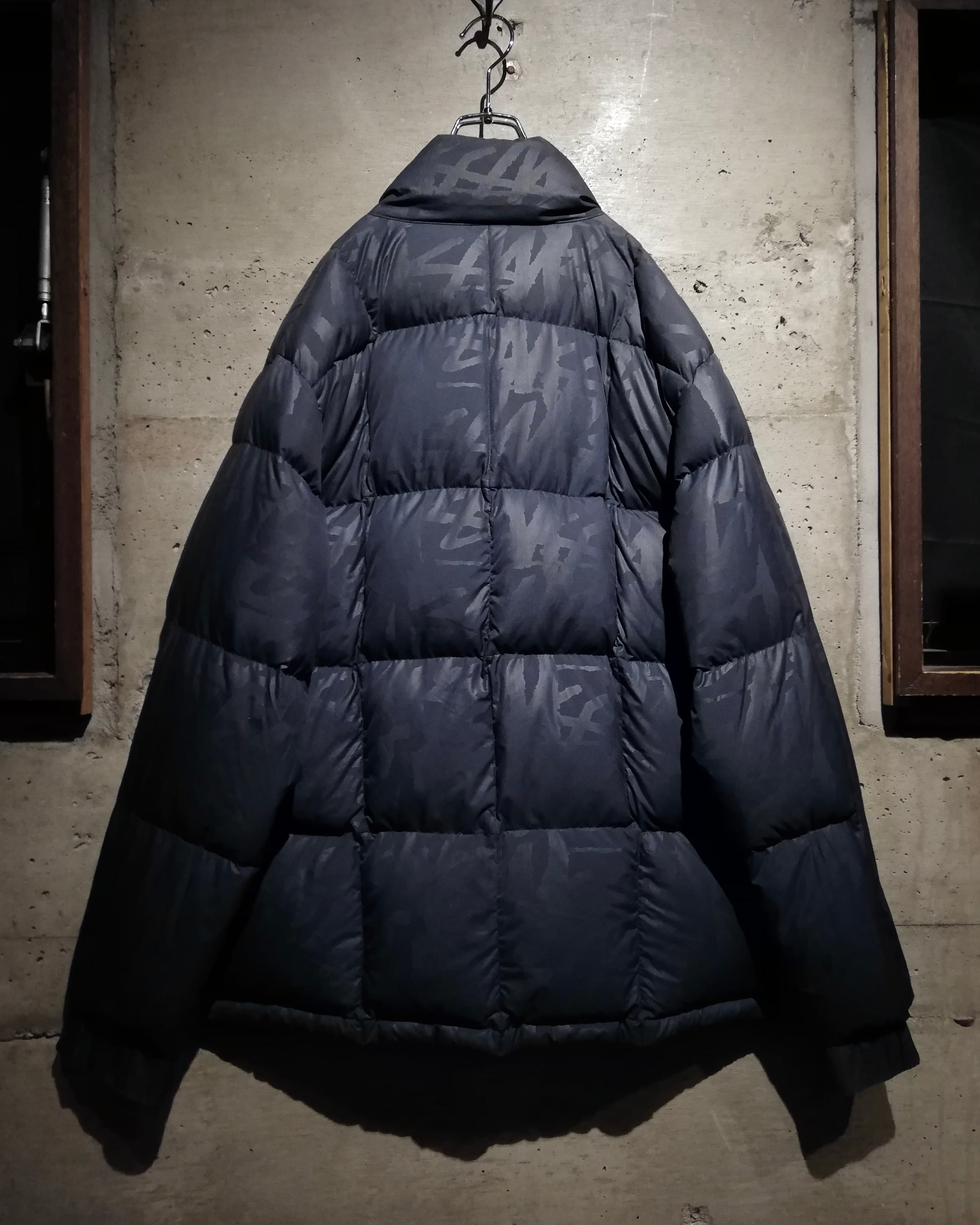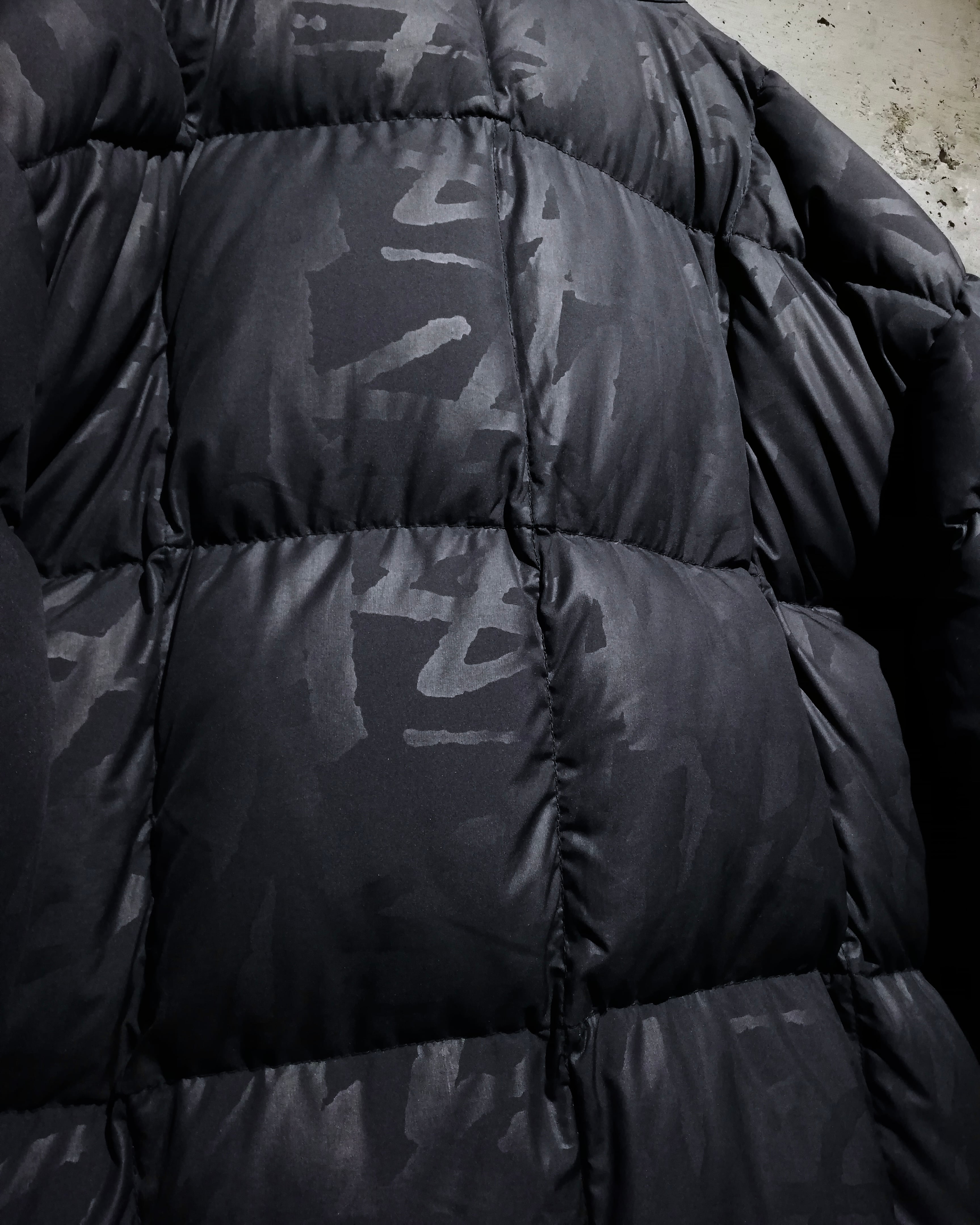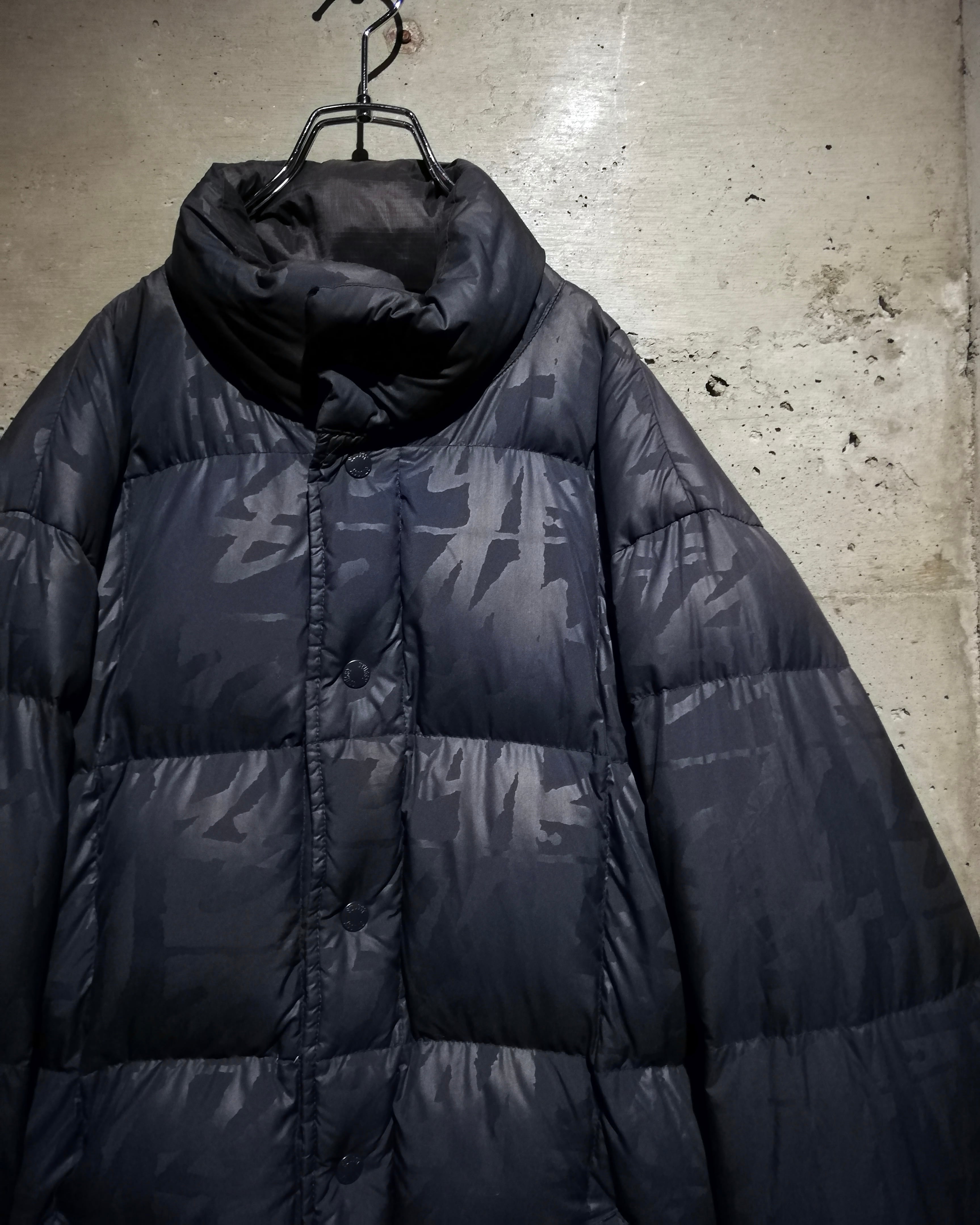 表面はネイビーのボディにブランドロゴを総柄で載せ、ガバッと裏返すとリップストップナイロンを用いたブラックのボディへと変化する、稀有なリバーシブル仕様のダウンジャケット。