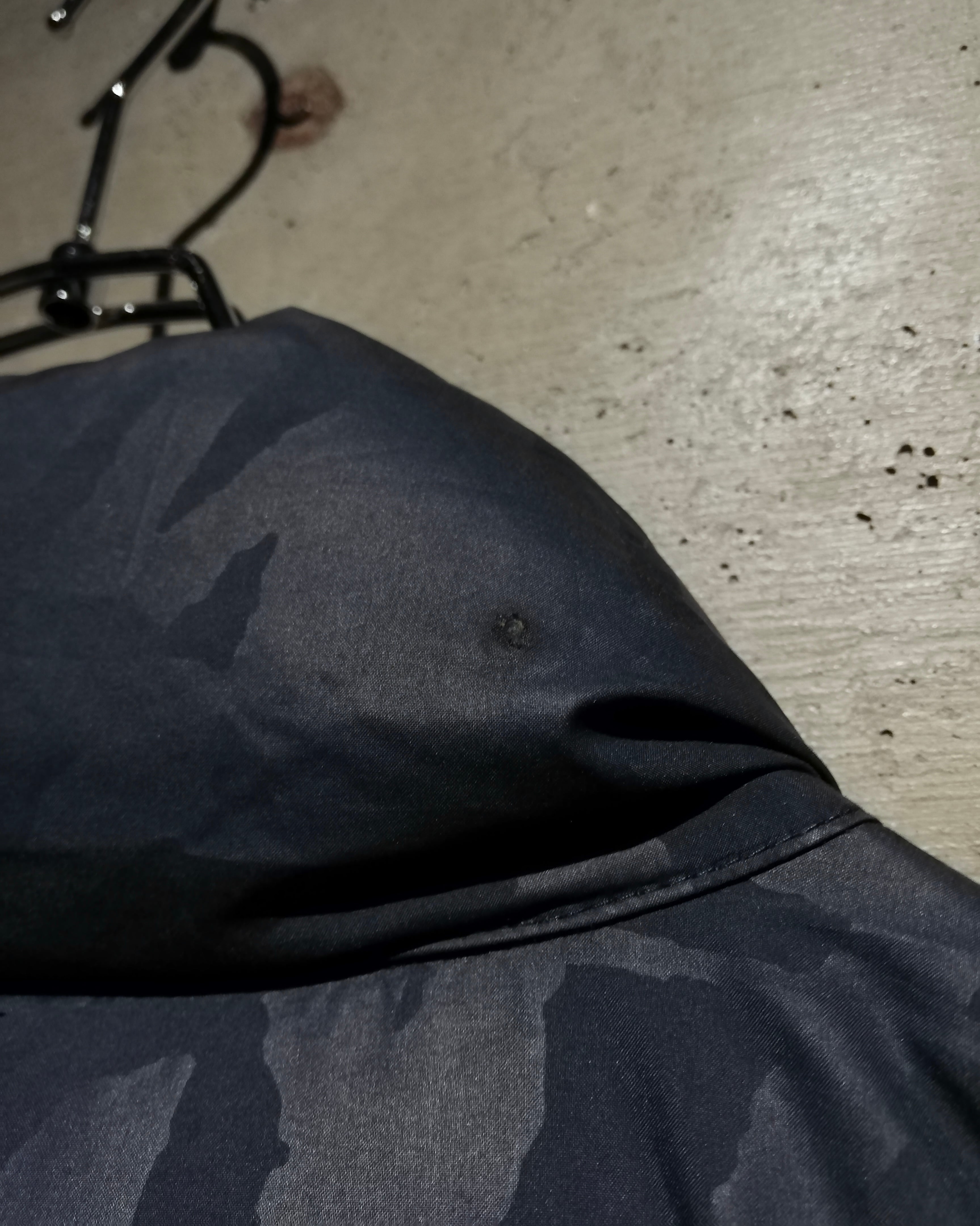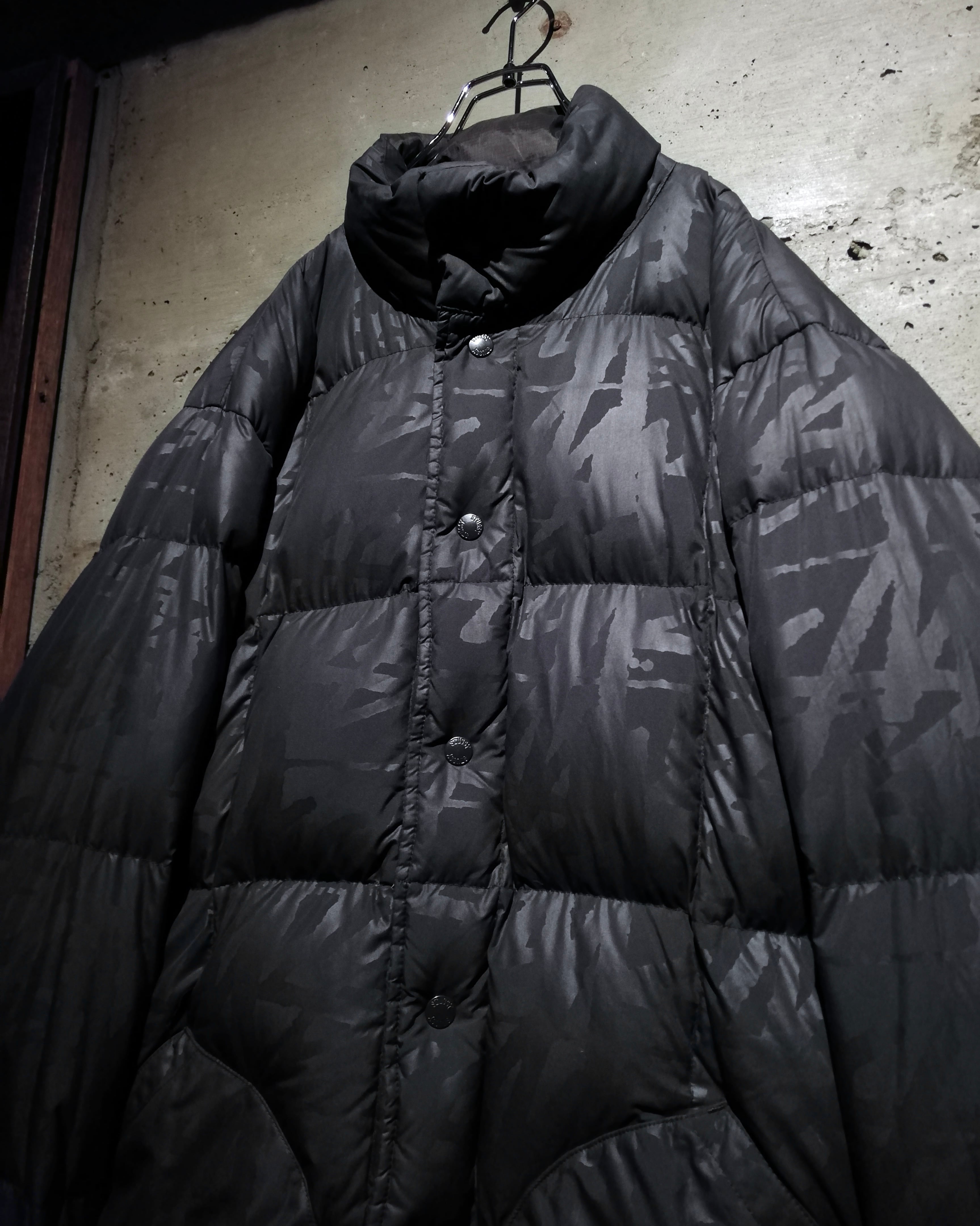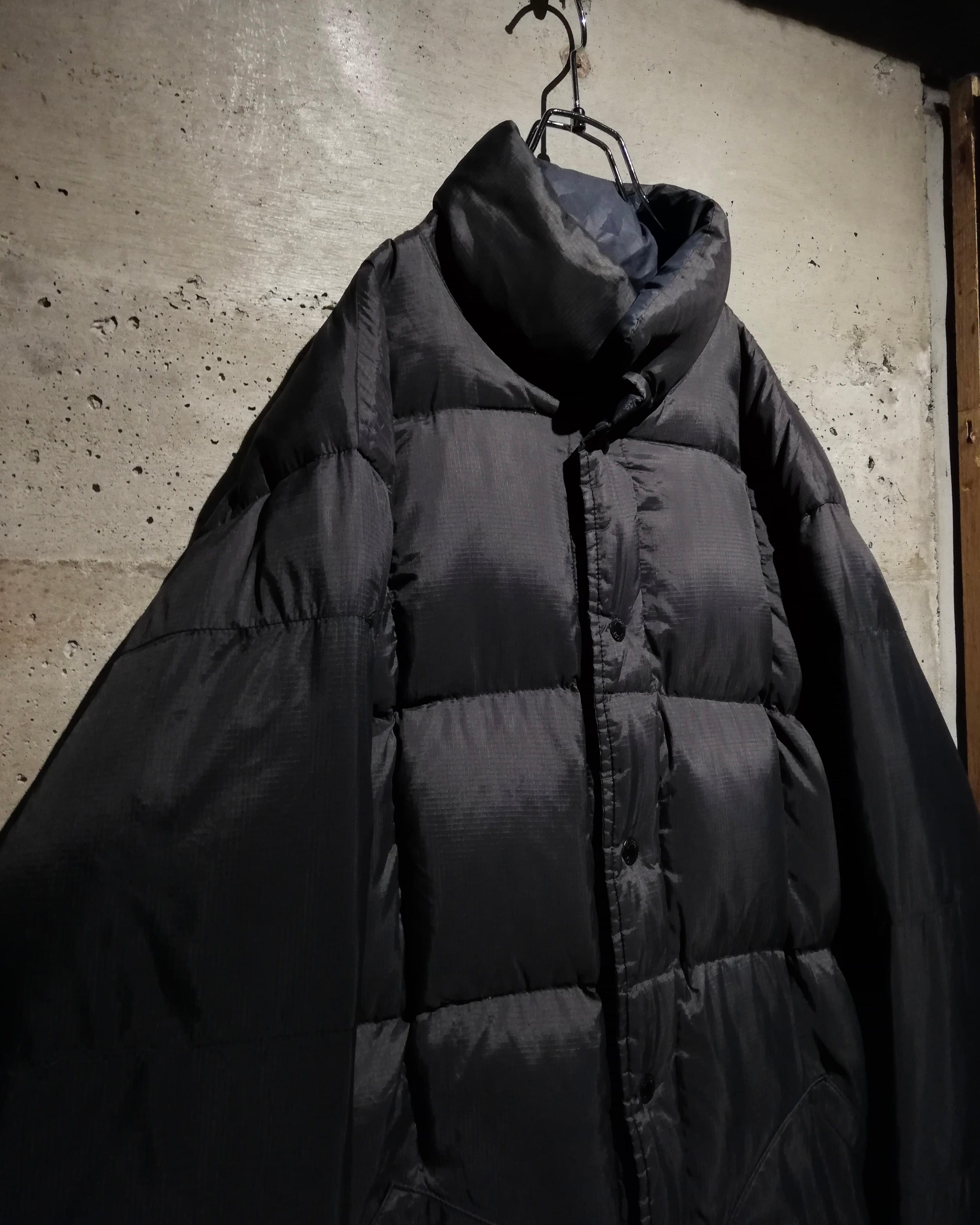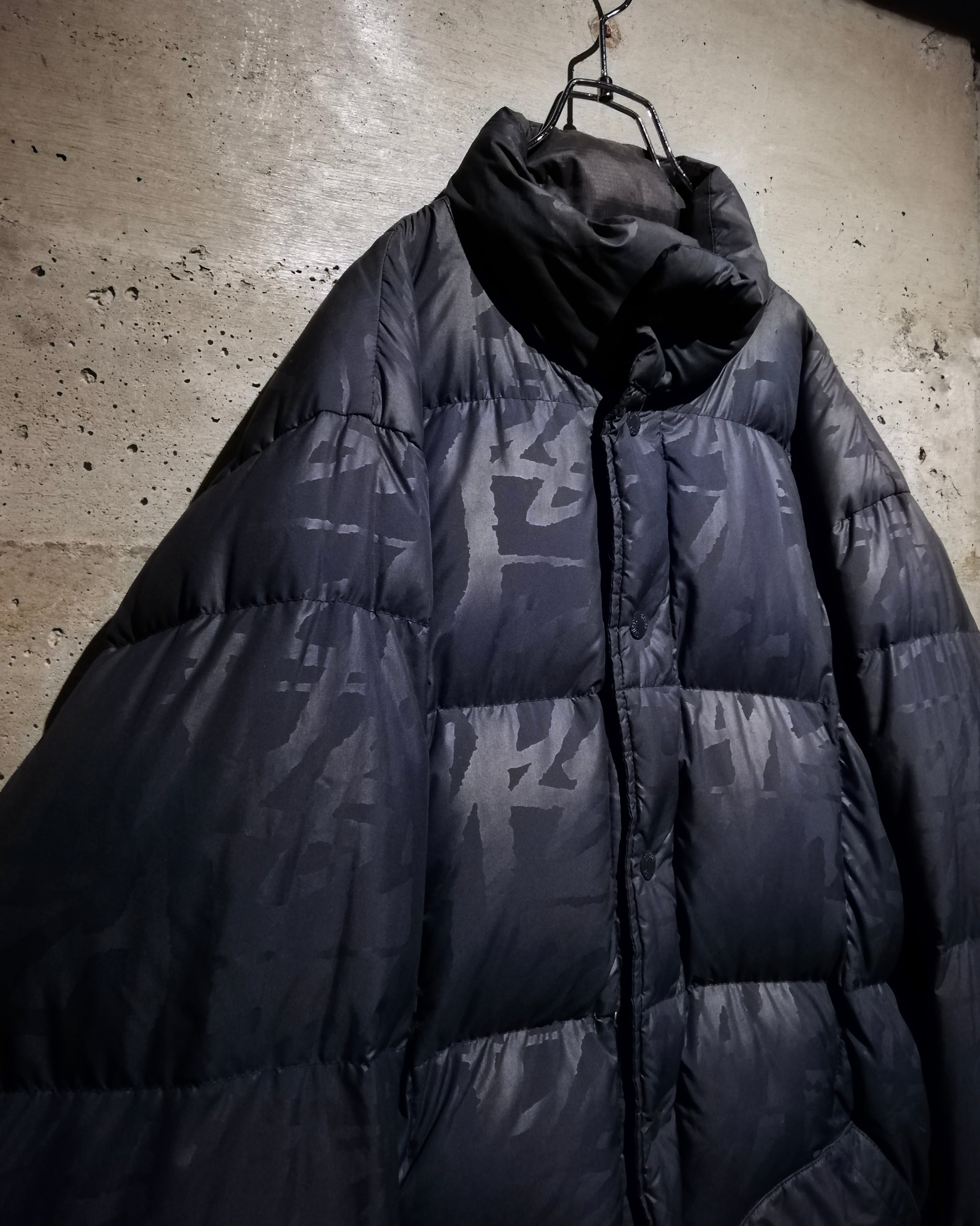 表面はネイビーのボディにブランドロゴを総柄で載せ、ガバッと裏返すとリップストップナイロンを用いたブラックのボディへと変化する、稀有なリバーシブル仕様のダウンジャケット。