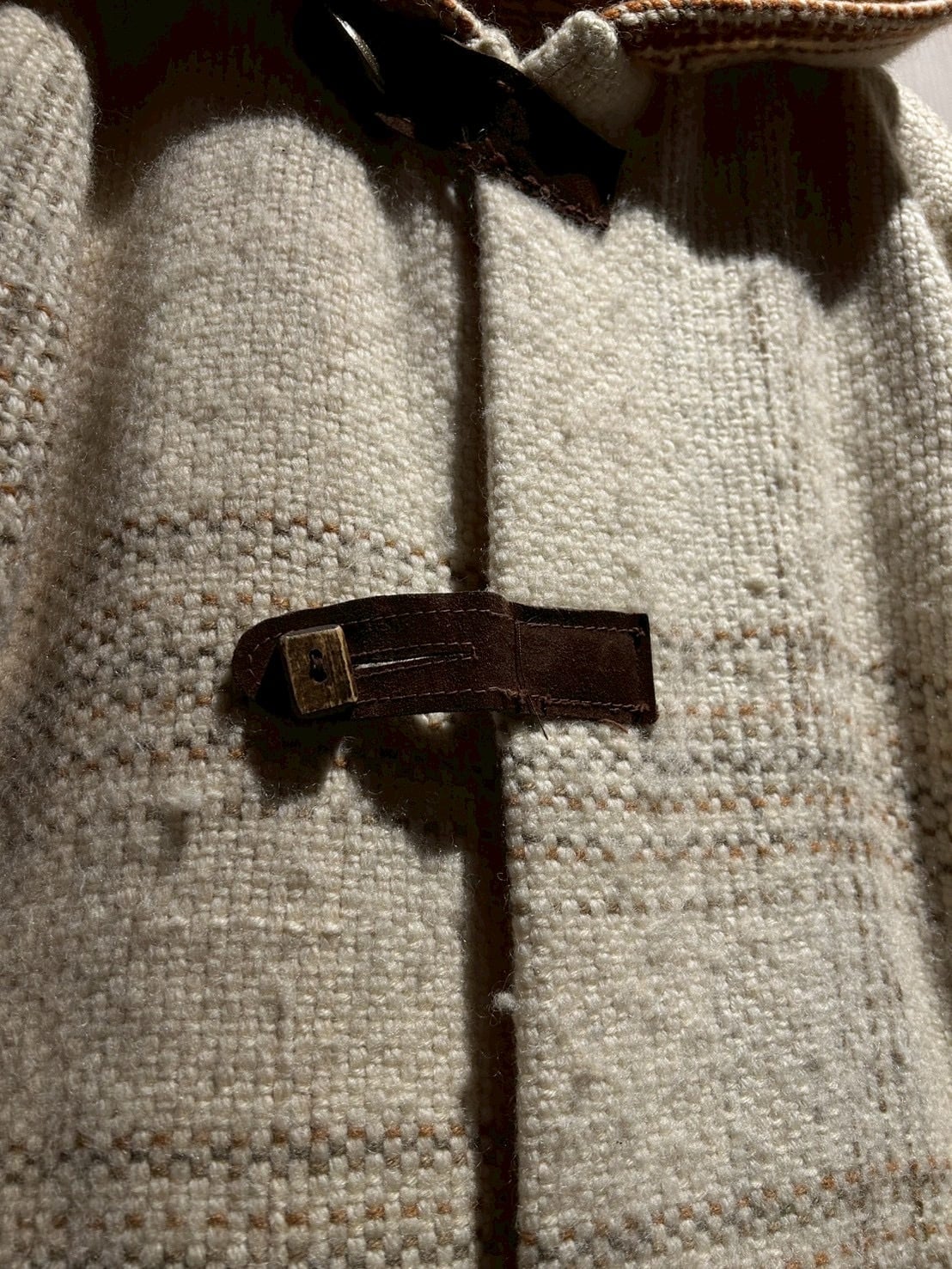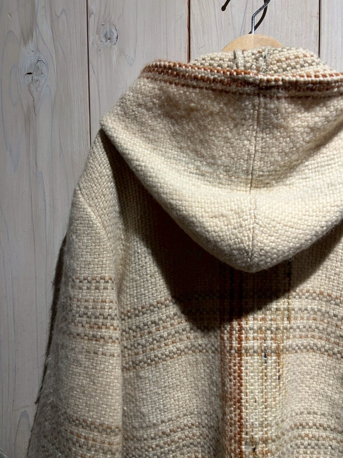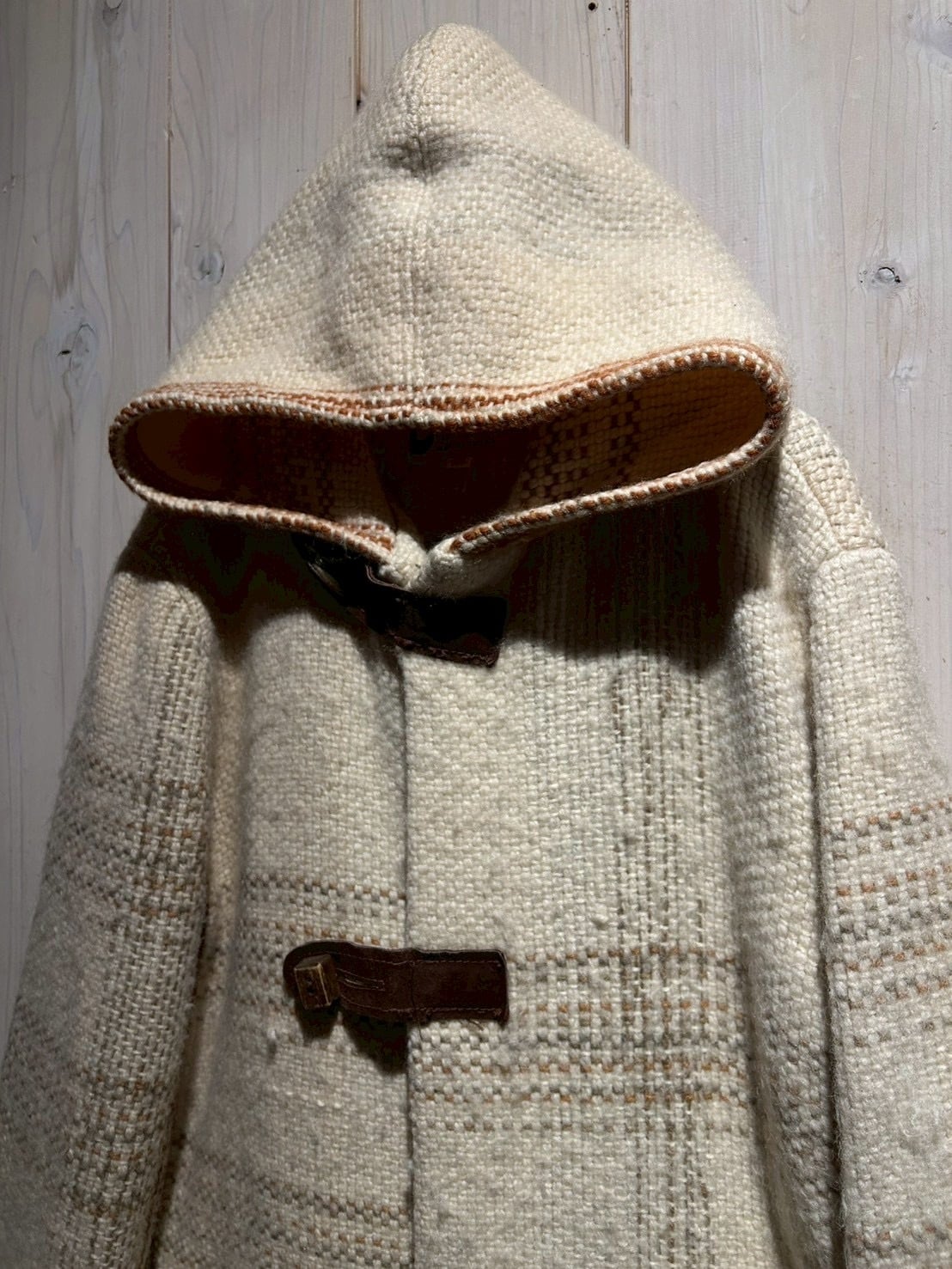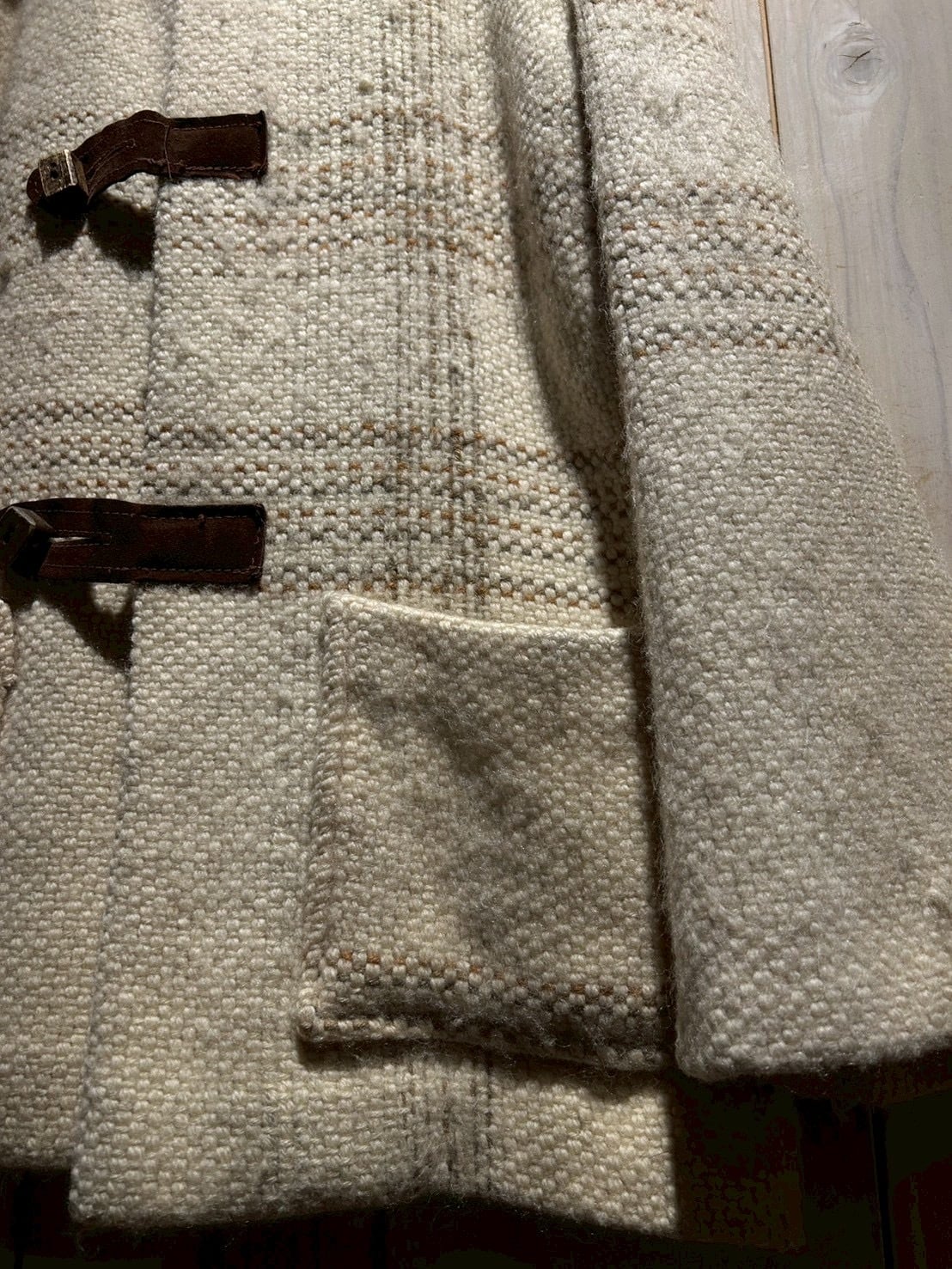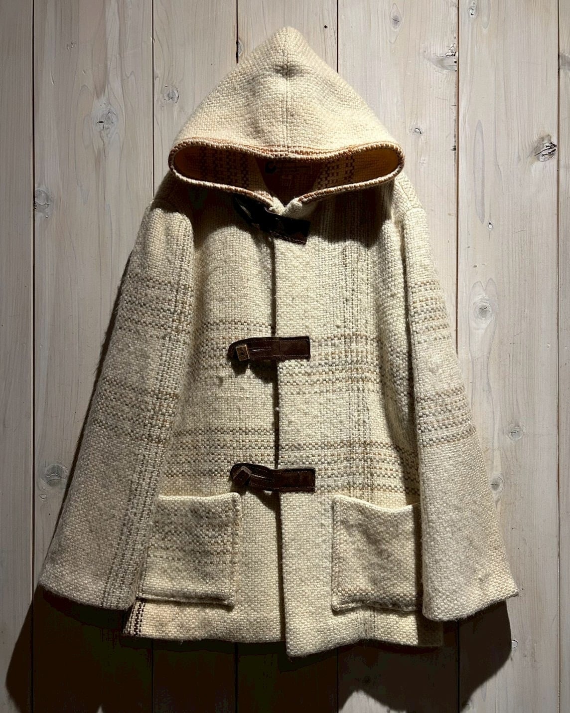 ザックリとした織りによって仕上げられた生成りのボディに、チェック柄を載せたダッフルコート。