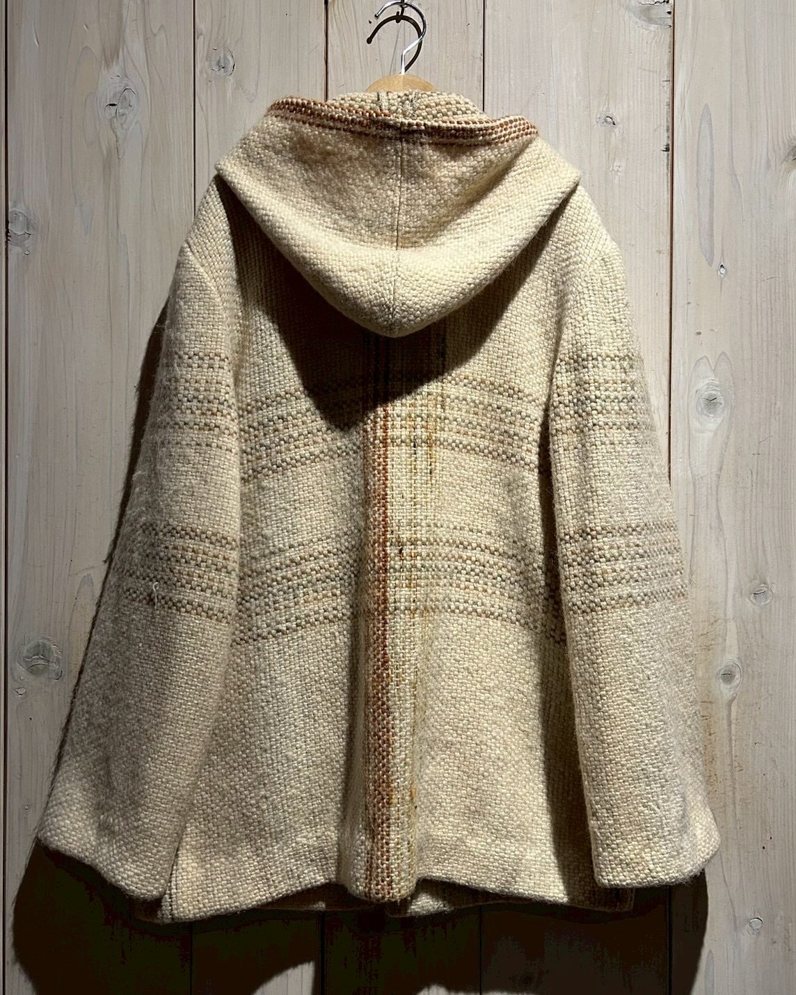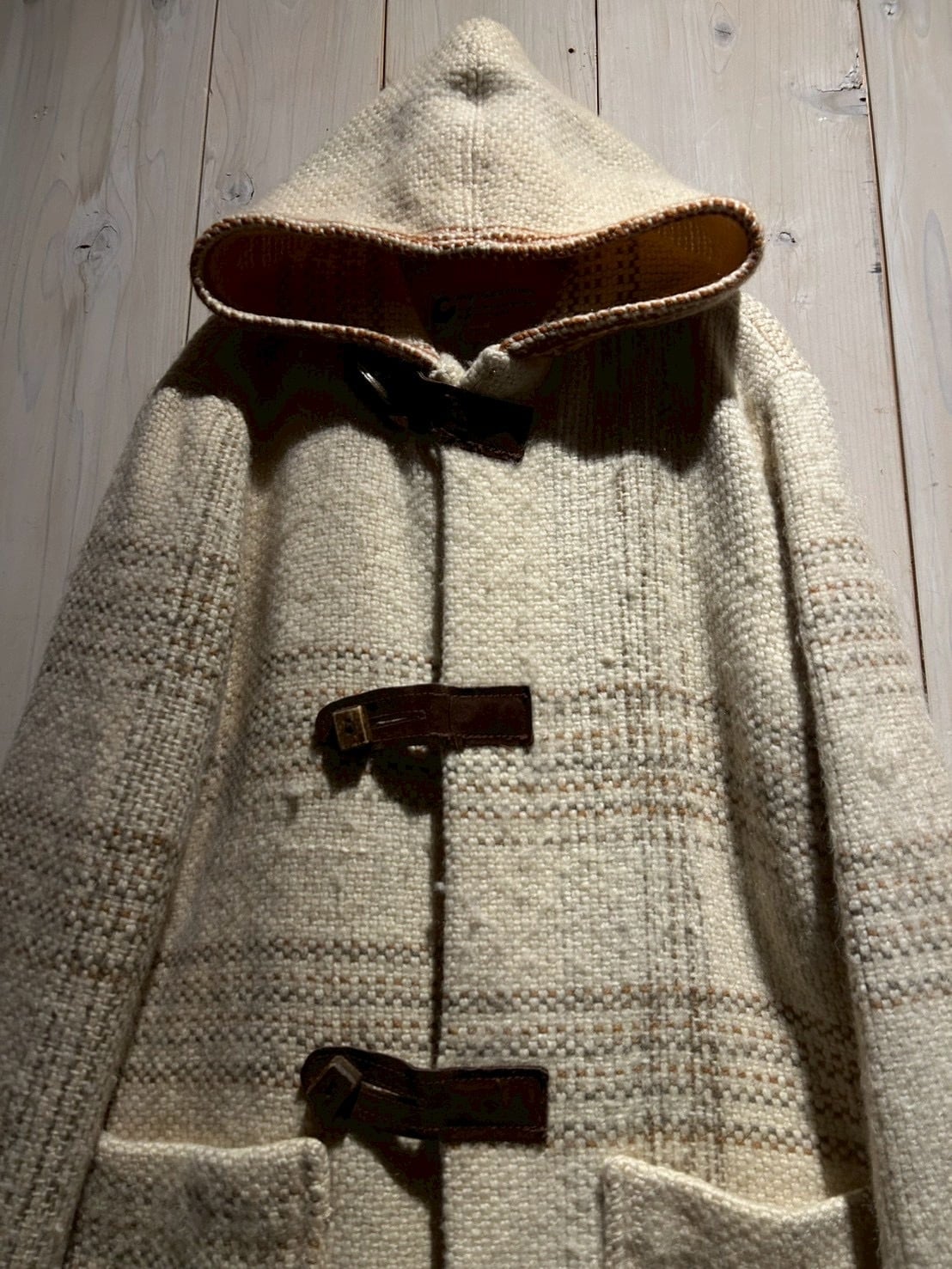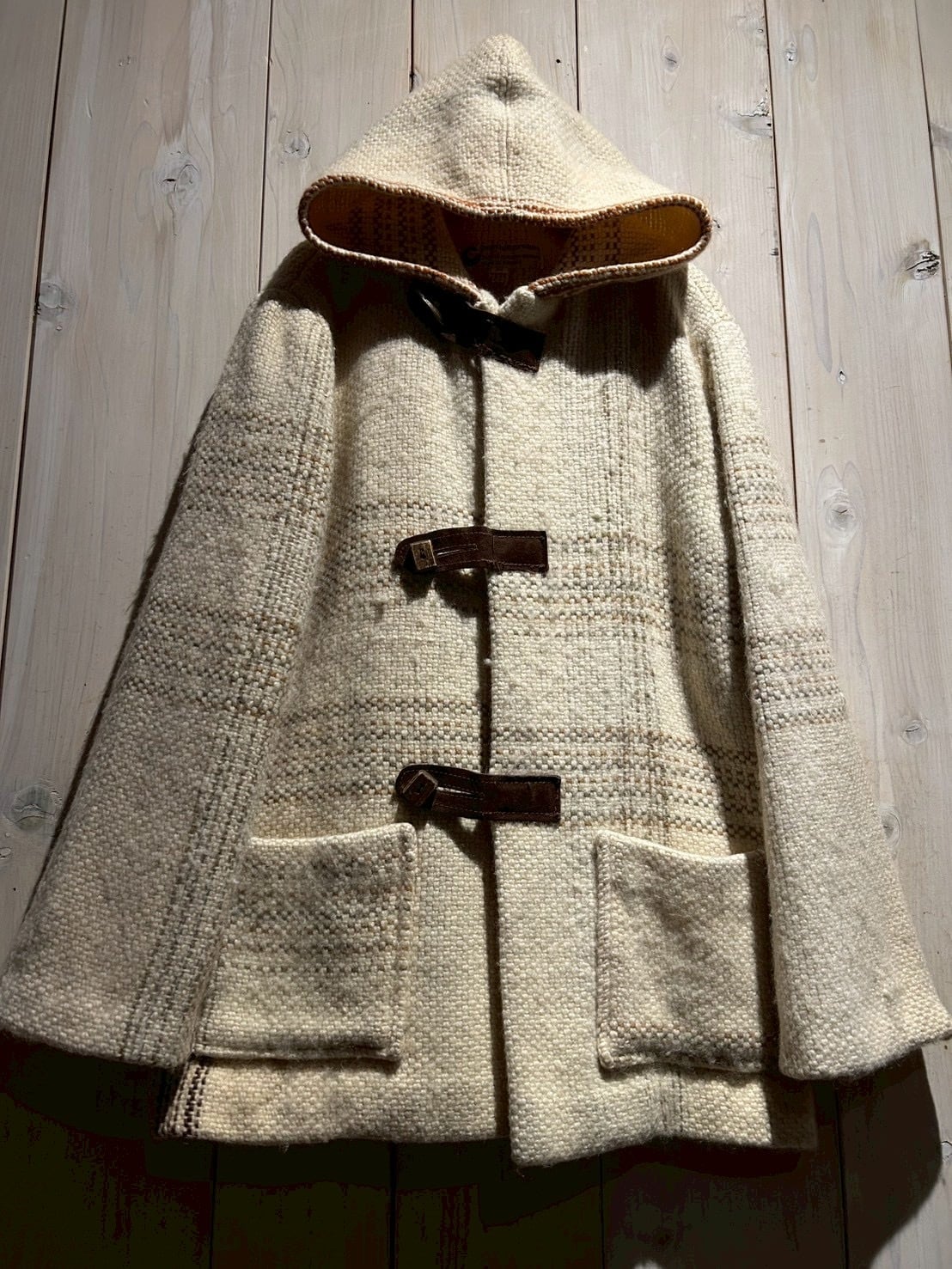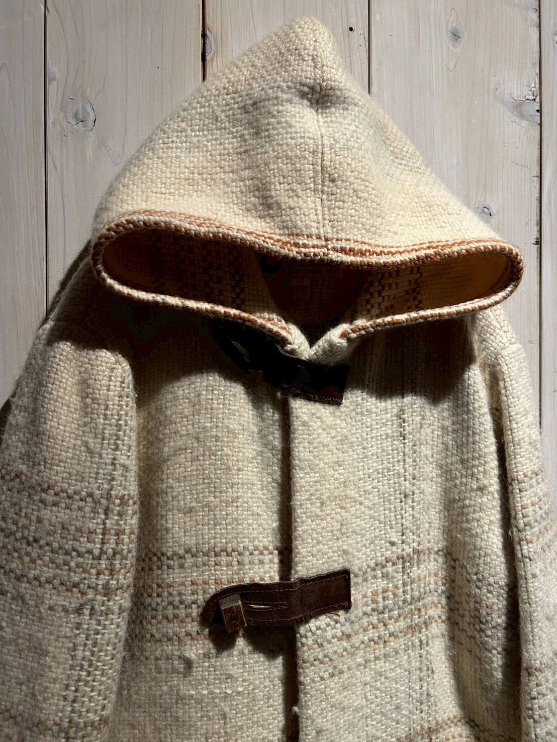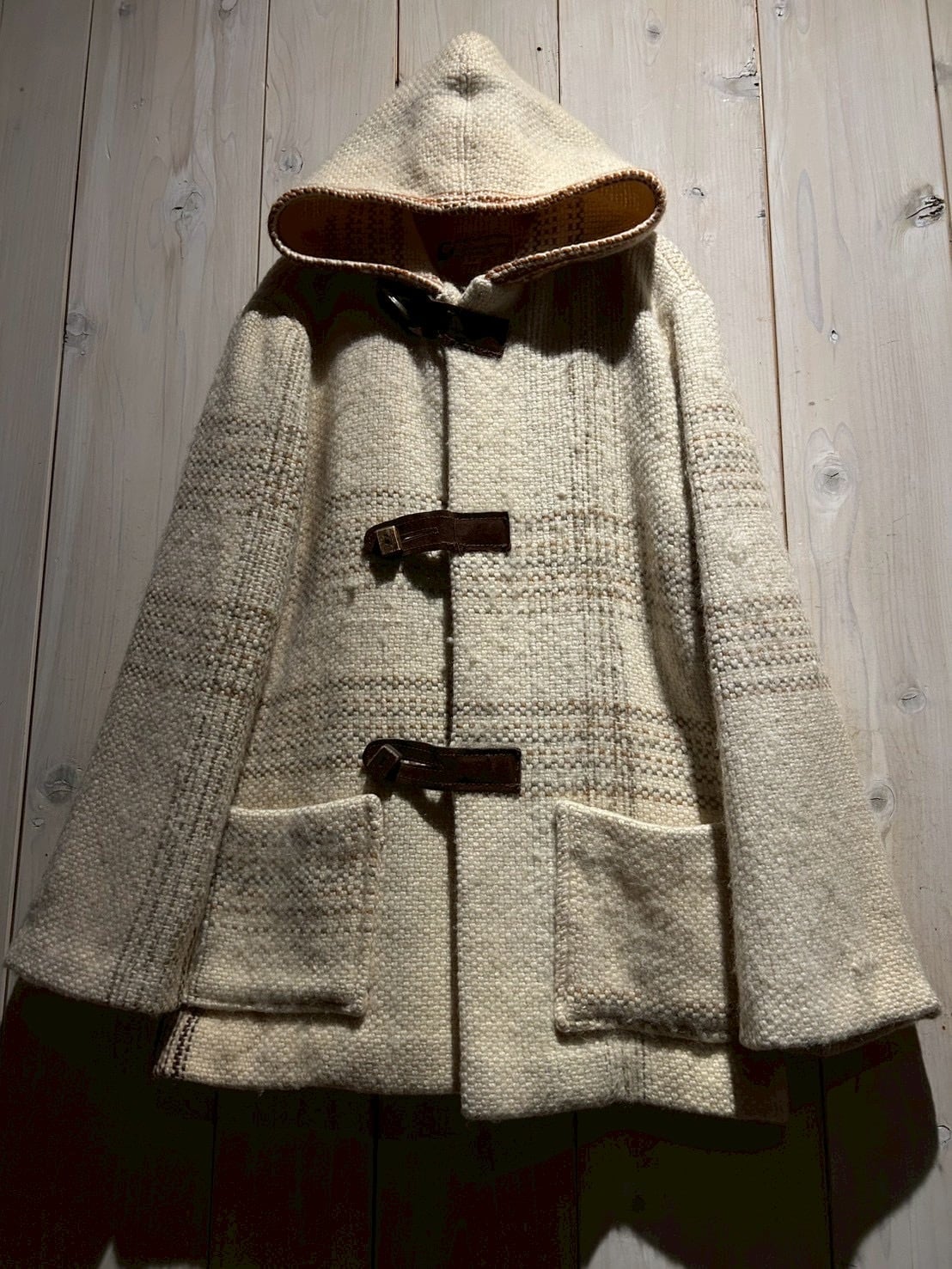 ザックリとした織りによって仕上げられた生成りのボディに、チェック柄を載せたダッフルコート。