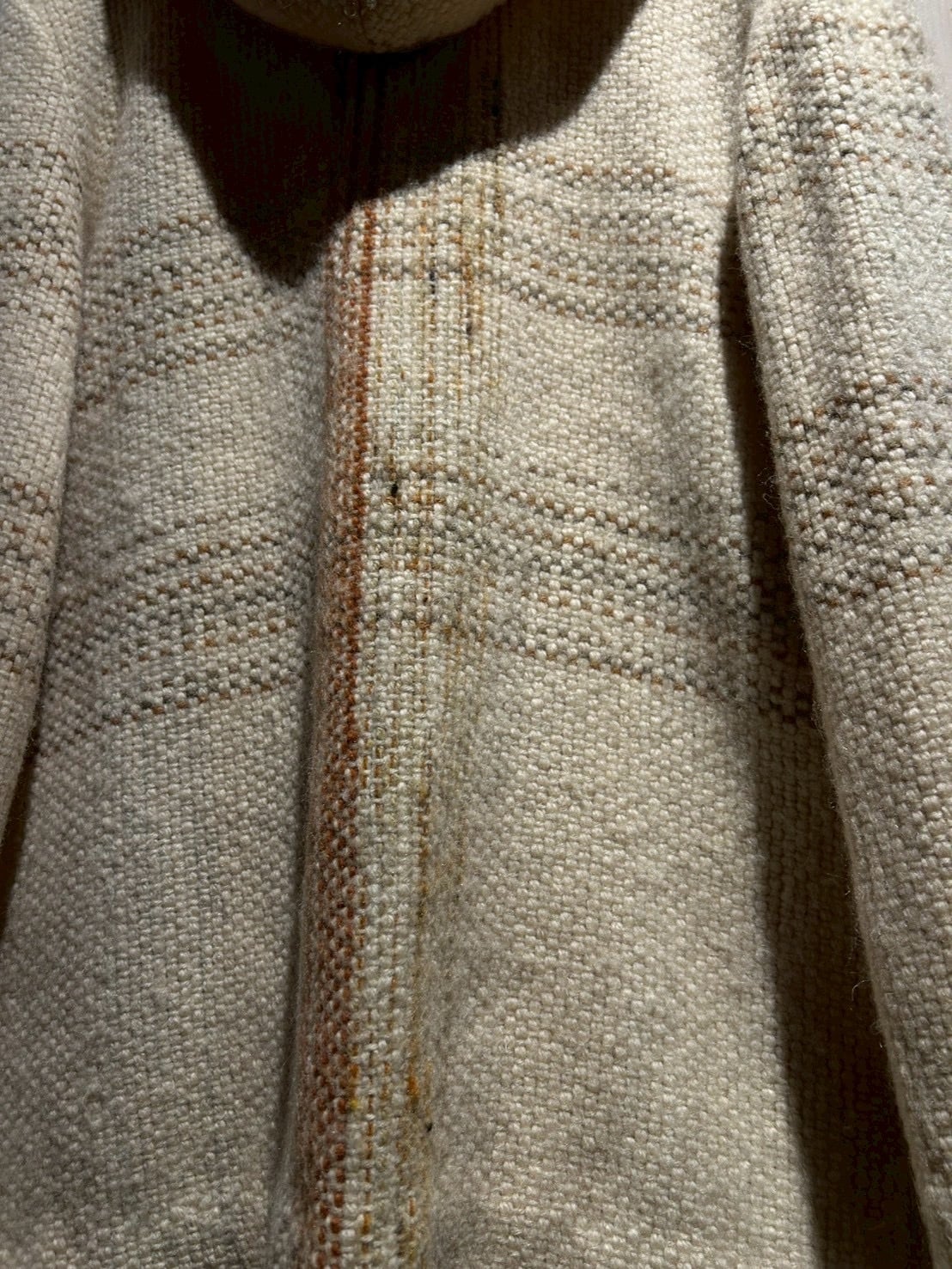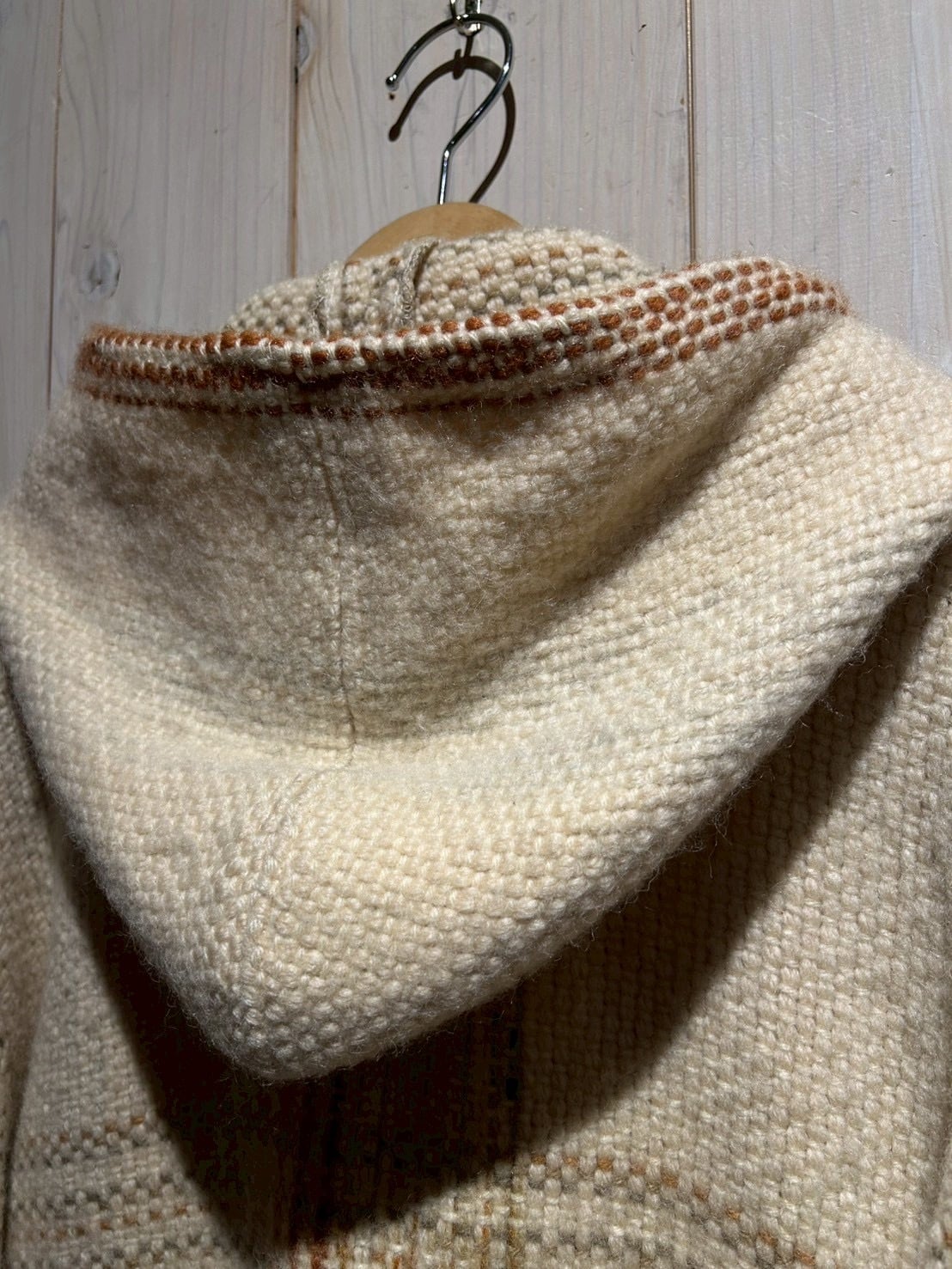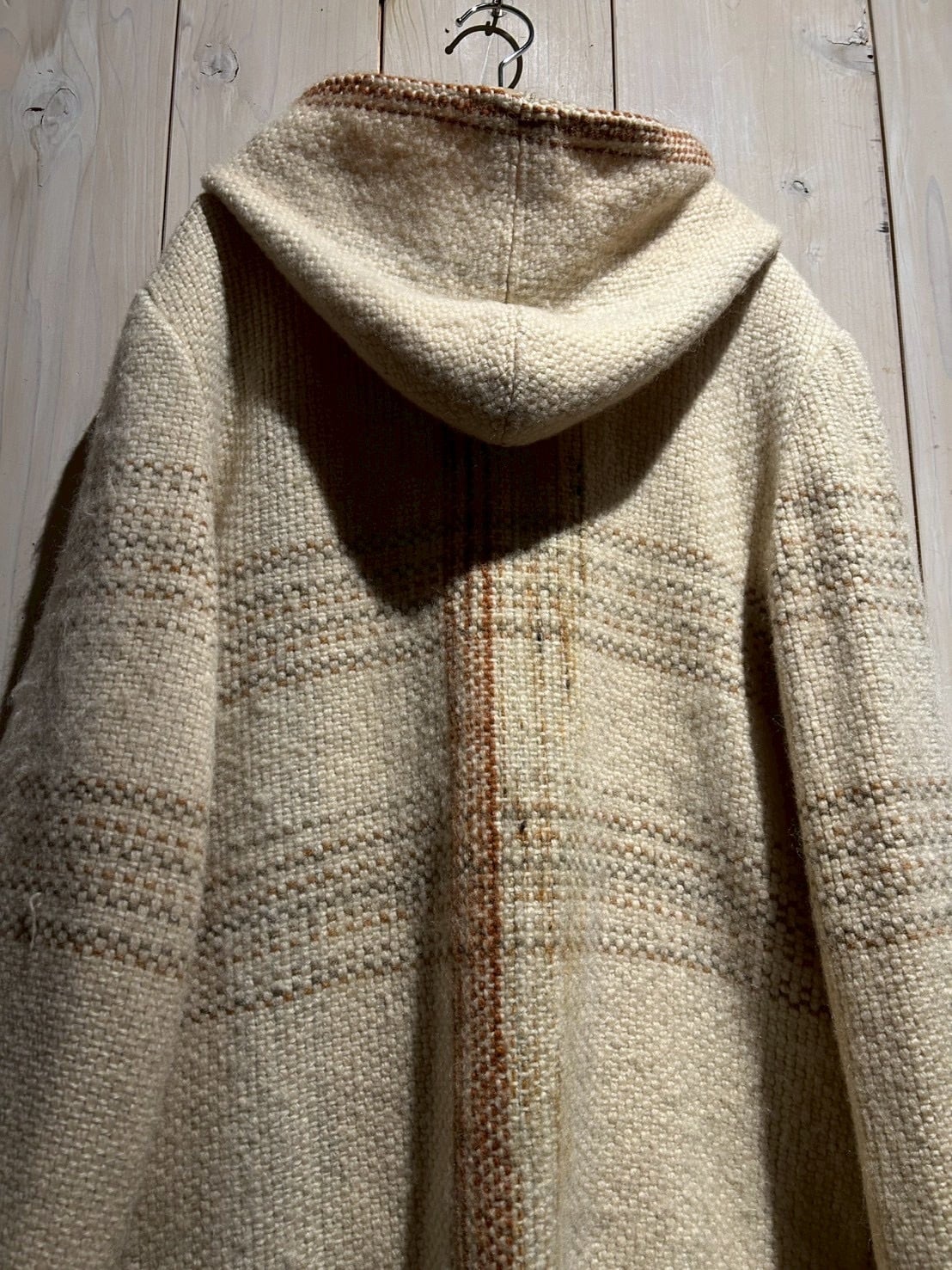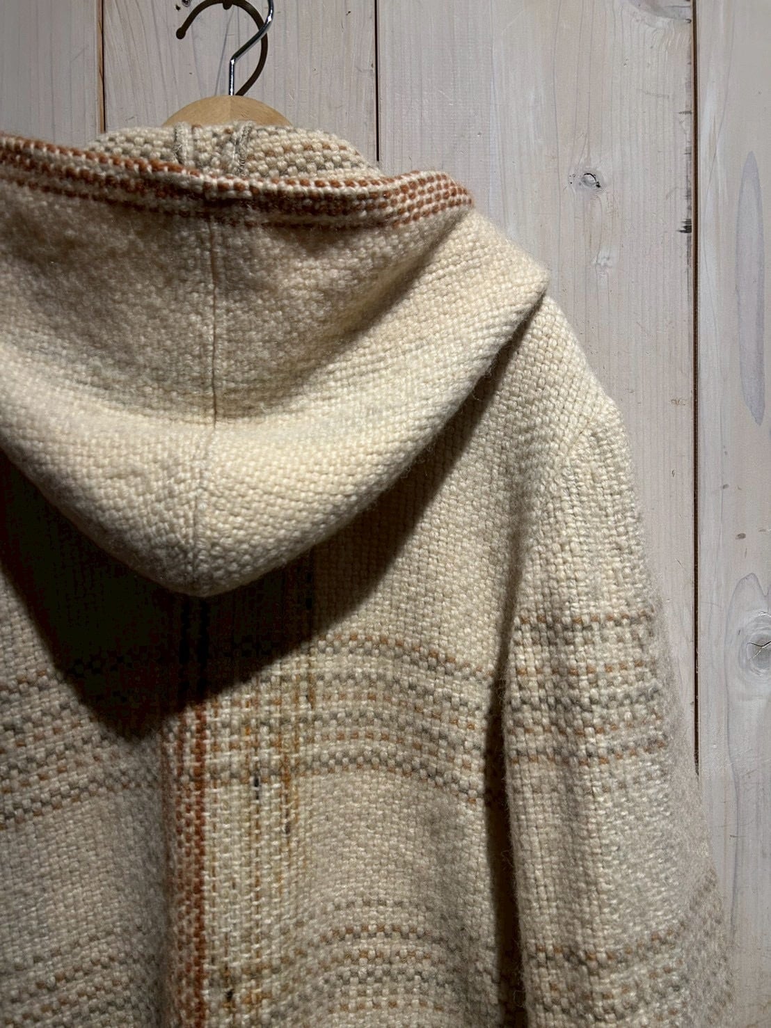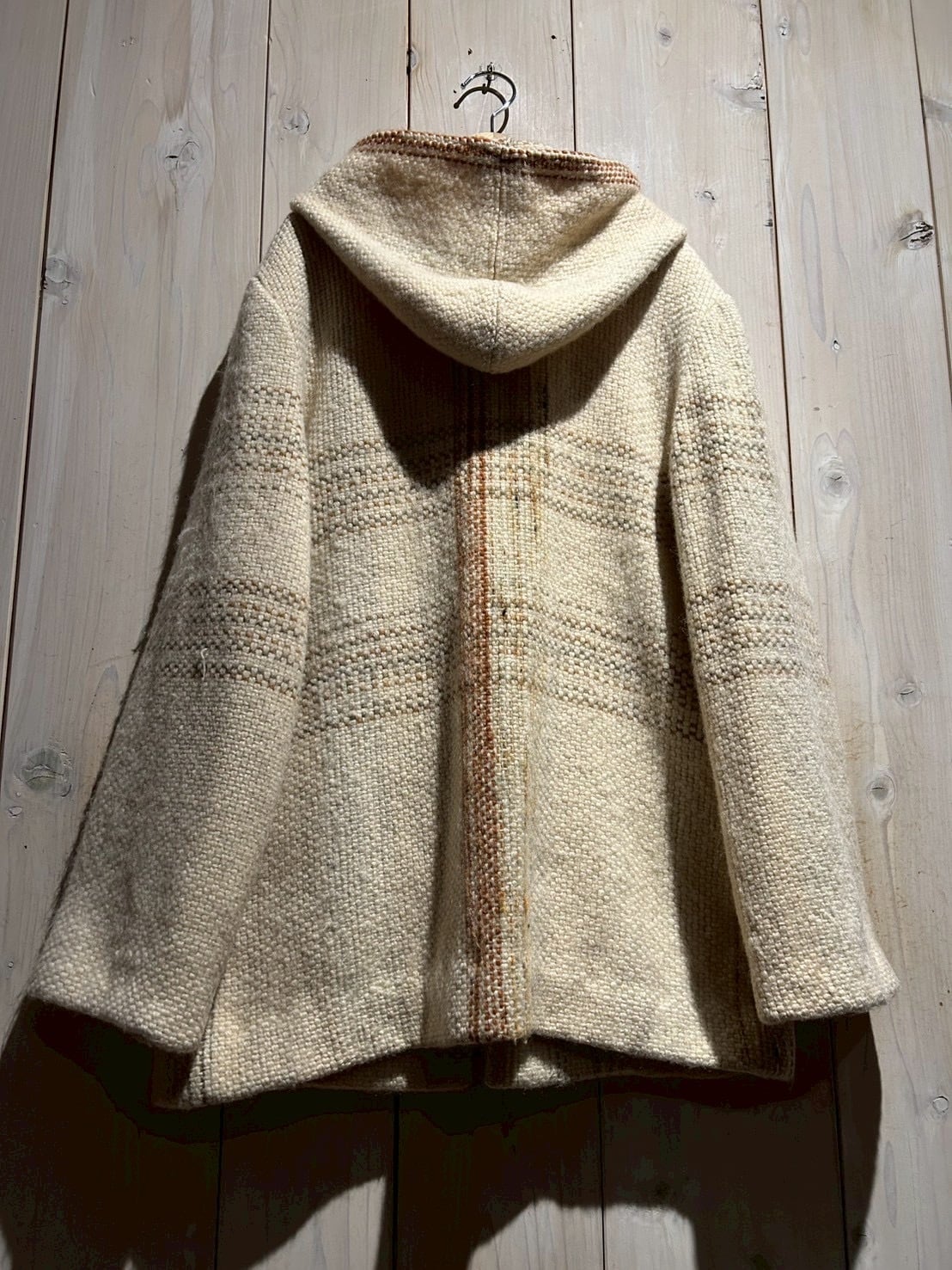 ザックリとした織りによって仕上げられた生成りのボディに、チェック柄を載せたダッフルコート。